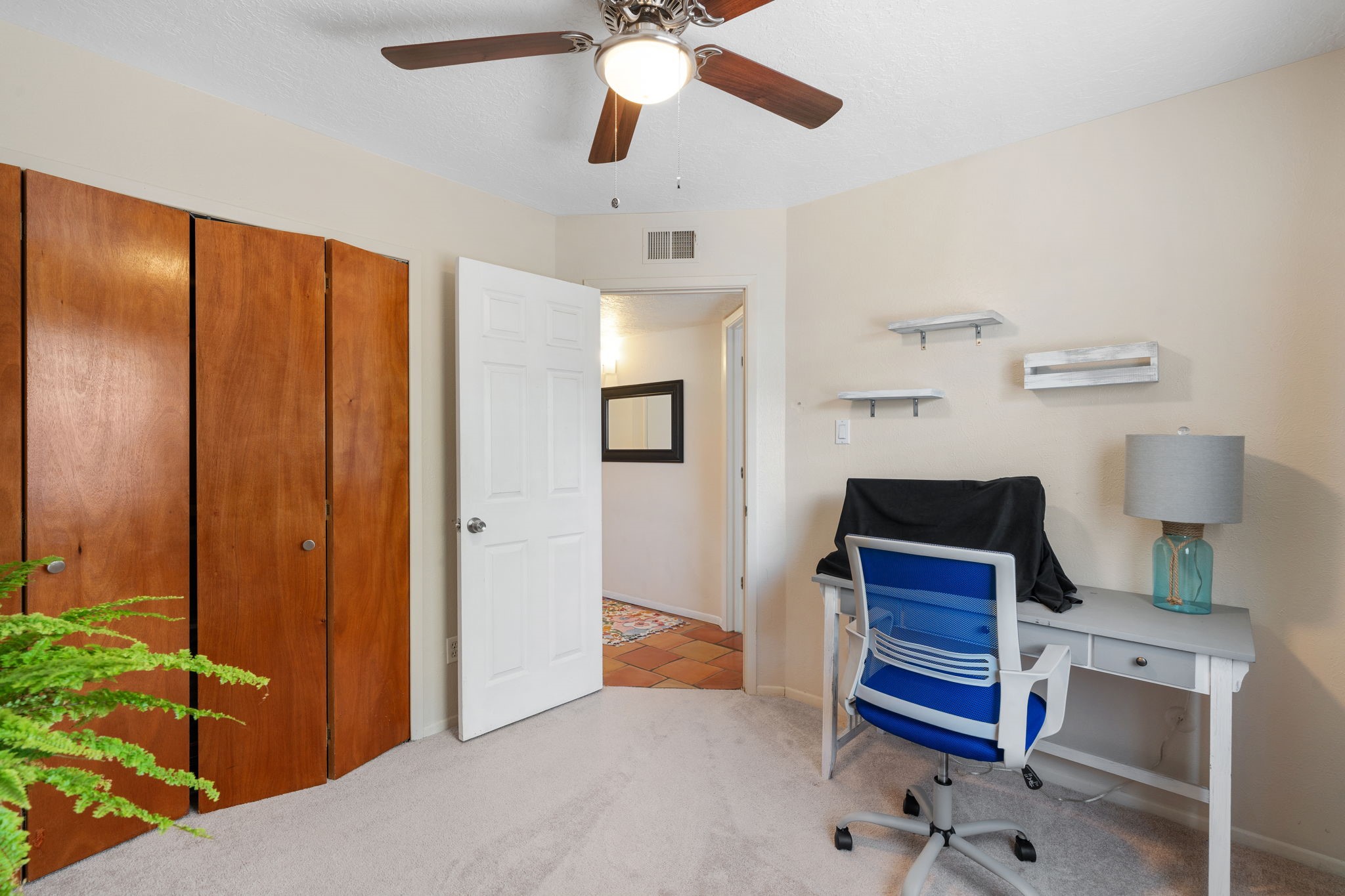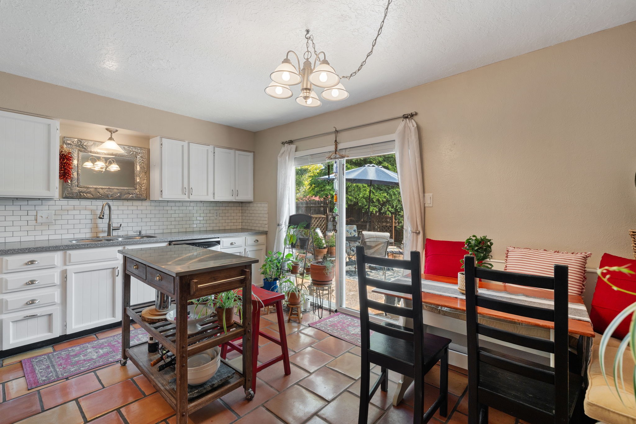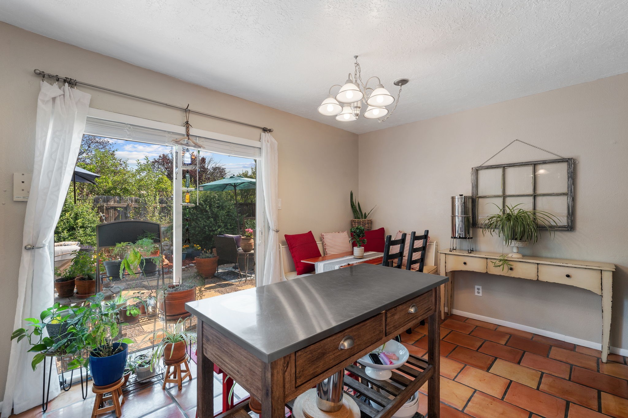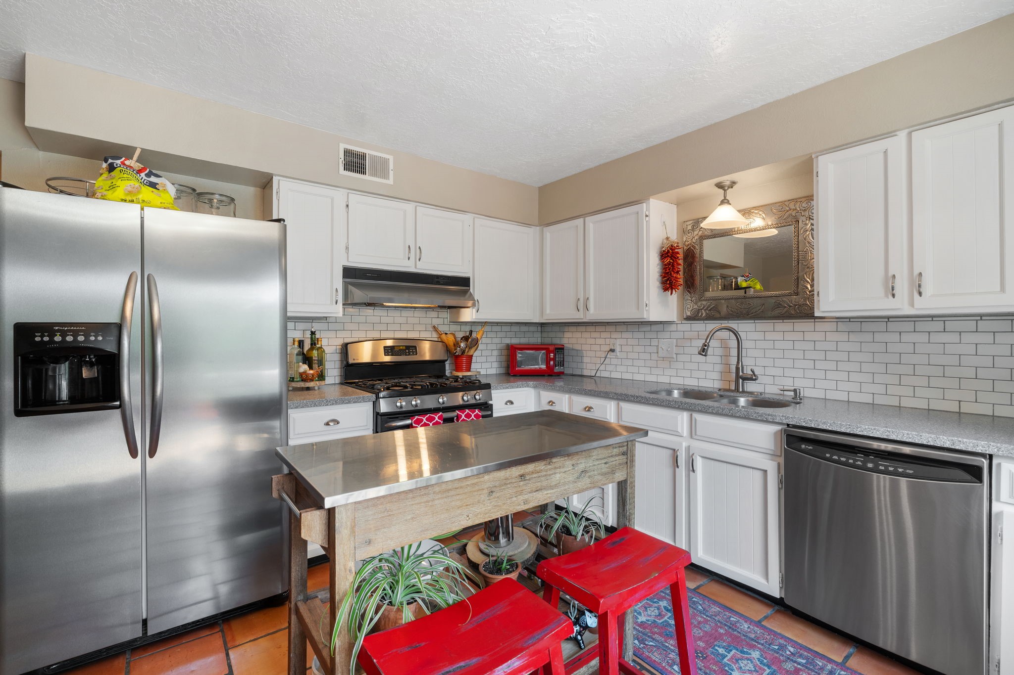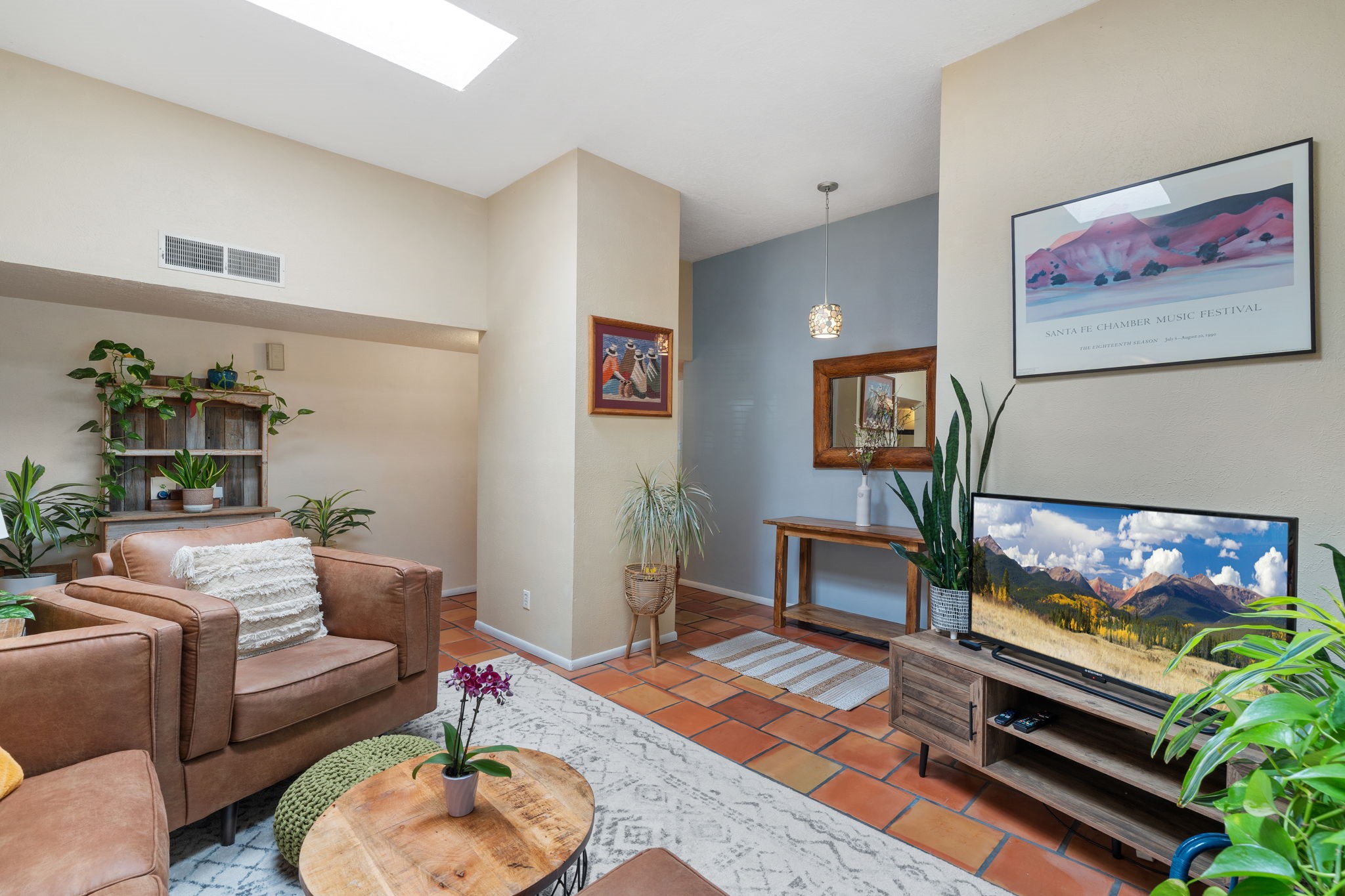 Come see this Southside four bedroom home, conveniently located close to schools, shopping and parks. The cozy entry courtyard sparkles with colorful flowers, and is shaded by large trees. The living room has tall ceilings and is filled with light from 2 large skylights. The updated kitchen has stainless appliances, tile backsplash and quartz counters. There is direct access to the inviting outdoor space, where bright and perennials are mixed in the dappled light of shade trees. The backyard is fenced, and there are two raised vegetable beds for the green of thumb. Saltillo tile is the floor treatment in most of the house, with carpeted bedrooms. There is ample closet space and a ceiling fan in every bedroom. This affordable home is in excellent condition, with updated vinyl windows and gorgeous new stucco.