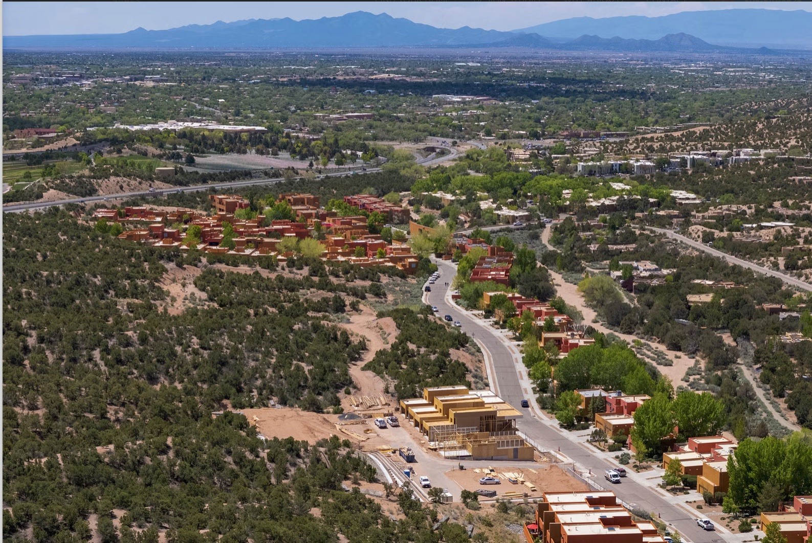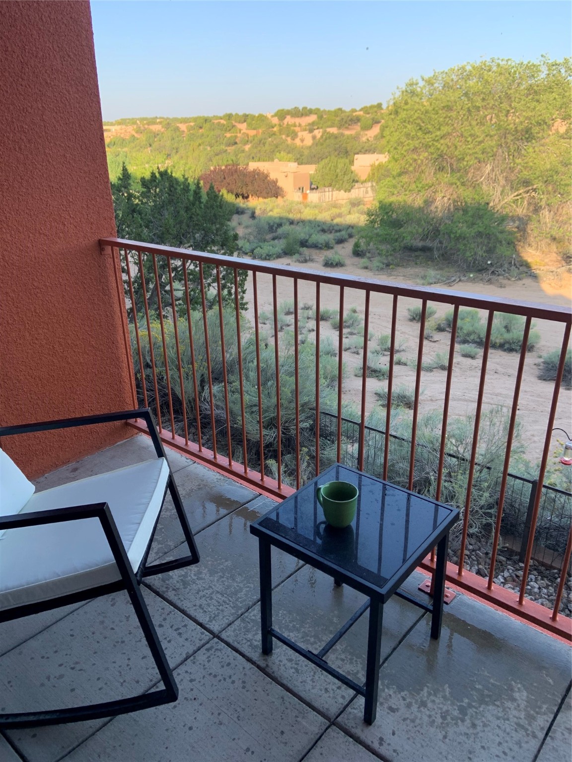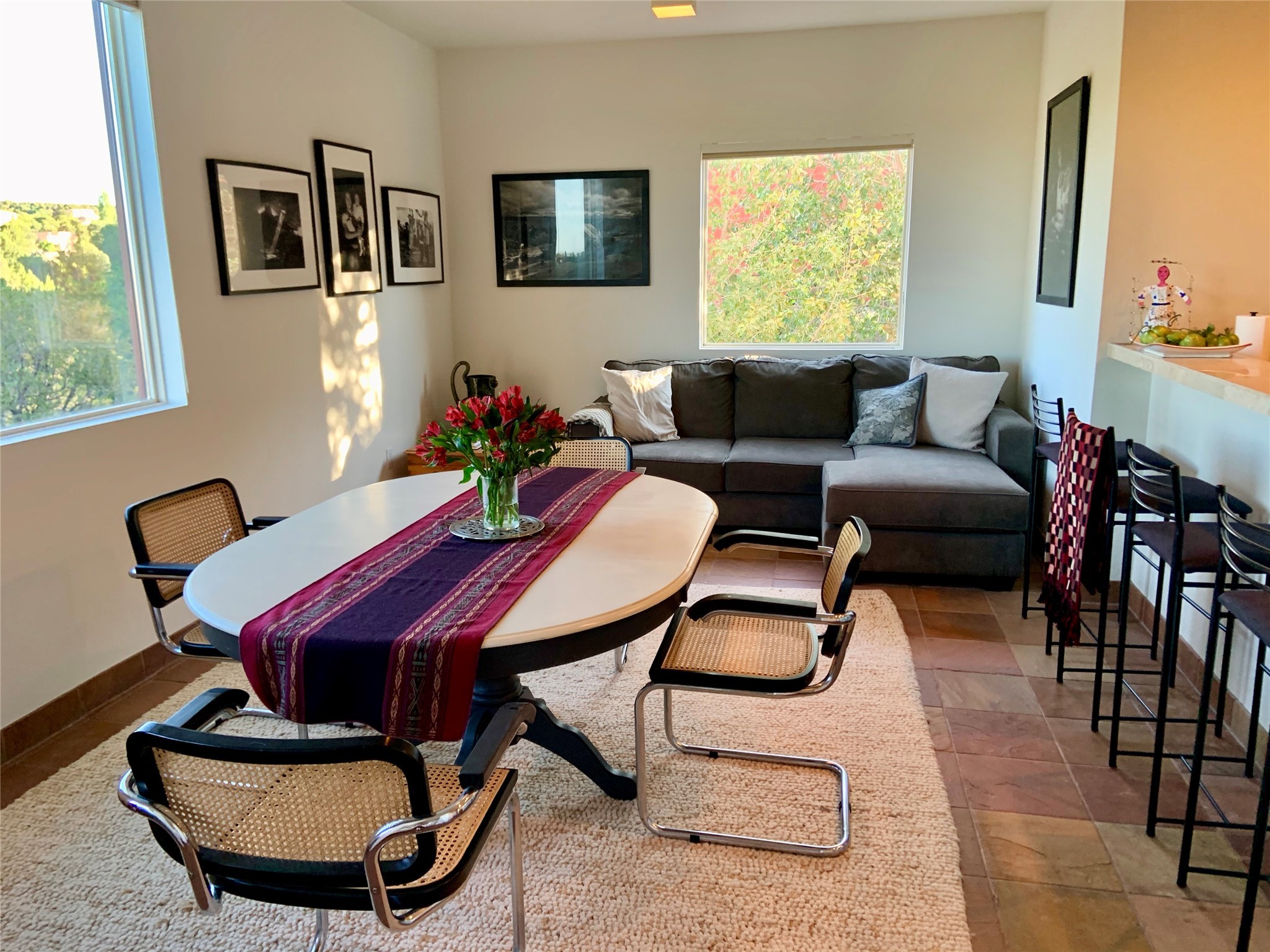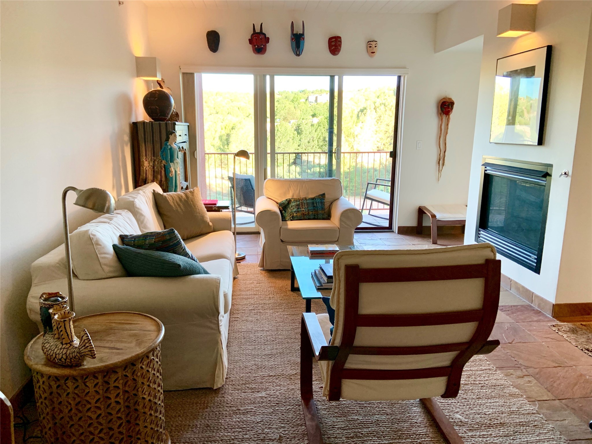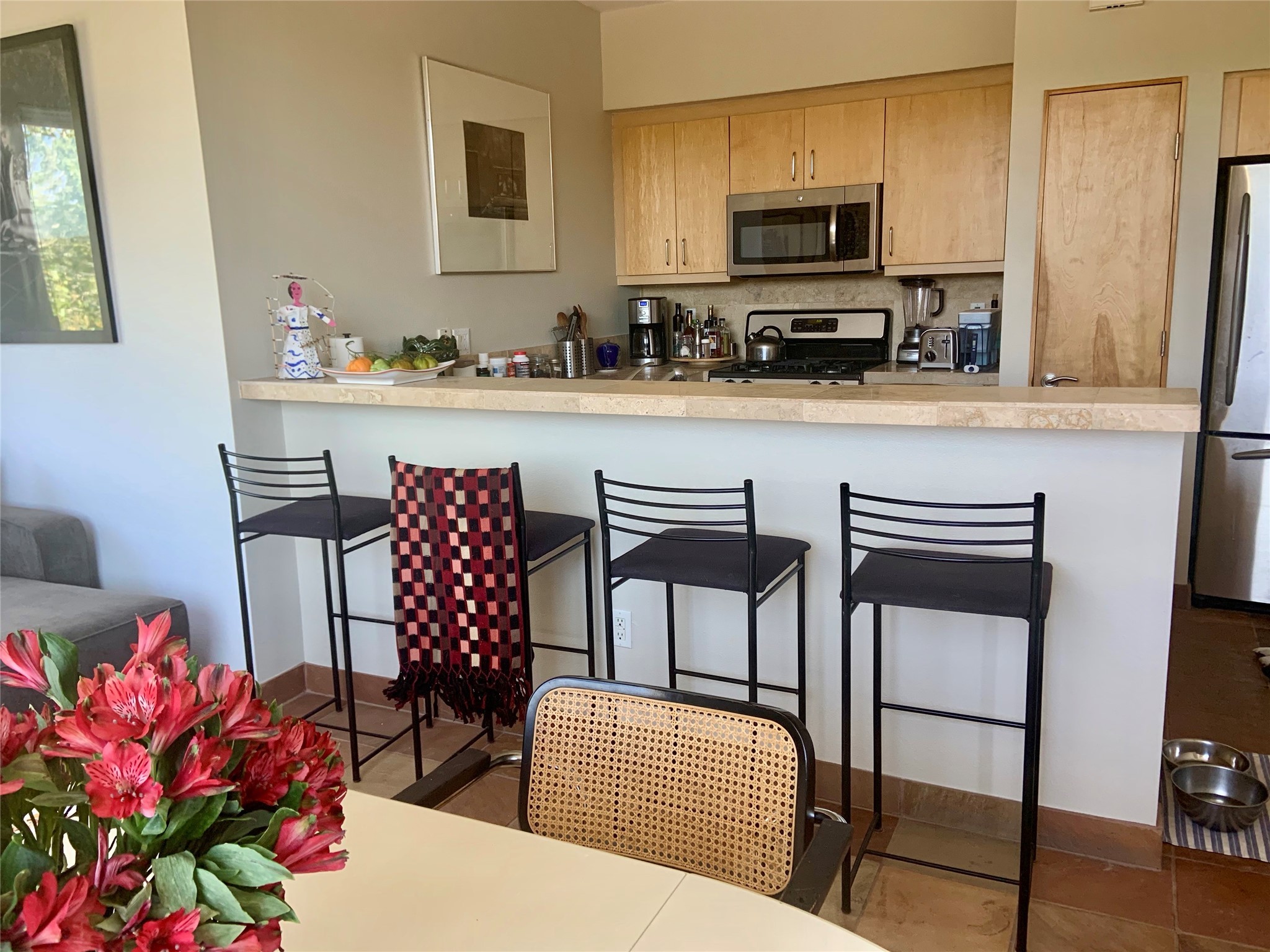 Discover this rare, single-level 2 bed/2 bath condominium in the award-winning Zocalo community, designed by renowned architect Ricardo Legorreta. This 1,206+/- sq ft residence offers sleek, soft-contemporary styling with 9' ceilings, 12-inch sandstone floors, in-floor radiant heat, and a private deck with expansive arroyo views. Recently remodeled, the open-concept layout features a light-filled living area with direct access--no stairs--from either the front door or the finished one-car garage. The kitchen includes natural stone countertops and GE Profile appliances, while both bathrooms feature elegant stone finishes. Bedrooms are carpeted in a tight-weave grey and thoughtfully placed for privacy. Zocalo residents enjoy resort-style amenities: a private clubhouse with pool, hot tub, gym, fireplace lounge, and meeting spaces--all just ~4 miles from the Santa Fe Plaza. Located in the Northern Hills with easy access to downtown, the Opera, hiking trails, and skiing, this unit offers refined living in a vibrant architectural setting. Enjoy the convenience of a private garage, separate laundry area, and refrigerated A/C, plus the vibrant color, clean geometry, and masterful use of light that define Legorreta's celebrated design.