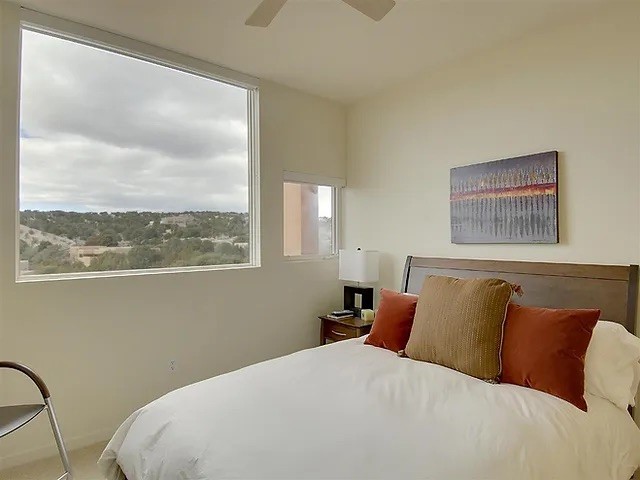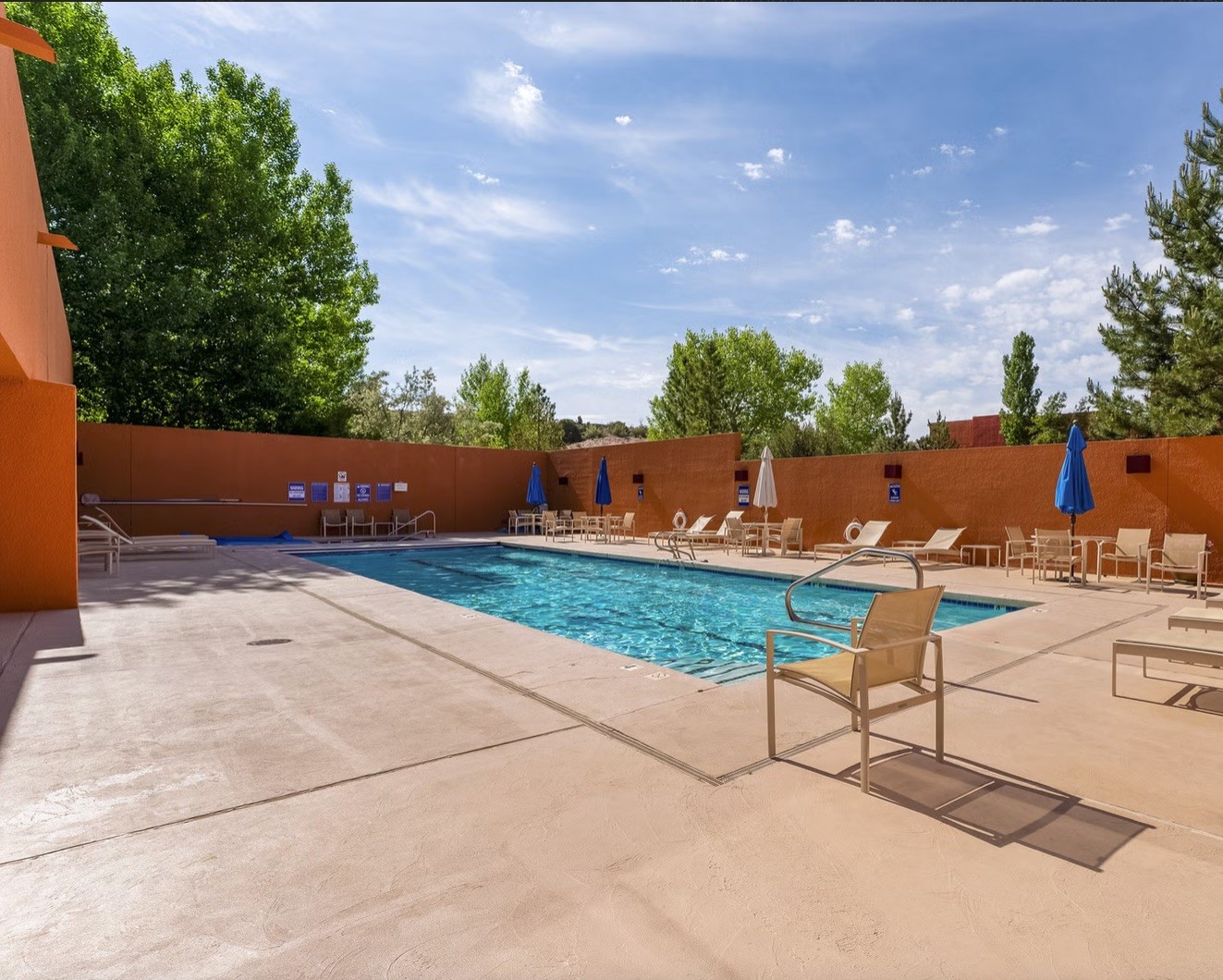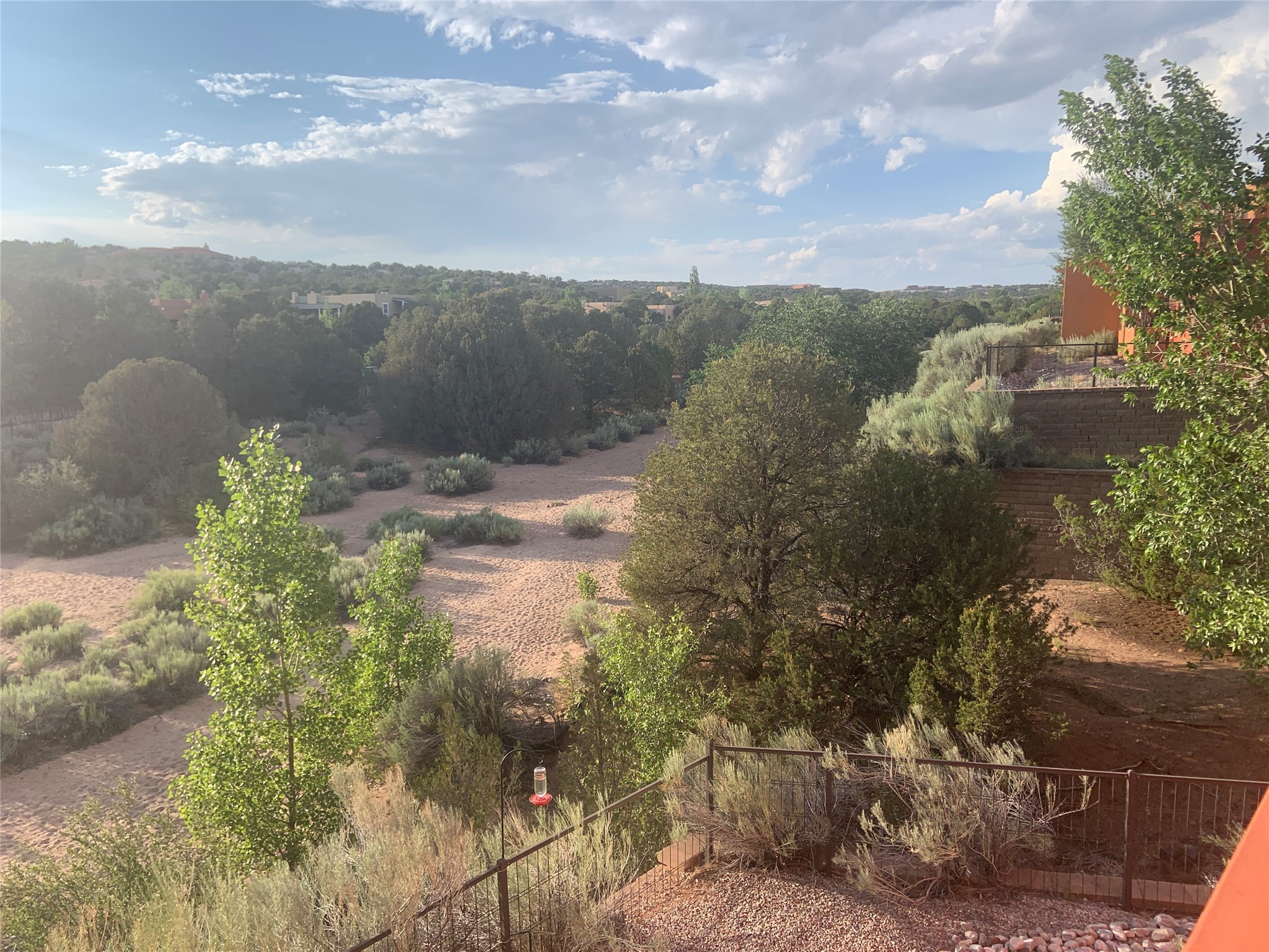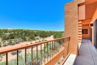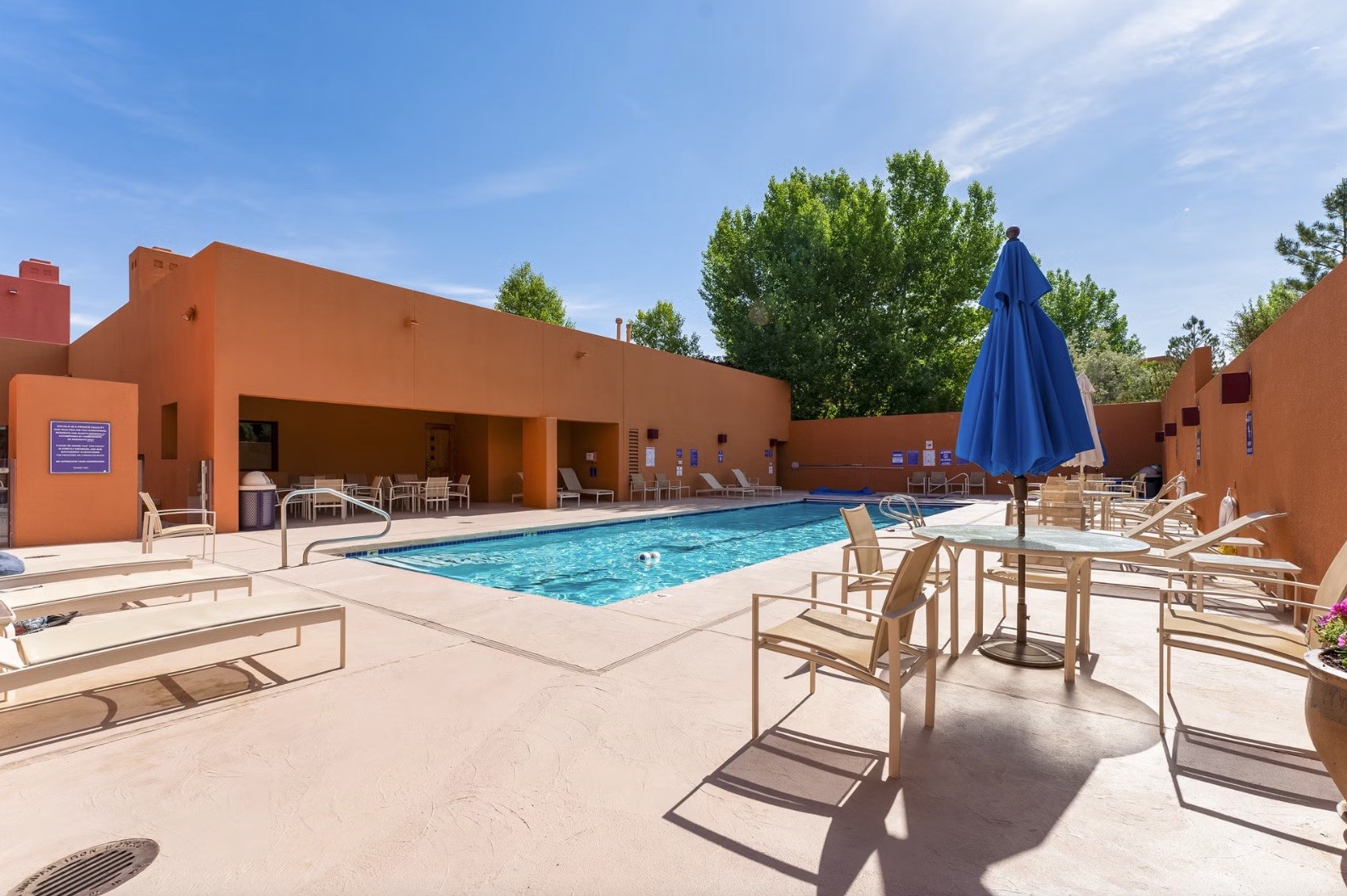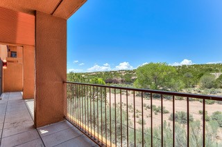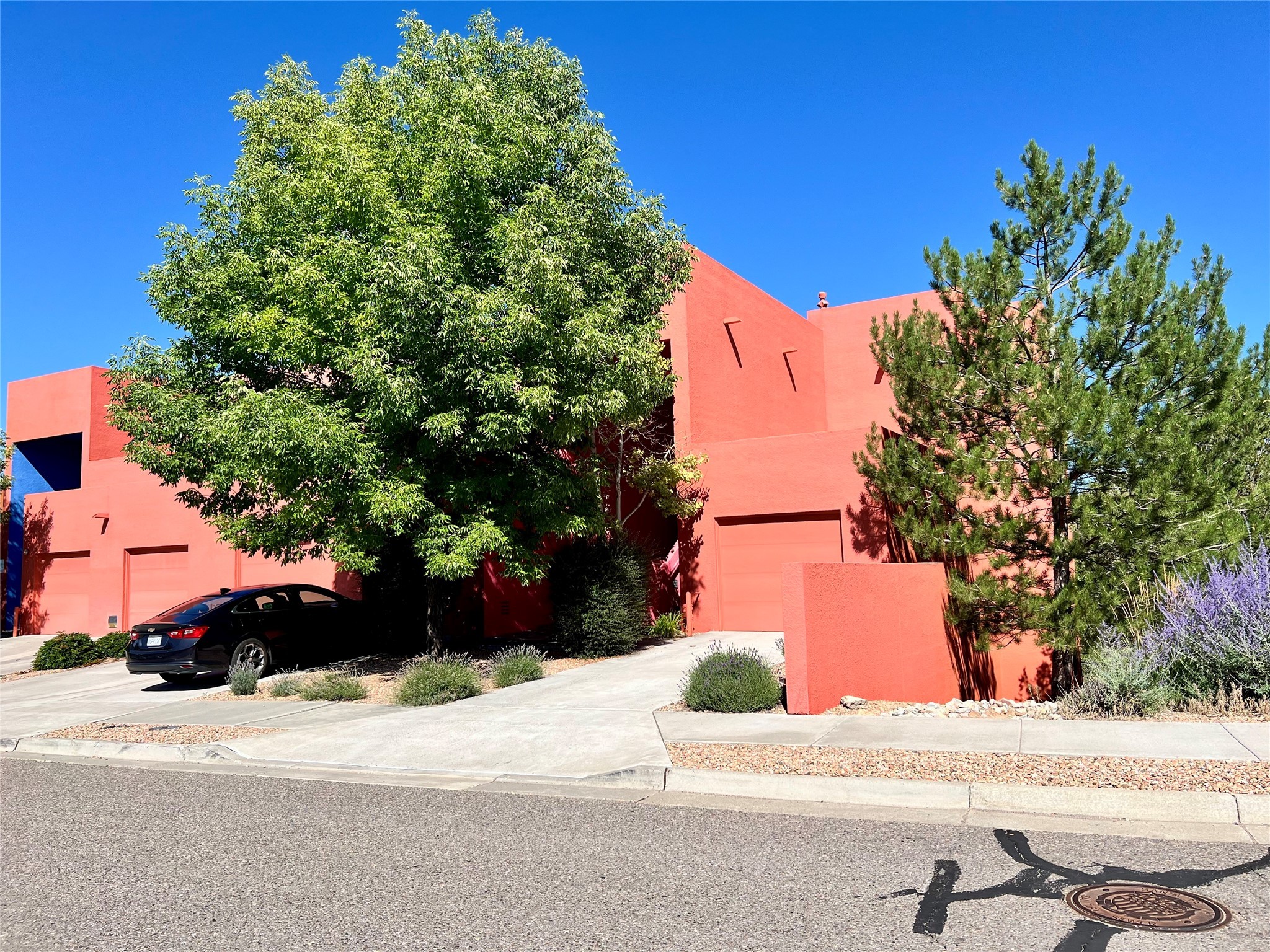 Discover this rare, single-level 2 bed/2 bath condominium in the award-winning Zocalo community, designed by renowned architect Ricardo Legorreta. This 1,206+/- sq ft residence offers sleek, soft-contemporary styling with 9' ceilings, 12-inch sandstone floors, in-floor radiant heat, and a private deck with expansive arroyo views. Recently remodeled, the open-concept layout features a light-filled living area with direct access--no stairs--from either the front door or the finished one-car garage. The kitchen includes natural stone countertops and GE Profile appliances, while both bathrooms feature elegant stone finishes. Bedrooms are carpeted in a tight-weave grey and thoughtfully placed for privacy. Zocalo residents enjoy resort-style amenities: a private clubhouse with pool, hot tub, gym, fireplace lounge, and meeting spaces--all just ~4 miles from the Santa Fe Plaza. Located in the Northern Hills with easy access to downtown, the Opera, hiking trails, and skiing, this unit offers refined living in a vibrant architectural setting. Enjoy the convenience of a private garage, separate laundry area, and refrigerated A/C, plus the vibrant color, clean geometry, and masterful use of light that define Legorreta's celebrated design.