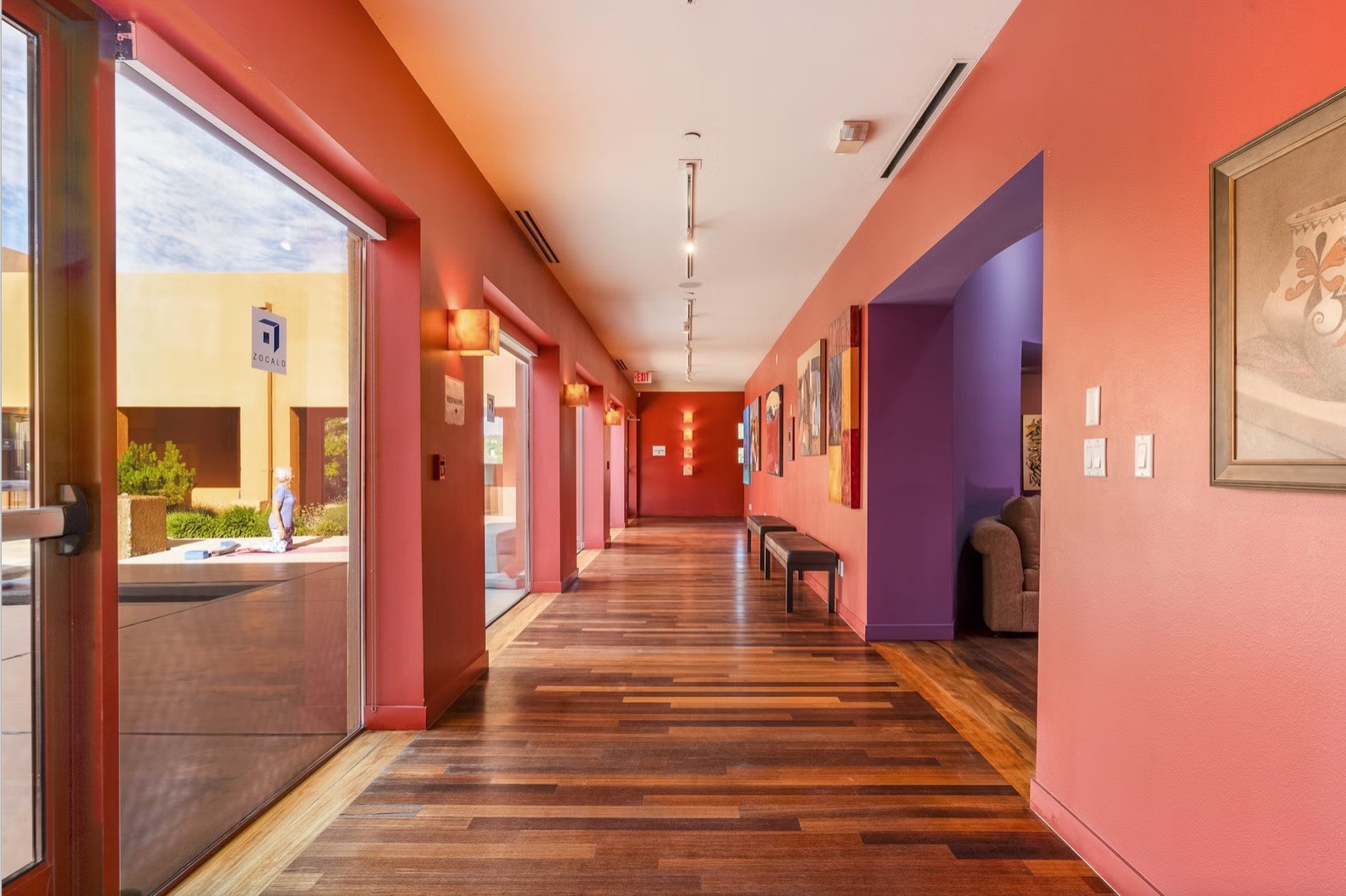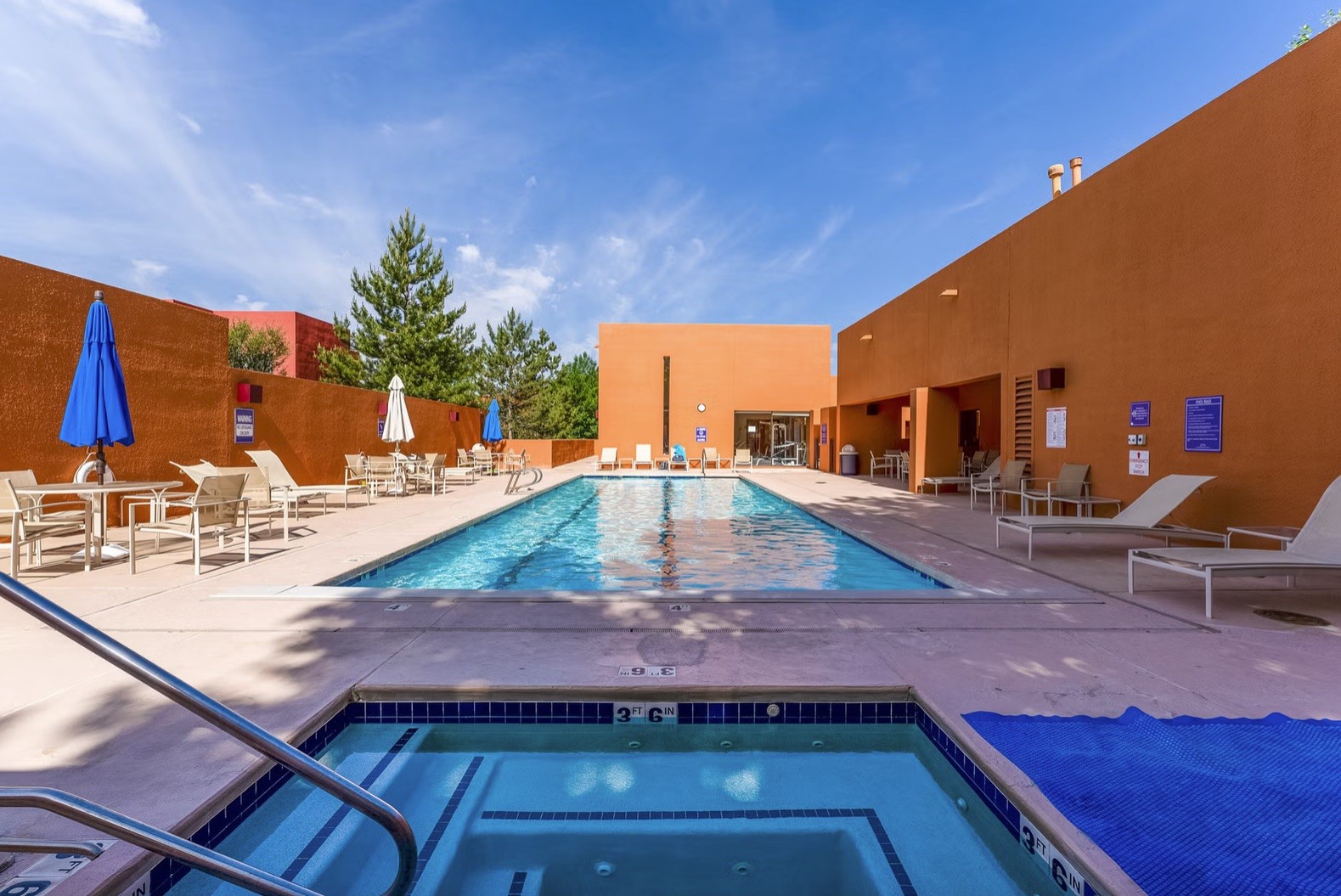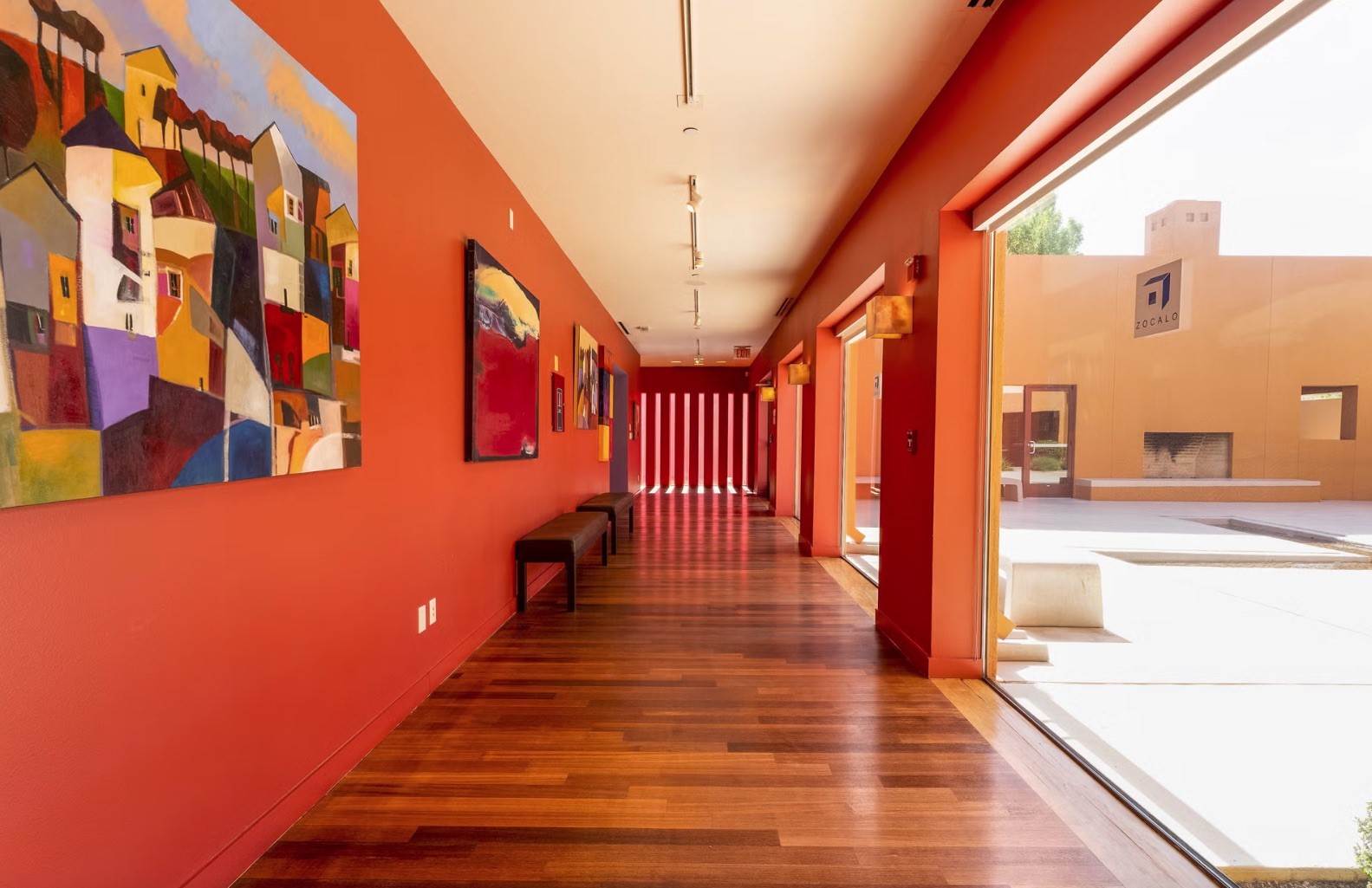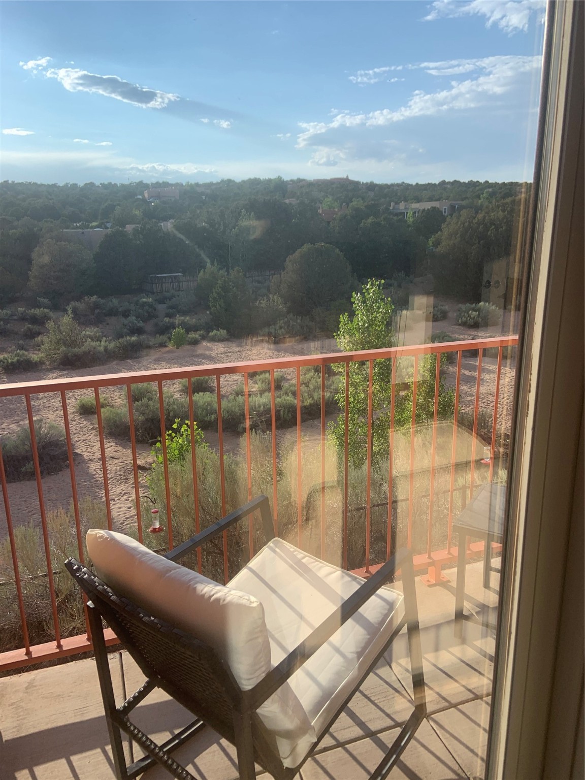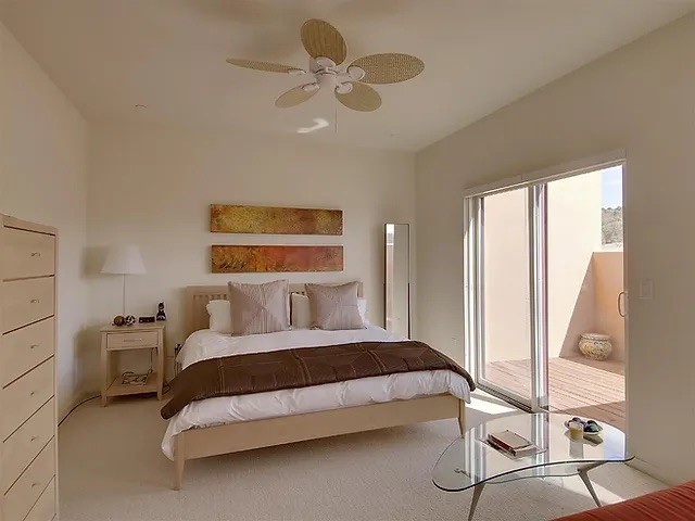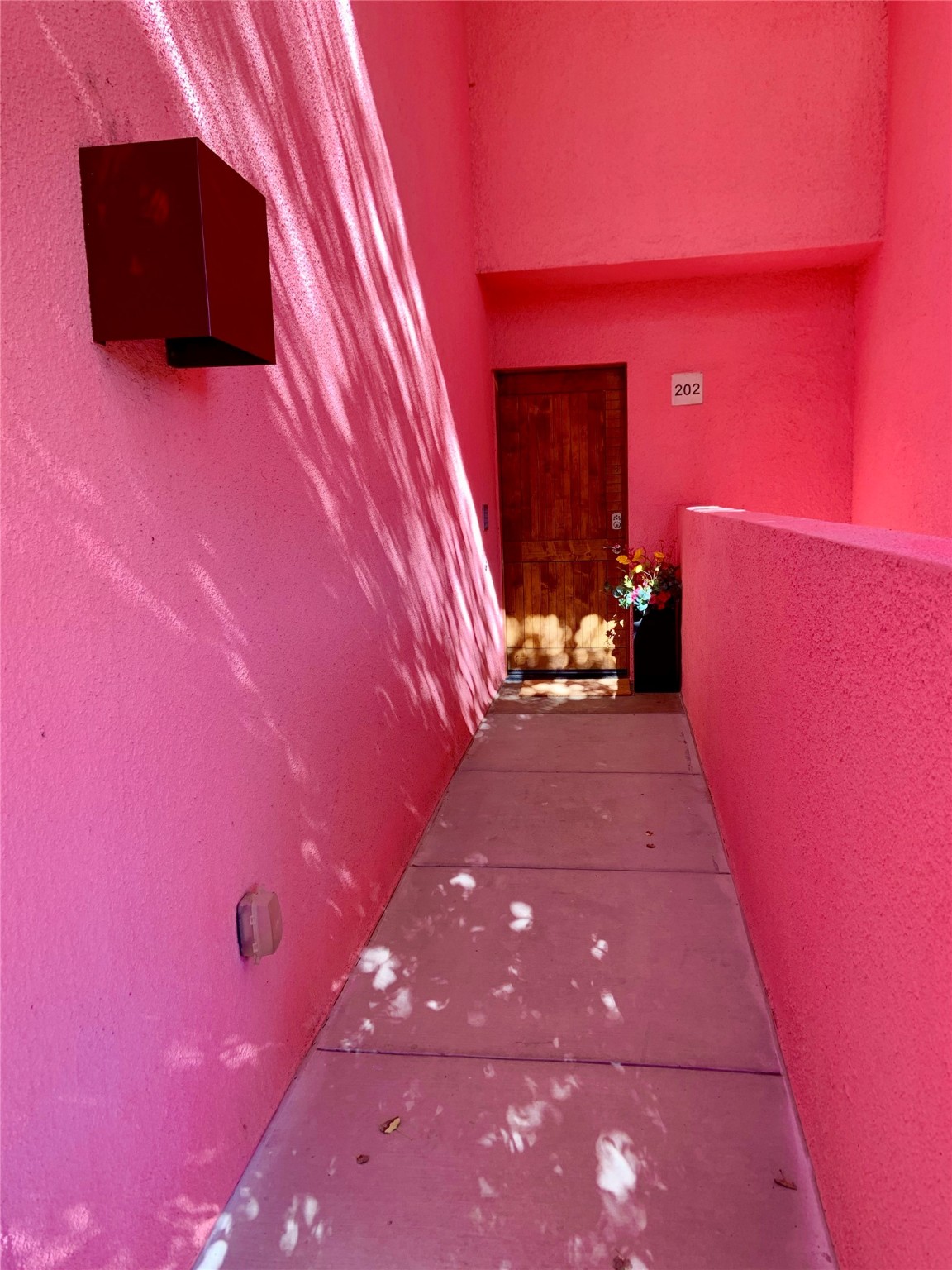 Discover this rare, single-level 2 bed/2 bath condominium in the award-winning Zocalo community, designed by renowned architect Ricardo Legorreta. This 1,206+/- sq ft residence offers sleek, soft-contemporary styling with 9' ceilings, 12-inch sandstone floors, in-floor radiant heat, and a private deck with expansive arroyo views. Recently remodeled, the open-concept layout features a light-filled living area with direct access--no stairs--from either the front door or the finished one-car garage. The kitchen includes natural stone countertops and GE Profile appliances, while both bathrooms feature elegant stone finishes. Bedrooms are carpeted in a tight-weave grey and thoughtfully placed for privacy. Zocalo residents enjoy resort-style amenities: a private clubhouse with pool, hot tub, gym, fireplace lounge, and meeting spaces--all just ~4 miles from the Santa Fe Plaza. Located in the Northern Hills with easy access to downtown, the Opera, hiking trails, and skiing, this unit offers refined living in a vibrant architectural setting. Enjoy the convenience of a private garage, separate laundry area, and refrigerated A/C, plus the vibrant color, clean geometry, and masterful use of light that define Legorreta's celebrated design.