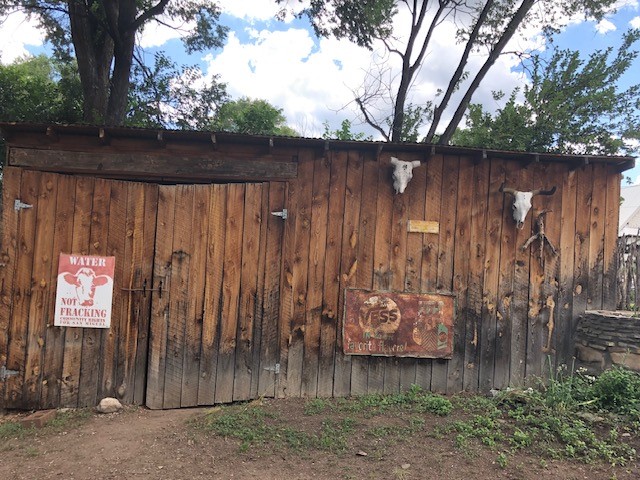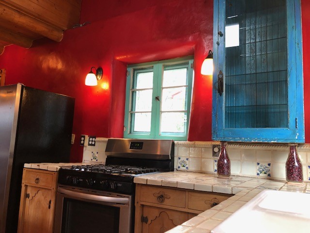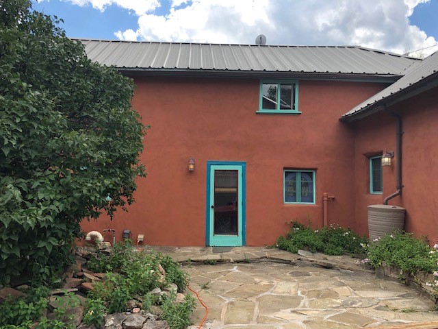 This one-of-a-kind adobe house has a fascinating history. It was built as a "bounty house" after the Civil War: soldiers could have a piece of land for free if they built a certain minimum size house on it. The bounty house is the living room of this house - a large room with wood floor and high ceiling made of vigas and latillas. With a red enamel gas stove at the far end, a built-in bookcase near the front door, and Mexican light fixtures, it is a charming entry to the house. The rest of the house was built onto this structure later and includes a bathroom with walk-in tub, a laundry area, and a large homey kitchen downstairs. The kitchen has a large 5-burner gas stove and large matching refrigerator and freezer. A spiral staircase leads upstairs to the bedroom, which has bathroom facilities in it (sink, toilet, and claw-foot tub), and a walk-in closet. The lot is 0.29 acres, green and lush and graced with large old trees. There is a large storage shed with slab floor and a couple of patios off the house. The whole property is walled or fenced, and there is an electric gate. Truly a special property.