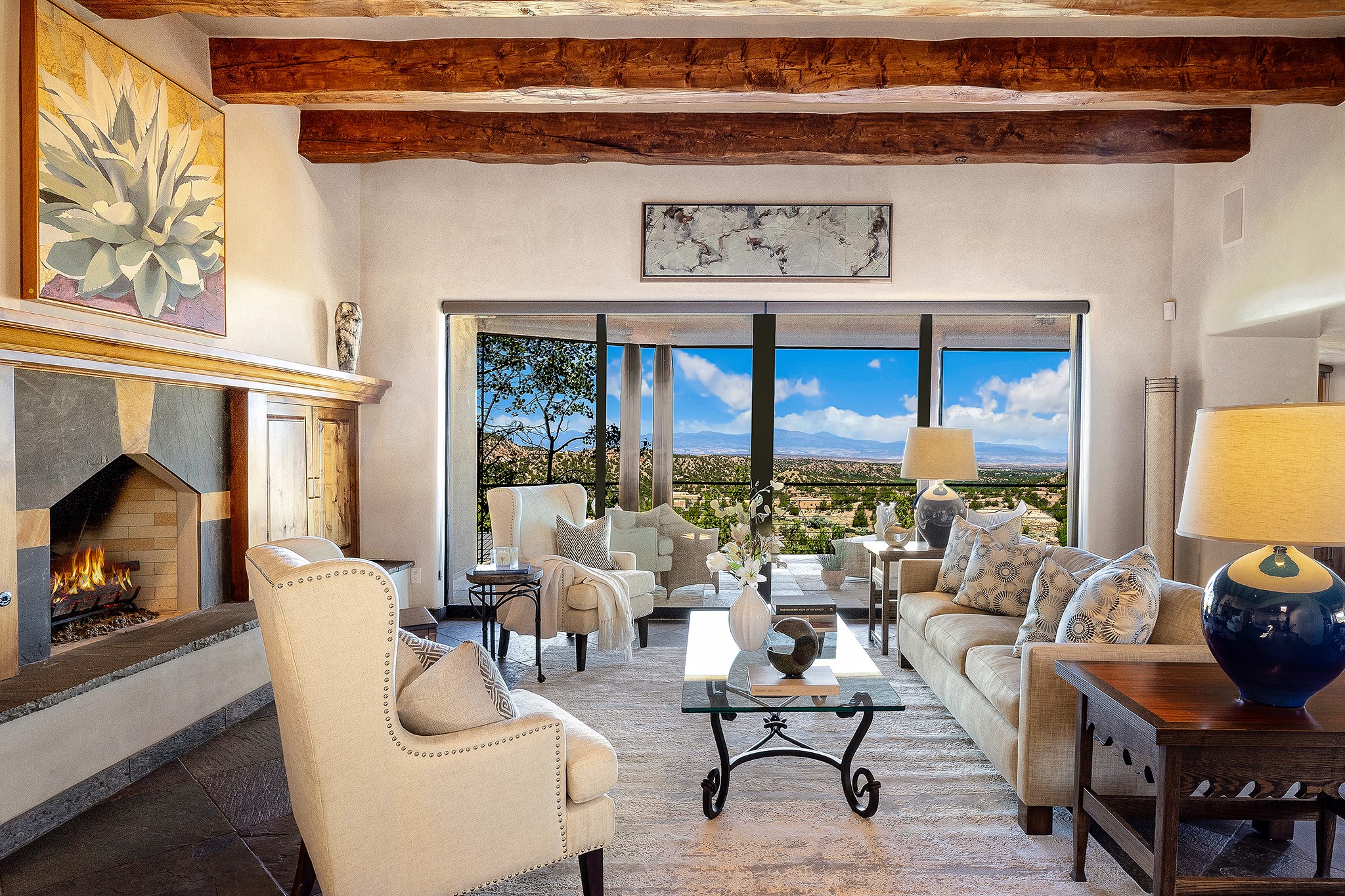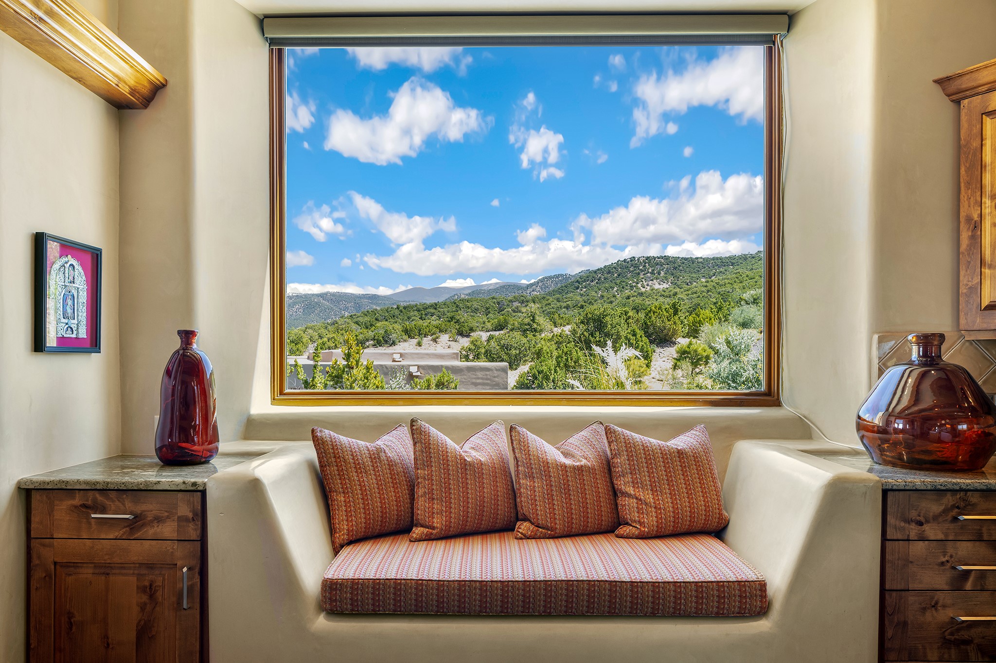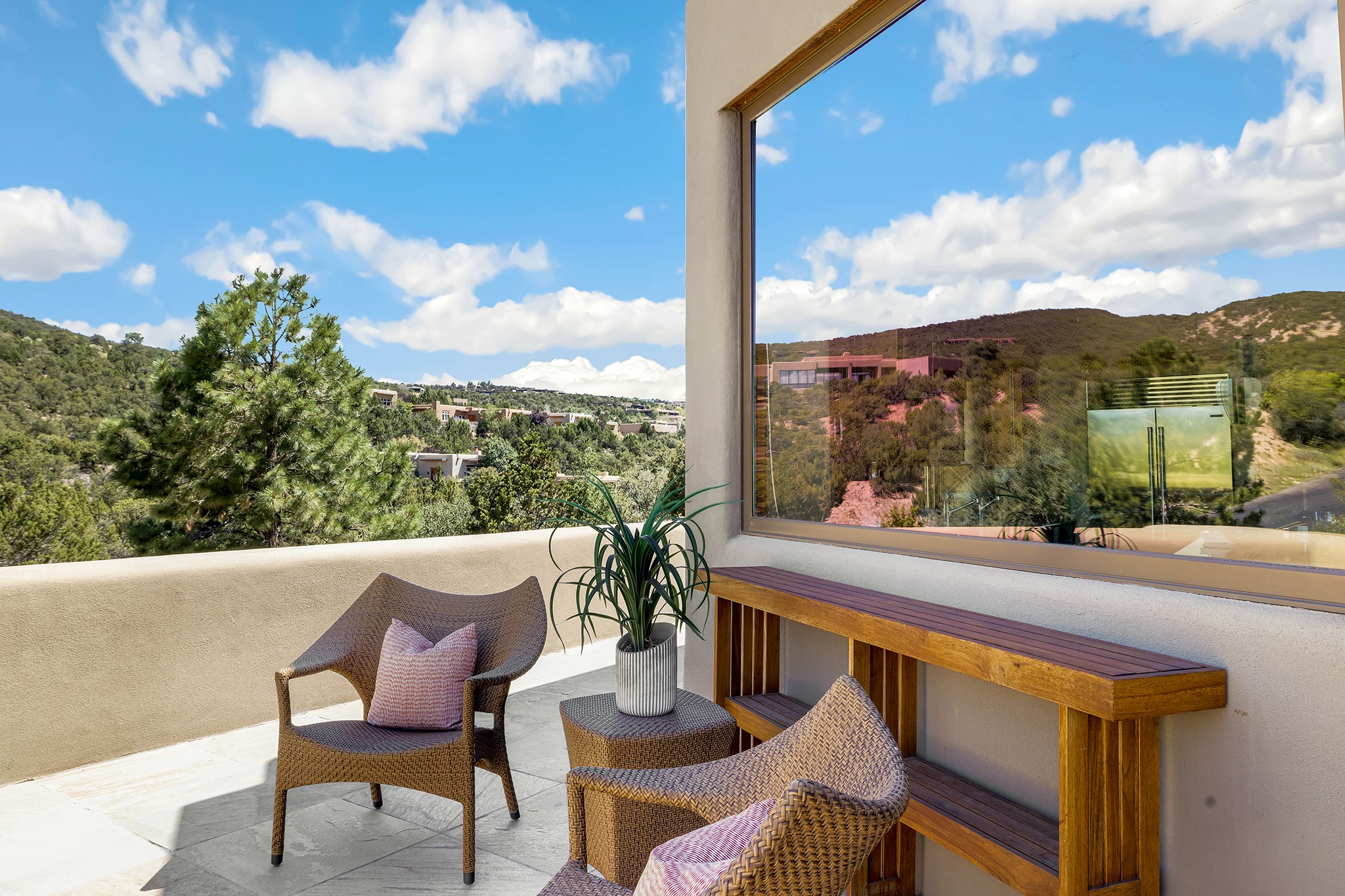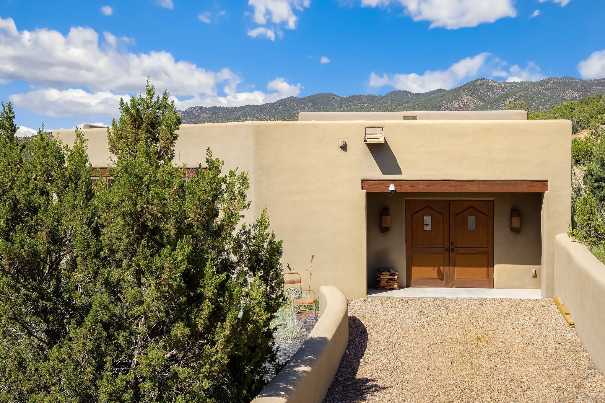 An exceptional Value in Bishop's Lodge Hills & Villas! Perched above the Tesuque hills on 2.38 acres, 9 Lodge Circle offers a rare combination of panoramic mountain views and a unique Southwestern design--all just minutes from the Plaza. Set within the gated community of Bishop's Lodge Hills and Villas, this extraordinary property includes a 4,300 sq. ft. main residence and a versatile 1,500 sq. ft. detached studio, with commanding views of both the Jemez and Sangre de Cristo mountain ranges. The main home is a masterclass in design, showcasing a unique architectural blend of contemporary and Southwestern influences. The central living area features disappearing glass doors that open to a sweeping west-facing portal--perfect for soaking in Santa Fe's golden-hour light. An outdoor cantina with a gas fireplace and built-in grill sets the stage for elegant al fresco entertaining.The chef's kitchen is equally inspired, with a spacious island, cozy banco, butler's pantry, dumbwaiter, and an expansive picture window framing the Sangres. A dramatic dining room with a raised octagonal ceiling and fireplace offers a captivating setting for both intimate and grand gatherings. The primary suite is a private sanctuary, complete with a secluded hot tub for sunset views and stargazing. Two guest suites each offer ensuite baths, while a separate office provides quiet space for work or reflection. The detached 1,500 sq. ft. studio--originally a woodworking shop-- brimming with potential as a creative studio, gym, or guest quarters. As a bonus, ownership includes social membership privileges at the world-renowned Bishop's Lodge Resort. With its new price of $3,395,000, this exceptional property presents a compelling value in one of Santa Fe's most coveted locations--where design, privacy, and inspiration converge.