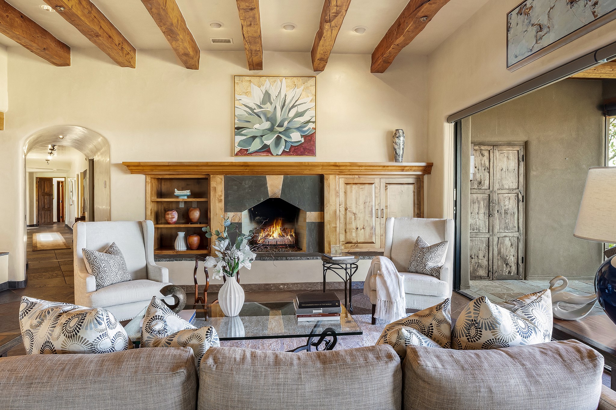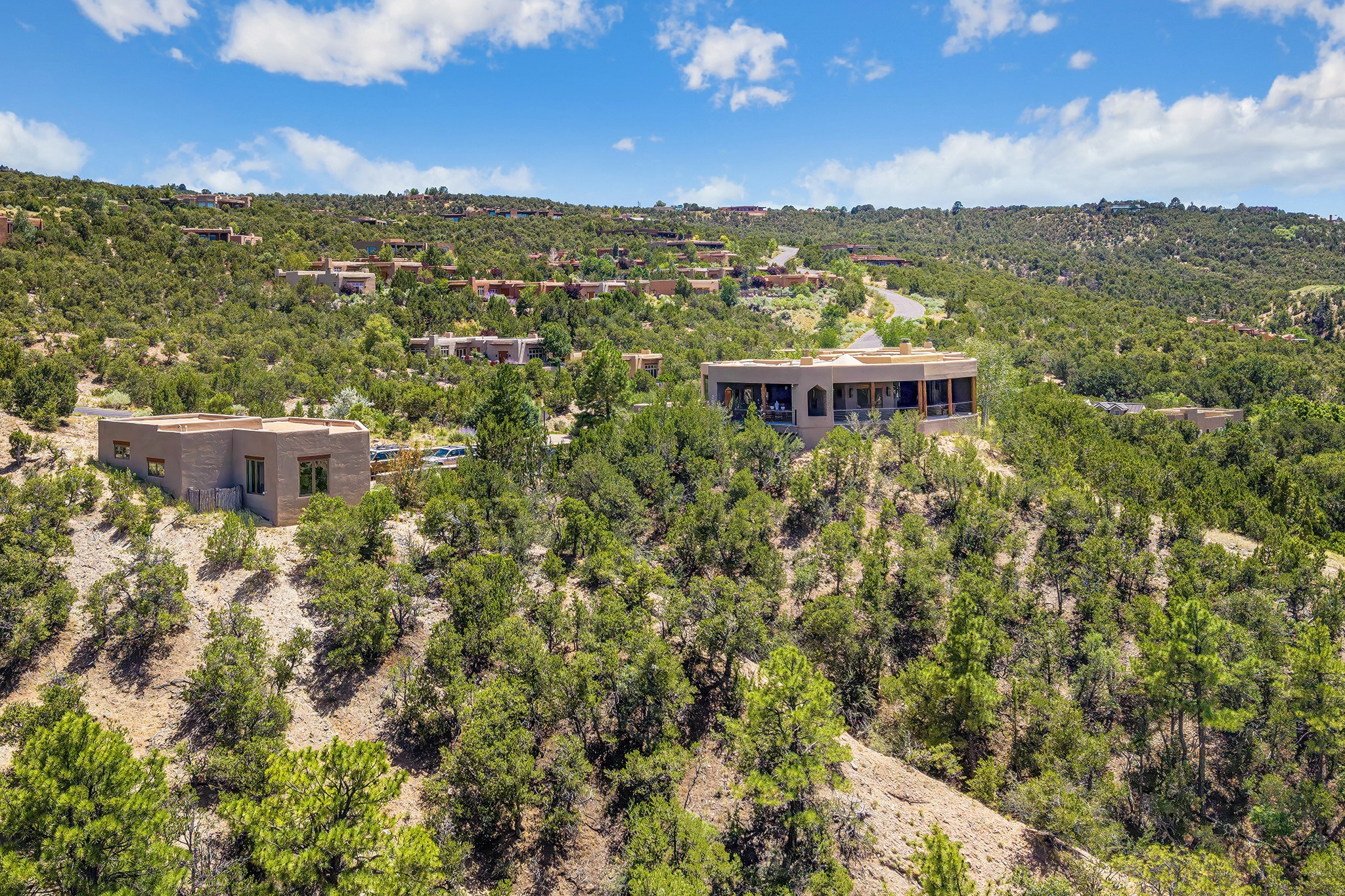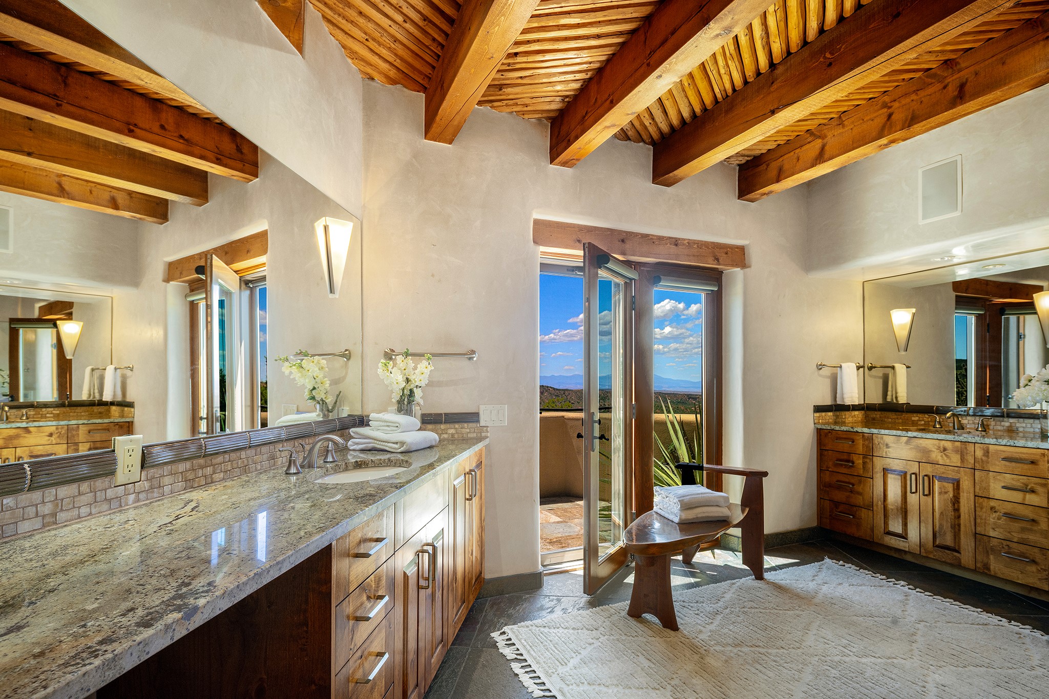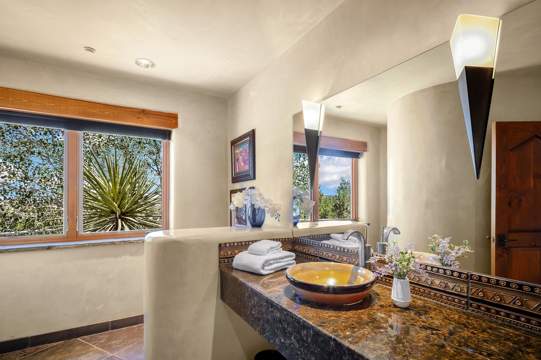 An exceptional Value in Bishop's Lodge Hills & Villas! Perched above the Tesuque hills on 2.38 acres, 9 Lodge Circle offers a rare combination of panoramic mountain views and a unique Southwestern design--all just minutes from the Plaza. Set within the gated community of Bishop's Lodge Hills and Villas, this extraordinary property includes a 4,300 sq. ft. main residence and a versatile 1,500 sq. ft. detached studio, with commanding views of both the Jemez and Sangre de Cristo mountain ranges. The main home is a masterclass in design, showcasing a unique architectural blend of contemporary and Southwestern influences. The central living area features disappearing glass doors that open to a sweeping west-facing portal--perfect for soaking in Santa Fe's golden-hour light. An outdoor cantina with a gas fireplace and built-in grill sets the stage for elegant al fresco entertaining.The chef's kitchen is equally inspired, with a spacious island, cozy banco, butler's pantry, dumbwaiter, and an expansive picture window framing the Sangres. A dramatic dining room with a raised octagonal ceiling and fireplace offers a captivating setting for both intimate and grand gatherings. The primary suite is a private sanctuary, complete with a secluded hot tub for sunset views and stargazing. Two guest suites each offer ensuite baths, while a separate office provides quiet space for work or reflection. The detached 1,500 sq. ft. studio--originally a woodworking shop-- brimming with potential as a creative studio, gym, or guest quarters. As a bonus, ownership includes social membership privileges at the world-renowned Bishop's Lodge Resort. With its new price of $3,395,000, this exceptional property presents a compelling value in one of Santa Fe's most coveted locations--where design, privacy, and inspiration converge.