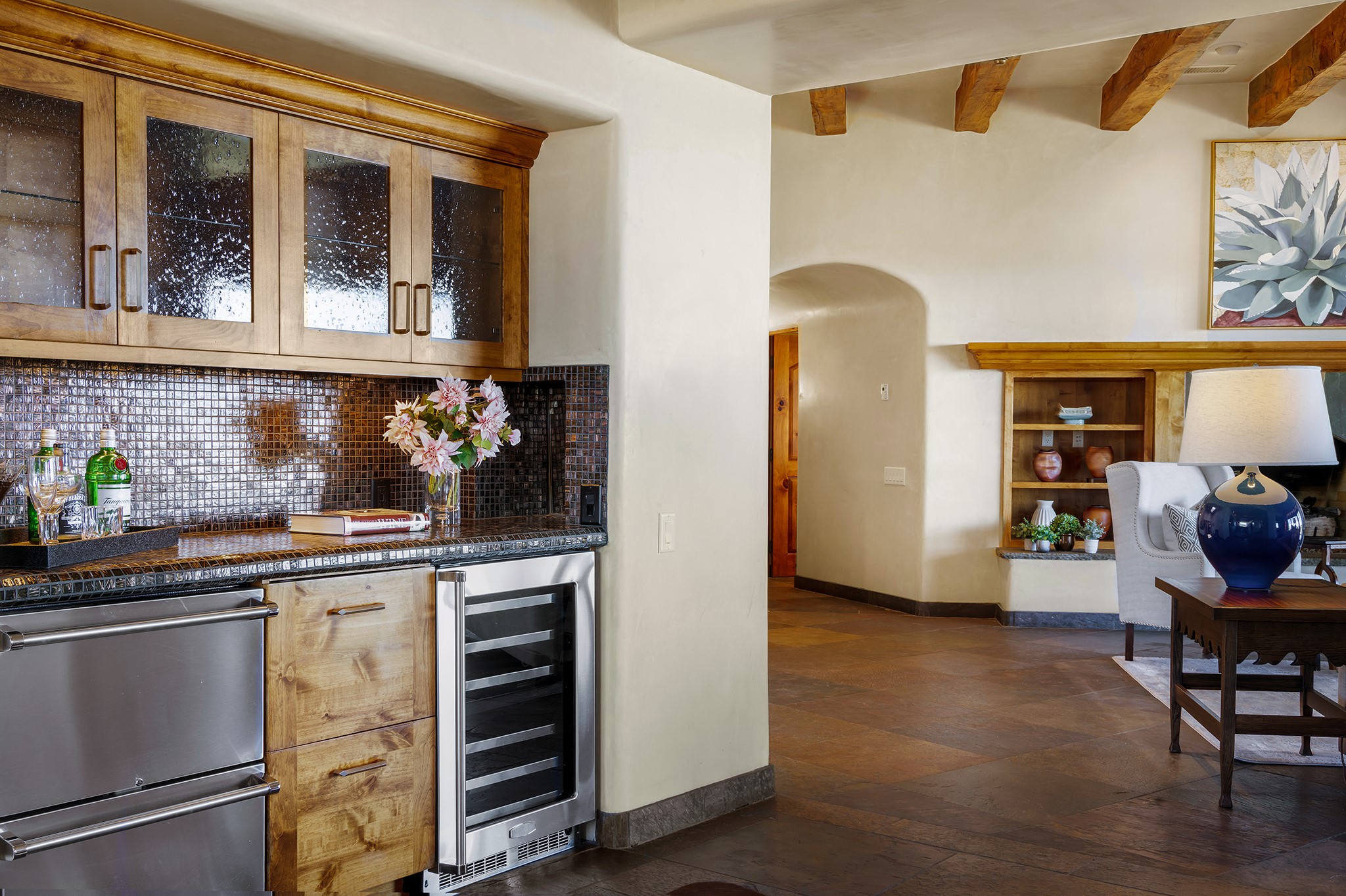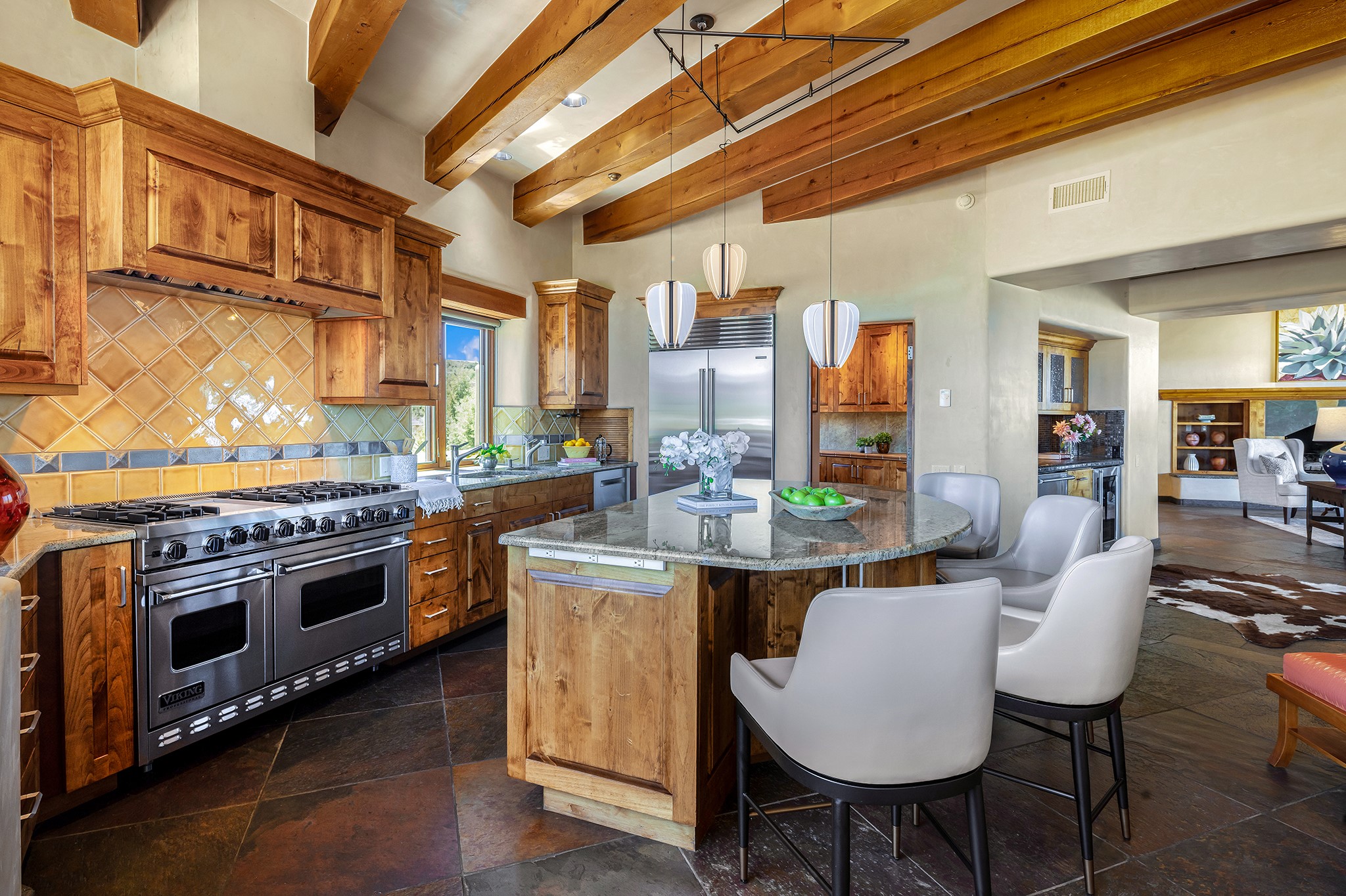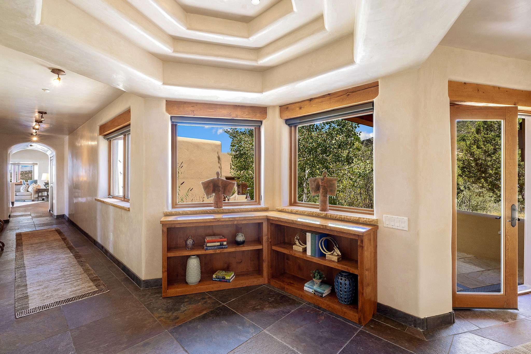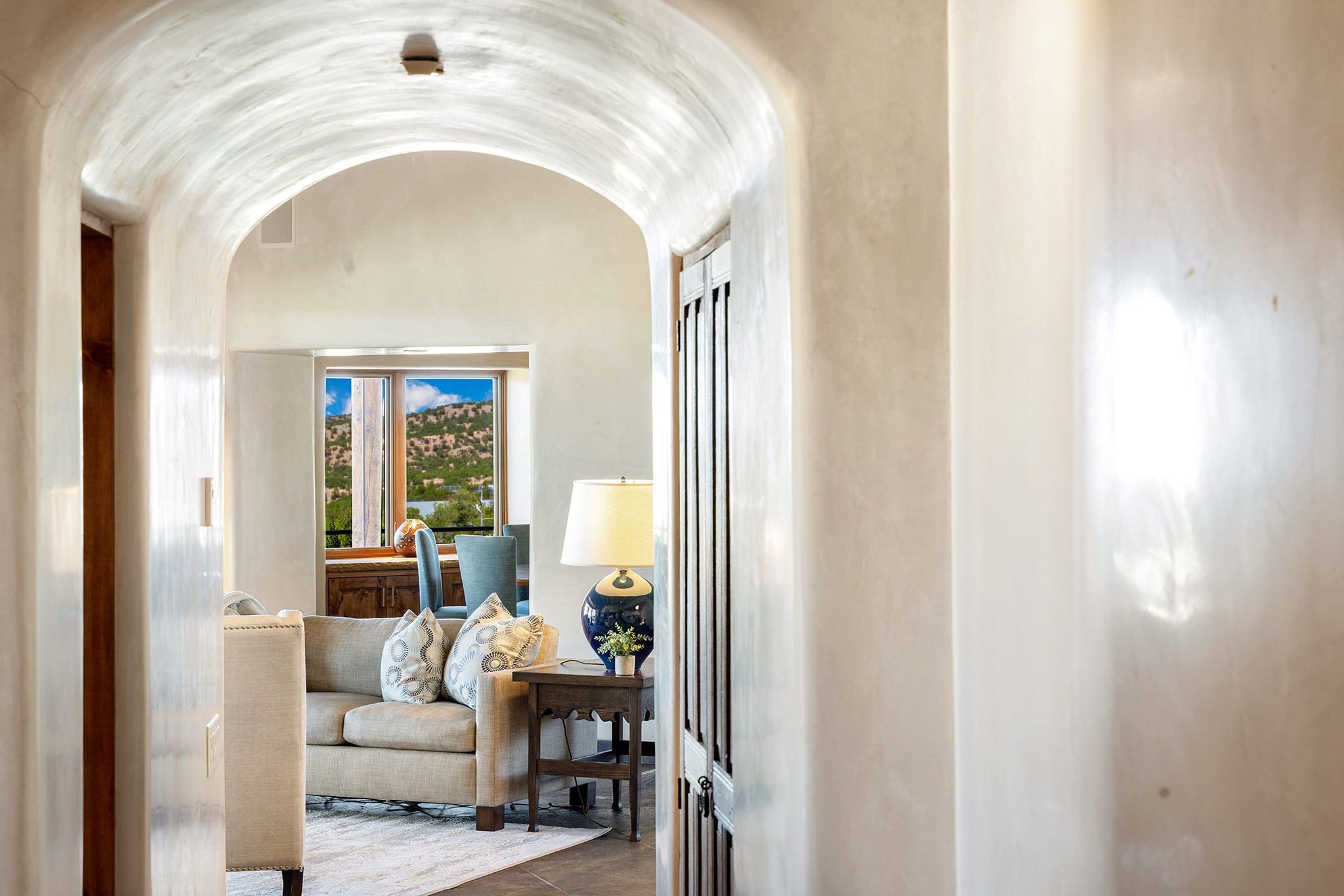 An exceptional Value in Bishop's Lodge Hills & Villas! Perched above the Tesuque hills on 2.38 acres, 9 Lodge Circle offers a rare combination of panoramic mountain views and a unique Southwestern design--all just minutes from the Plaza. Set within the gated community of Bishop's Lodge Hills and Villas, this extraordinary property includes a 4,300 sq. ft. main residence and a versatile 1,500 sq. ft. detached studio, with commanding views of both the Jemez and Sangre de Cristo mountain ranges. The main home is a masterclass in design, showcasing a unique architectural blend of contemporary and Southwestern influences. The central living area features disappearing glass doors that open to a sweeping west-facing portal--perfect for soaking in Santa Fe's golden-hour light. An outdoor cantina with a gas fireplace and built-in grill sets the stage for elegant al fresco entertaining.The chef's kitchen is equally inspired, with a spacious island, cozy banco, butler's pantry, dumbwaiter, and an expansive picture window framing the Sangres. A dramatic dining room with a raised octagonal ceiling and fireplace offers a captivating setting for both intimate and grand gatherings. The primary suite is a private sanctuary, complete with a secluded hot tub for sunset views and stargazing. Two guest suites each offer ensuite baths, while a separate office provides quiet space for work or reflection. The detached 1,500 sq. ft. studio--originally a woodworking shop-- brimming with potential as a creative studio, gym, or guest quarters. As a bonus, ownership includes social membership privileges at the world-renowned Bishop's Lodge Resort. With its new price of $3,395,000, this exceptional property presents a compelling value in one of Santa Fe's most coveted locations--where design, privacy, and inspiration converge.