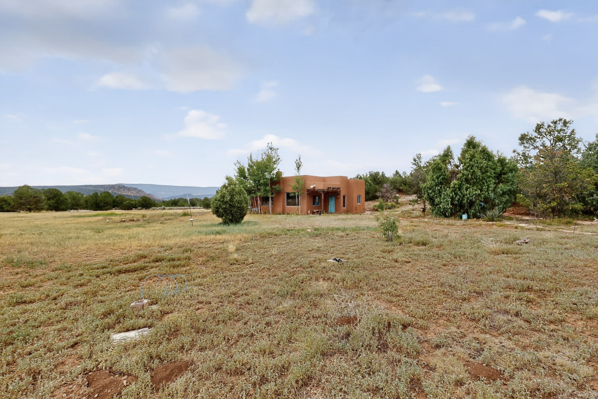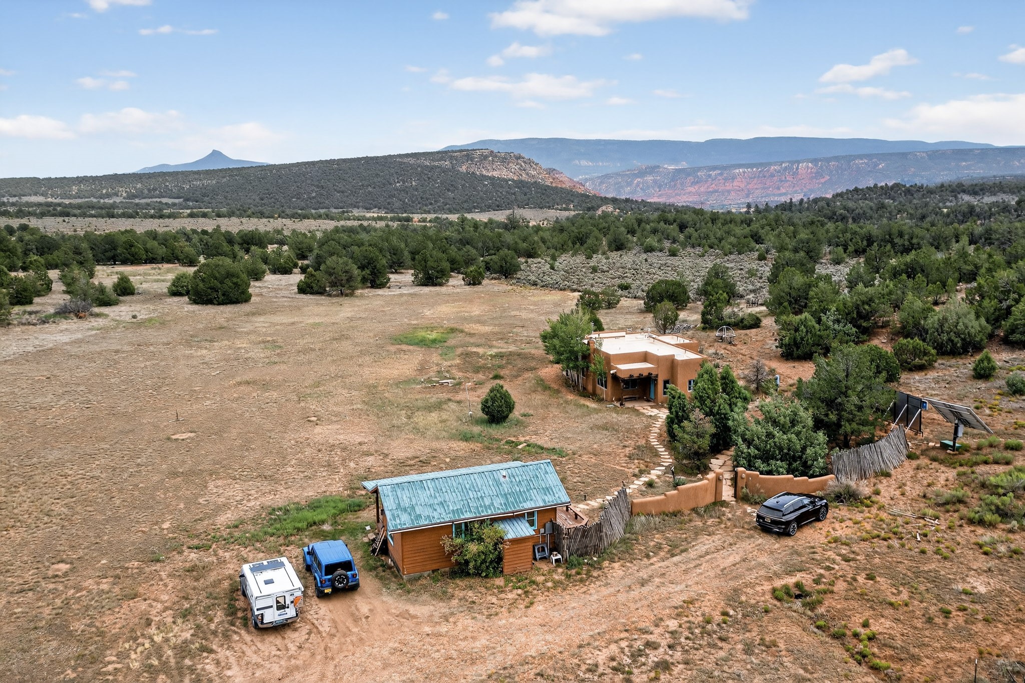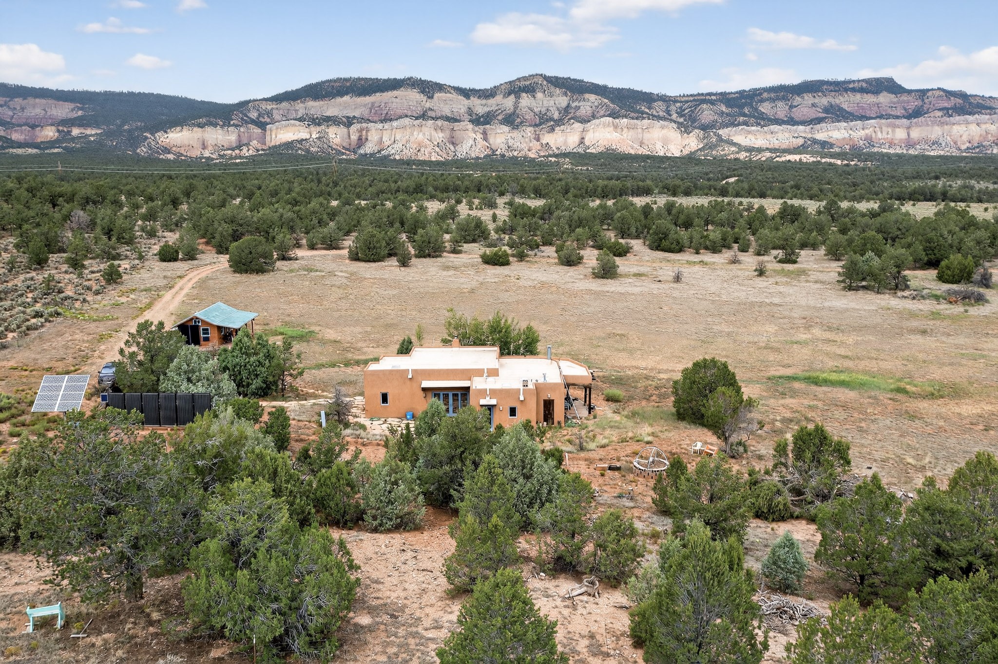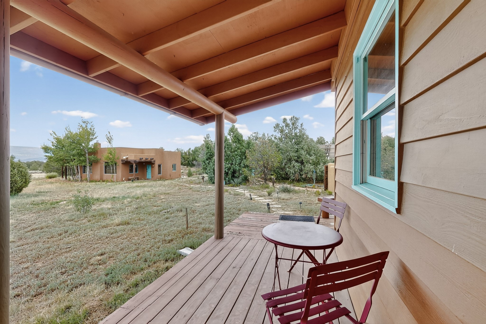 If you yearn for privacy surrounded by natural beauty, this is the place you have been searching for. This home, known as "Casa Alegre," the Happy House, and the nearby guest house offer quality custom construction with expansive views from every room including the guest house deck, the entrance portal (porch) of the main house as well as the two large picture windows in the great room of the main house. The traditional Pueblo Revival Style of this home, features bancos that beckon you to sit and appreciate the enchanting everchanging views to be experienced and appreciated at any moment in the day throughout the year. Look beyond the open meadow to the timeless, dramatic Mesa, with its varied hues of strata that provide clues to the geologic history of this land. This home is located in an area that is rich in history and the remnants of past cultures tell a story of the ancestral inhabitants of the land. The landscape beyond the open space of the meadow is an incredible example of high desert Juniper, Pinon and Ponderosa forest mix - all occupying the same ecosystem harmoniously. The wildlife that is drawn to this area by the two small streams located on the property dwell on this land and the surrounding forest, are a marvel to watch from the safety of this home. It is like watching a Jacques Cousteau land video, if it ever existed, in real time. The home has many very special features among them the beautiful burnished vigas and the saltillo tile flooring accenting the adobe-like, interior walls. Examine each the element whether it be the cabinets, doors, or walls, for it is a work of art, a reflection and an homage of a deep love and appreciation for the land and skies. The guest house is fully equipped with a small kitchen and a full bath/shower combination. Further away from the main home, there are two small outbuildings one of which has occasionally been utilized as extra guest house with a rustic outhouse nearby. With the abundance of New Mexico sunshine, solar panels generate electricity storing it in batteries, should there be a power outage on the distribution line. The panels have been paid in full. There are so many things to discover and learn from this land and the public lands that surround the area. So much has been learned, yet there is so much more to discover. Please watch the 3d VIDEO, The SHOWCASE VIDEO, and the extra photos provided by the seller.