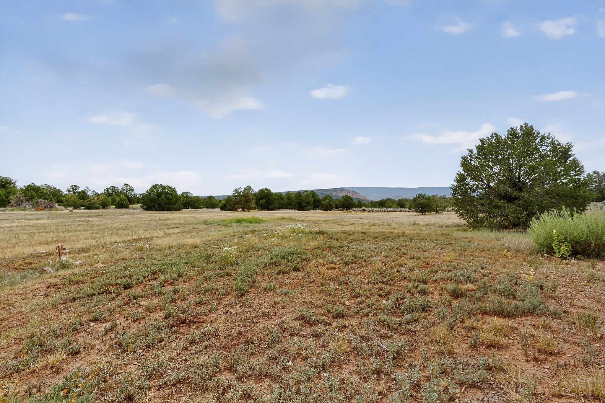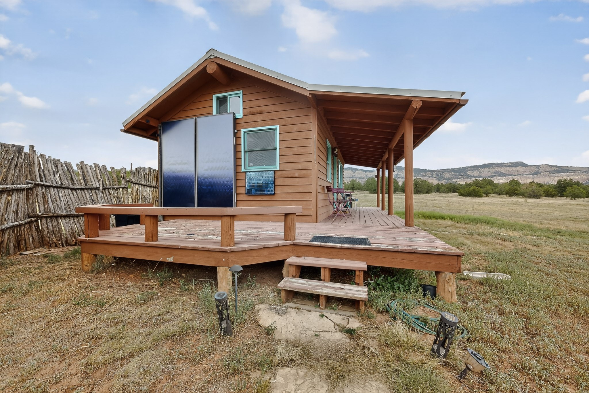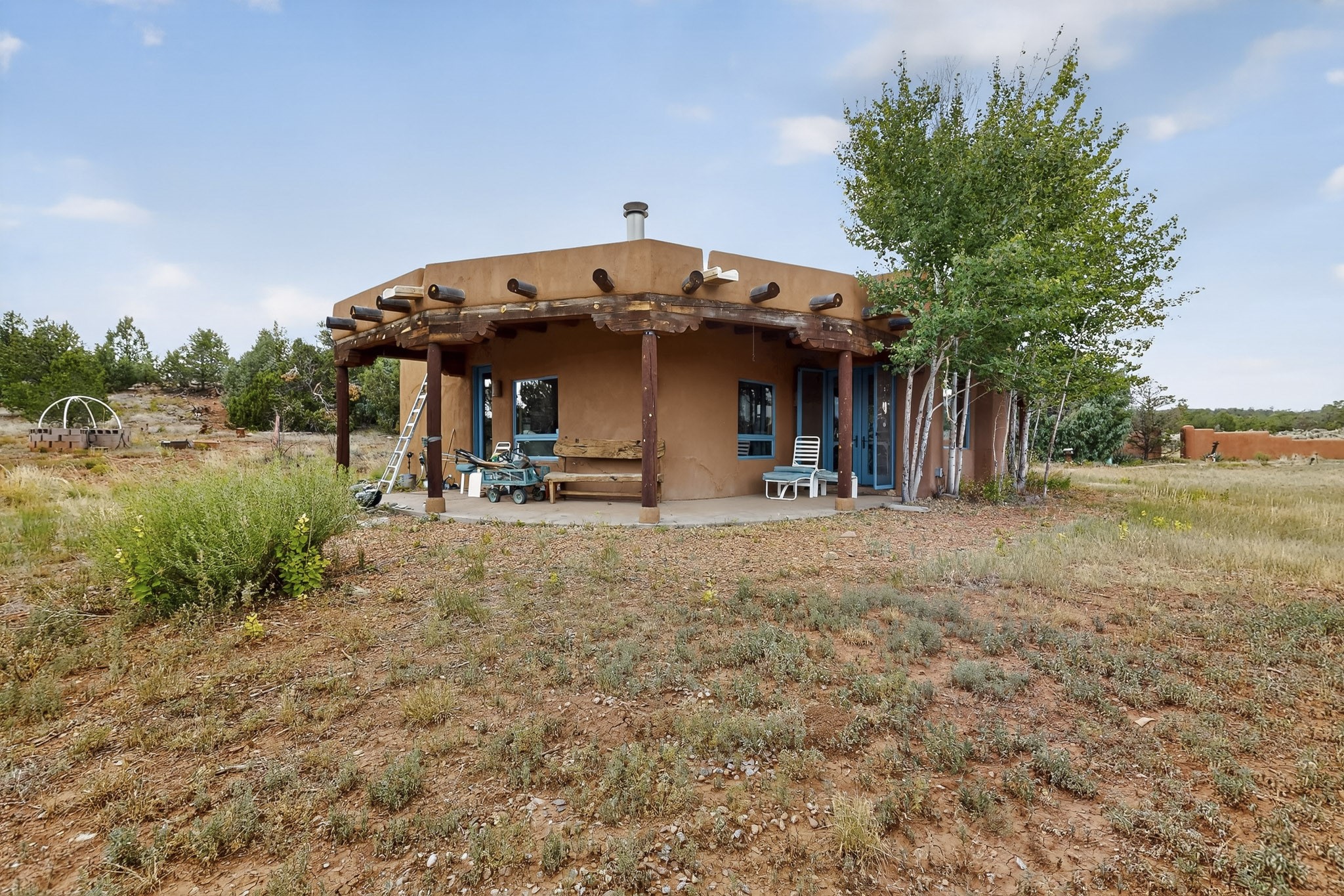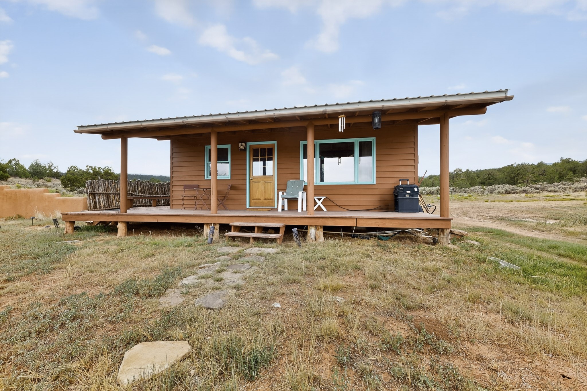 If you yearn for privacy surrounded by natural beauty, this is the place you have been searching for. This home, known as "Casa Alegre," the Happy House, and the nearby guest house offer quality custom construction with expansive views from every room including the guest house deck, the entrance portal (porch) of the main house as well as the two large picture windows in the great room of the main house. The traditional Pueblo Revival Style of this home, features bancos that beckon you to sit and appreciate the enchanting everchanging views to be experienced and appreciated at any moment in the day throughout the year. Look beyond the open meadow to the timeless, dramatic Mesa, with its varied hues of strata that provide clues to the geologic history of this land. This home is located in an area that is rich in history and the remnants of past cultures tell a story of the ancestral inhabitants of the land. The landscape beyond the open space of the meadow is an incredible example of high desert Juniper, Pinon and Ponderosa forest mix - all occupying the same ecosystem harmoniously. The wildlife that is drawn to this area by the two small streams located on the property dwell on this land and the surrounding forest, are a marvel to watch from the safety of this home. It is like watching a Jacques Cousteau land video, if it ever existed, in real time. The home has many very special features among them the beautiful burnished vigas and the saltillo tile flooring accenting the adobe-like, interior walls. Examine each the element whether it be the cabinets, doors, or walls, for it is a work of art, a reflection and an homage of a deep love and appreciation for the land and skies. The guest house is fully equipped with a small kitchen and a full bath/shower combination. Further away from the main home, there are two small outbuildings one of which has occasionally been utilized as extra guest house with a rustic outhouse nearby. With the abundance of New Mexico sunshine, solar panels generate electricity storing it in batteries, should there be a power outage on the distribution line. The panels have been paid in full. There are so many things to discover and learn from this land and the public lands that surround the area. So much has been learned, yet there is so much more to discover. Please watch the 3d VIDEO, The SHOWCASE VIDEO, and the extra photos provided by the seller.