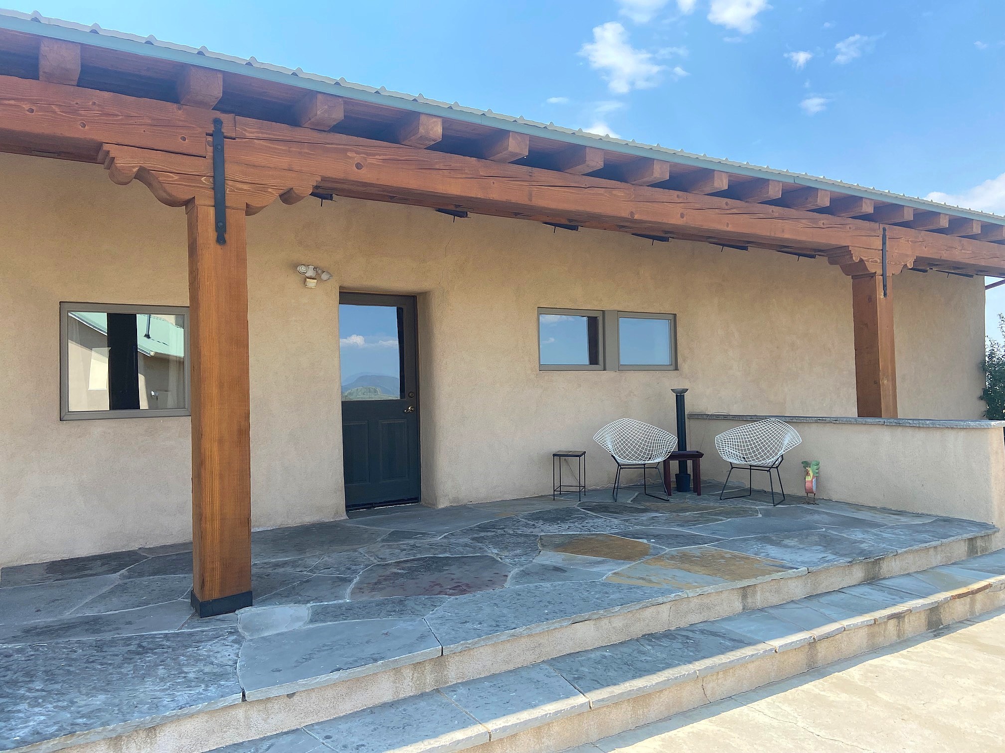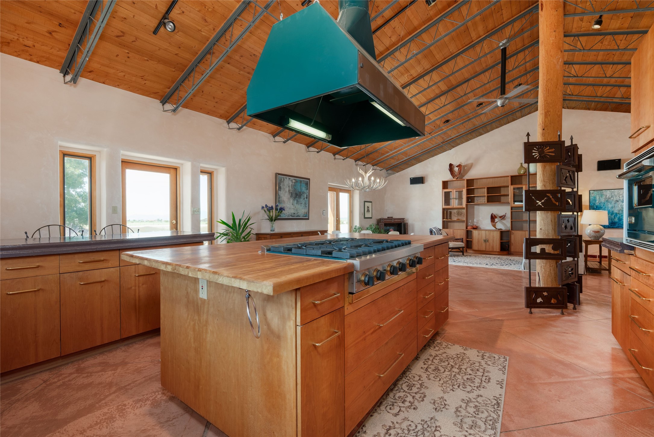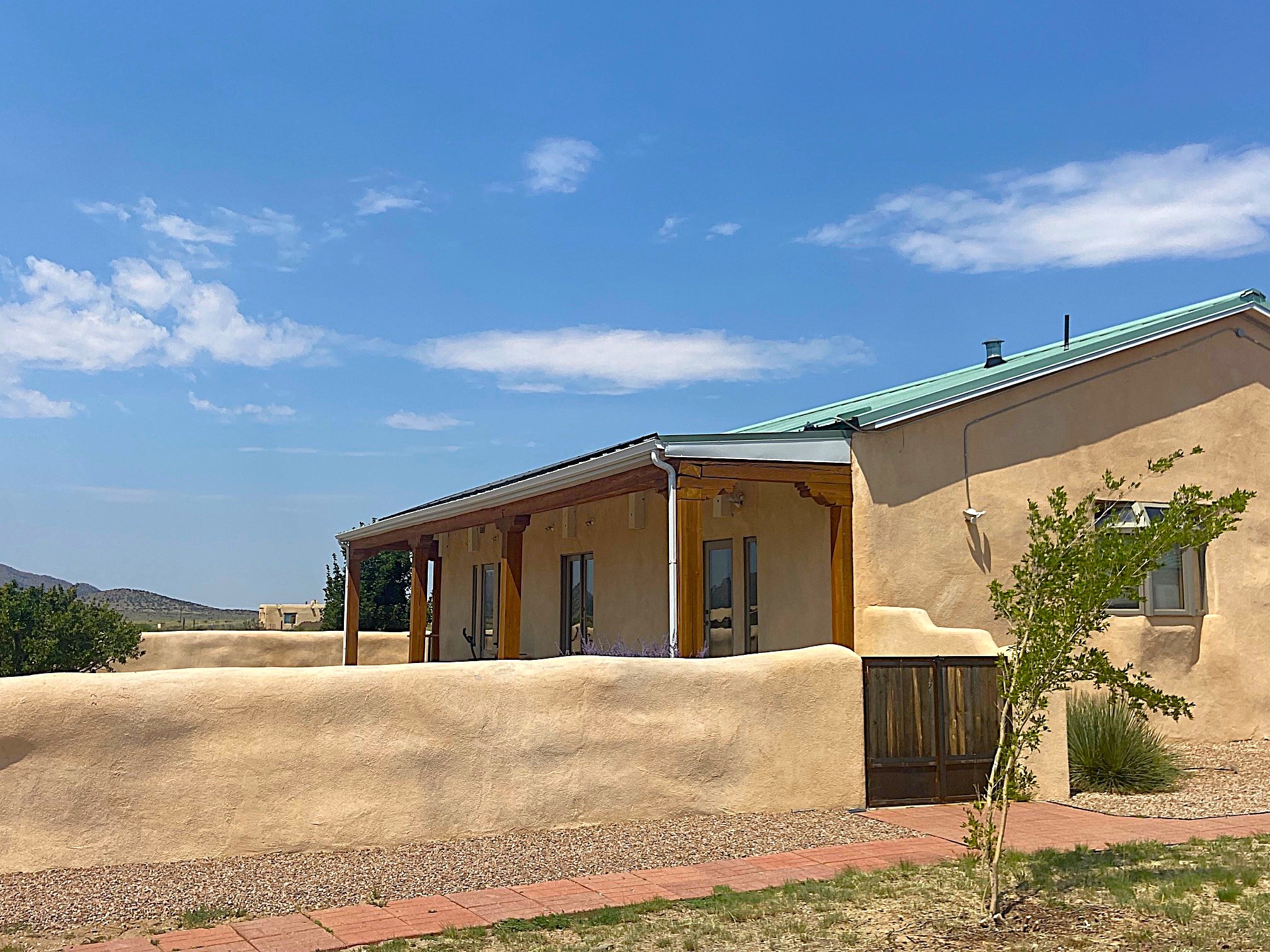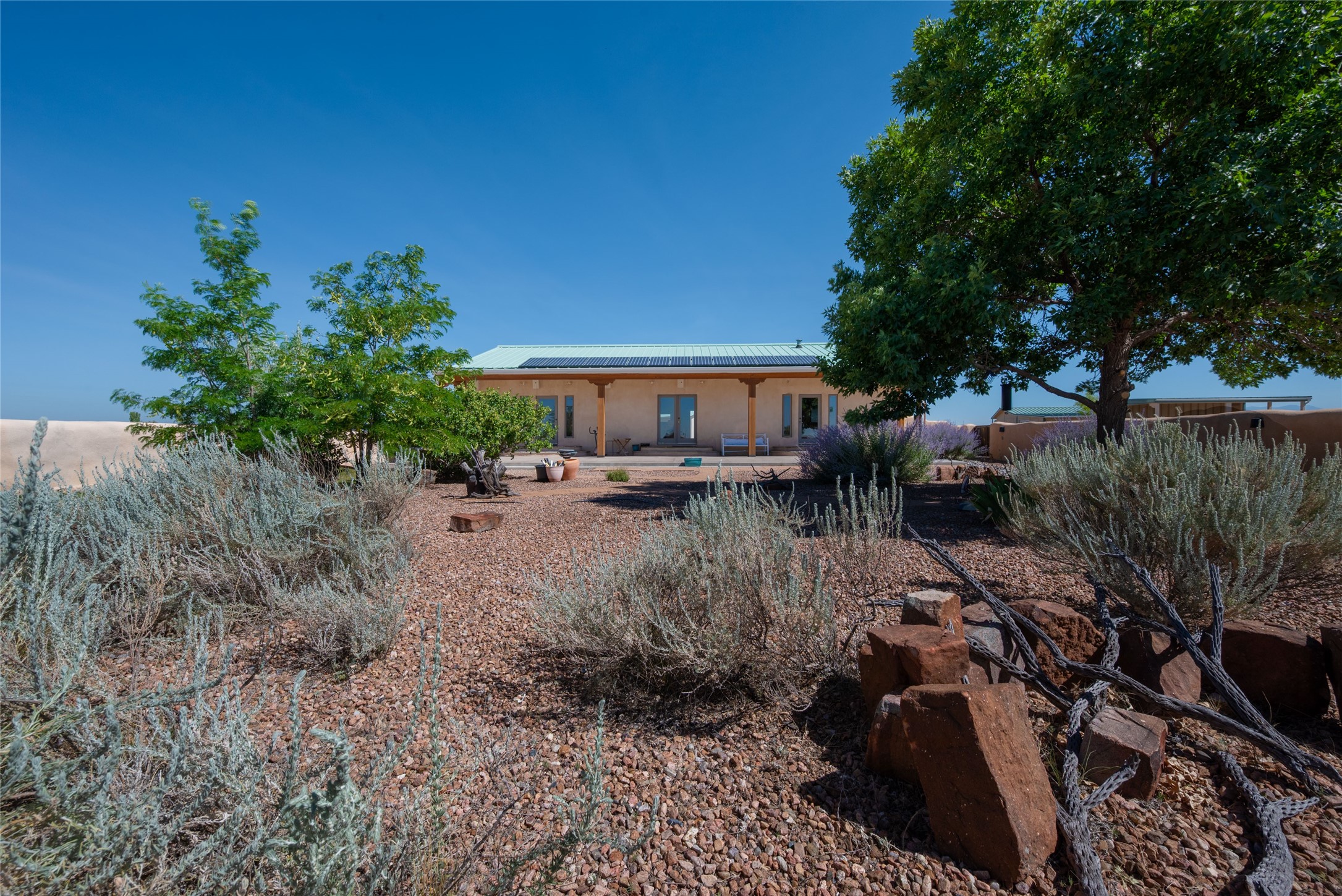 Just minutes from the vibrant City of Santa Fe begins the legendary Turquoise Trail. The iconic and historic byway is the location of this artistically inspired compound. Just minutes from all the conveniences of the City Different but a world away. Sited on a private and fully fenced 5.5 acre parcel the property enjoys expansive vistas, mountain views and dark night skies. The main house features strawbale construction with high cathedral wood deck and exposed steel truss ceilings. The interior walls are hard-trowelled plaster, the floors exposed concrete, and the countertops cast-in-place. The open-floor plan and numerous windows and patio doors invite the natural light while offering a great space for entertaining or just chilling. The chef's kitchen features a 6-burner Viking gas cooktop, Viking dual-burner convection oven, Viking compactor, Sub-Zero refrigerator/freezer, and Bosch dishwasher. Counterspace is beyond generous on the large island, extended counters and peninsula with casual dining bar. The primary bedroom opens to the courtyard and includes a spacious walk-through closet. The primary bath features a resort-sized walk-in shower. A jetted tub in the second bath awaits the end of the day. The stand-alone casita is close enough for convenience but separate enough for privacy. Ideal for visitors or rental income, it's cozy, modern and light-filled. The property also includes a finished garage & studio space, plus carport. The infrastructure includes roof-mounted Solar PV panels and a 3 ac/ft private well. There's plenty of room on the property to add your barn or other improvements. Santa Fe shopping, dining, and medical facilities are just minutes away, as is the Santa Fe airport and I-25 access.