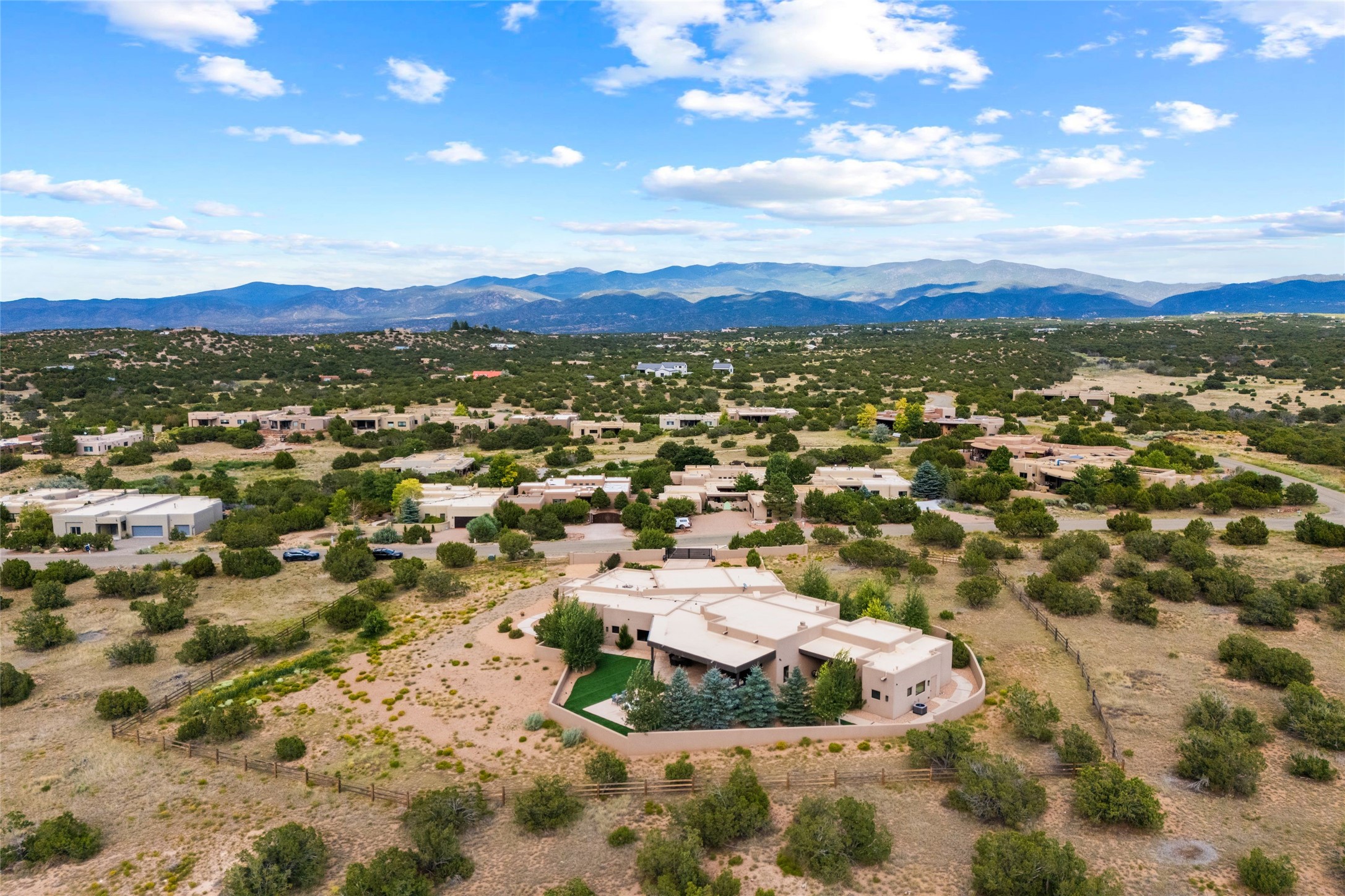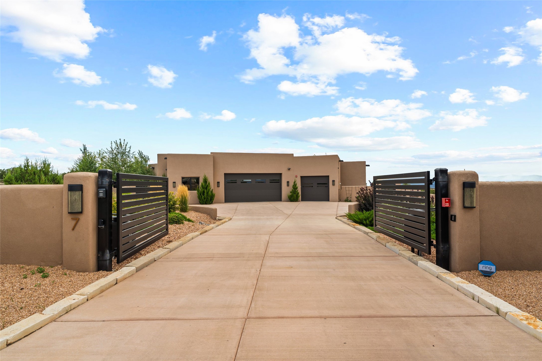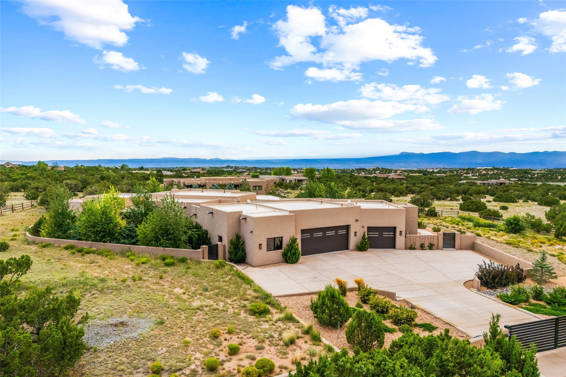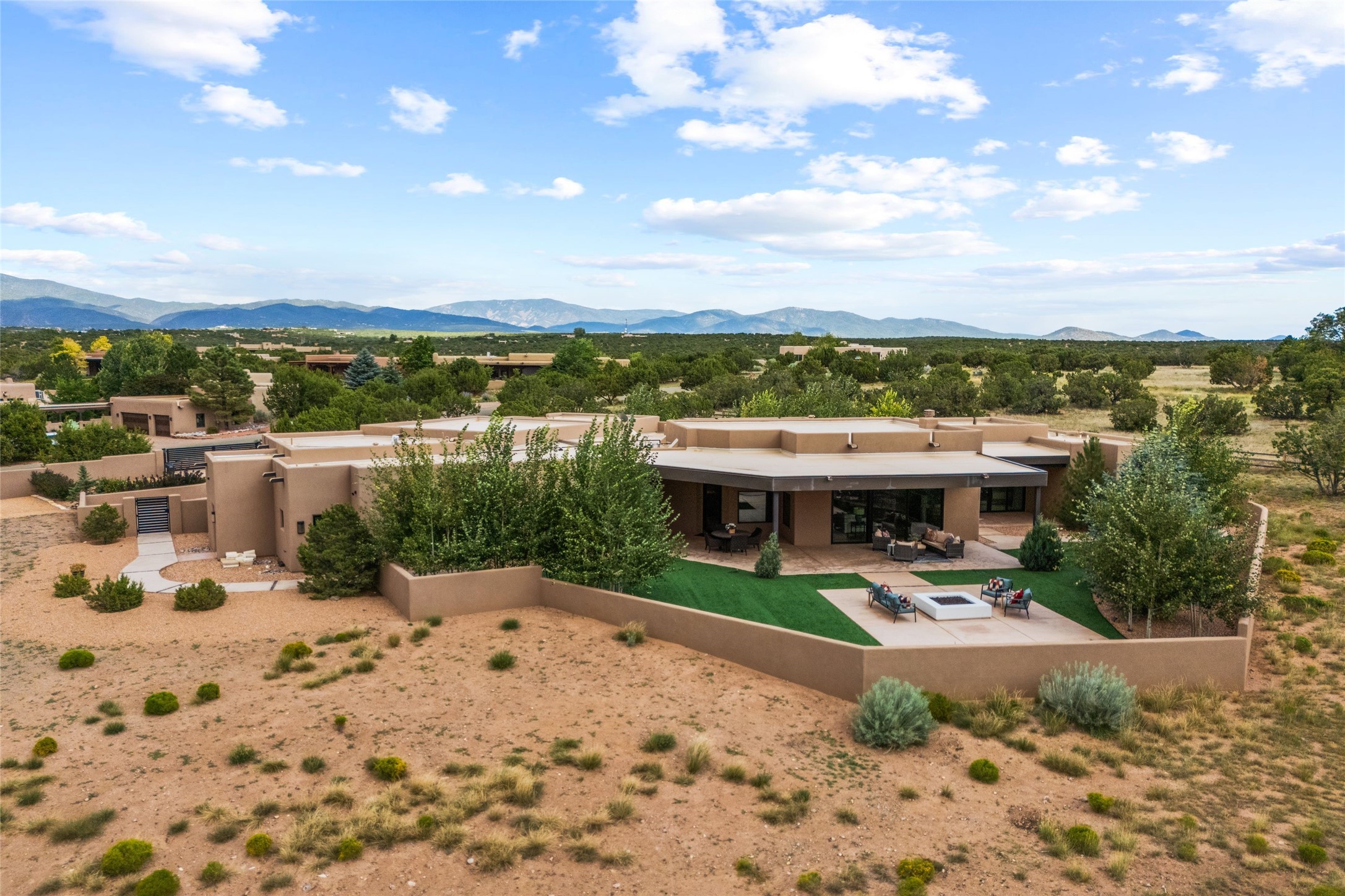 Santa Fe is a vibrant city and this is the home to enjoy it in. Nestled in one of the most sought after neighborhoods, this exceptional custom built home offers the perfect blend of luxury, tranquility, and design. Not far from the downtown, yet situated on 2.5 acres with breathtaking views in all directions. Not too grandiose but just the right amount of wonderful with tall beamed ceilings, tasteful wood floors and an impressive open concept that accommodates flawlessly while continually framing the captivating West views Santa Fe is famous for. Spend your mornings on the south of the home with a delightful seating area amongst fabulously landscaped outdoor spaces with mature spruce and aspen trees and fire pit but be sure to take in the evenings on the rear portal with the custom 65" Cubo Fire Table situated to capture the unparalleled views of the Jemez Mountains. With over a thousand sq ft of covered outdoor spaces, this is the ideal place to enjoy; as beautiful on the inside as on the outside and perfect for entertaining. Heated oversized three car garage, den/bedroom with extra soundproofing great for music enthusiasts or a media room, nicely appointed kitchen, bedrooms en suite, gated entry, Tpo roof, nearby trail systems, no dirt roads, Level 3 ev charger, whole home humidification system and more. If you're looking for a property that combines privacy, elegance, and a connection to the natural beauty of this incredible city, look no further. Come and experience this serene and tranquil beauty, and oh those outdoor spaces!