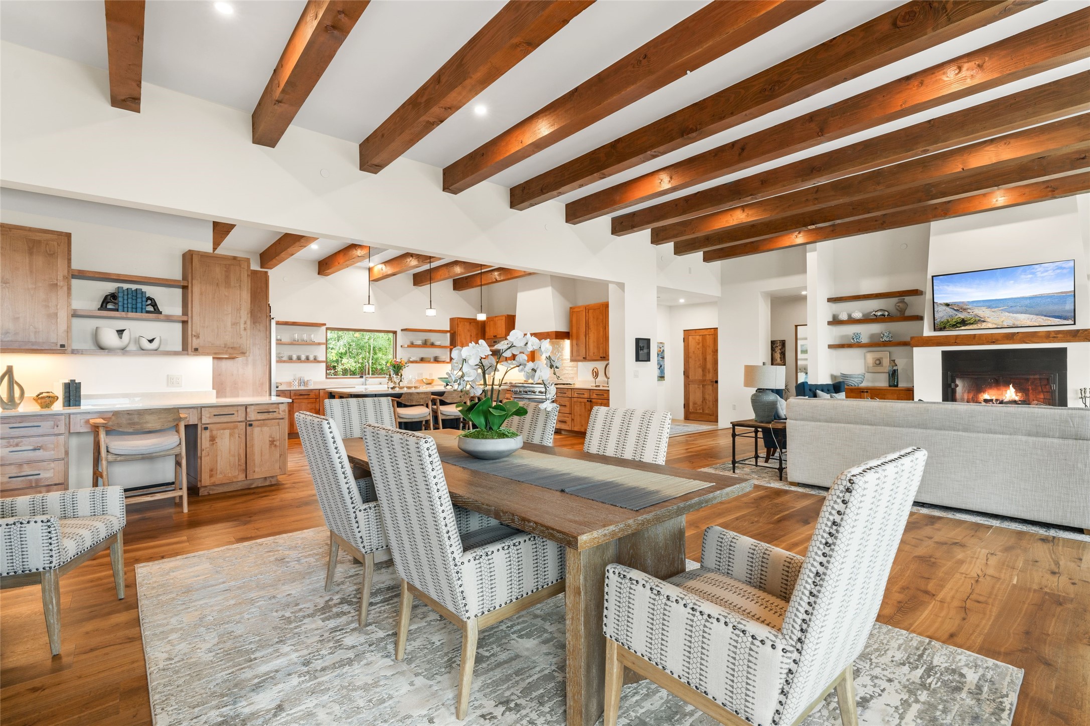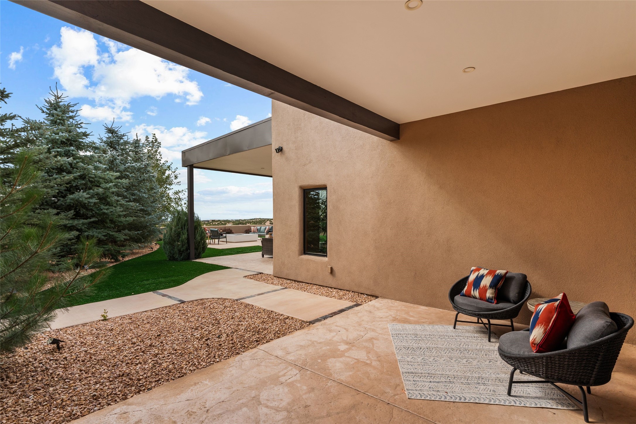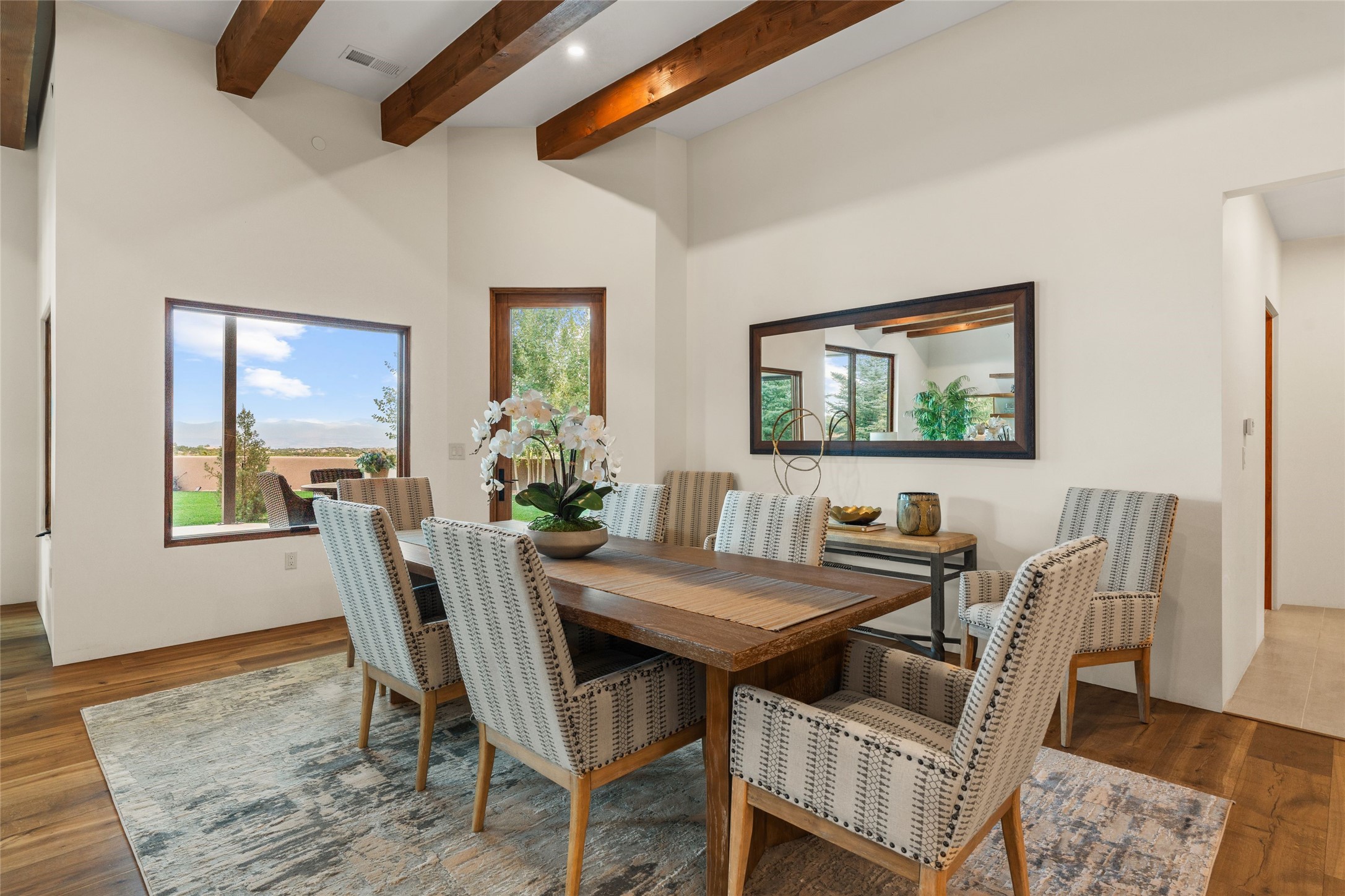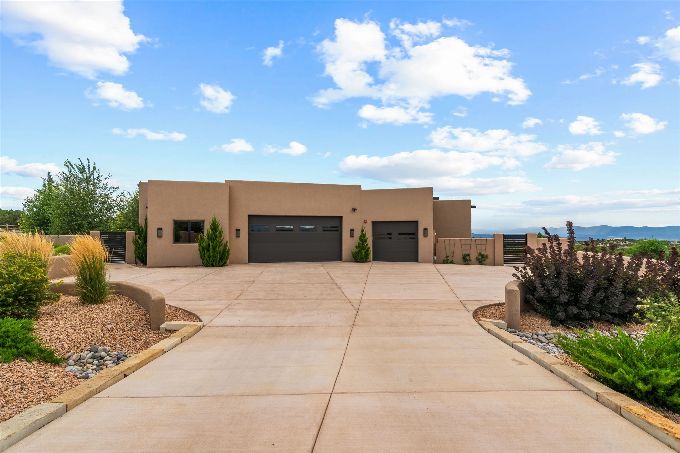 Santa Fe is a vibrant city and this is the home to enjoy it in. Nestled in one of the most sought after neighborhoods, this exceptional custom built home offers the perfect blend of luxury, tranquility, and design. Not far from the downtown, yet situated on 2.5 acres with breathtaking views in all directions. Not too grandiose but just the right amount of wonderful with tall beamed ceilings, tasteful wood floors and an impressive open concept that accommodates flawlessly while continually framing the captivating West views Santa Fe is famous for. Spend your mornings on the south of the home with a delightful seating area amongst fabulously landscaped outdoor spaces with mature spruce and aspen trees and fire pit but be sure to take in the evenings on the rear portal with the custom 65" Cubo Fire Table situated to capture the unparalleled views of the Jemez Mountains. With over a thousand sq ft of covered outdoor spaces, this is the ideal place to enjoy; as beautiful on the inside as on the outside and perfect for entertaining. Heated oversized three car garage, den/bedroom with extra soundproofing great for music enthusiasts or a media room, nicely appointed kitchen, bedrooms en suite, gated entry, Tpo roof, nearby trail systems, no dirt roads, Level 3 ev charger, whole home humidification system and more. If you're looking for a property that combines privacy, elegance, and a connection to the natural beauty of this incredible city, look no further. Come and experience this serene and tranquil beauty, and oh those outdoor spaces!