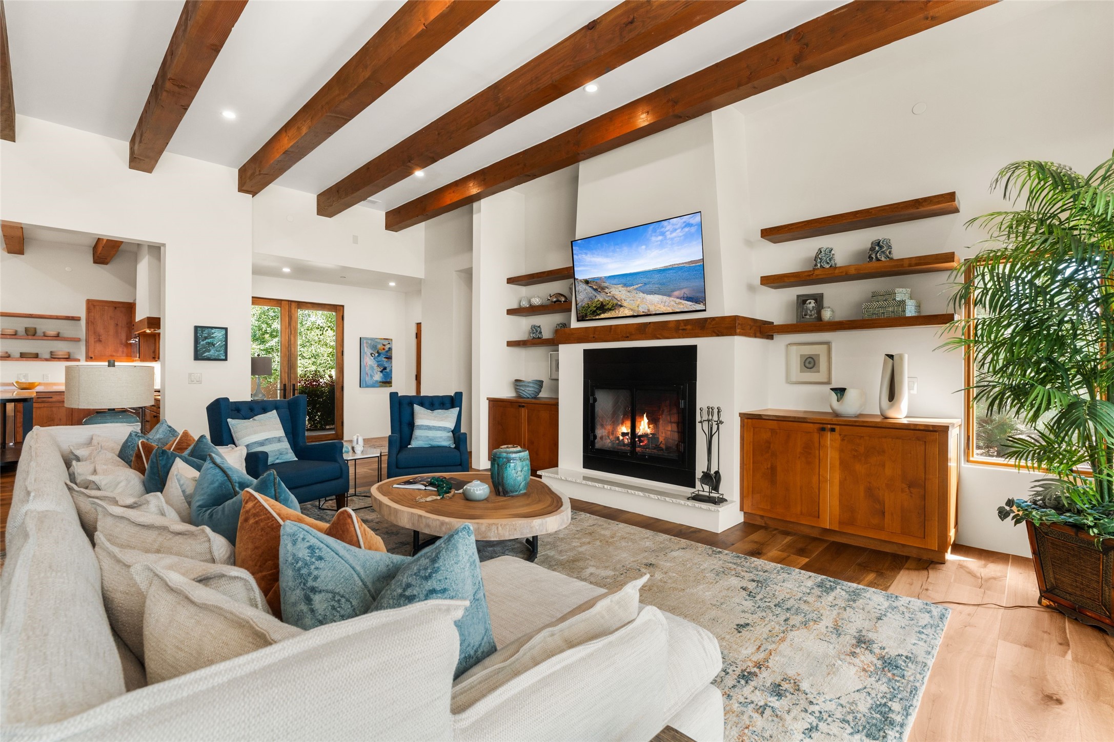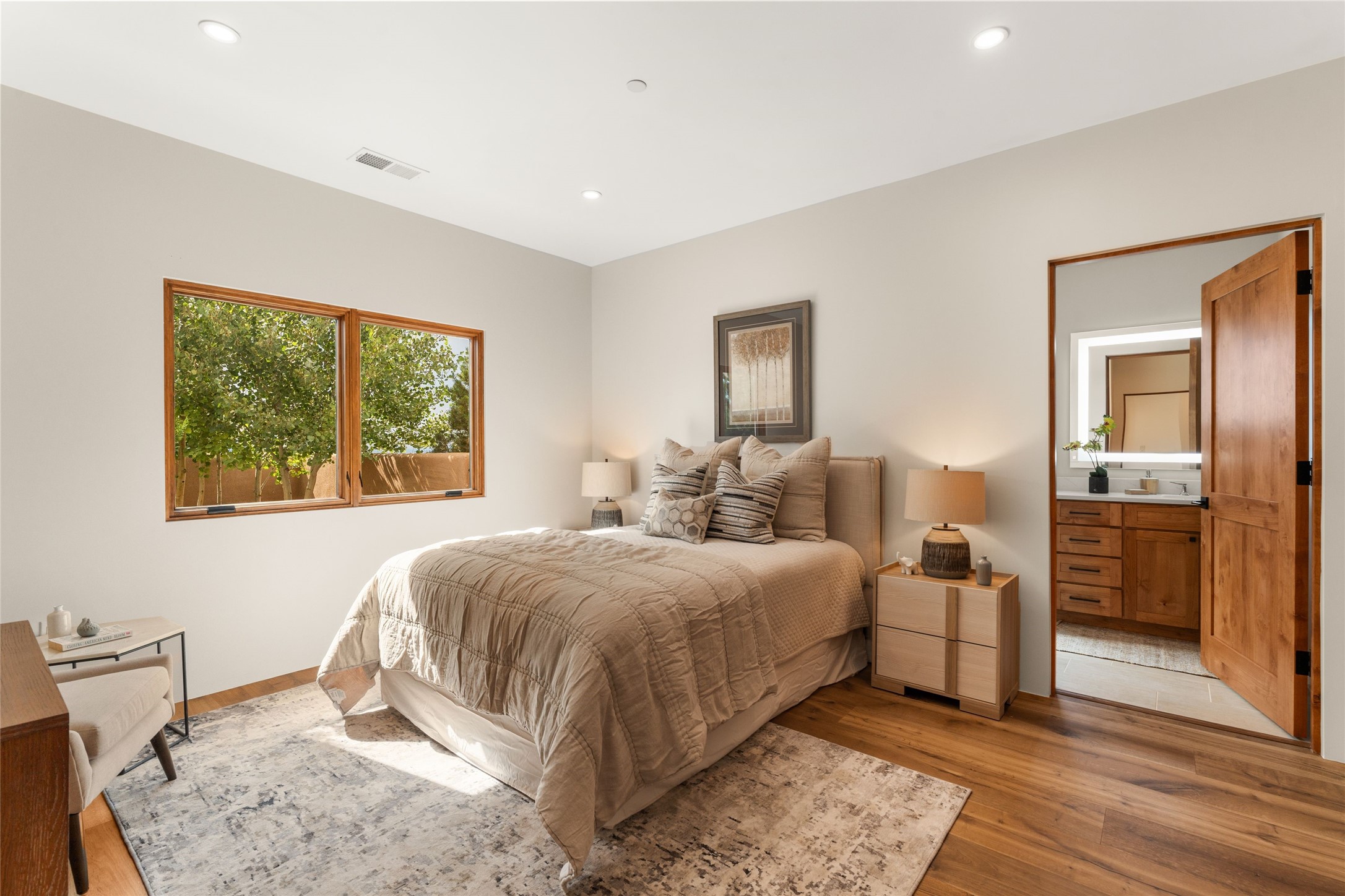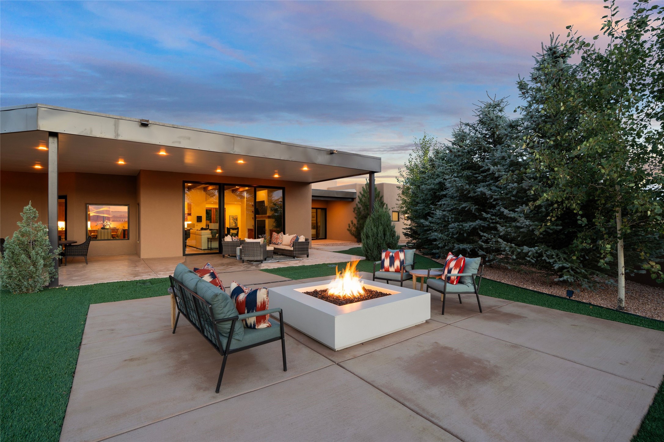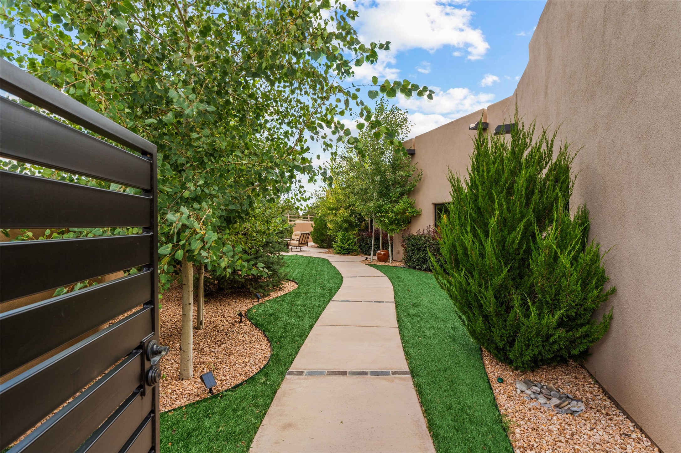 Santa Fe is a vibrant city and this is the home to enjoy it in. Nestled in one of the most sought after neighborhoods, this exceptional custom built home offers the perfect blend of luxury, tranquility, and design. Not far from the downtown, yet situated on 2.5 acres with breathtaking views in all directions. Not too grandiose but just the right amount of wonderful with tall beamed ceilings, tasteful wood floors and an impressive open concept that accommodates flawlessly while continually framing the captivating West views Santa Fe is famous for. Spend your mornings on the south of the home with a delightful seating area amongst fabulously landscaped outdoor spaces with mature spruce and aspen trees and fire pit but be sure to take in the evenings on the rear portal with the custom 65" Cubo Fire Table situated to capture the unparalleled views of the Jemez Mountains. With over a thousand sq ft of covered outdoor spaces, this is the ideal place to enjoy; as beautiful on the inside as on the outside and perfect for entertaining. Heated oversized three car garage, den/bedroom with extra soundproofing great for music enthusiasts or a media room, nicely appointed kitchen, bedrooms en suite, gated entry, Tpo roof, nearby trail systems, no dirt roads, Level 3 ev charger, whole home humidification system and more. If you're looking for a property that combines privacy, elegance, and a connection to the natural beauty of this incredible city, look no further. Come and experience this serene and tranquil beauty, and oh those outdoor spaces!