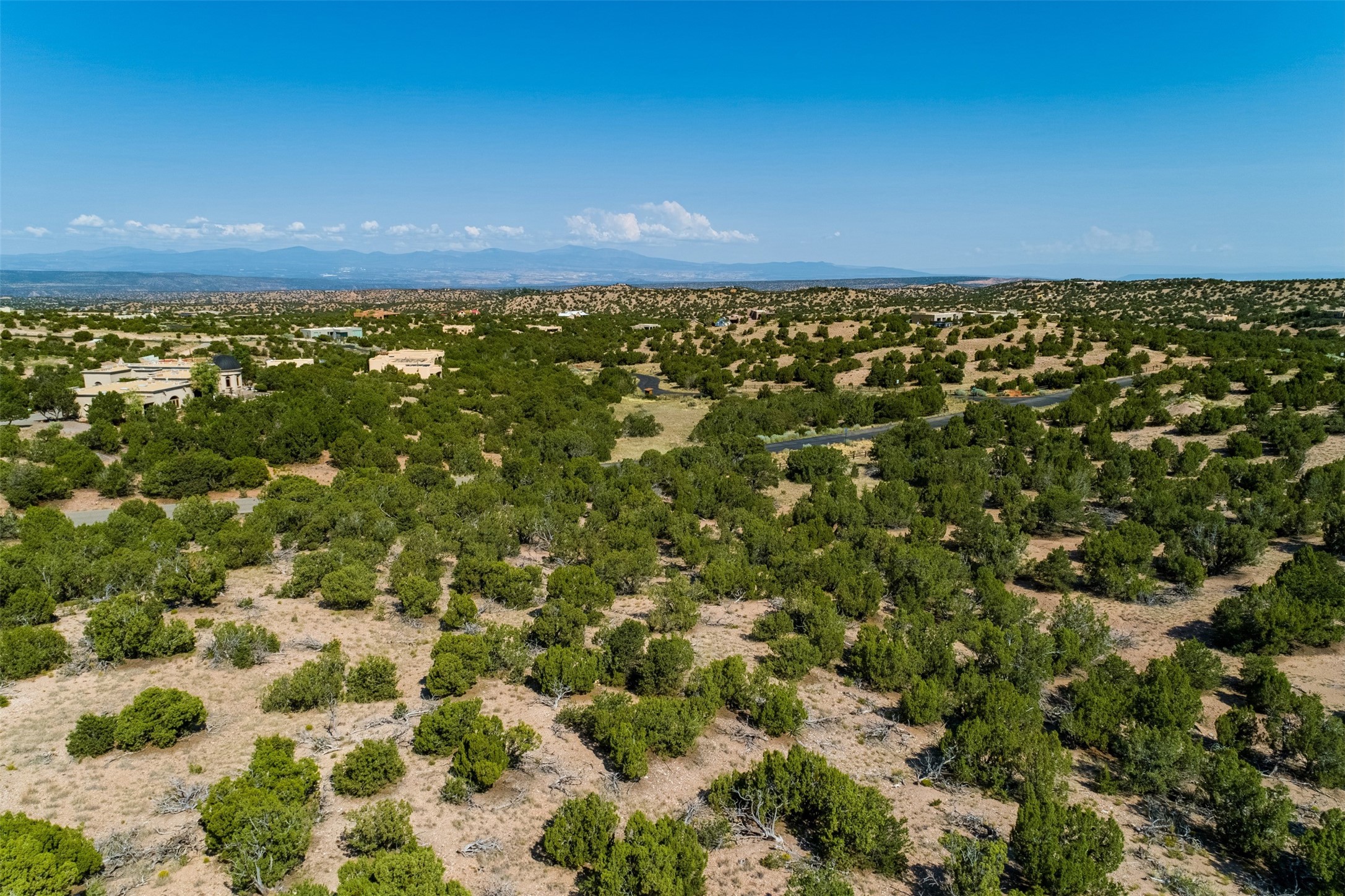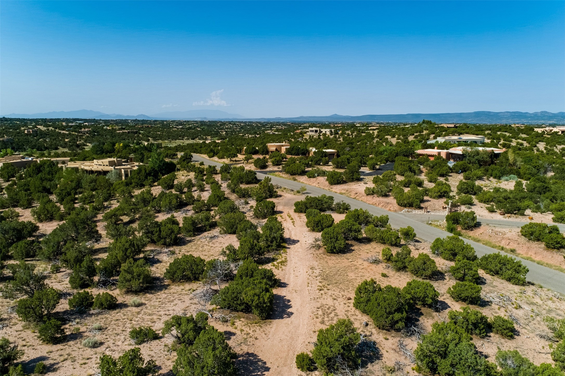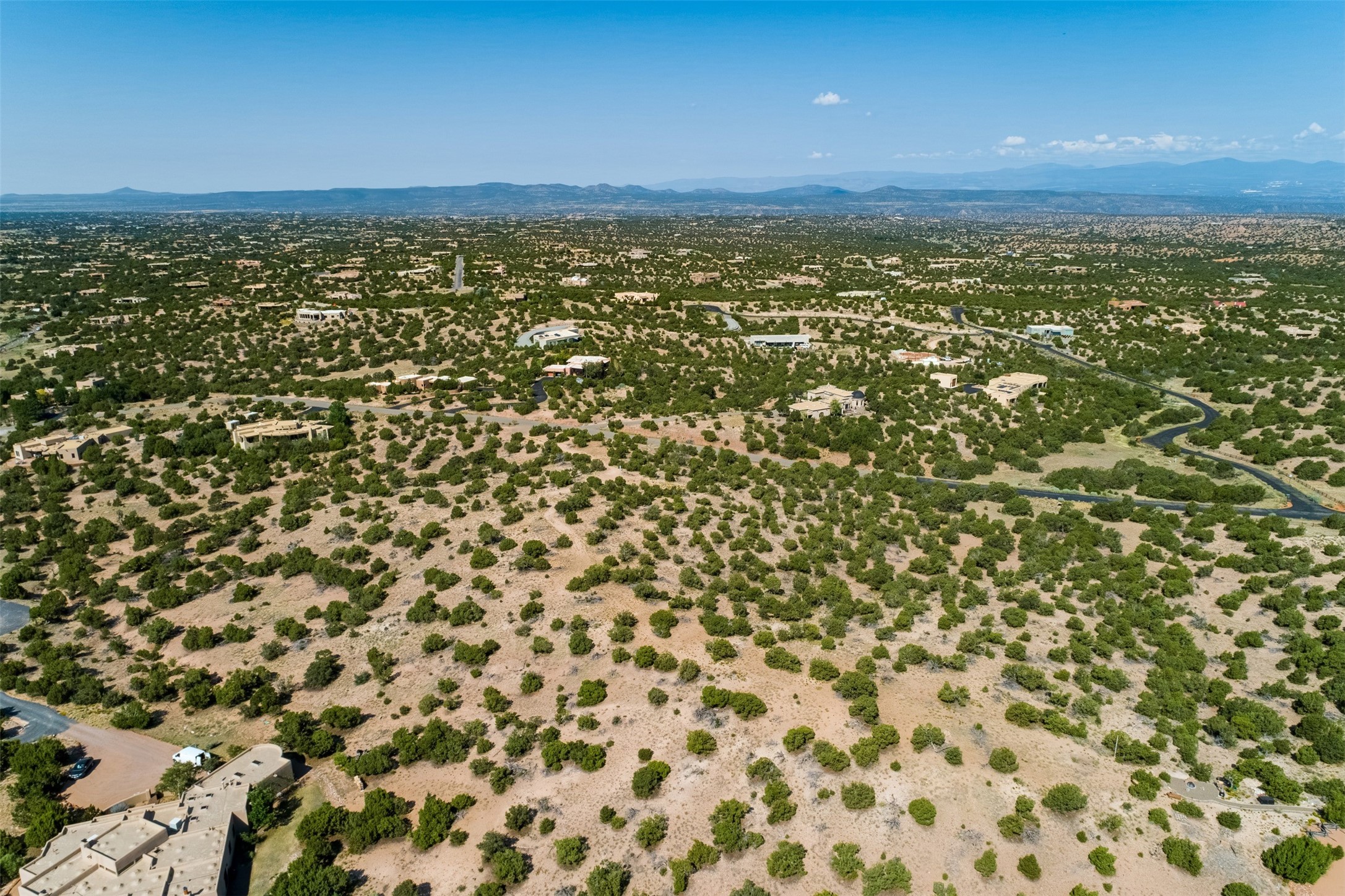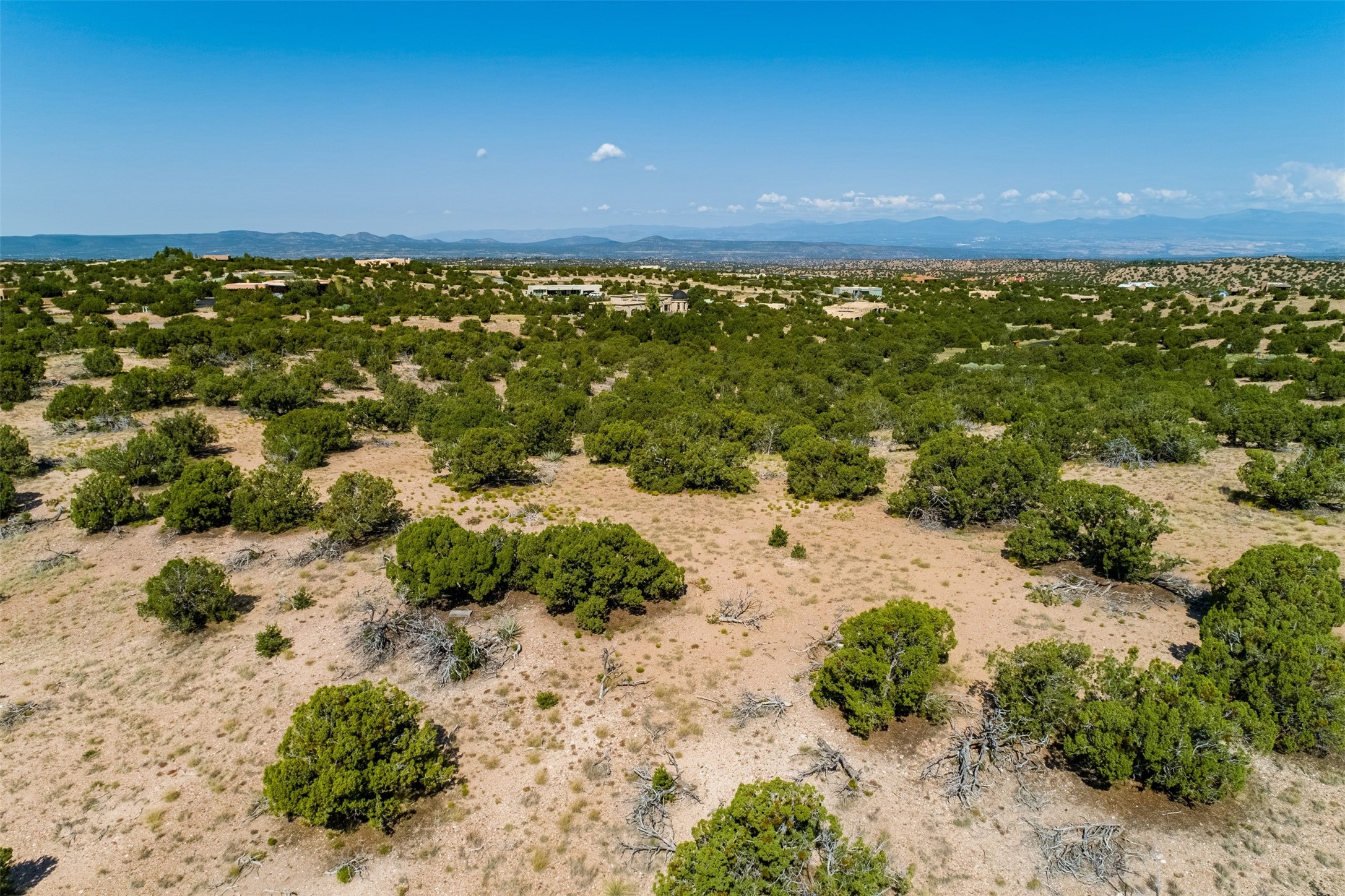 This outstanding 7.5-acre "top-of-the world" estate lot offers proximity to town, ease of access, privacy and sweeping panoramic views. The offering consists of two lots that can be used to craft an exceptional estate or multi-generational compound. This is the only lot of this size in the area with generous building site options and a shared well. Natural gas and electricity are in the street. The unobstructed views of the Sangre de Cristo, Jemez and Sandia Mountains make this an exceptional offering. Building plans and consultation available from Modern Design+Construction.