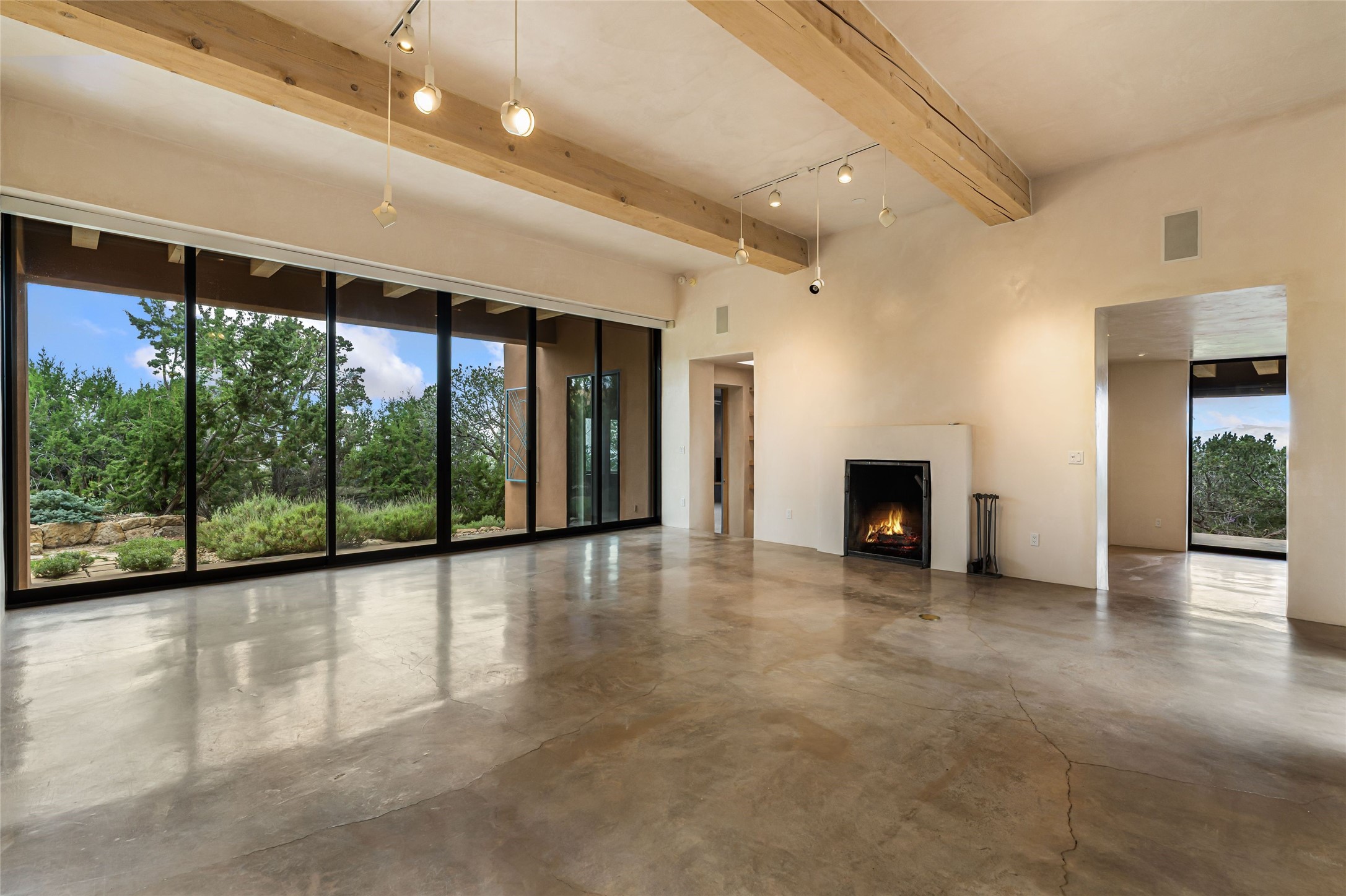 This distinctive Fred-Kline-designed contemporary home in the desirable Sierra de Norte neighborhood was thoughtfully sited to enjoy sweeping views of the Jemez and Sandia Mountains and Santa Fe city lights form its location on 1.29 rugged high-desert acres. A serene central courtyard strewn with aspens, evergreens, thriving perennials, and colorful roses and other flowering plants introduces the pervasive alluring style. Sophisticated and streamlined, the generous interiors begin with an elegant living room featuring soaring beamed ceilings, a Rumford fireplace, and a wall of floor-to ceiling windows admitting wonderful light and outlooks. Beyond are a formal dining room with doors to a portal designed for alfresco outdoor entertaining and a kitchen featuring an island, top-caliber stainless-steel appliances, stunning views, and a comfortable breakfast or sitting area with a fireplace. One of three bedrooms, the primary suite gazes south and west and includes a fireplace in the bedroom and an elegant bath with dual vanities and walk-in closets, a glass-enclosed shower, and a soaking tub with a picturesque view. Each of the two guest bedrooms-well separated for quiet privacy- is accompanied by an en suite bath; one benefits from a kitchenette, a kiva fireplace, and easy access to a relaxing sauna room. On the eastern side of the home is an office with a wraparound built-in desk as well as abundant cabinets, drawers, and bookshelves. Other highlights include walls and lighting ideal for displaying an art collection, a built-in grilling area and an outdoor fireplace on one of the portales, an oversized two car-garage, a versatile studio or workshop with an overhead door, and a large lower-level area ideal for storage, a recreation room, or additional work space. This singular offering is a rare opportunity not to be missed by the eager, discerning buyer.