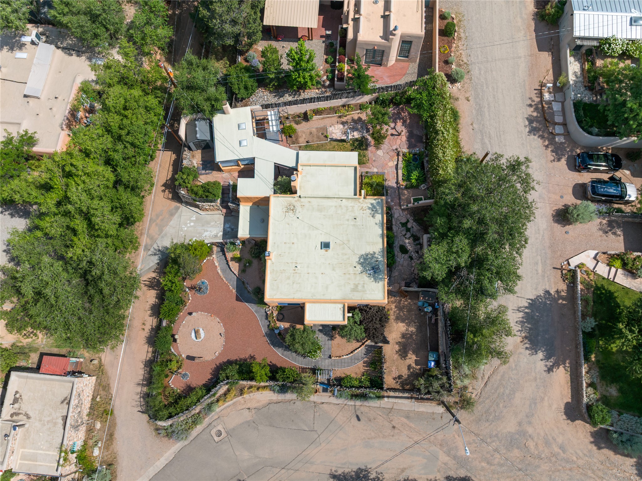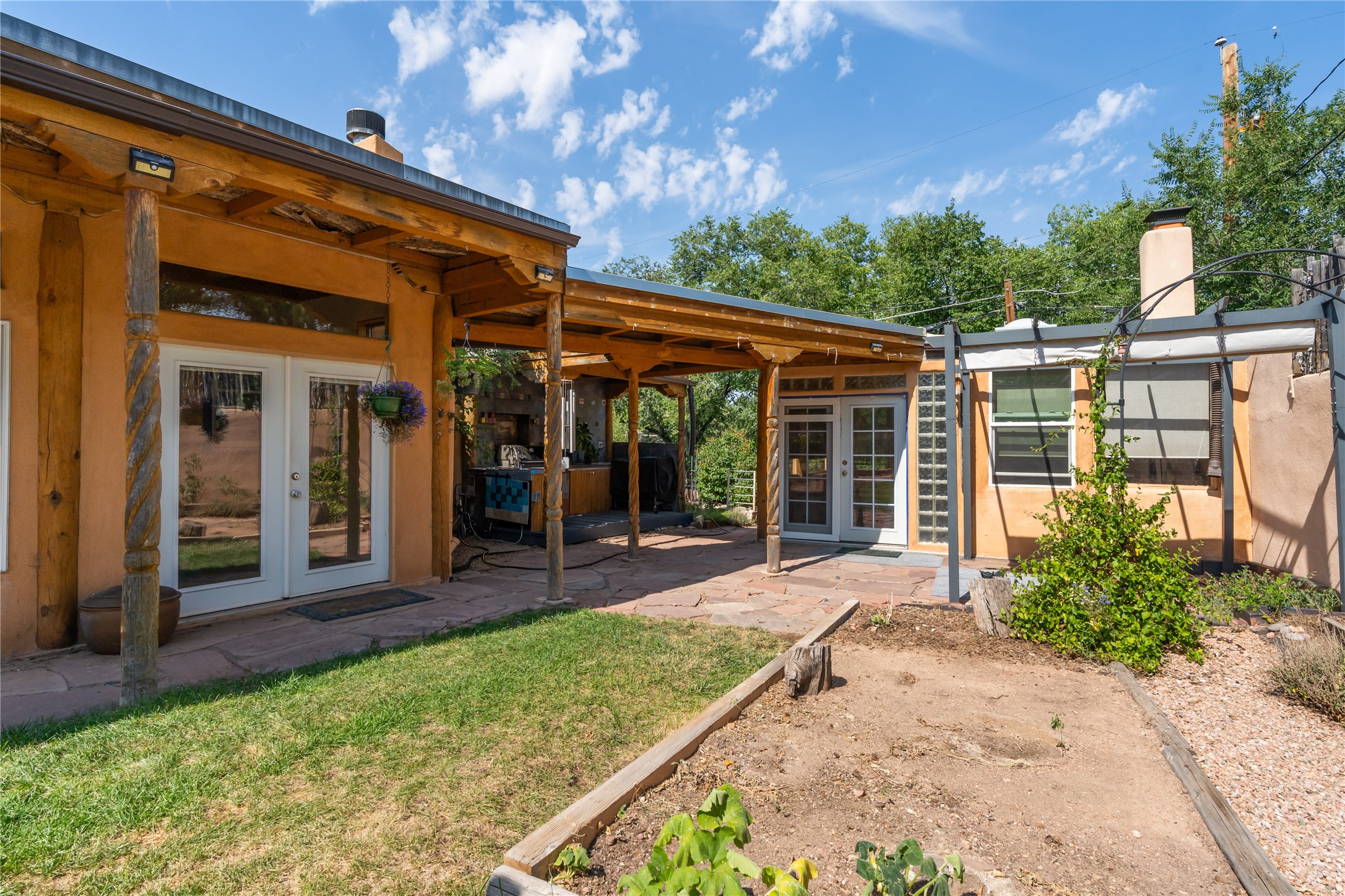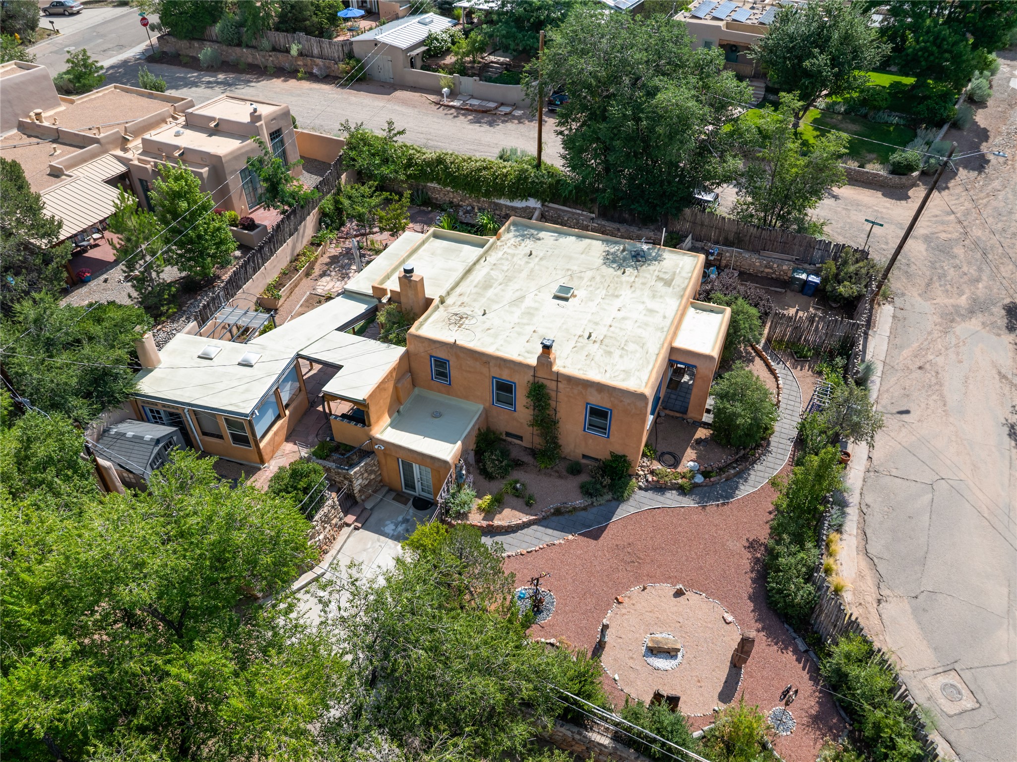 Step into Santa Fe history in this captivating 2,041+/- sq ft pre-war home, where artistic vision meets sustainable living just five blocks from the world-famous Santa Fe Plaza. This unique 3-bedroom, 2-bathroom property enchants from the moment you enter through the whimsical front gate created by renowned Galisteo artist John Massey. The home showcases remarkable historic character with original Santa Fe Penitentiary fencing enclosing the entire property, complete with original iron keys - perfect for pet owners. Venetian plaster finishes & tile flooring downstairs add authentic southwestern elegance, while beautiful hardwood floors grace the main living area and two upper level bedrooms, complemented by a cozy wood-burning kiva fireplace in the living room. Sustainable living features abound in this thoughtfully designed home. The south-facing passive solar design includes a bermed-in lower level that stays naturally cool in summer. The property boasts a 1,400-gallon underground rainwater collection system, mature low-water gardens, and organic raised beds cultivated for 18 years. A super-efficient 92% Lochinvar hydronic heating system minimizes utility costs, while energy-efficient induction cooking and double-pane low-E windows enhance efficiency. The roof was recently recoated in 2025. The outdoor spaces create a true paradise with a tranquil stone and sculpture garden and mature pond featuring over a dozen Koi fish, water lilies, and aquatic plants. A complete outdoor kitchen and dining pavilion with fireplace built from reclaimed Santa Fe Plaza brickwork extends living space seamlessly. Two separate living areas with independent entrances offer exceptional flexibility for multi-generational living, home office space, or rental income potential. The downstairs entrance can be converted back to garage access if desired. This is more than a home--it's a Santa Fe lifestyle combining historic charm, artistic flair, and modern efficiency. Schedule a showing today!