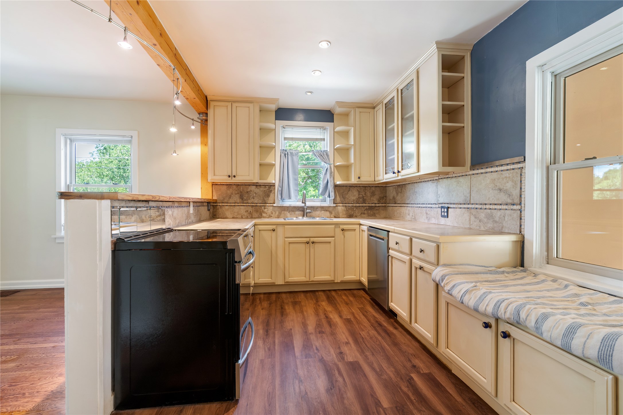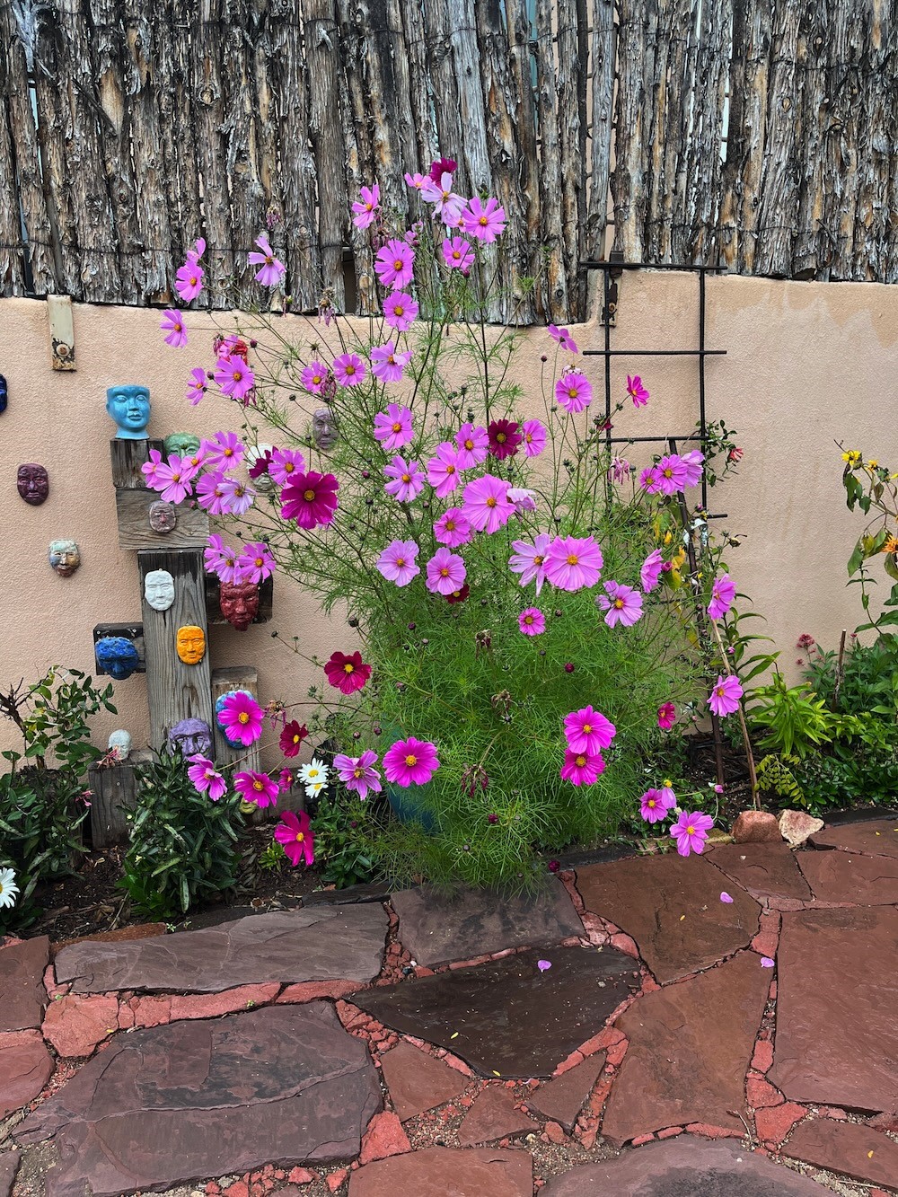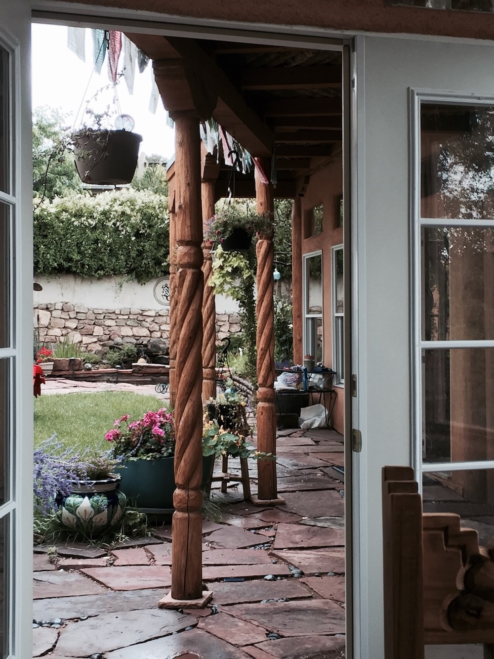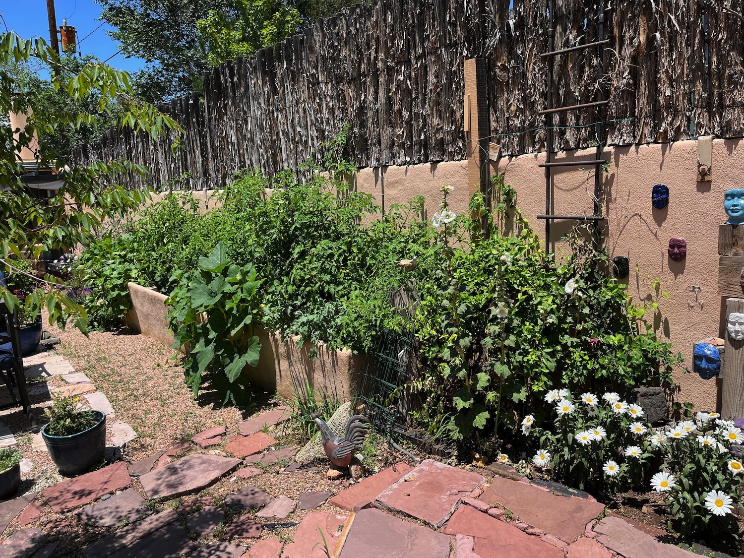 Step into Santa Fe history in this captivating 2,041+/- sq ft pre-war home, where artistic vision meets sustainable living just five blocks from the world-famous Santa Fe Plaza. This unique 3-bedroom, 2-bathroom property enchants from the moment you enter through the whimsical front gate created by renowned Galisteo artist John Massey. The home showcases remarkable historic character with original Santa Fe Penitentiary fencing enclosing the entire property, complete with original iron keys - perfect for pet owners. Venetian plaster finishes & tile flooring downstairs add authentic southwestern elegance, while beautiful hardwood floors grace the main living area and two upper level bedrooms, complemented by a cozy wood-burning kiva fireplace in the living room. Sustainable living features abound in this thoughtfully designed home. The south-facing passive solar design includes a bermed-in lower level that stays naturally cool in summer. The property boasts a 1,400-gallon underground rainwater collection system, mature low-water gardens, and organic raised beds cultivated for 18 years. A super-efficient 92% Lochinvar hydronic heating system minimizes utility costs, while energy-efficient induction cooking and double-pane low-E windows enhance efficiency. The roof was recently recoated in 2025. The outdoor spaces create a true paradise with a tranquil stone and sculpture garden and mature pond featuring over a dozen Koi fish, water lilies, and aquatic plants. A complete outdoor kitchen and dining pavilion with fireplace built from reclaimed Santa Fe Plaza brickwork extends living space seamlessly. Two separate living areas with independent entrances offer exceptional flexibility for multi-generational living, home office space, or rental income potential. The downstairs entrance can be converted back to garage access if desired. This is more than a home--it's a Santa Fe lifestyle combining historic charm, artistic flair, and modern efficiency. Schedule a showing today!