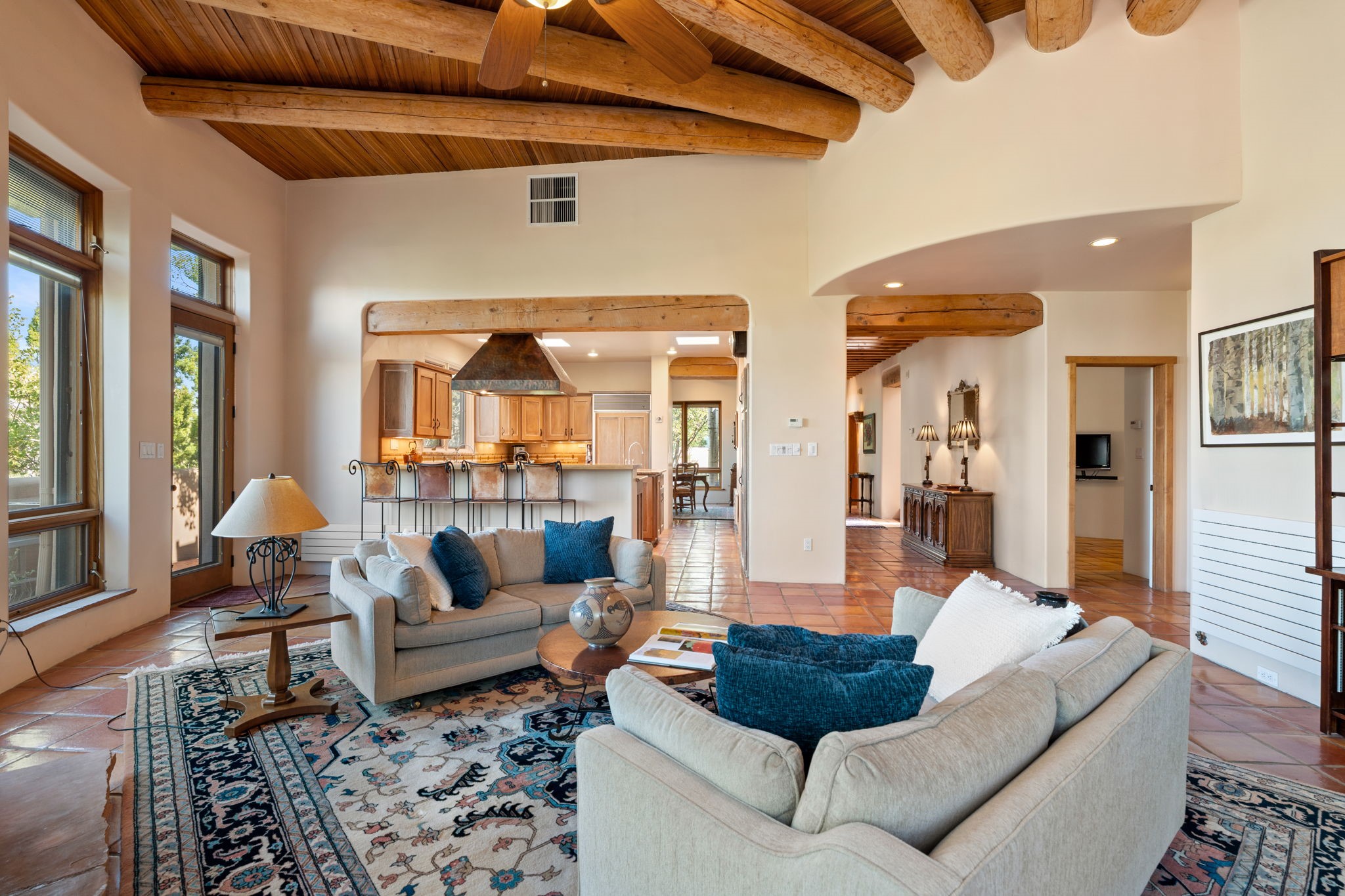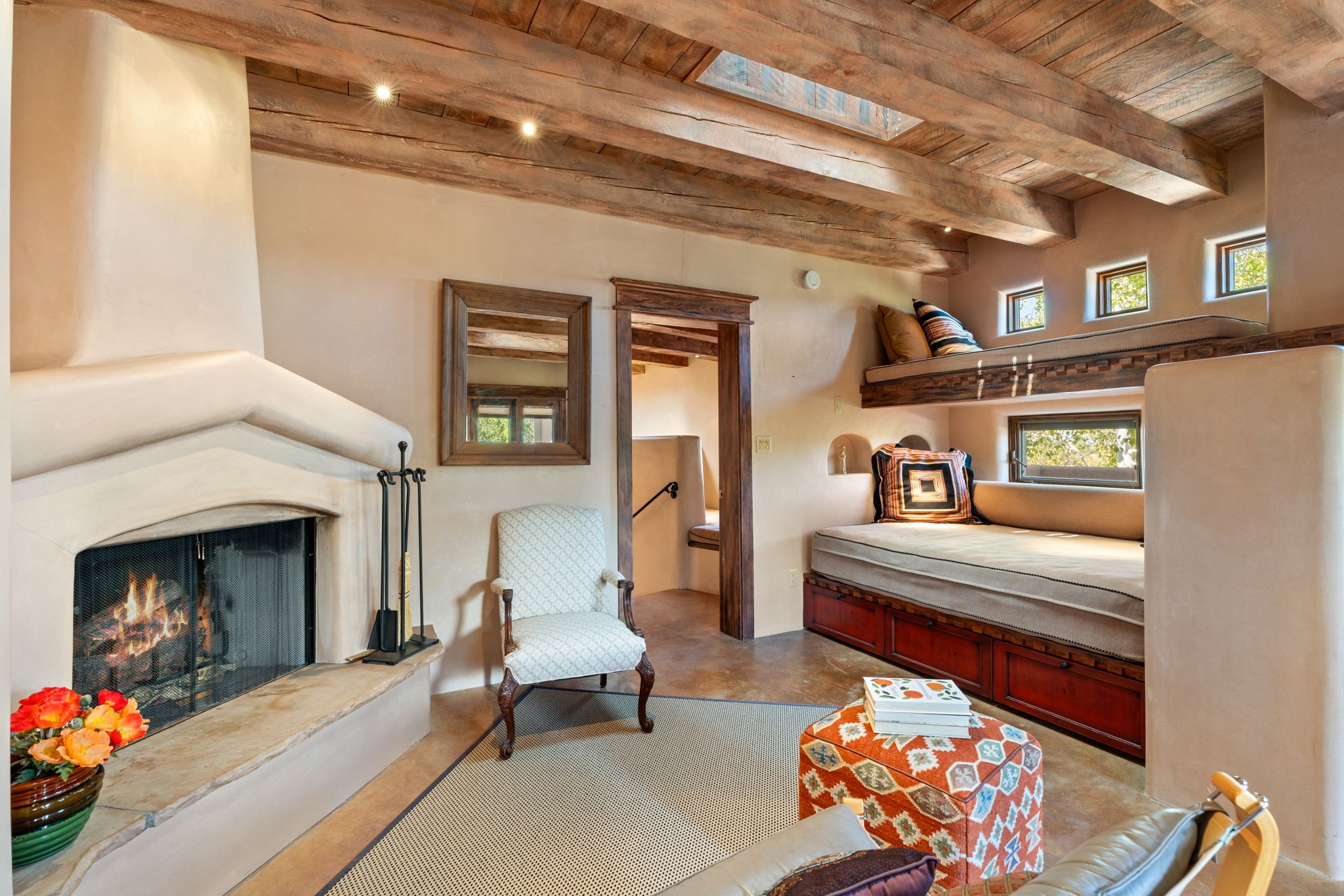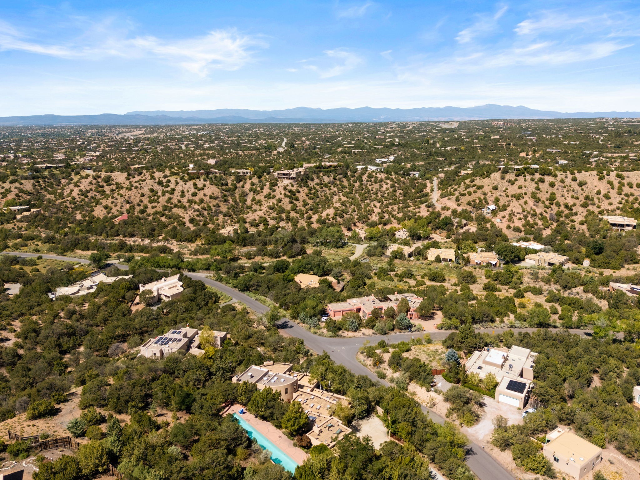 Perched high on a serene hilltop with commanding views of the Sangre de Cristo Mountains, this Santa Fe-style custom estate offers a masterful blend of artistry, comfort, and Southwestern soul. Just minutes from the historic Plaza yet nestled in a private enclave on a full acre, this 4,300-square-foot sanctuary embodies the magic of Northern New Mexico living.Step inside to sun-drenched interiors where massive windows frame mountain vistas. The dining room, with stenciled beams and a corner Kiva fireplace, is perfect for cozy evenings or elegant entertaining. The living room impresses with fan-shaped vigas, a dramatic fireplace, and custom mantle, flowing into a spacious kitchen with granite counters, island, gas stove, copper hood, skylights, and walk-in pantry.Two luxurious Primary Suites ensure privacy. The main-level suite includes a coved ceiling, updated bath, private den, and French doors to a tranquil patio. Upstairs, a curved staircase leads to the second suite with Kiva fireplace, private deck, and bridge walkway to a spectacular 75-foot lap pool.Perfect for gatherings, the entertainment room -- once home to two grand pianos -- opens to the front portal. A charming casita above the two-car garage adds versatility with sleeping space for five, full bath, closet, kitchenette, private patio, and separate entrance.Blending Santa Fe craftsmanship, modern updates, and breathtaking surroundings, this home is more than a residence -- it is a living work of art and a rare opportunity to own a piece of Santa Fe's soul.