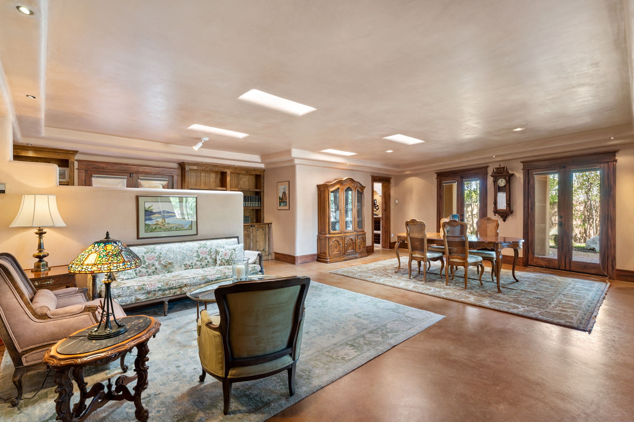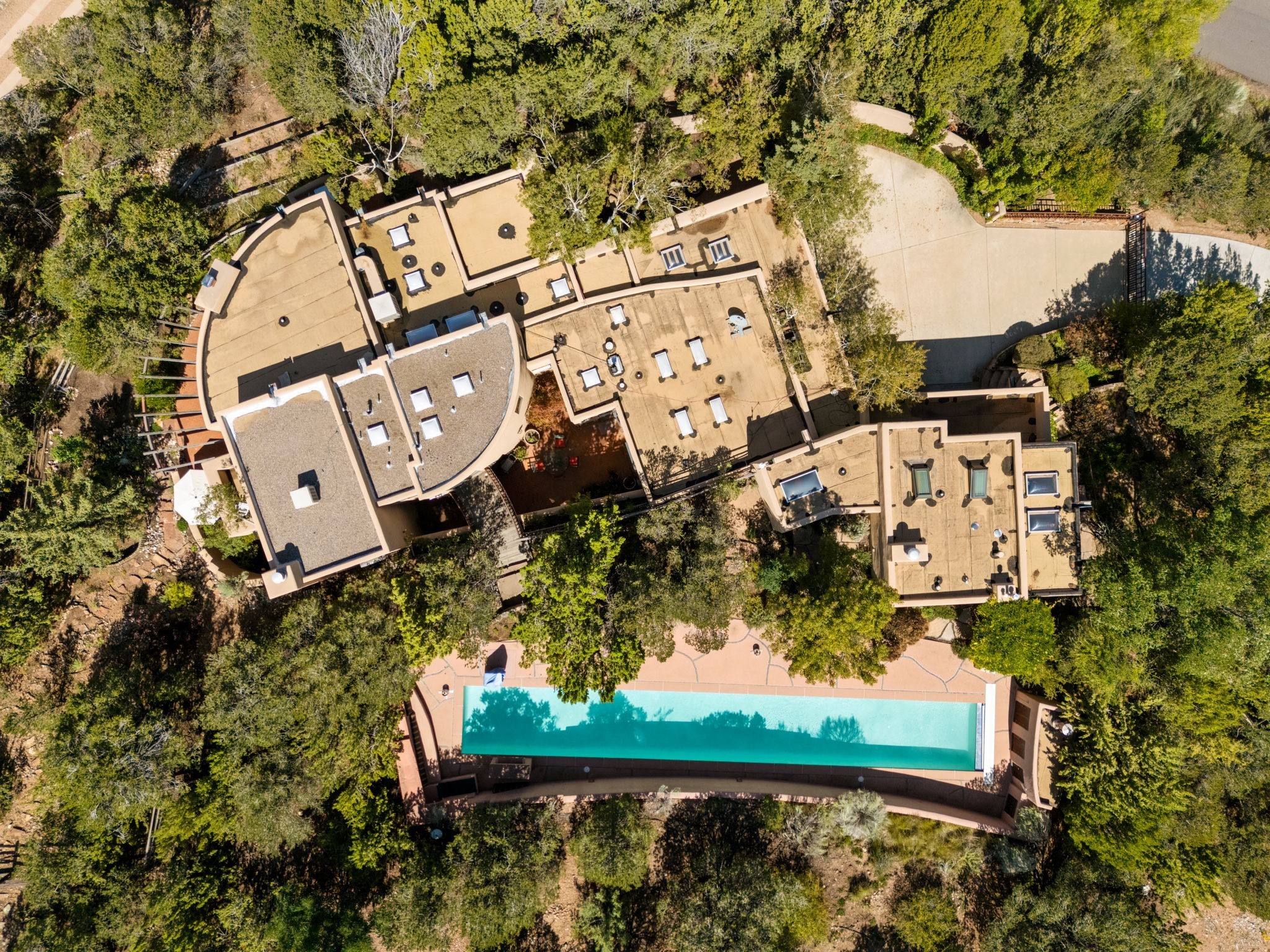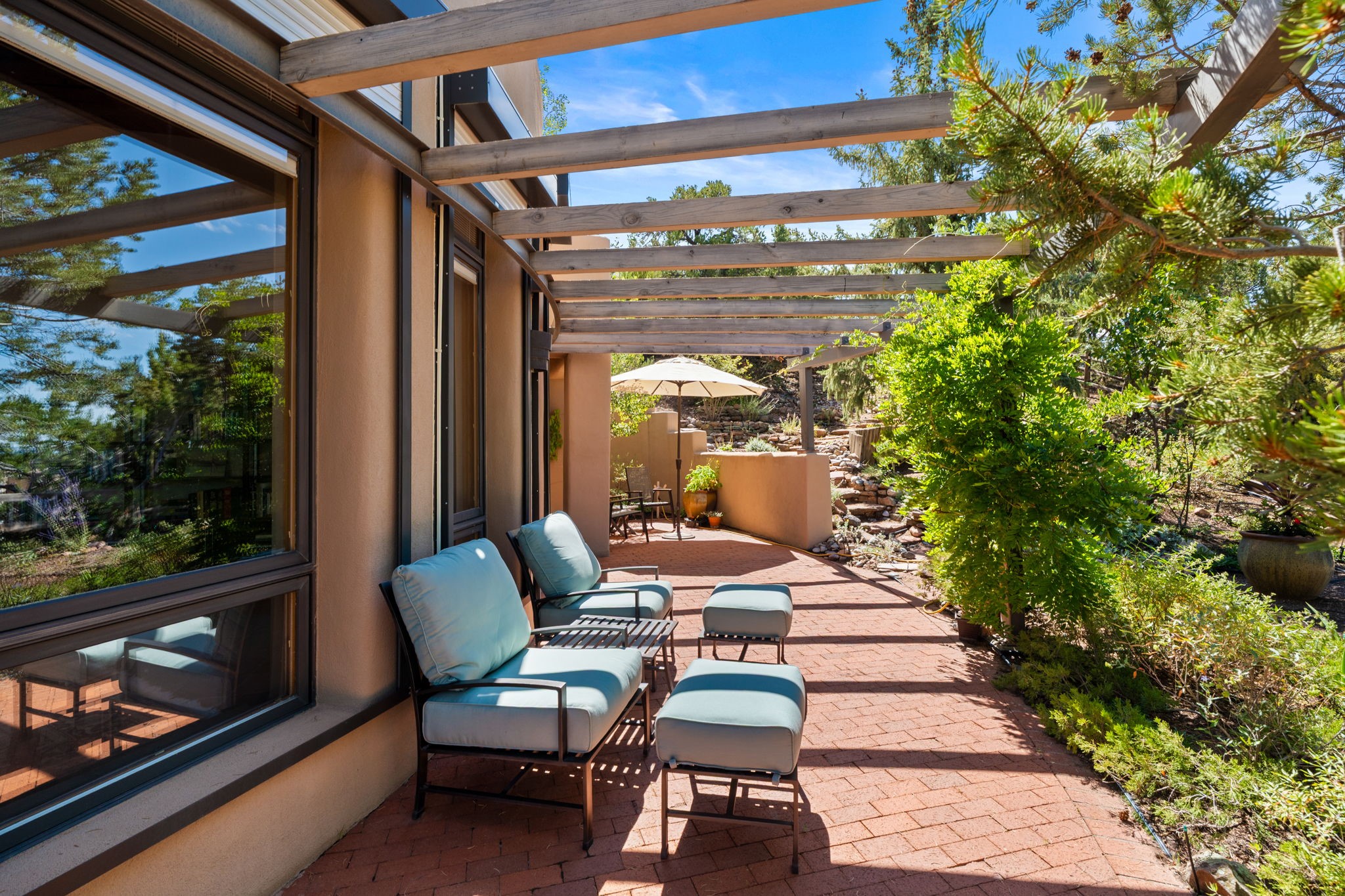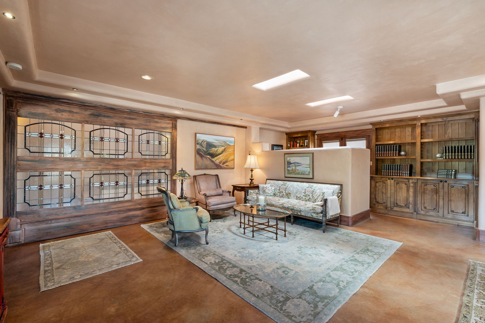 Perched high on a serene hilltop with commanding views of the Sangre de Cristo Mountains, this Santa Fe-style custom estate offers a masterful blend of artistry, comfort, and Southwestern soul. Just minutes from the historic Plaza yet nestled in a private enclave on a full acre, this 4,300-square-foot sanctuary embodies the magic of Northern New Mexico living.Step inside to sun-drenched interiors where massive windows frame mountain vistas. The dining room, with stenciled beams and a corner Kiva fireplace, is perfect for cozy evenings or elegant entertaining. The living room impresses with fan-shaped vigas, a dramatic fireplace, and custom mantle, flowing into a spacious kitchen with granite counters, island, gas stove, copper hood, skylights, and walk-in pantry.Two luxurious Primary Suites ensure privacy. The main-level suite includes a coved ceiling, updated bath, private den, and French doors to a tranquil patio. Upstairs, a curved staircase leads to the second suite with Kiva fireplace, private deck, and bridge walkway to a spectacular 75-foot lap pool.Perfect for gatherings, the entertainment room -- once home to two grand pianos -- opens to the front portal. A charming casita above the two-car garage adds versatility with sleeping space for five, full bath, closet, kitchenette, private patio, and separate entrance.Blending Santa Fe craftsmanship, modern updates, and breathtaking surroundings, this home is more than a residence -- it is a living work of art and a rare opportunity to own a piece of Santa Fe's soul.