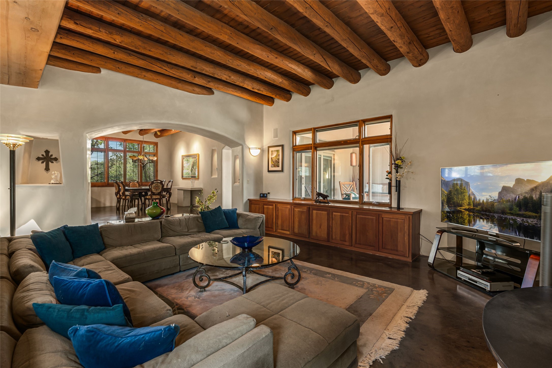 Welcome to 4 Astor, an elegant 3-bedroom, 3-bath home in the prestigious Las Campanas community of Santa Fe. Set on 1.72 acres, this 3,358 sq. ft. residence blends refined design with comfortable living, offering spacious interiors and timeless Southwestern style. Beautiful diamond plaster walls, elegant concrete floors, and lovely hall archways add warmth and sophistication throughout. Built with 12-inch Rastra construction, the home offers exceptional efficiency and durability, keeping it cool in summer and warm in winter. A 3-car garage provides plenty of room for vehicles, storage, or a workshop.Living in Las Campanas means enjoying world-class amenities, including a clubhouse, fitness center, gated security, horse facilities, jogging paths, playground, pool, sauna, spa, and tennis courts. Whether you're looking for an active lifestyle or a serene retreat, this property delivers the best of both worlds.