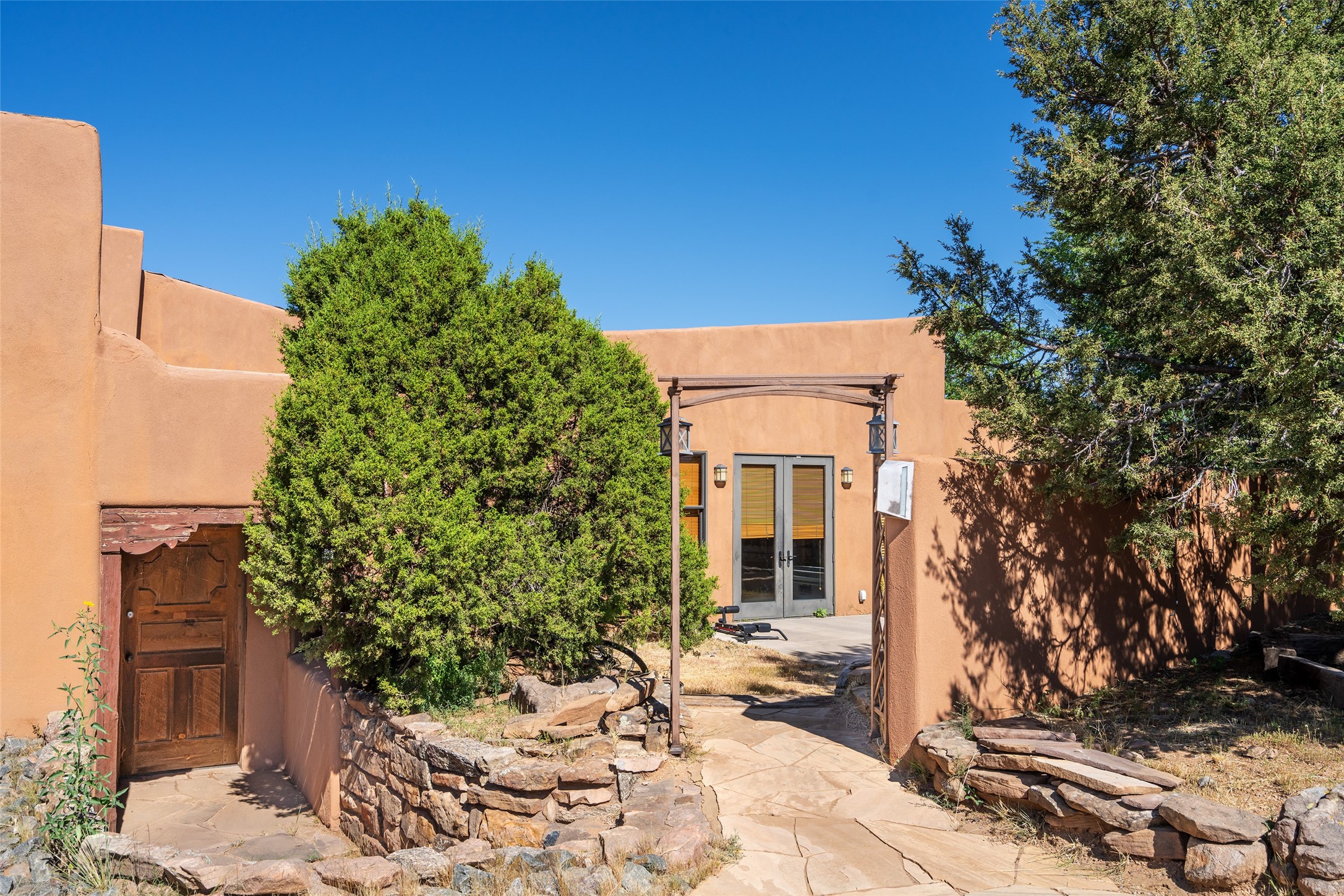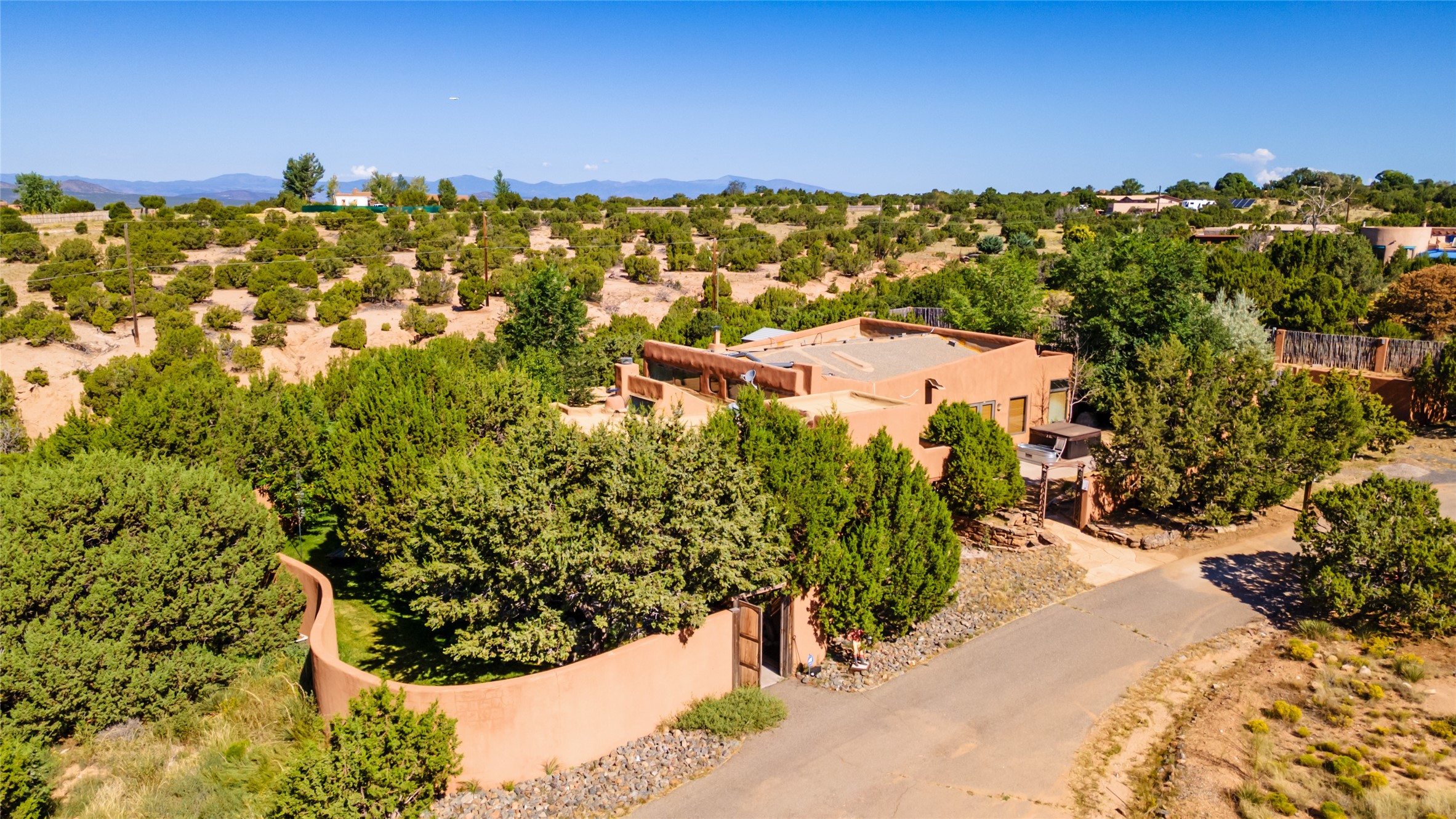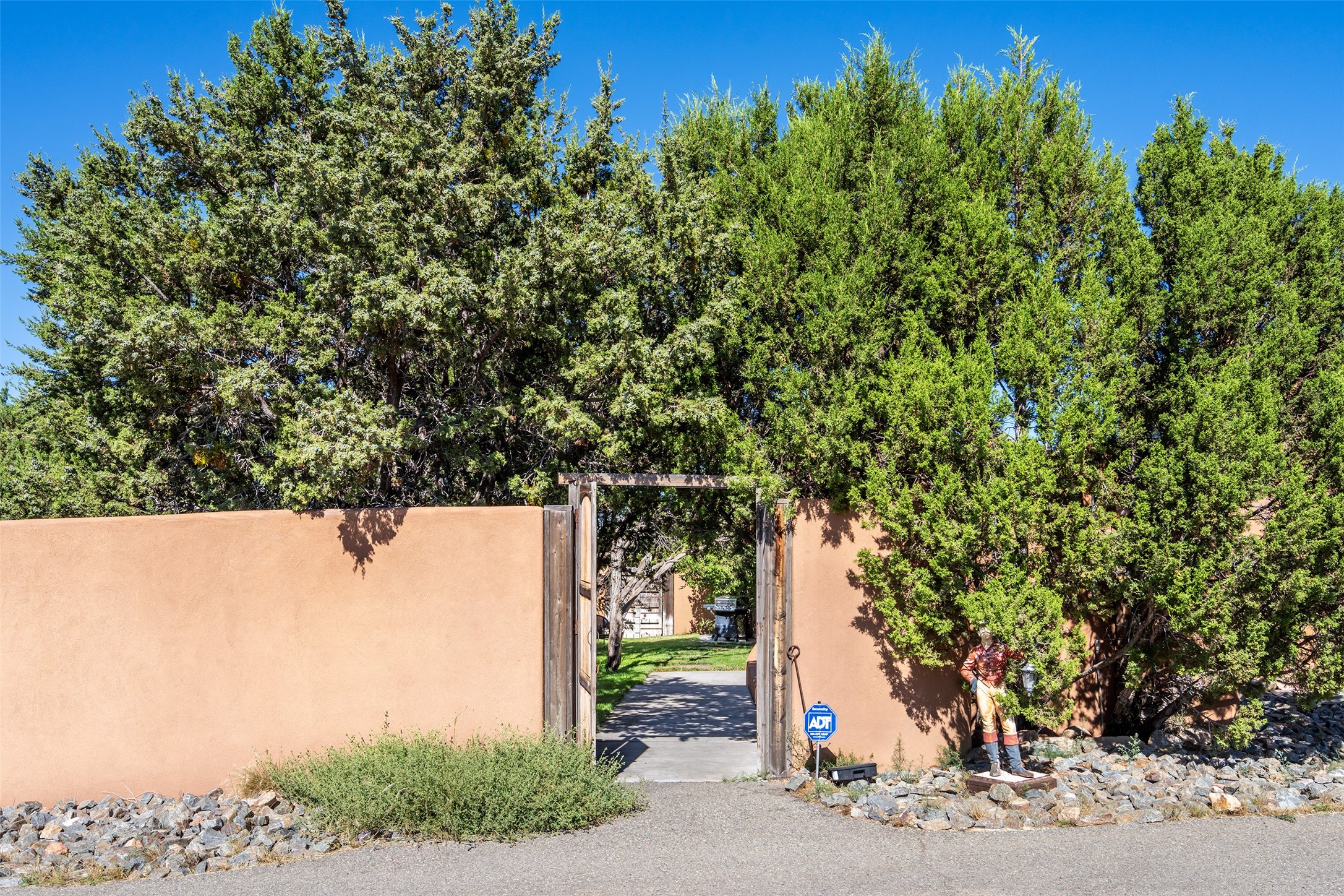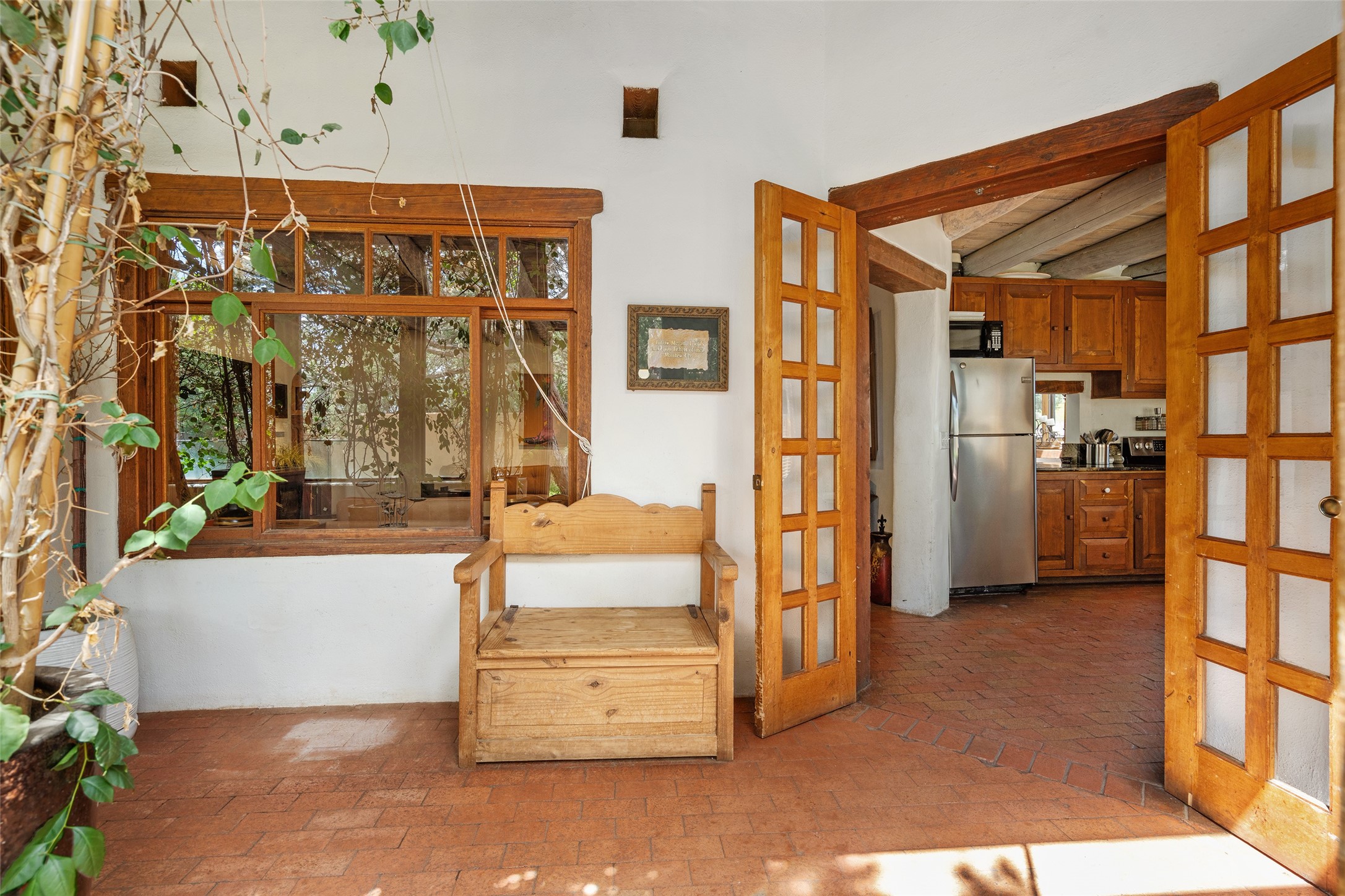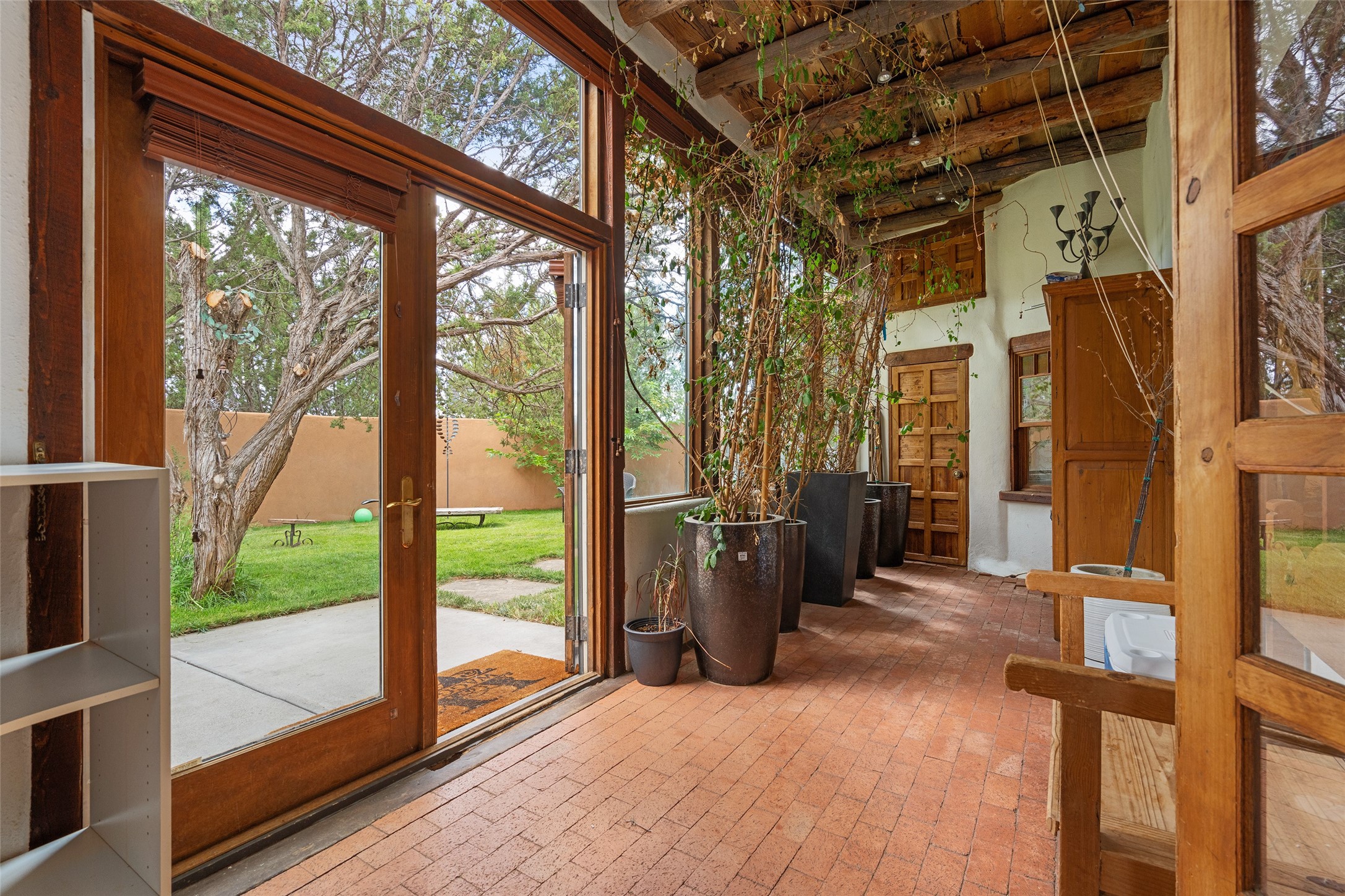 Discover the best of Santa Fe living on this enchanting estate, which blends traditional adobe craftsmanship with modern comfort, beginning with a welcoming coyote-fenced entry and a light-filled sunroom that beautifully bridges indoor and outdoor living. The original adobe home reflects classic Santa Fe character, featuring exposed vigas, rough-sawn ceilings, brick floors, banco seating, and a classic kiva fireplace. A thoughtfully designed 2004 addition expands the home to a spacious 5-bedroom, 4-bath layout connected by a striking barrel-ceiling hallway. The flexible office/5th bedroom features its own bath and fireplace and opens to a private courtyard, ideal for guests, work, or creative space. The primary suite is a serene retreat offering dual vanities, a corner soaking tub, and a generous walk-in closet. Bright, beautifully tiled bathrooms add warmth and charm throughout the home. Mature trees, xeriscaped grounds, and irrigated courtyards offer serene outdoor living spaces ideal for entertaining, gardening, or simply taking in Santa Fe's stunning sunsets. Easy access to town situated on a generous size lot where your animals are welcome, this property offers the perfect blend of privacy, character, and convenience. NO HOA! Price Improved below appraisal!