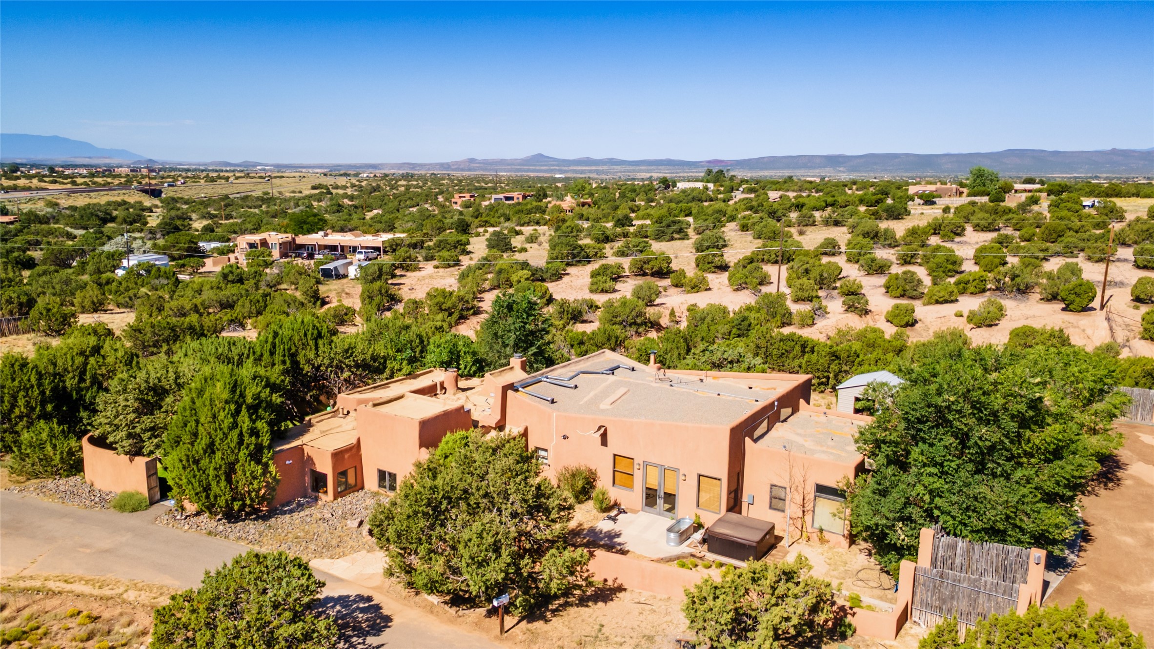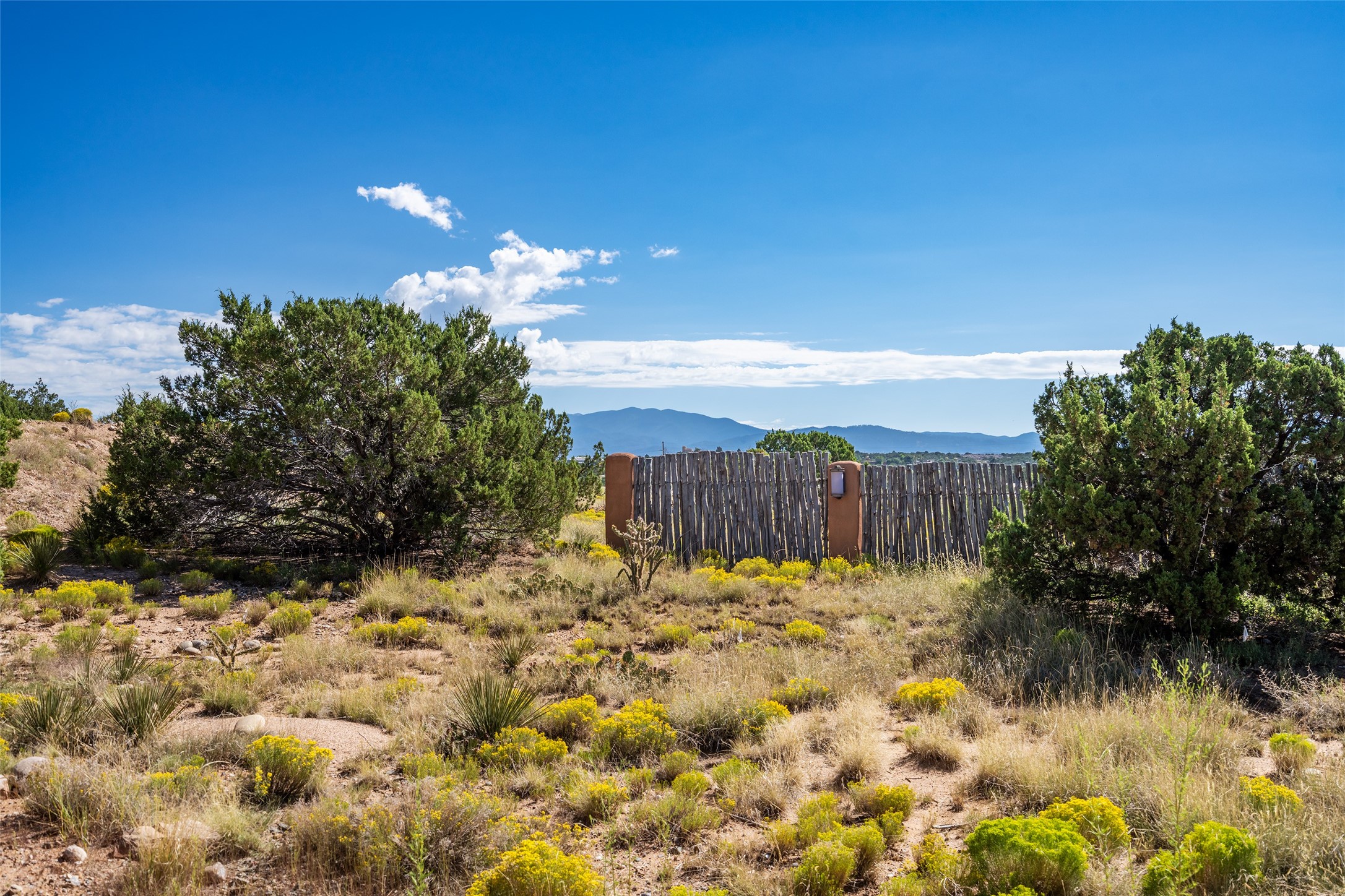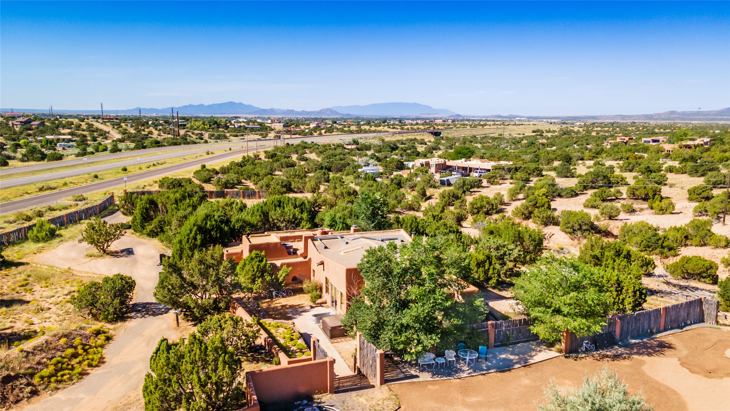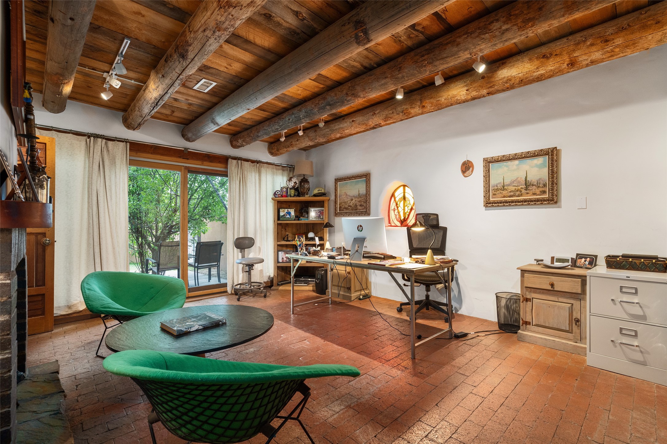Discover the best of Santa Fe living on this enchanting estate, which blends traditional adobe craftsmanship with modern comfort, beginning with a welcoming coyote-fenced entry and a light-filled sunroom that beautifully bridges indoor and outdoor living. The original adobe home reflects classic Santa Fe character, featuring exposed vigas, rough-sawn ceilings, brick floors, banco seating, and a classic kiva fireplace. A thoughtfully designed 2004 addition expands the home to a spacious 5-bedroom, 4-bath layout connected by a striking barrel-ceiling hallway. The flexible office/5th bedroom features its own bath and fireplace and opens to a private courtyard, ideal for guests, work, or creative space. The primary suite is a serene retreat offering dual vanities, a corner soaking tub, and a generous walk-in closet. Bright, beautifully tiled bathrooms add warmth and charm throughout the home. Mature trees, xeriscaped grounds, and irrigated courtyards offer serene outdoor living spaces ideal for entertaining, gardening, or simply taking in Santa Fe's stunning sunsets. Easy access to town situated on a generous size lot where your animals are welcome, this property offers the perfect blend of privacy, character, and convenience. NO HOA! Price Improved below appraisal!
