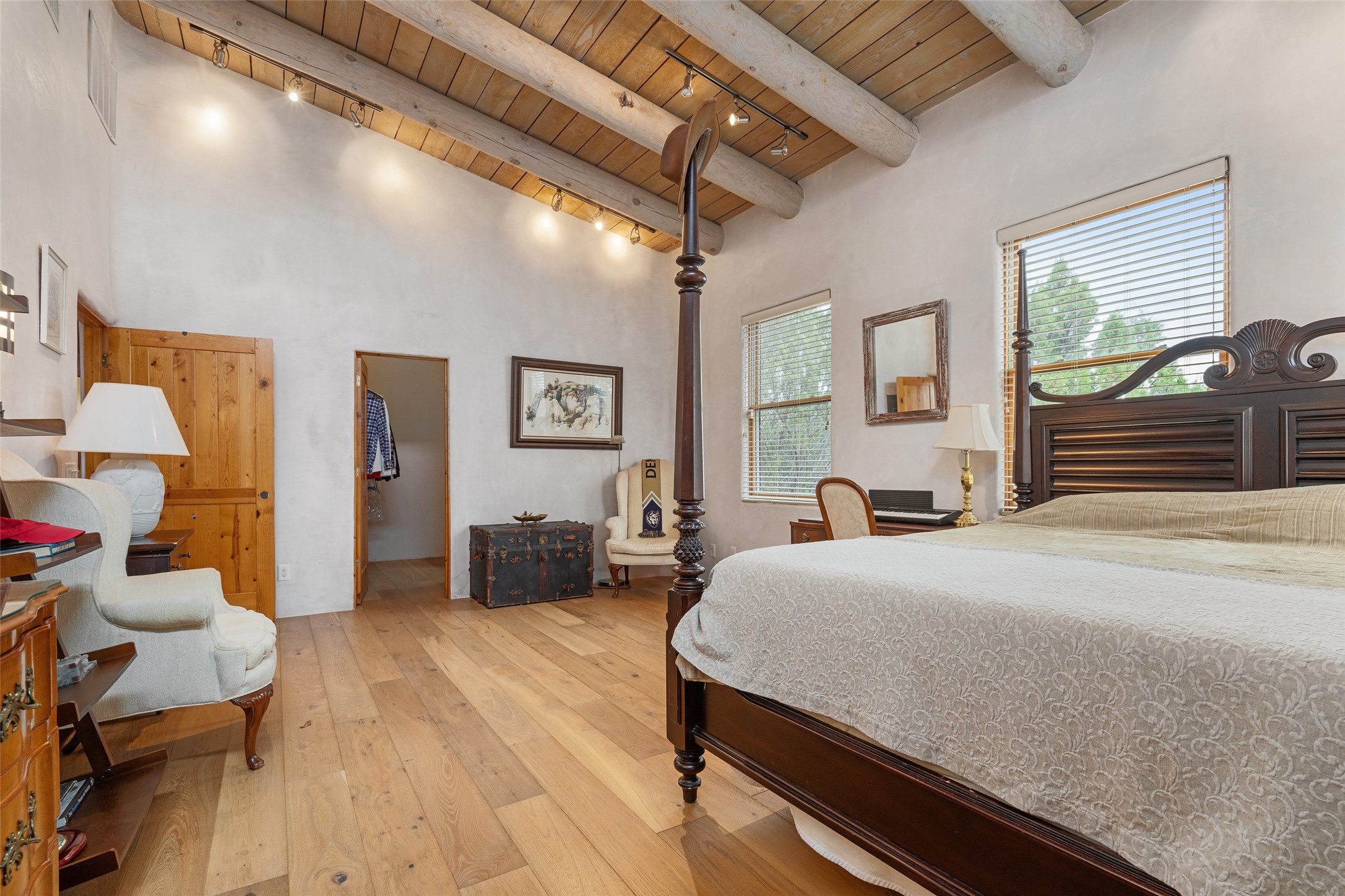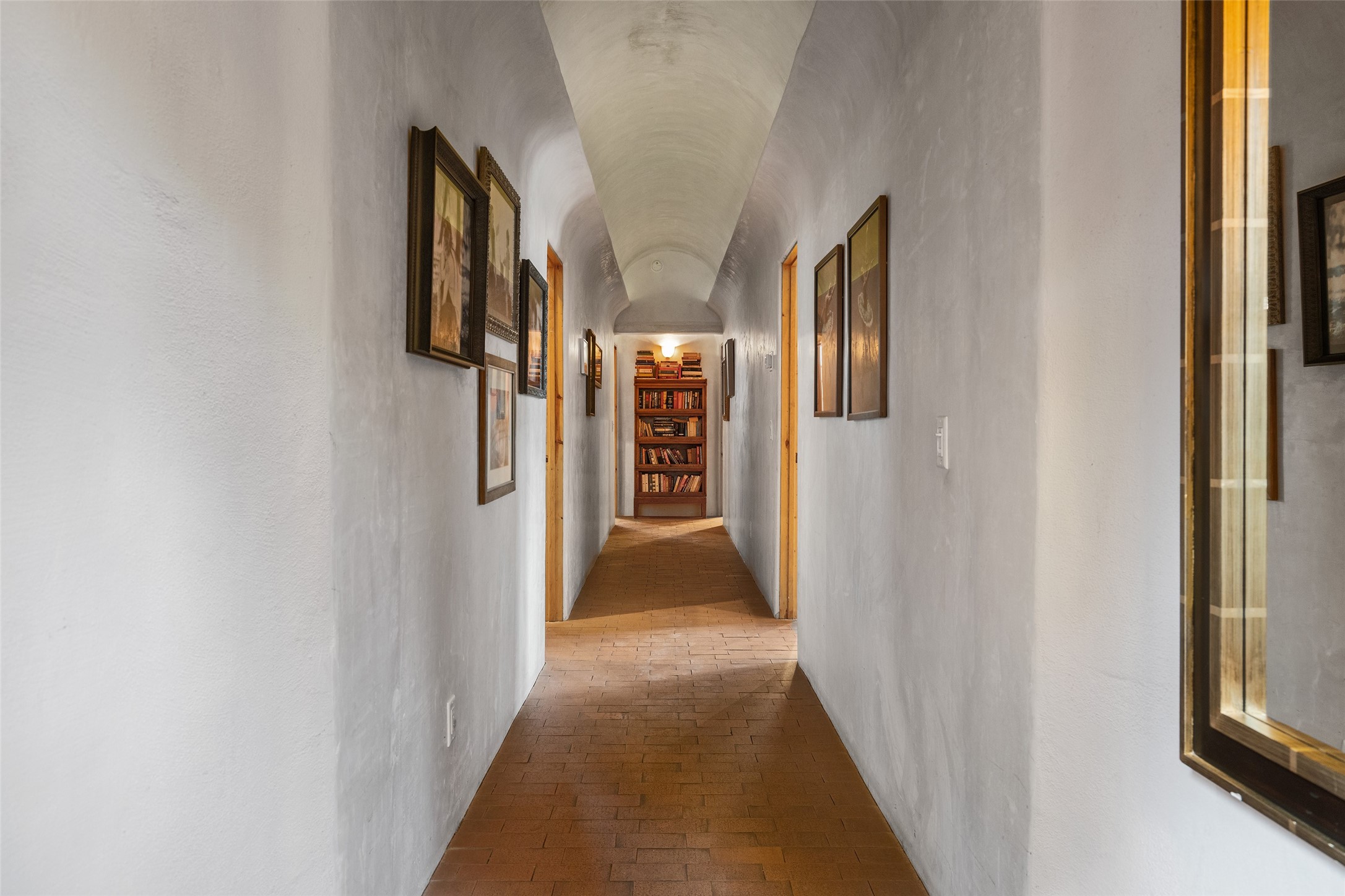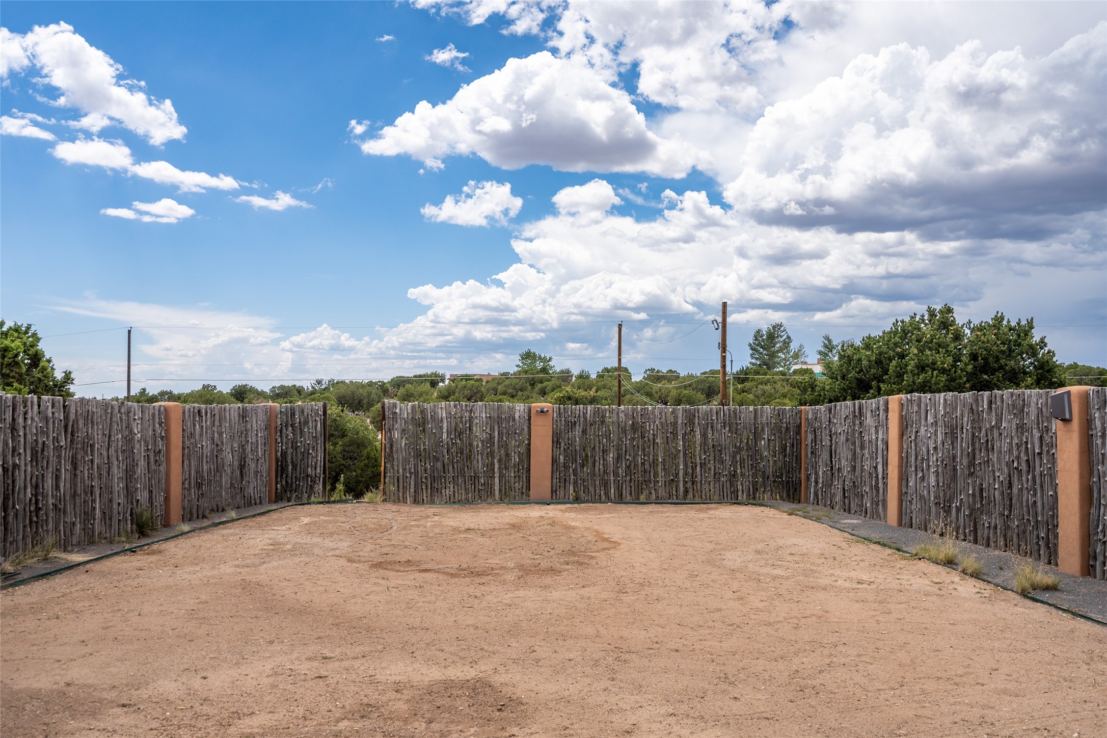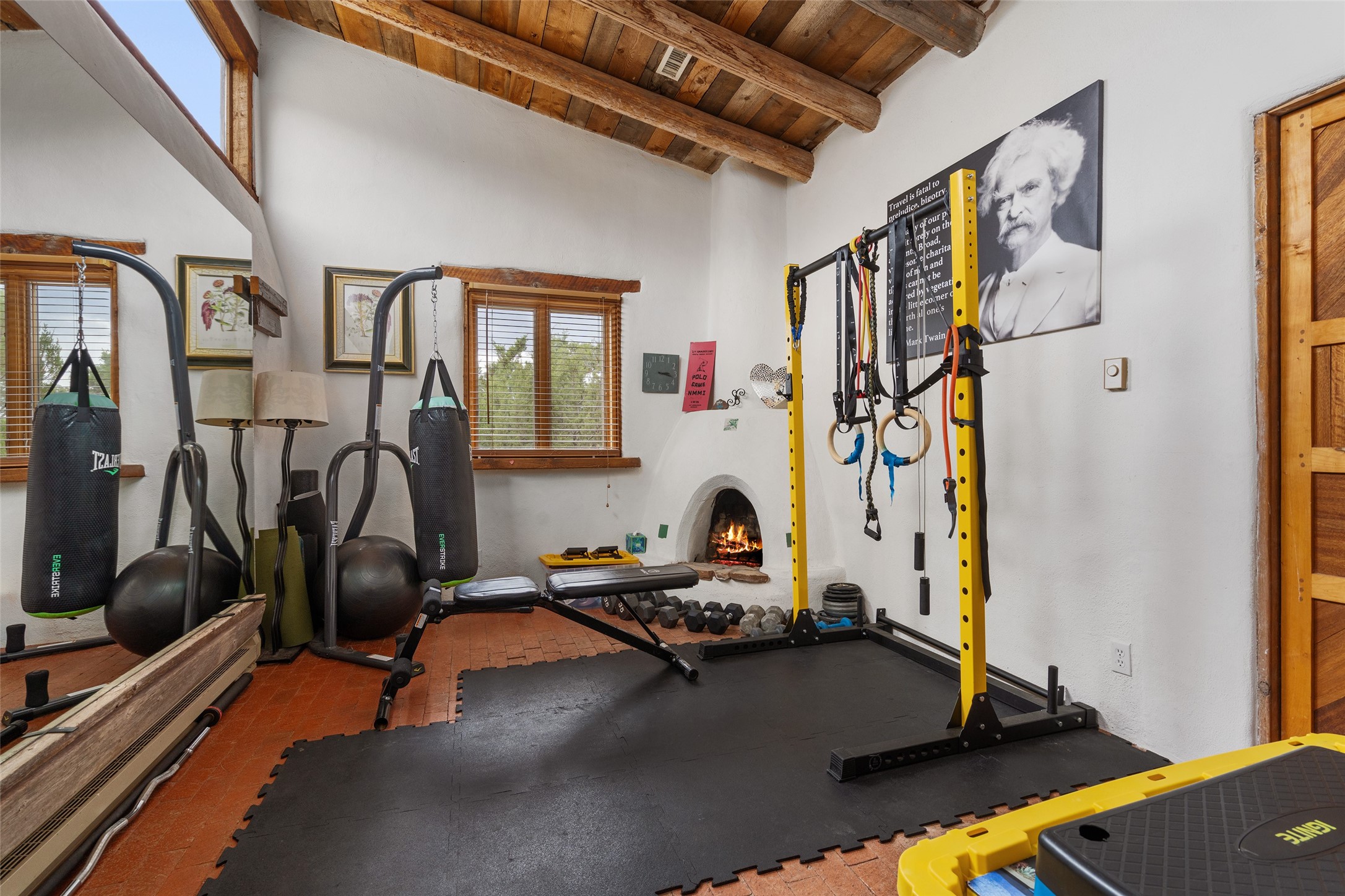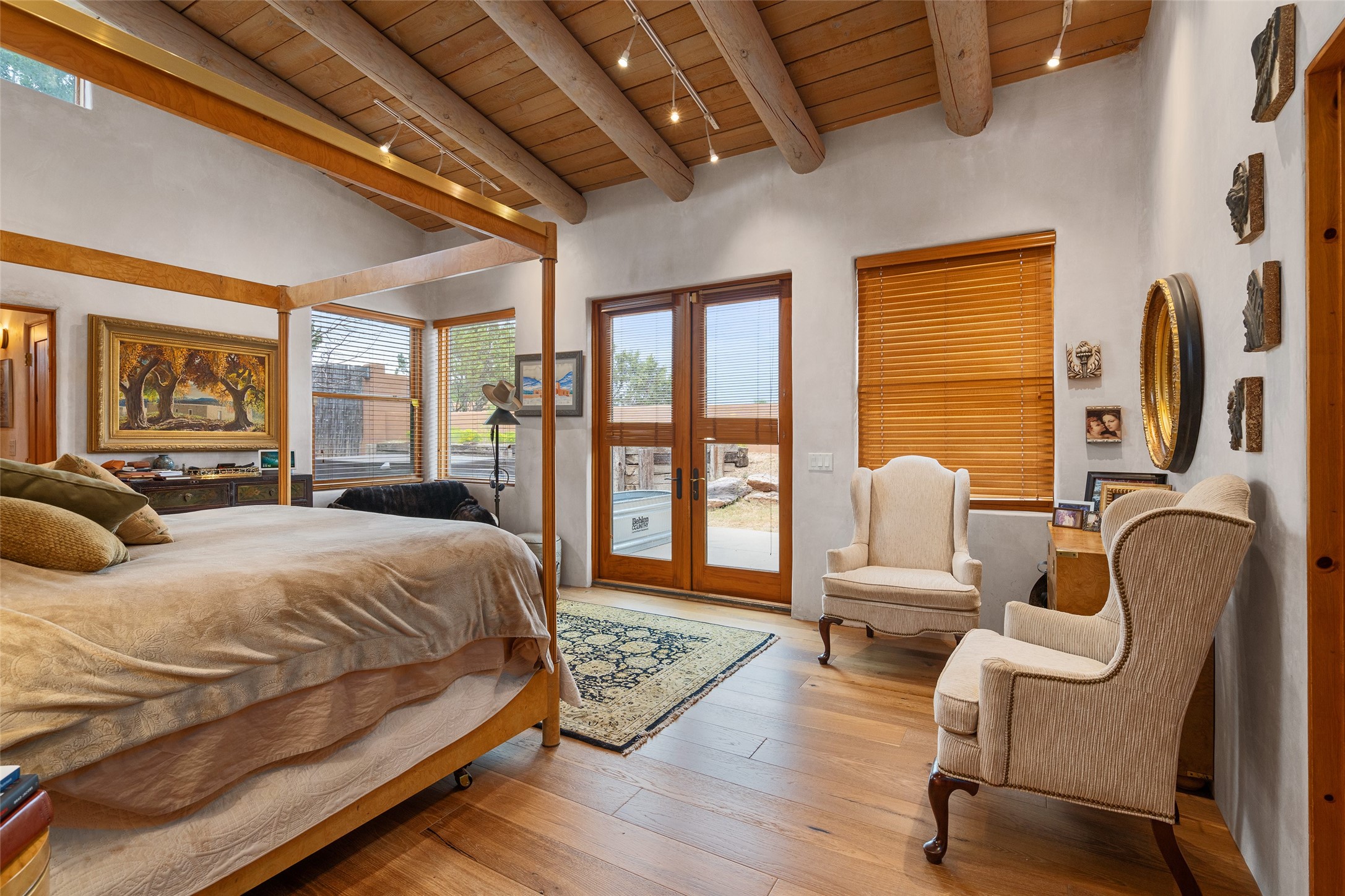 Discover the best of Santa Fe living on this enchanting estate, which blends traditional adobe craftsmanship with modern comfort, beginning with a welcoming coyote-fenced entry and a light-filled sunroom that beautifully bridges indoor and outdoor living. The original adobe home reflects classic Santa Fe character, featuring exposed vigas, rough-sawn ceilings, brick floors, banco seating, and a classic kiva fireplace. A thoughtfully designed 2004 addition expands the home to a spacious 5-bedroom, 4-bath layout connected by a striking barrel-ceiling hallway. The flexible office/5th bedroom features its own bath and fireplace and opens to a private courtyard, ideal for guests, work, or creative space. The primary suite is a serene retreat offering dual vanities, a corner soaking tub, and a generous walk-in closet. Bright, beautifully tiled bathrooms add warmth and charm throughout the home. Mature trees, xeriscaped grounds, and irrigated courtyards offer serene outdoor living spaces ideal for entertaining, gardening, or simply taking in Santa Fe's stunning sunsets. Easy access to town situated on a generous size lot where your animals are welcome, this property offers the perfect blend of privacy, character, and convenience. NO HOA! Price Improved below appraisal!