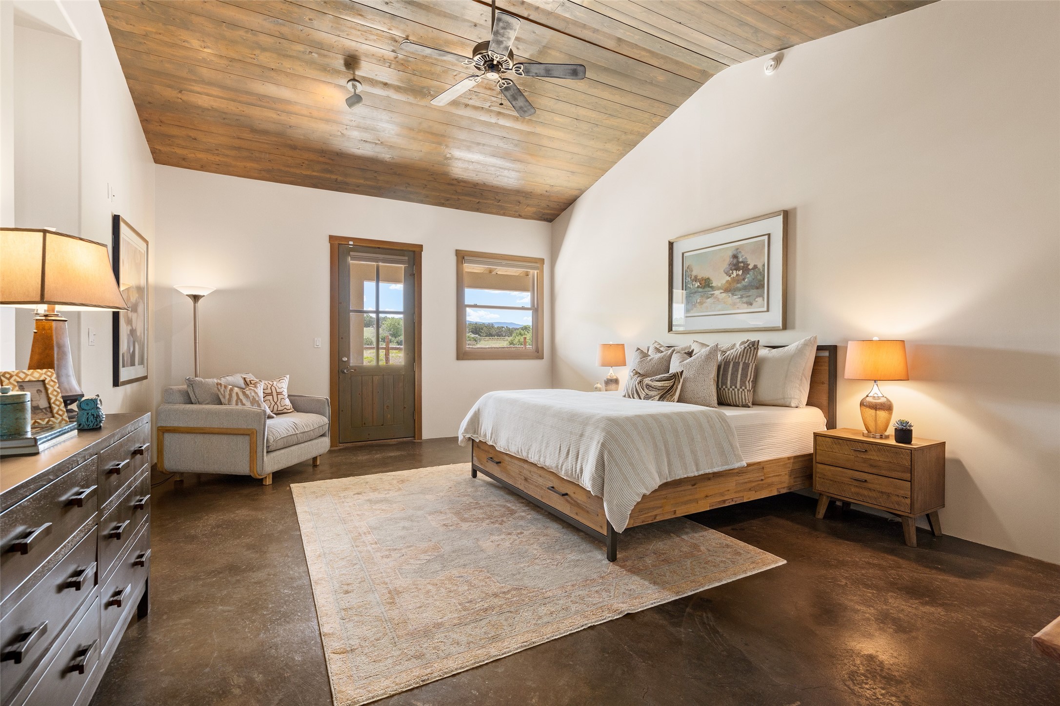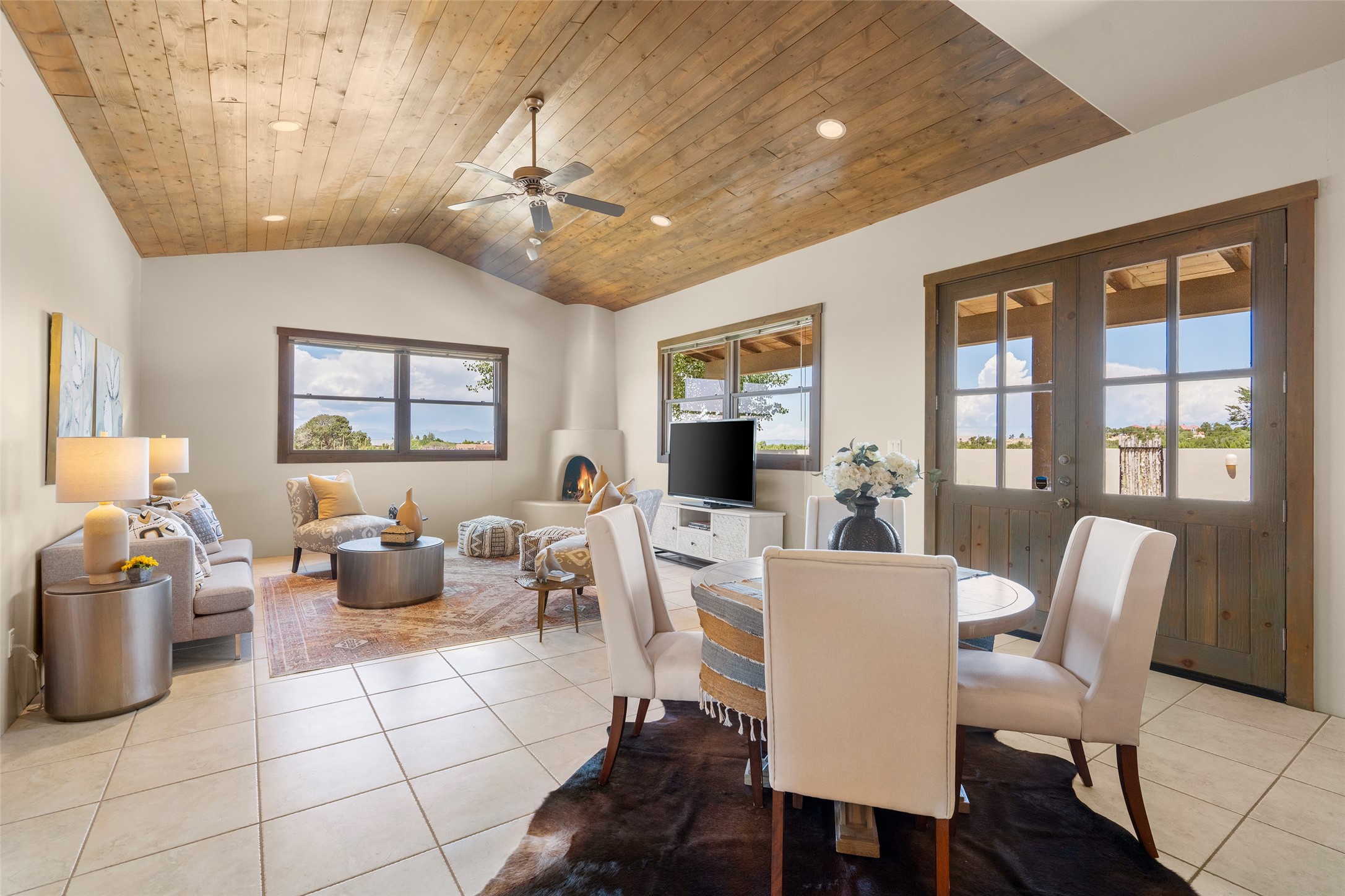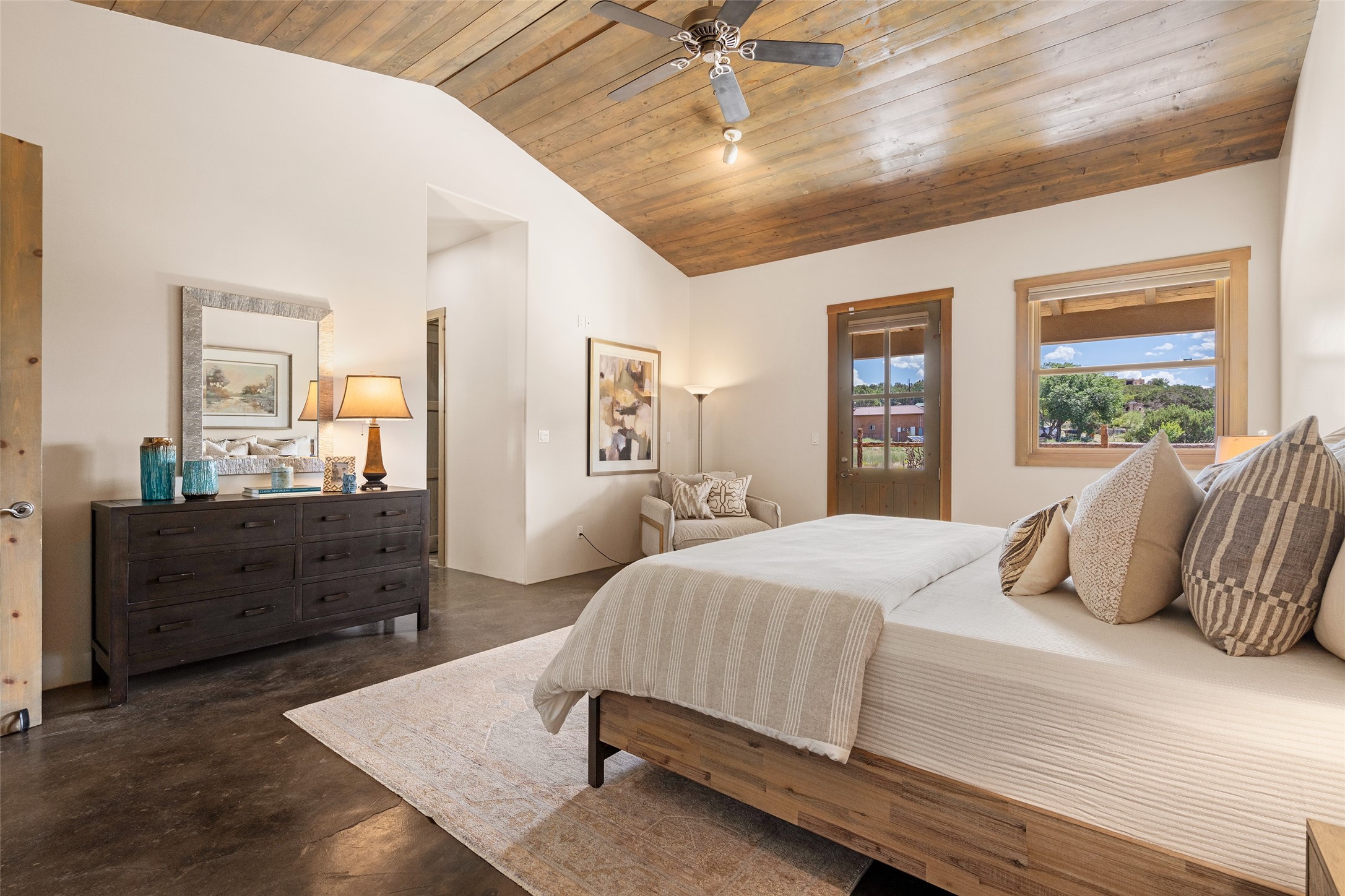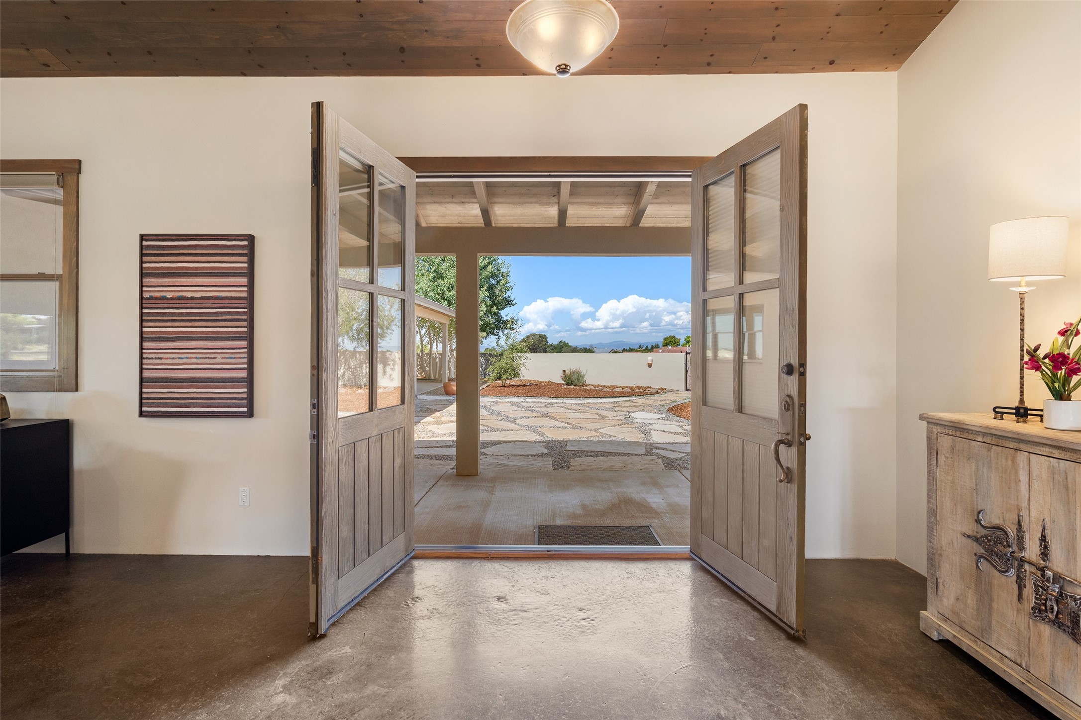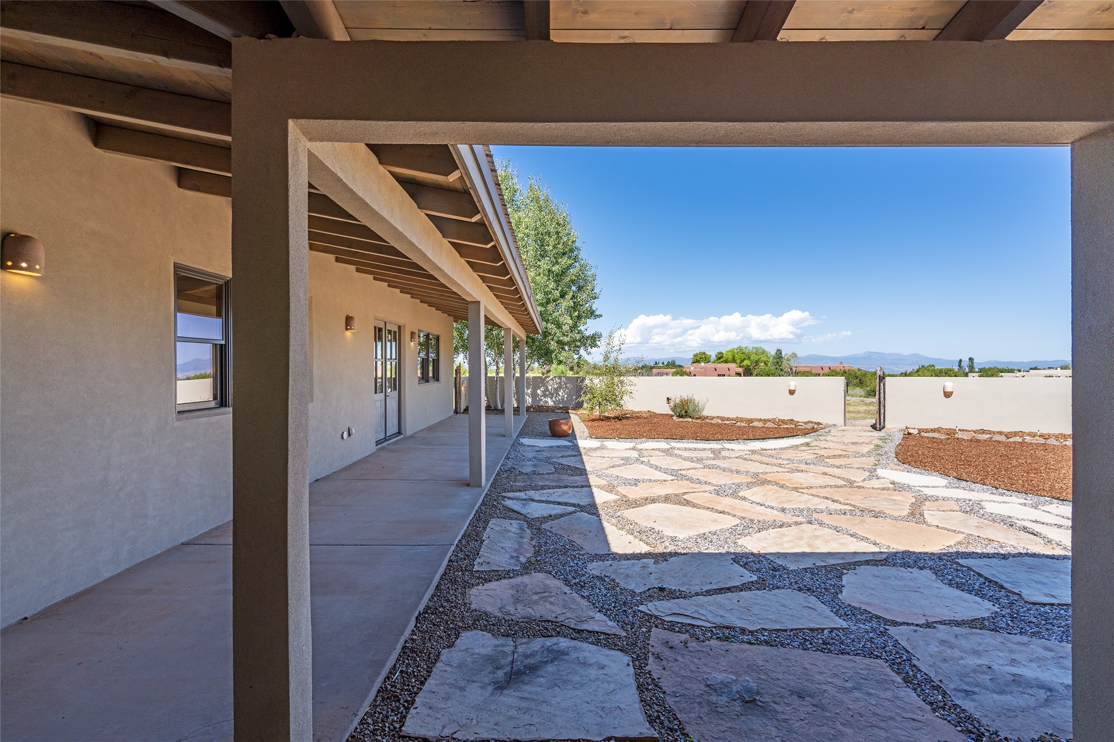 Located in Santa Fe's sought-after Tano Road area, this Northern New Mexico-style pitched roof abode is sited beautifully with huge sunset views to the west and the spectacular Jemez Mountains. Built in 2006, the single-level main residence offers 2,689 sq. ft. with three bedrooms, two and a half baths, and 2 fireplaces. The guest casita offers its own garage, 1659 sq ft, 2 bedrooms, 2 bathrooms, and 2 fireplaces blending comfort with authentic Santa Fe design. Interiors feature polished concrete floors, and deep portals in the front and back frame sweeping mountain vistas, creating a serene canvas for indoor-outdoor living. A rare multi-bay 3+ cars garage and workshop invites car collectors, woodworkers, or artists needing a large studio/workshop to create and house with ease. Just minutes from the Plaza and Canyon Road, and only 1.5 miles from the La Tierra Trails, this property combines artistry, privacy, and timeless character. Be sure to take the virtual tour and book your private showing now!