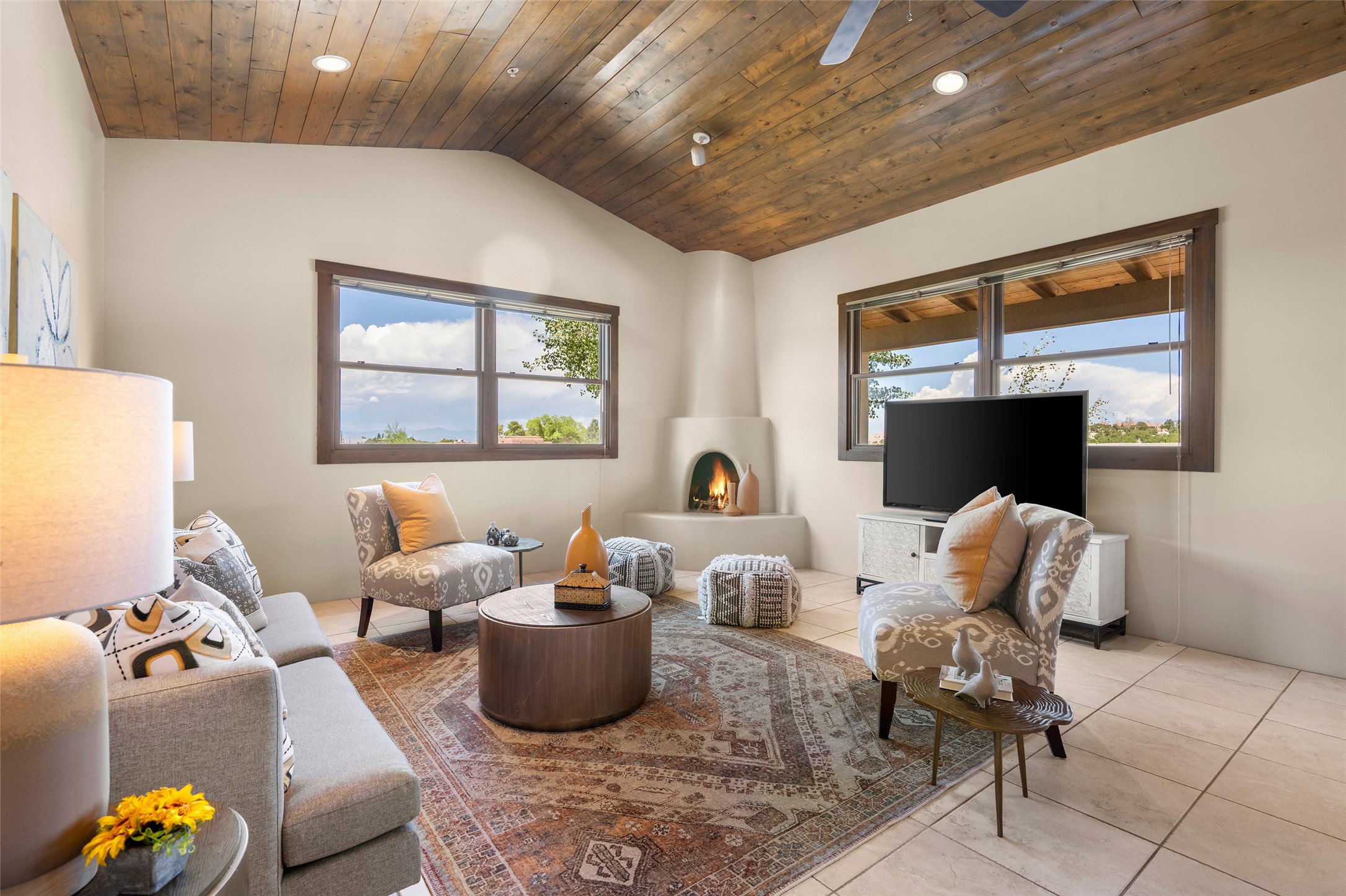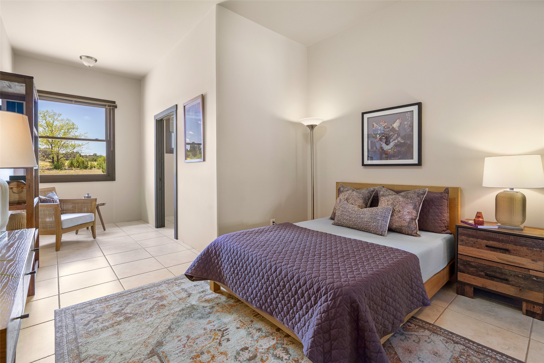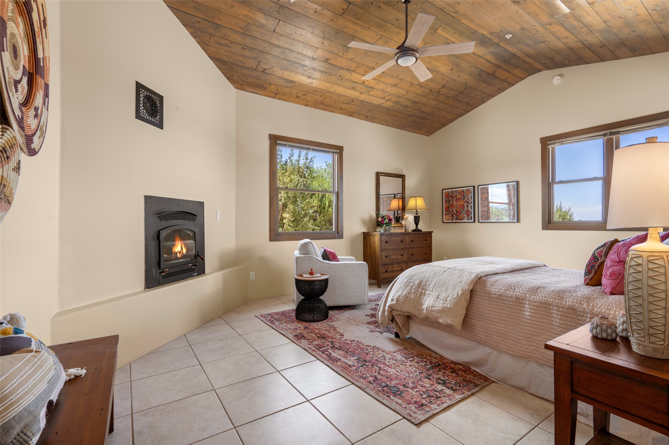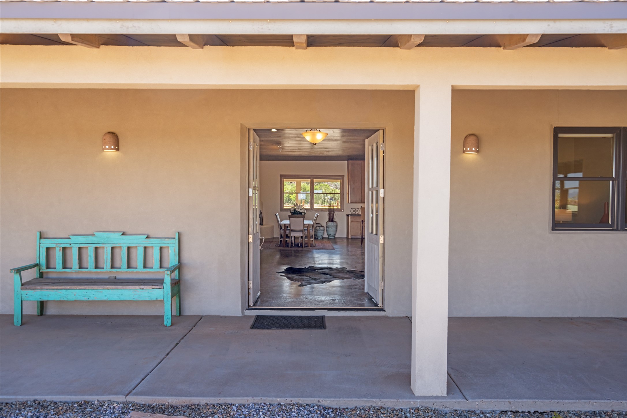 Located in Santa Fe's sought-after Tano Road area, this Northern New Mexico-style pitched roof abode is sited beautifully with huge sunset views to the west and the spectacular Jemez Mountains. Built in 2006, the single-level main residence offers 2,689 sq. ft. with three bedrooms, two and a half baths, and 2 fireplaces. The guest casita offers its own garage, 1659 sq ft, 2 bedrooms, 2 bathrooms, and 2 fireplaces blending comfort with authentic Santa Fe design. Interiors feature polished concrete floors, and deep portals in the front and back frame sweeping mountain vistas, creating a serene canvas for indoor-outdoor living. A rare multi-bay 3+ cars garage and workshop invites car collectors, woodworkers, or artists needing a large studio/workshop to create and house with ease. Just minutes from the Plaza and Canyon Road, and only 1.5 miles from the La Tierra Trails, this property combines artistry, privacy, and timeless character. Be sure to take the virtual tour and book your private showing now!