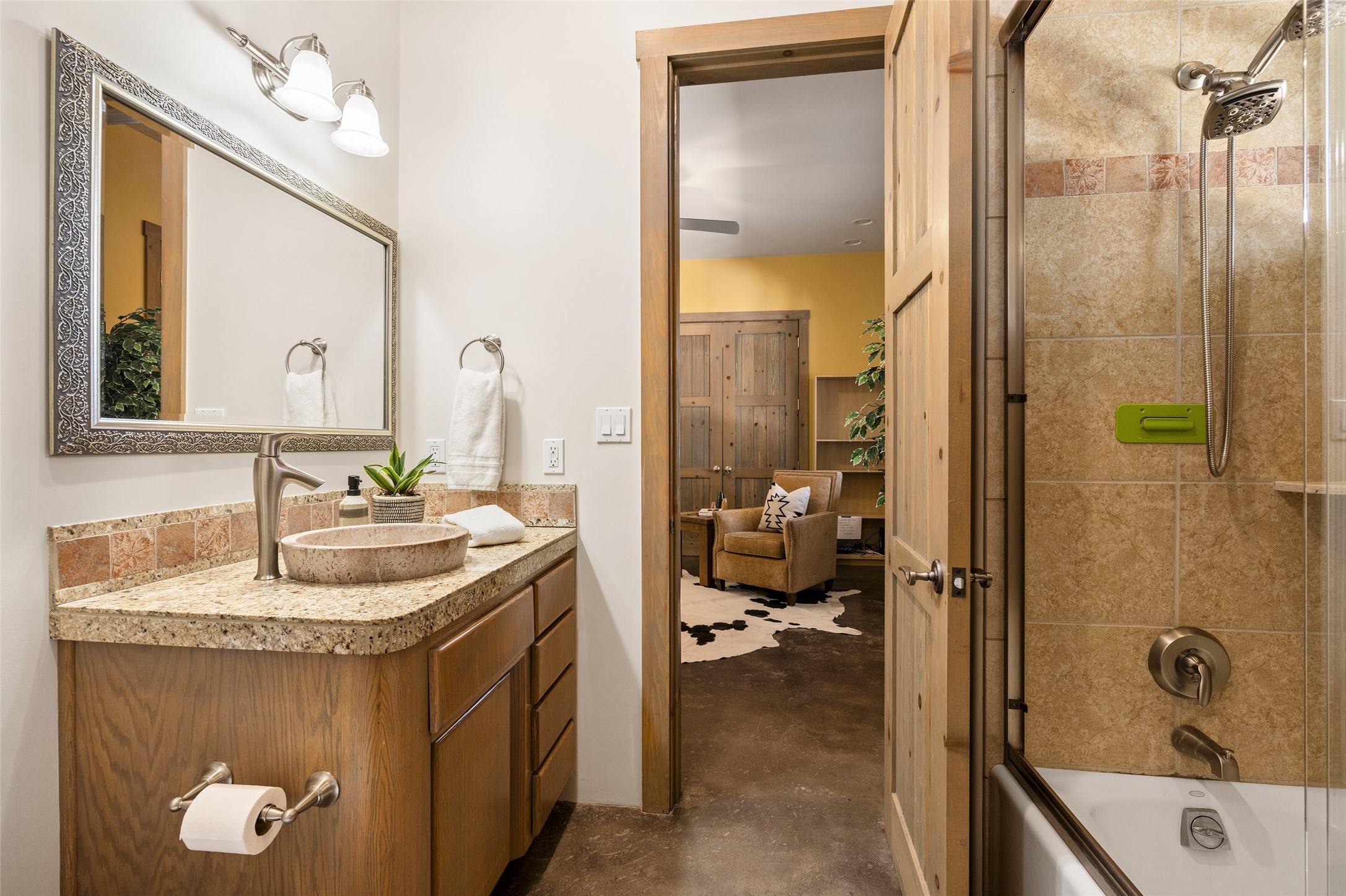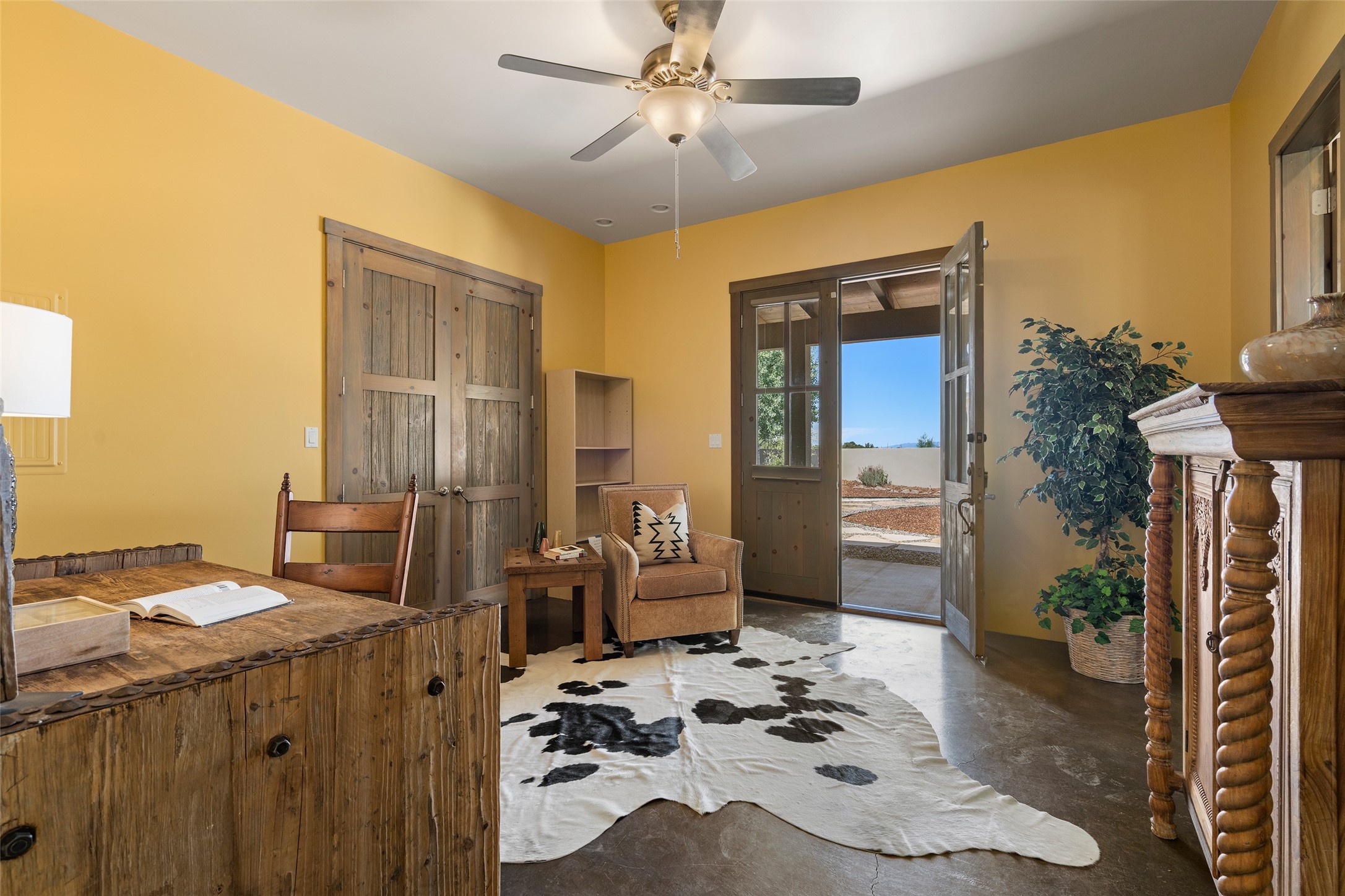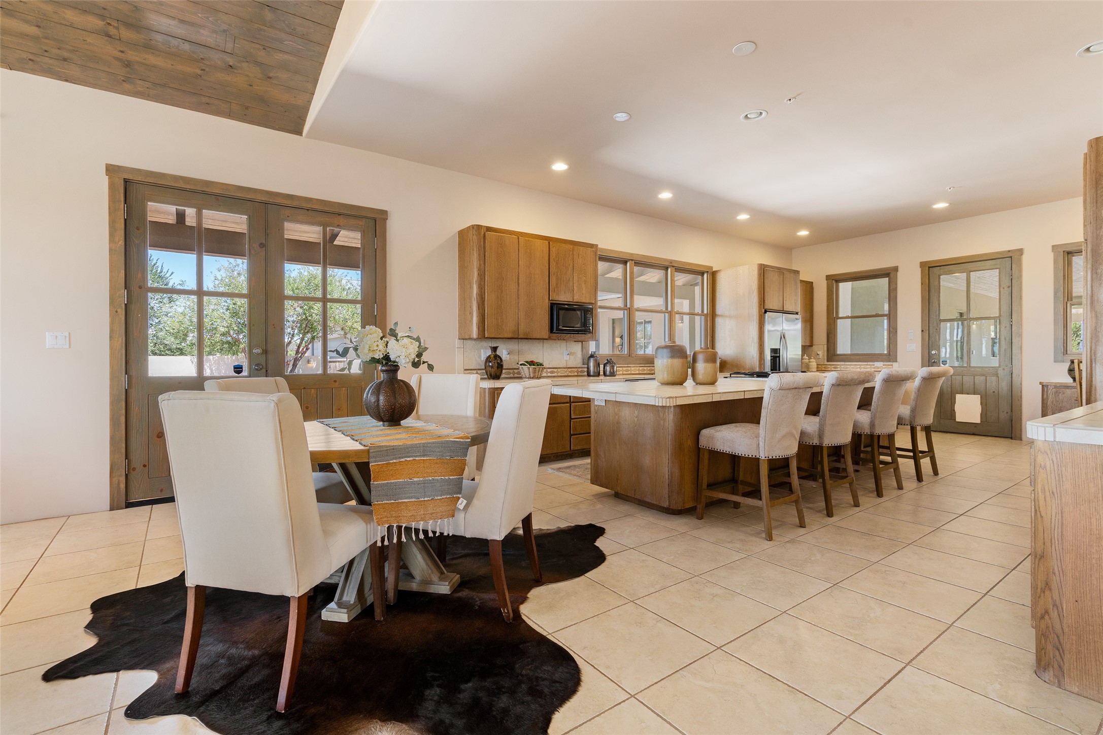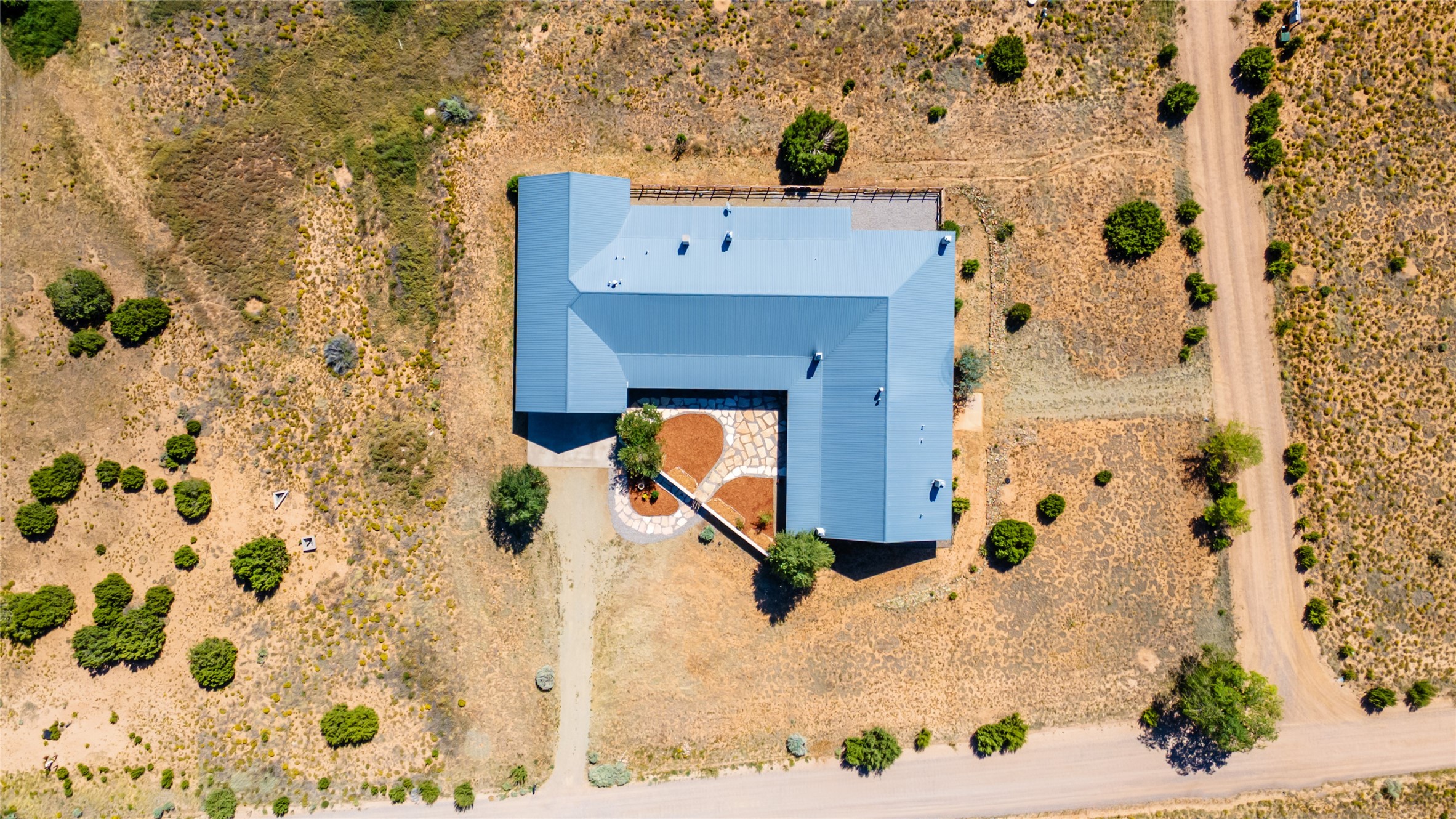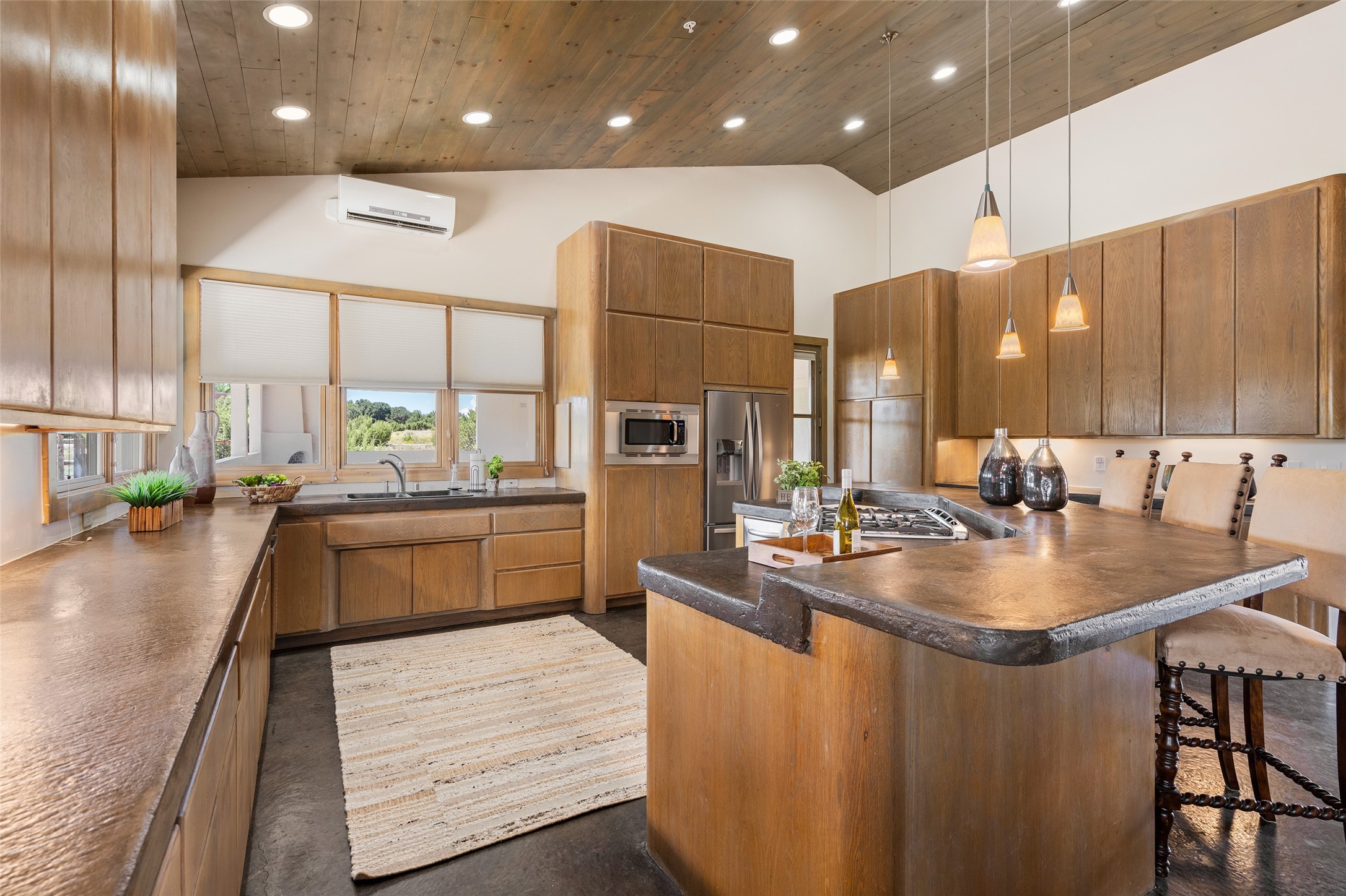 Located in Santa Fe's sought-after Tano Road area, this Northern New Mexico-style pitched roof abode is sited beautifully with huge sunset views to the west and the spectacular Jemez Mountains. Built in 2006, the single-level main residence offers 2,689 sq. ft. with three bedrooms, two and a half baths, and 2 fireplaces. The guest casita offers its own garage, 1659 sq ft, 2 bedrooms, 2 bathrooms, and 2 fireplaces blending comfort with authentic Santa Fe design. Interiors feature polished concrete floors, and deep portals in the front and back frame sweeping mountain vistas, creating a serene canvas for indoor-outdoor living. A rare multi-bay 3+ cars garage and workshop invites car collectors, woodworkers, or artists needing a large studio/workshop to create and house with ease. Just minutes from the Plaza and Canyon Road, and only 1.5 miles from the La Tierra Trails, this property combines artistry, privacy, and timeless character. Be sure to take the virtual tour and book your private showing now!