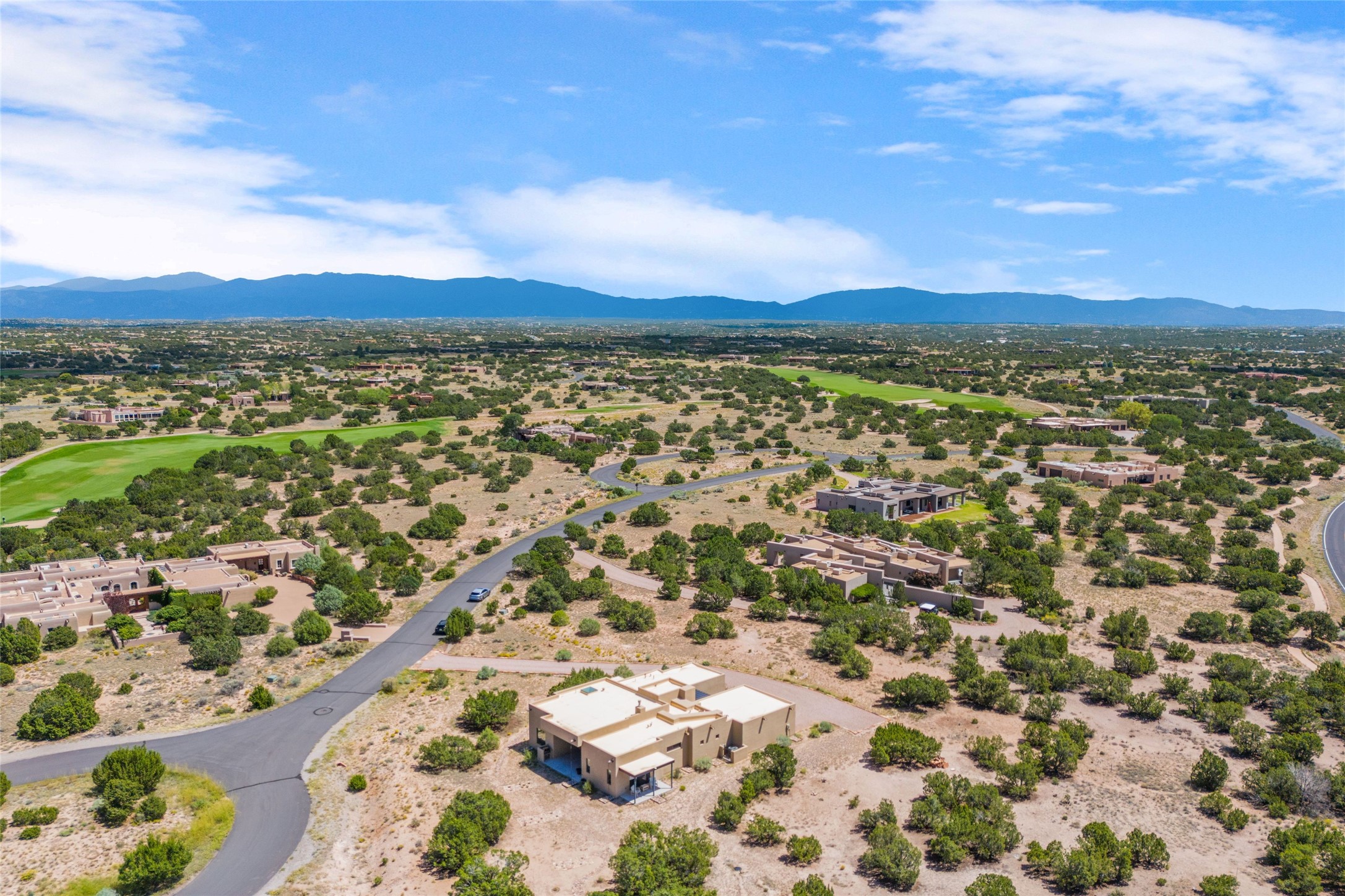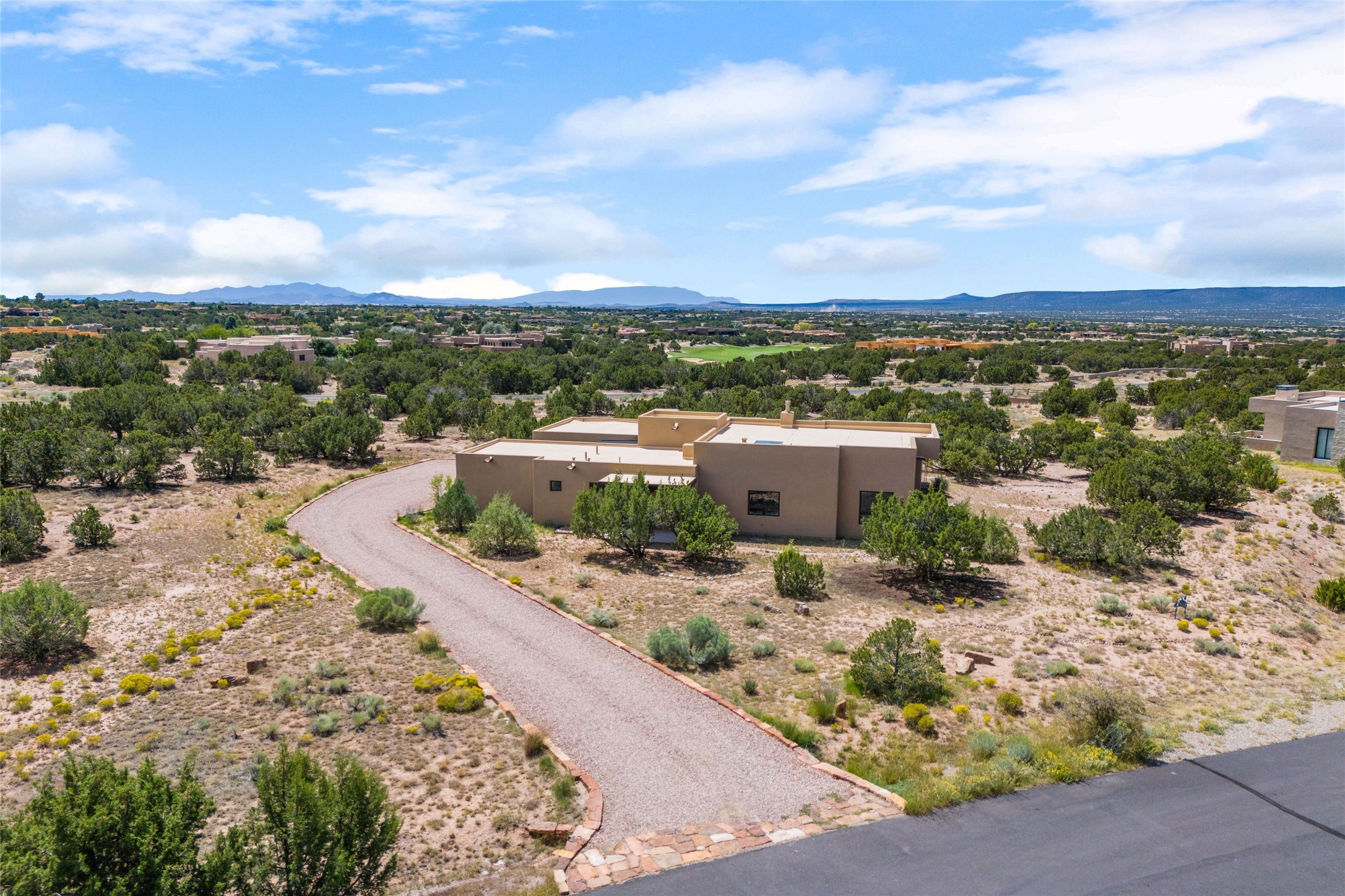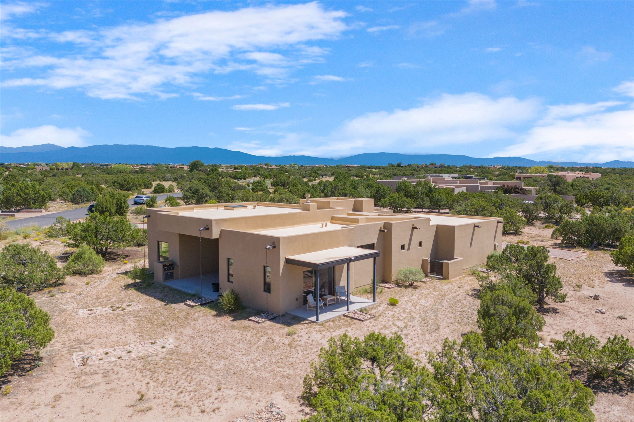 Boss Builders (2021) Santa Fe contemporary 3-bedroom 3 bath home with panoramic mountain views in Las Campanas. Single level, no interior steps. Excellent location, close to the Club at Las Campanas. The open-concept great room invites you to unwind while enjoying Jemez Mountain sunset views. The gas fireplace adds warmth and ambiance, while sliding glass doors effortlessly connect indoor and outdoor living. Chef's kitchen is appointed with an expansive island complete with breakfast bar, high-end appliances, and extended quartz countertops that offer ample workspace. Primary suite features a spa-like walk-in shower and a generous walk-in closet. Thoughtfully separated from the public areas, the guest wing includes a private en-suite bedroom and a secondary guest bedroom with its own entrance offering flex space as an office or studio. The outdoor portal comes equipped with a built-in BBQ, creating an ideal setting for entertaining or simply savoring the serene surroundings. This home is equipped with a rainwater system connected to the irrigation system, promoting sustainability while maintaining the beauty of your outdoor space with its 6 newly planted pin and juniper trees. Hunter Douglas solar shades throughout the home ensure comfort and energy efficiency year-round. Membership in The Club at Las Campanas is available upon approval and an extra fee.