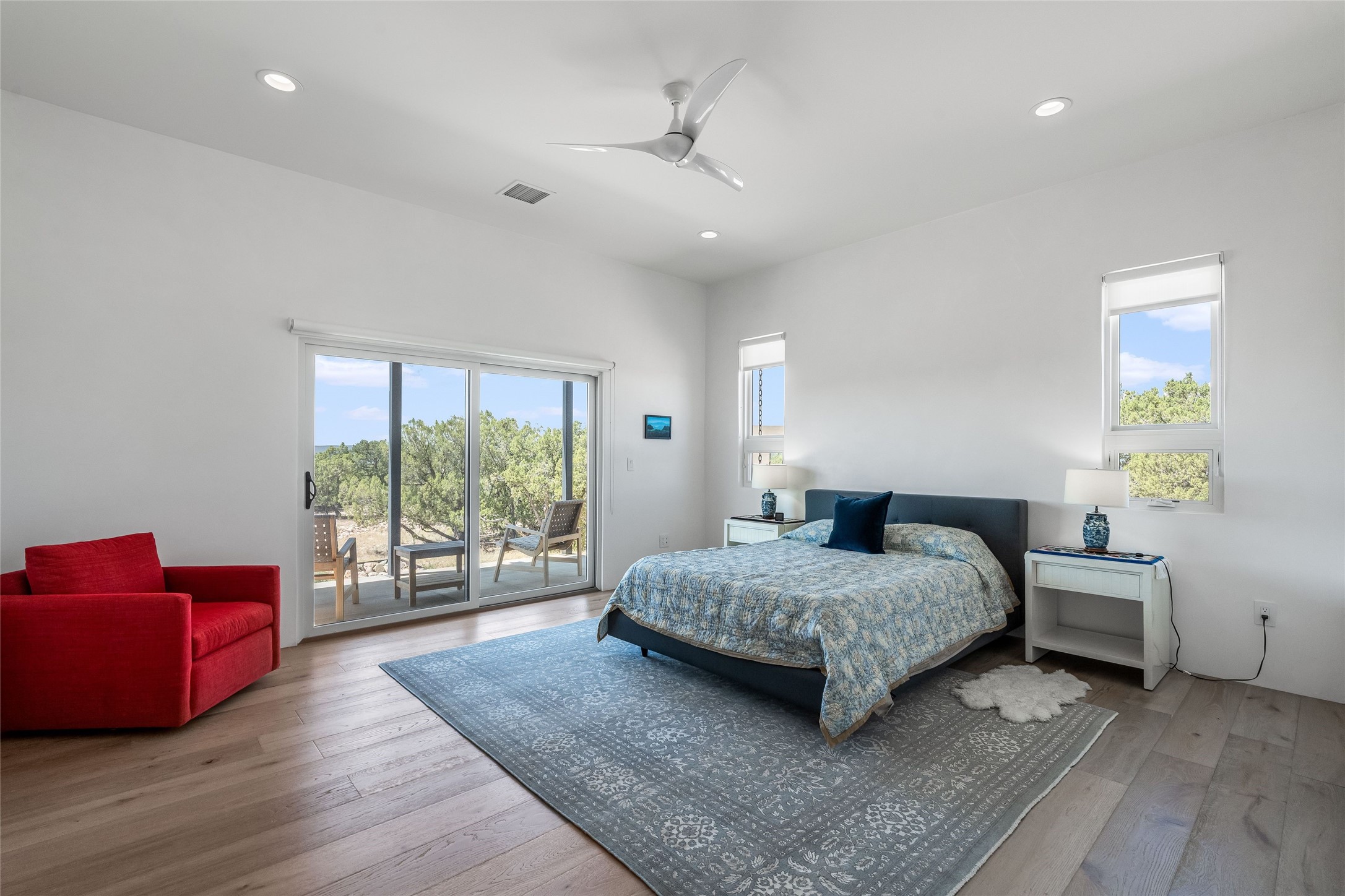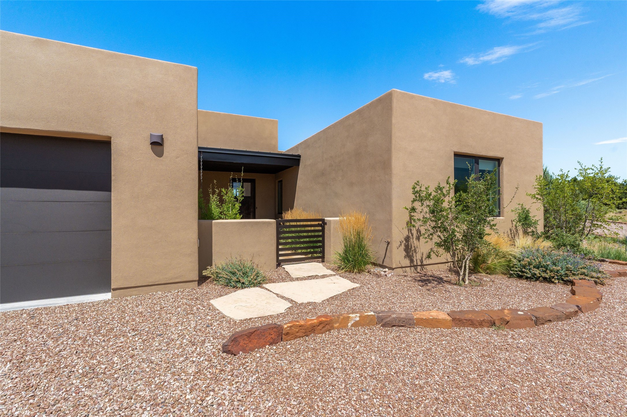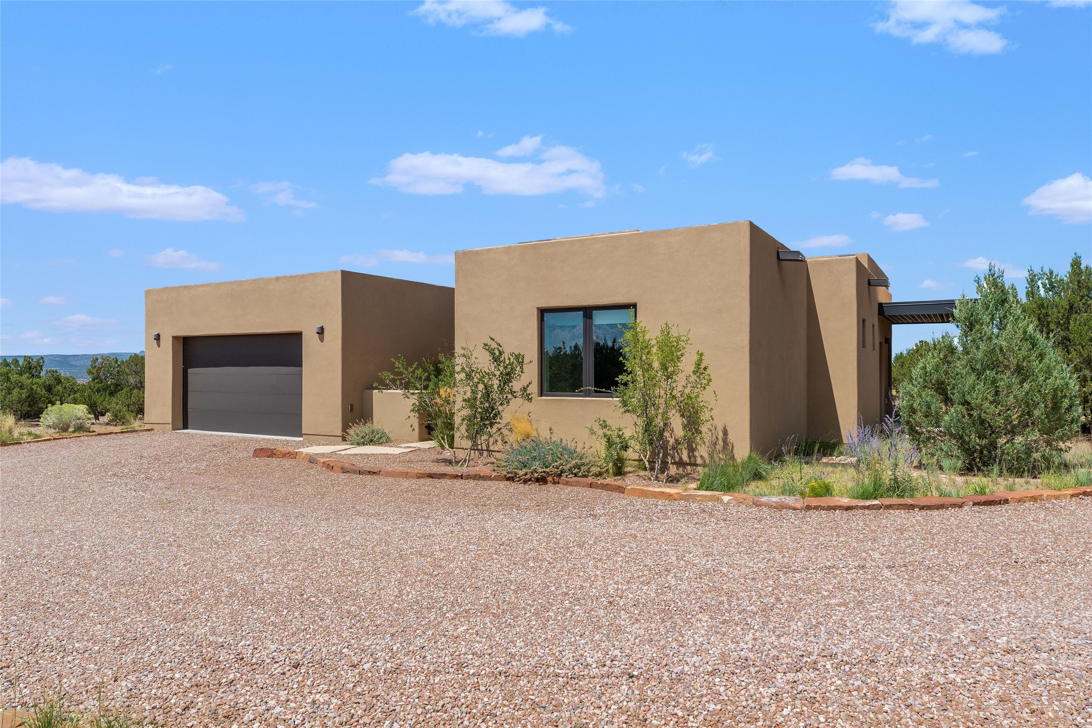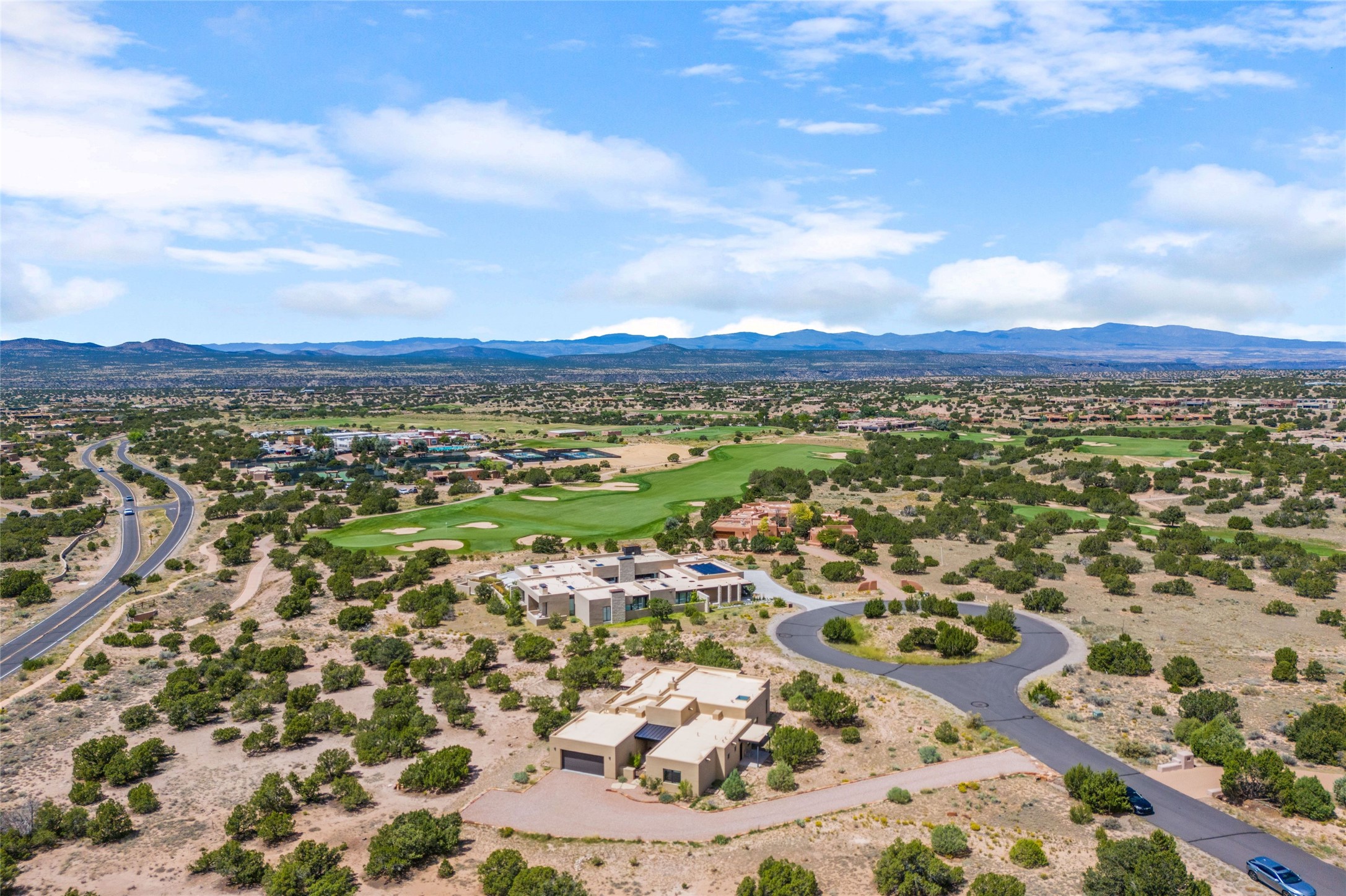 Boss Builders (2021) Santa Fe contemporary 3-bedroom 3 bath home with panoramic mountain views in Las Campanas. Single level, no interior steps. Excellent location, close to the Club at Las Campanas. The open-concept great room invites you to unwind while enjoying Jemez Mountain sunset views. The gas fireplace adds warmth and ambiance, while sliding glass doors effortlessly connect indoor and outdoor living. Chef's kitchen is appointed with an expansive island complete with breakfast bar, high-end appliances, and extended quartz countertops that offer ample workspace. Primary suite features a spa-like walk-in shower and a generous walk-in closet. Thoughtfully separated from the public areas, the guest wing includes a private en-suite bedroom and a secondary guest bedroom with its own entrance offering flex space as an office or studio. The outdoor portal comes equipped with a built-in BBQ, creating an ideal setting for entertaining or simply savoring the serene surroundings. This home is equipped with a rainwater system connected to the irrigation system, promoting sustainability while maintaining the beauty of your outdoor space with its 6 newly planted pin and juniper trees. Hunter Douglas solar shades throughout the home ensure comfort and energy efficiency year-round. Membership in The Club at Las Campanas is available upon approval and an extra fee.