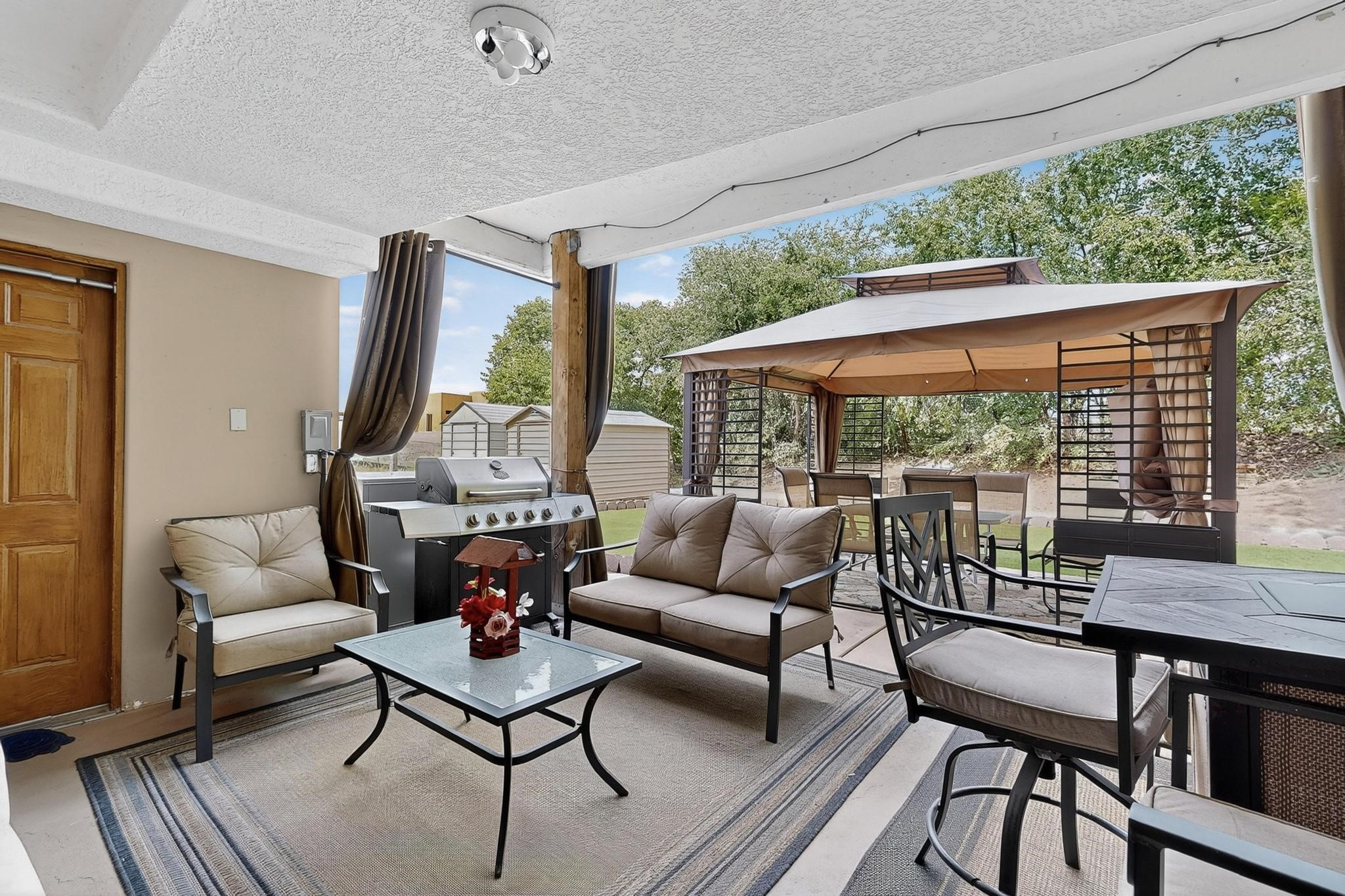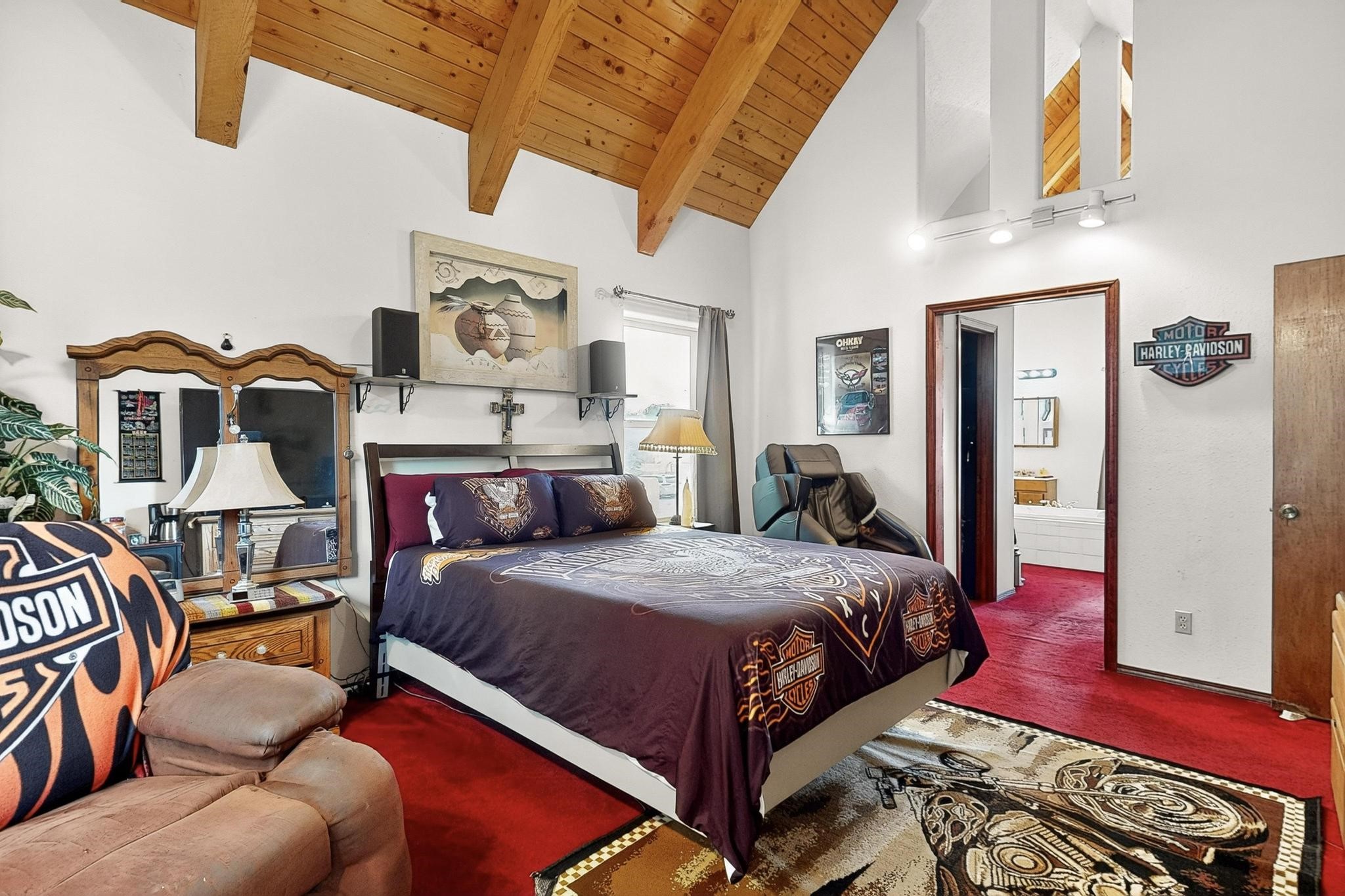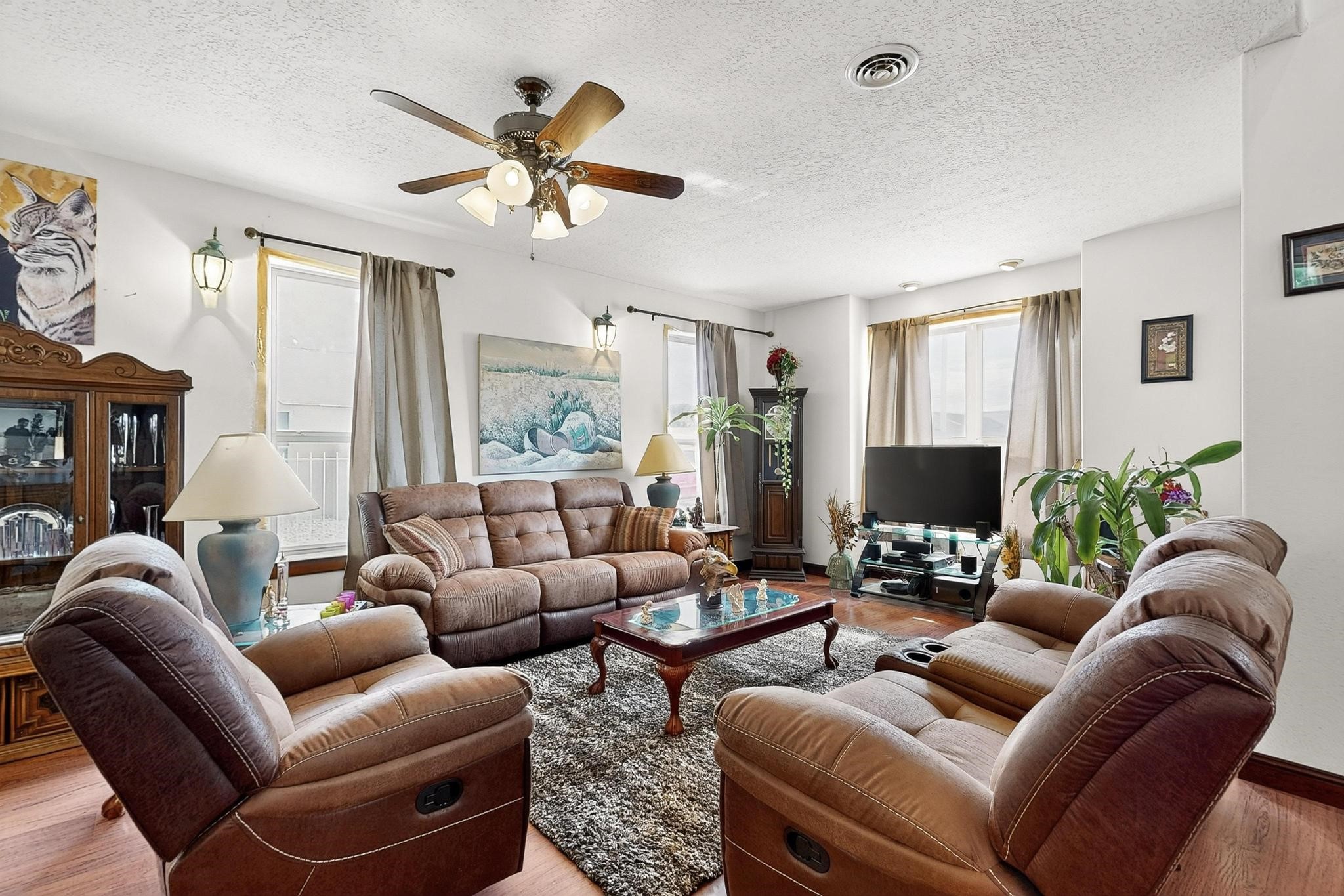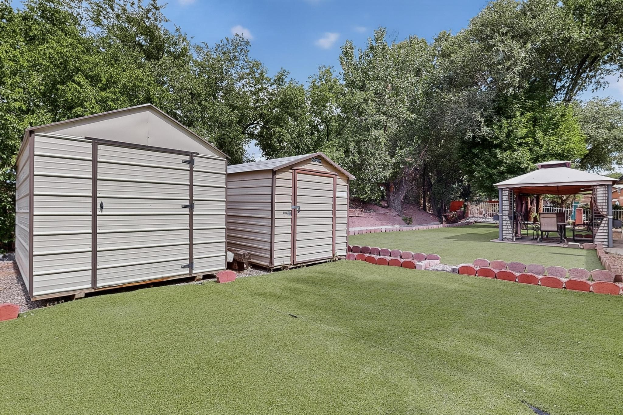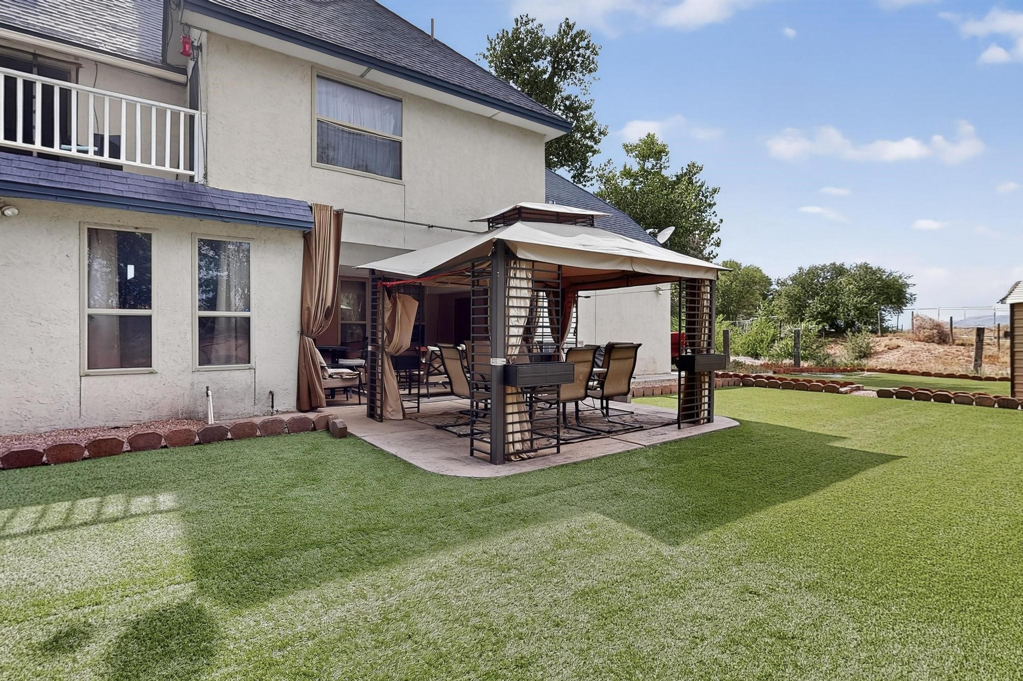 Welcome to your dream home! This stunning two-story residence combines comfort and style with extremely high ceilings and plenty of natural light from tall, narrow windows. This home offers a delightful breakfast nook and a spacious kitchen. Along with two cozy living areas, one even features a sweet fireplace.Upstairs, you'll find unique red carpeting that adds character, along with a versatile bonus room ideal as a fifth bedroom, home office, or creative space. The master suite offers a luxurious jacuzzi bathtub for ultimate relaxation, and a private balcony perfect for enjoying fresh air and views. Outside, enjoy a low-maintenance backyard with artificial grass, mature trees (including plum and apricot), and a peaceful water stream with water rights. Two storage sheds provide extra space for your needs. The front yard features attractive gravel and paved landscaping for great curb appeal. Schedule a showing today!