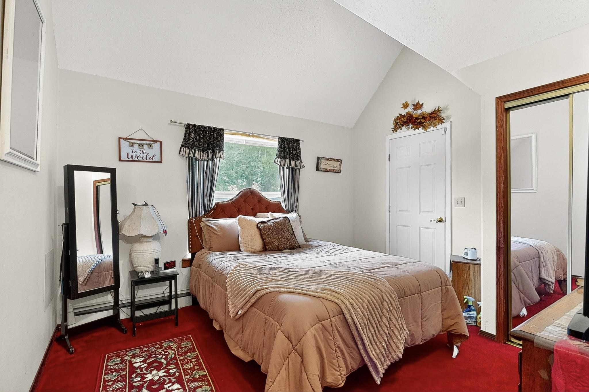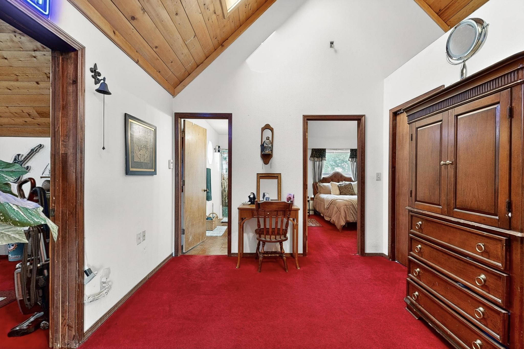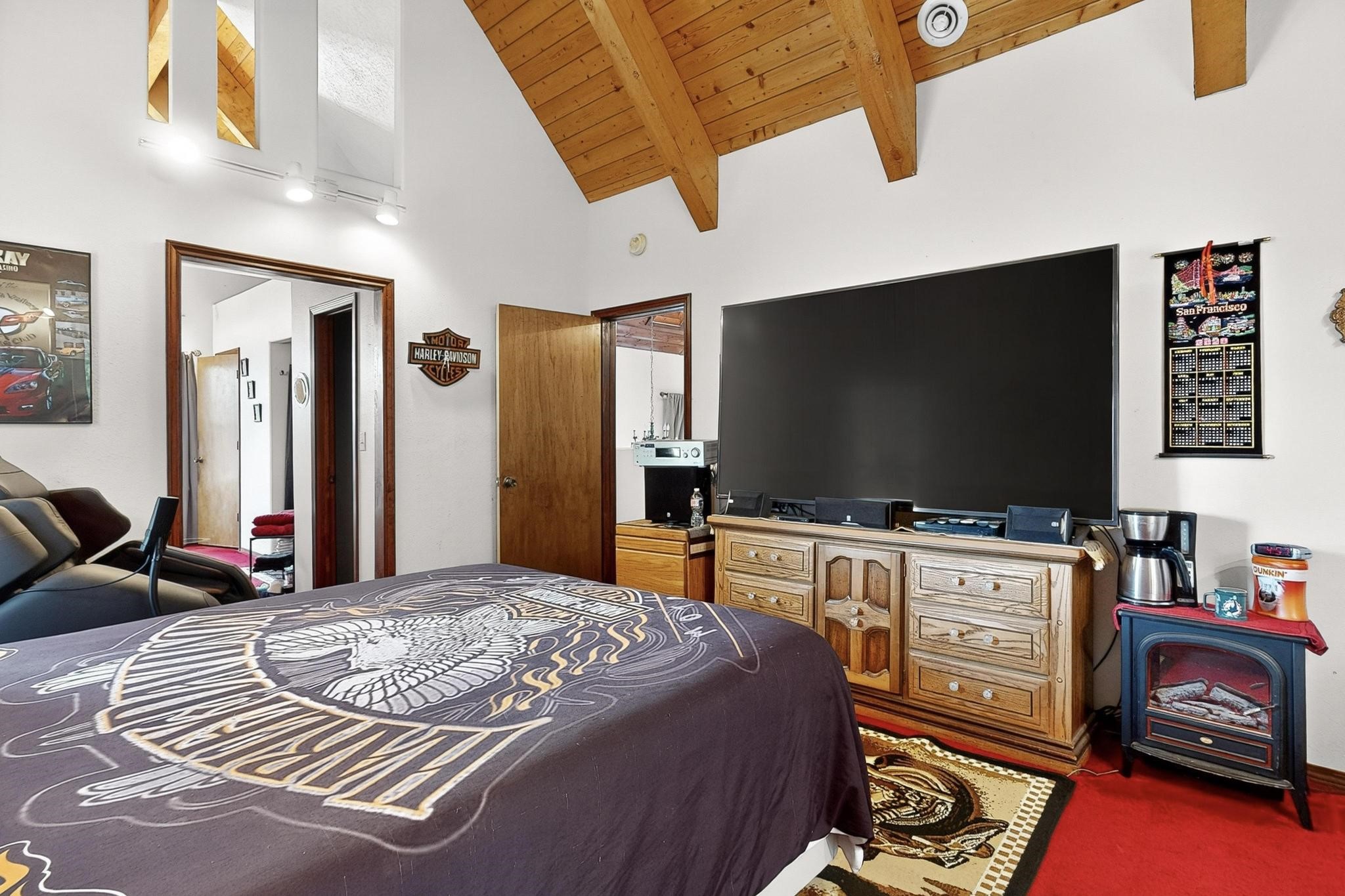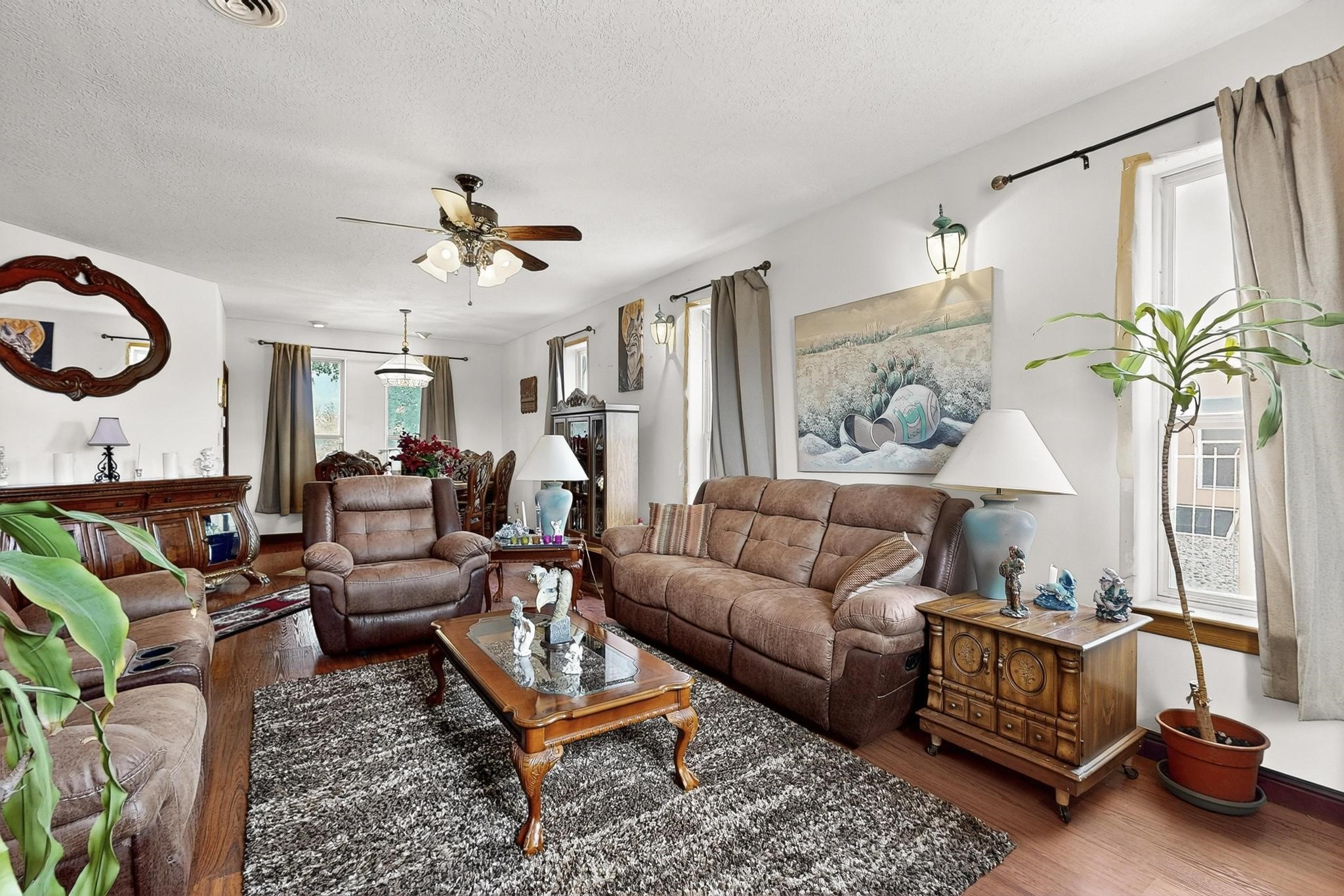 Welcome to your dream home! This stunning two-story residence combines comfort and style with extremely high ceilings and plenty of natural light from tall, narrow windows. This home offers a delightful breakfast nook and a spacious kitchen. Along with two cozy living areas, one even features a sweet fireplace.Upstairs, you'll find unique red carpeting that adds character, along with a versatile bonus room ideal as a fifth bedroom, home office, or creative space. The master suite offers a luxurious jacuzzi bathtub for ultimate relaxation, and a private balcony perfect for enjoying fresh air and views. Outside, enjoy a low-maintenance backyard with artificial grass, mature trees (including plum and apricot), and a peaceful water stream with water rights. Two storage sheds provide extra space for your needs. The front yard features attractive gravel and paved landscaping for great curb appeal. Schedule a showing today!