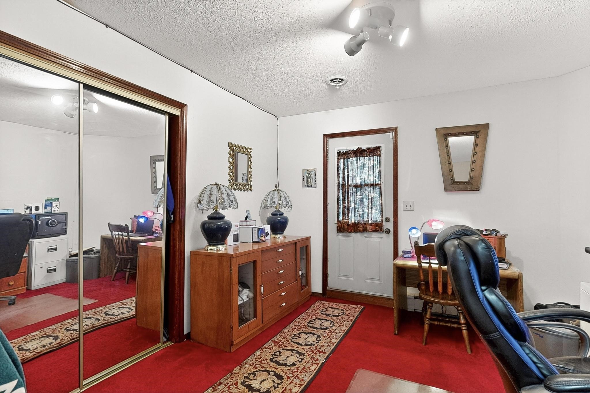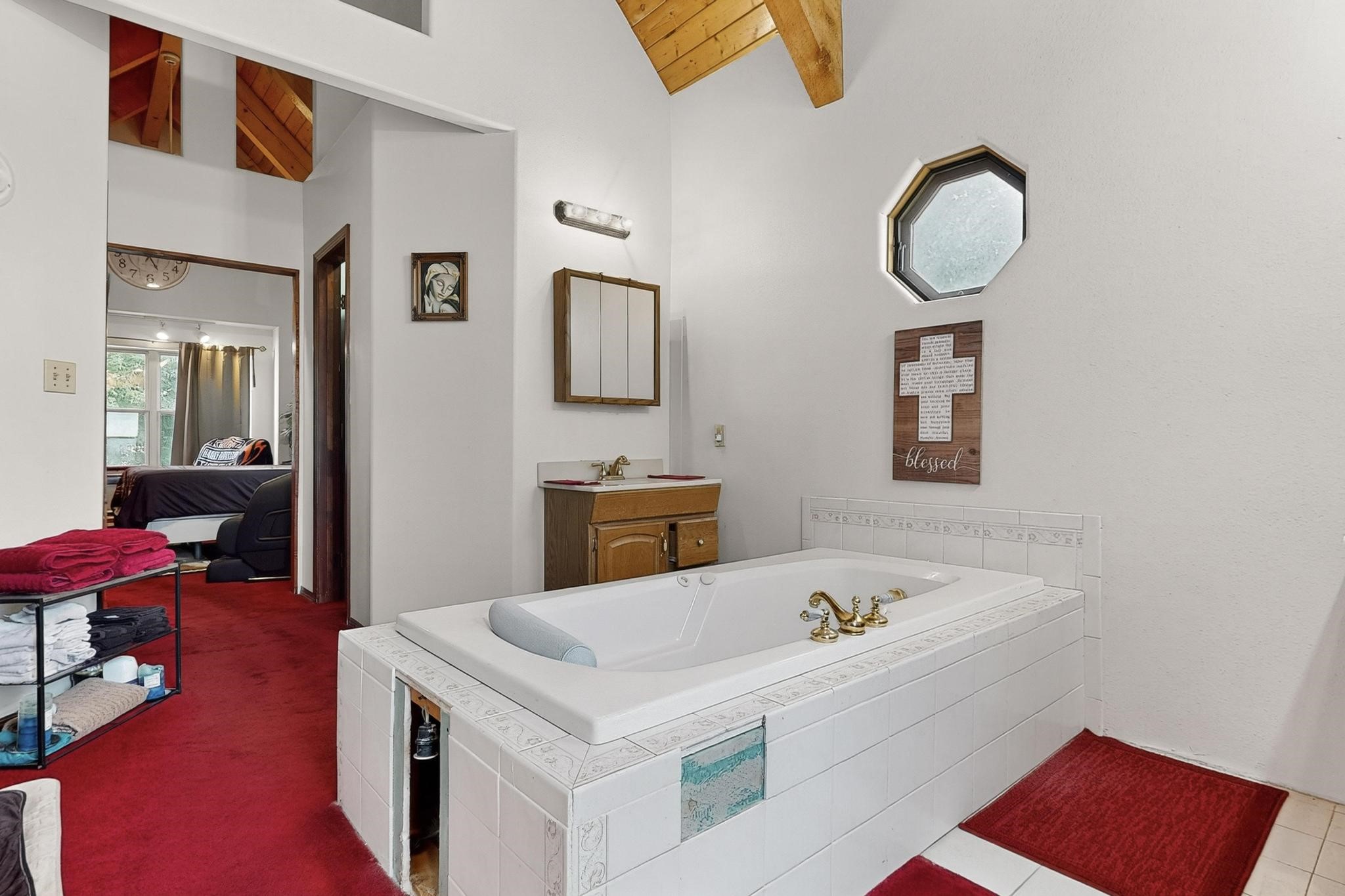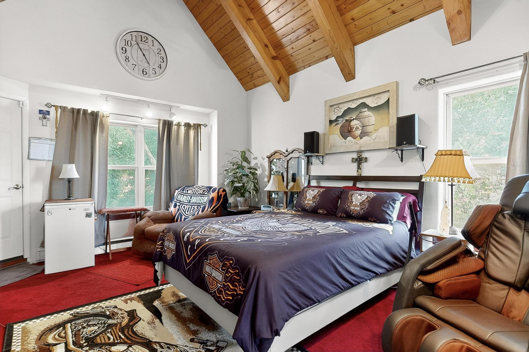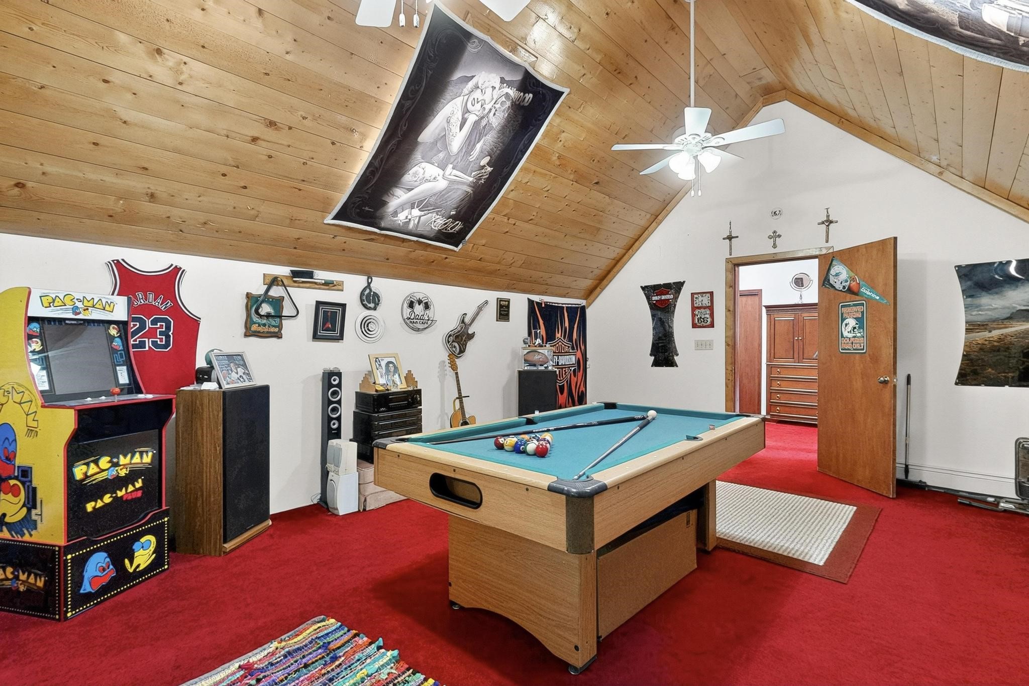 Welcome to your dream home! This stunning two-story residence combines comfort and style with extremely high ceilings and plenty of natural light from tall, narrow windows. This home offers a delightful breakfast nook and a spacious kitchen. Along with two cozy living areas, one even features a sweet fireplace.Upstairs, you'll find unique red carpeting that adds character, along with a versatile bonus room ideal as a fifth bedroom, home office, or creative space. The master suite offers a luxurious jacuzzi bathtub for ultimate relaxation, and a private balcony perfect for enjoying fresh air and views. Outside, enjoy a low-maintenance backyard with artificial grass, mature trees (including plum and apricot), and a peaceful water stream with water rights. Two storage sheds provide extra space for your needs. The front yard features attractive gravel and paved landscaping for great curb appeal. Schedule a showing today!