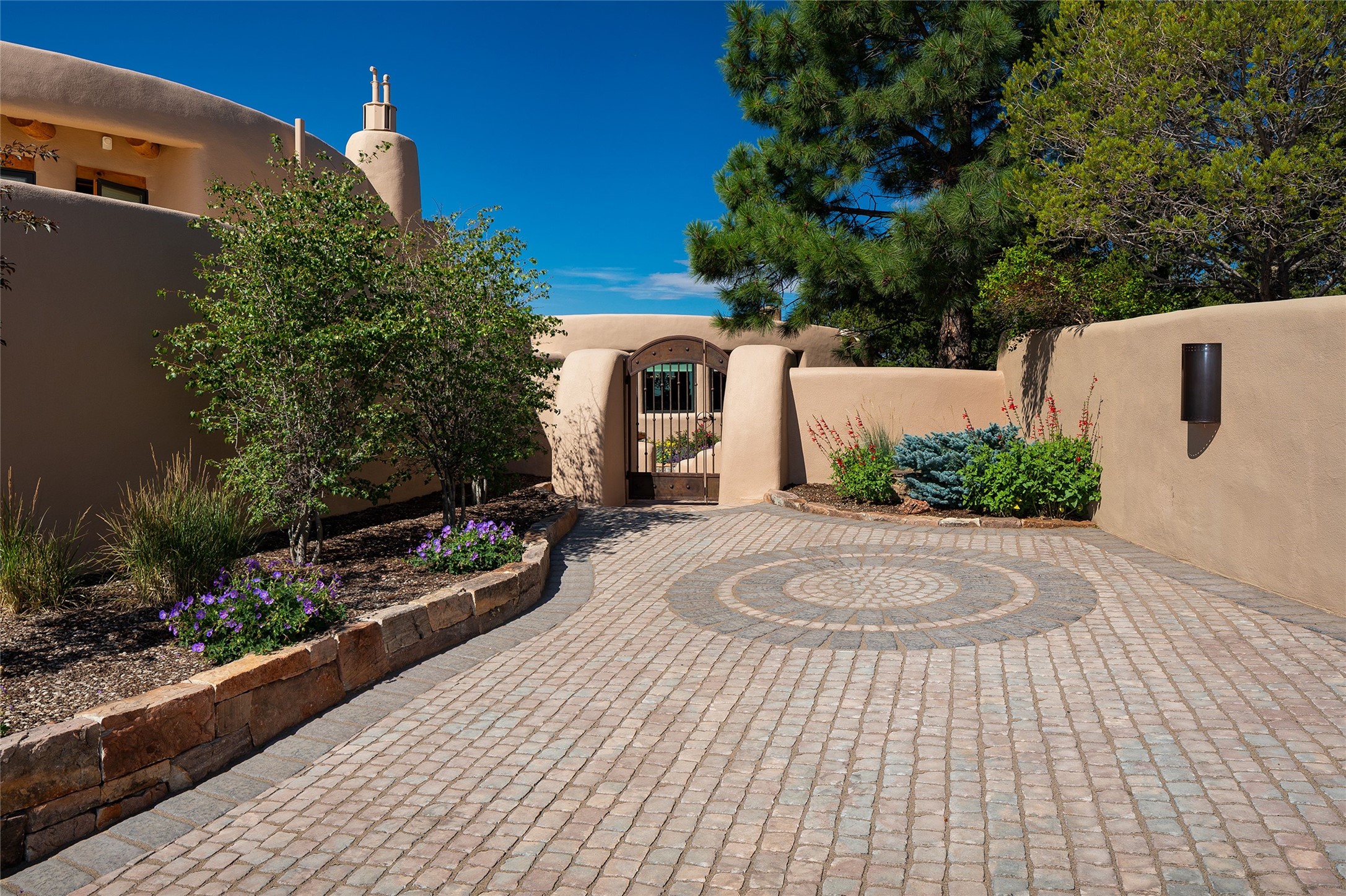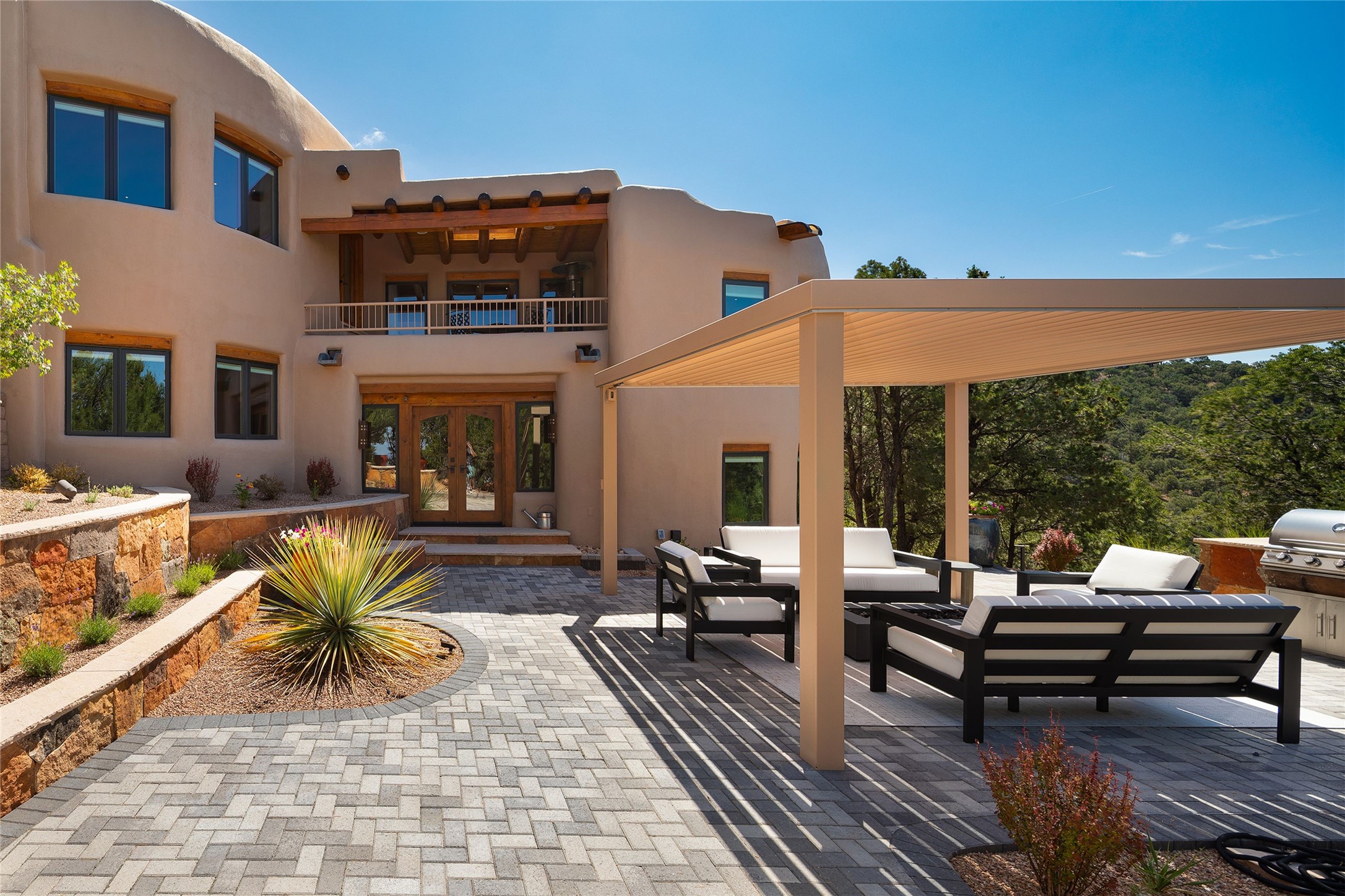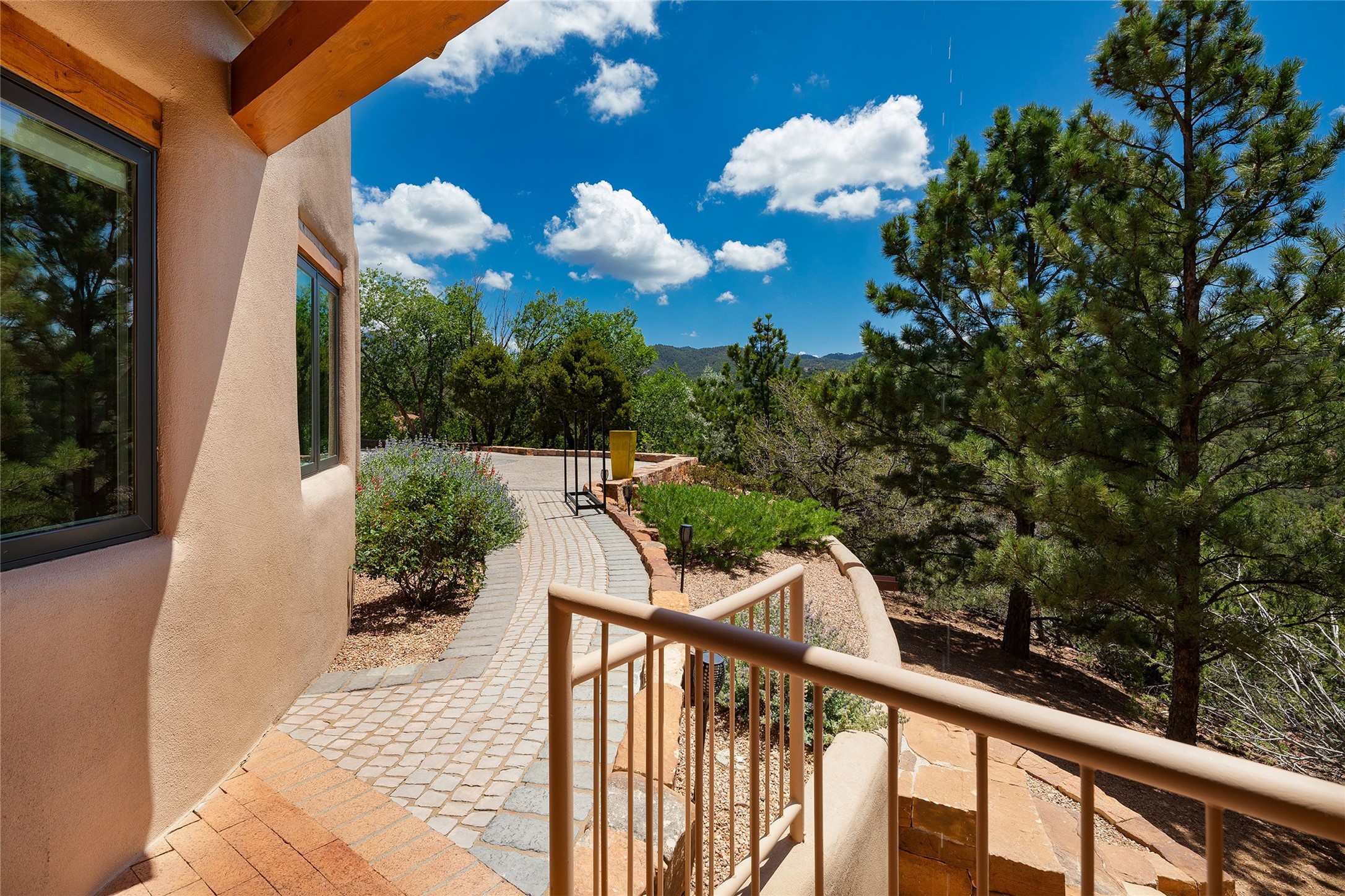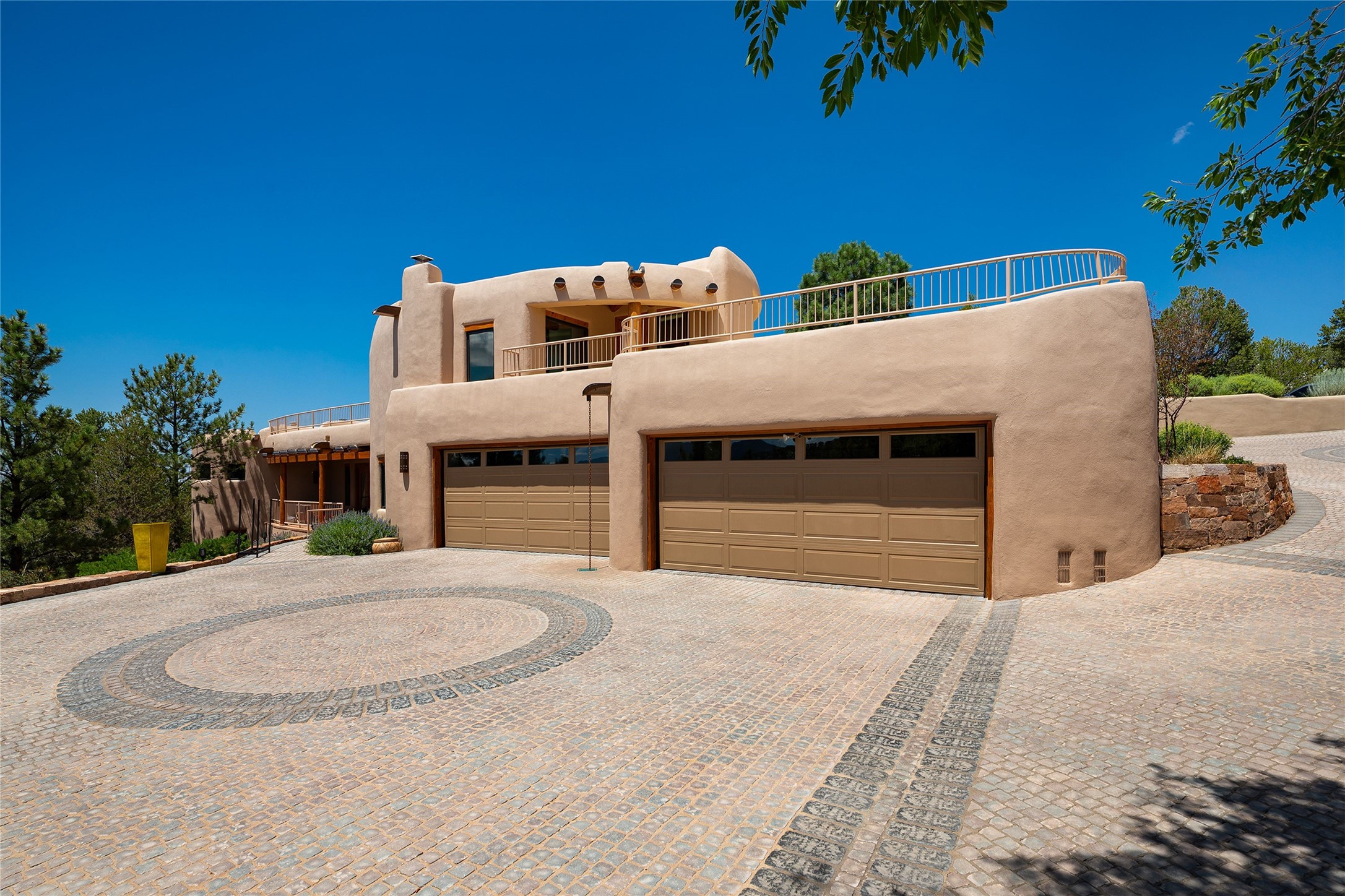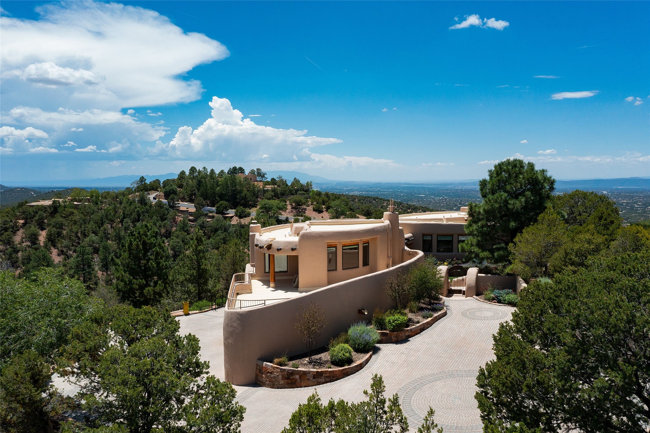Welcome to 1233 North Summit Drive. One of the most extraordinary homes in all of Santa Fe, this captivating residence stuns with powerful architecture and majestic mountain views, and celebrates the ultimate Santa Fe lifestyle. Located within the coveted, private gates of the Santa Fe Summit, this 7,200 sq. ft. adobe residence is one of architect/builder Mike Fischer's most exceptional works. Built with uncompromising craftsmanship, the home blends timeless Santa Fe style with thoughtful modern updates--showcasing curved plaster walls, viga and beam ceilings, handcrafted fireplaces, and luxury finishes throughout. The main level is designed for entertaining, with spacious living and dining areas, while the upper floor is devoted to a private primary suite, complete with a luxurious bath, sitting room or office, and a rooftop deck that captures sweeping mountain views. Thoughtful updates include a 2018 kitchen renovation and a 2020 spa-like bath remodel, bringing modern elegance to traditional adobe design. The lower level offers excellent guest accommodations, with two bedrooms, two baths, and a large media/game room. A rare 4-car garage adds convenience and storage, while recent upgrades impress, such as new Pella windows, a TPO roof, and newly designed hardscape and lush, vibrant, surrounding landscape.From its perch at one of the highest residential elevations in Santa Fe, the home enjoys awe-inspiring panoramas of the Sangre de Cristo and Jemez ranges, the dramatic north face of Atalaya Mountain, and the north side of Picacho Peak. Multiple view decks and patios maximize the setting, while direct access to the Dale Ball Trail system makes outdoor adventure effortless. Just steps away from the world-class 10,000 Waves resort and spa, and only 3.5 miles from the Plaza, this incredible residence, sited in a tranquil, park-like setting, offers an unmatched blend of mountain living, privacy, and convenience, combined with architectural pedigree and modern upgrades.