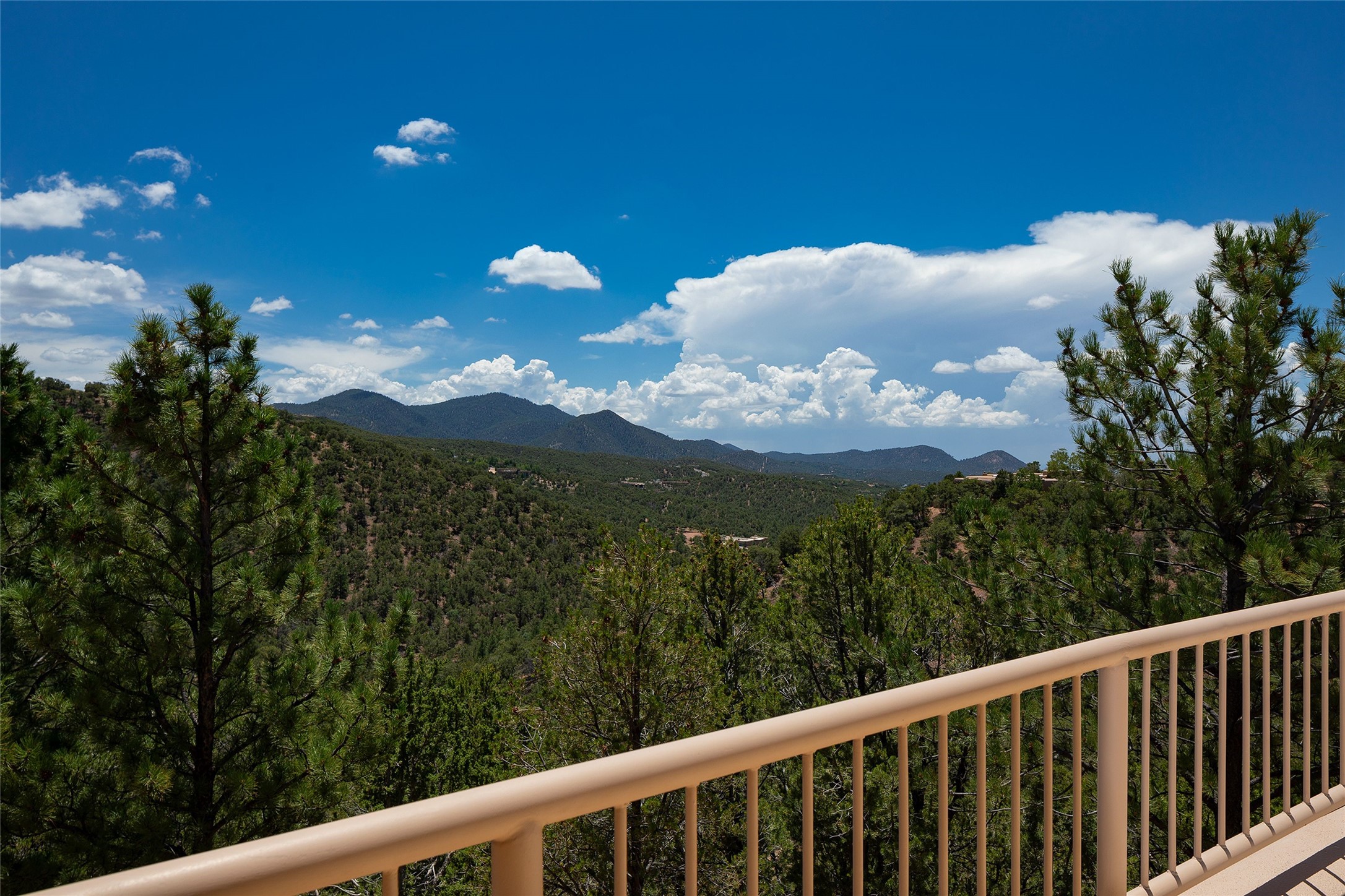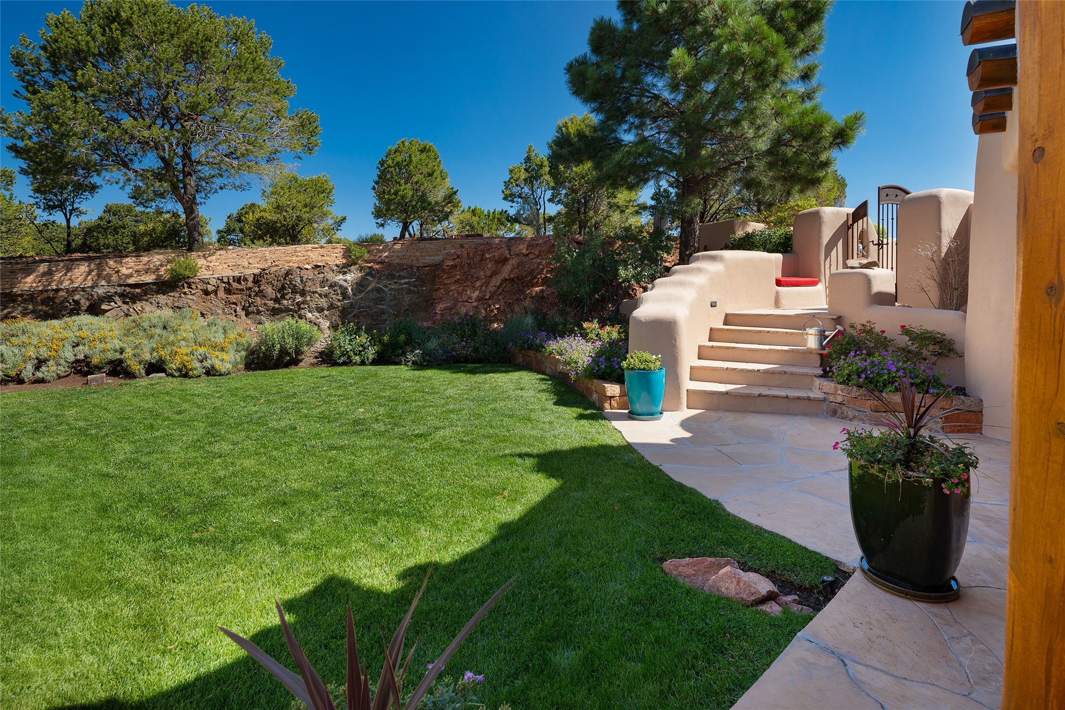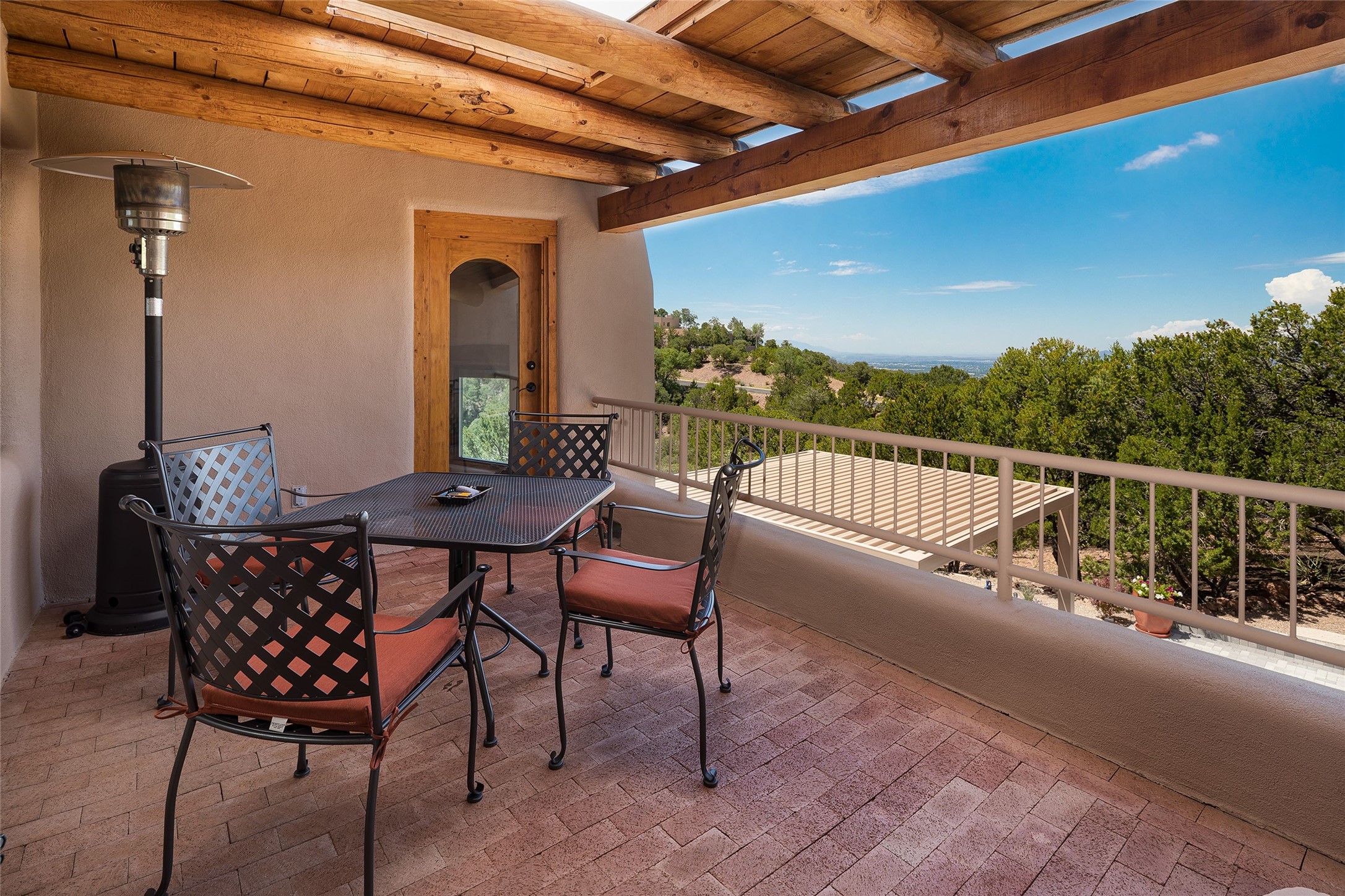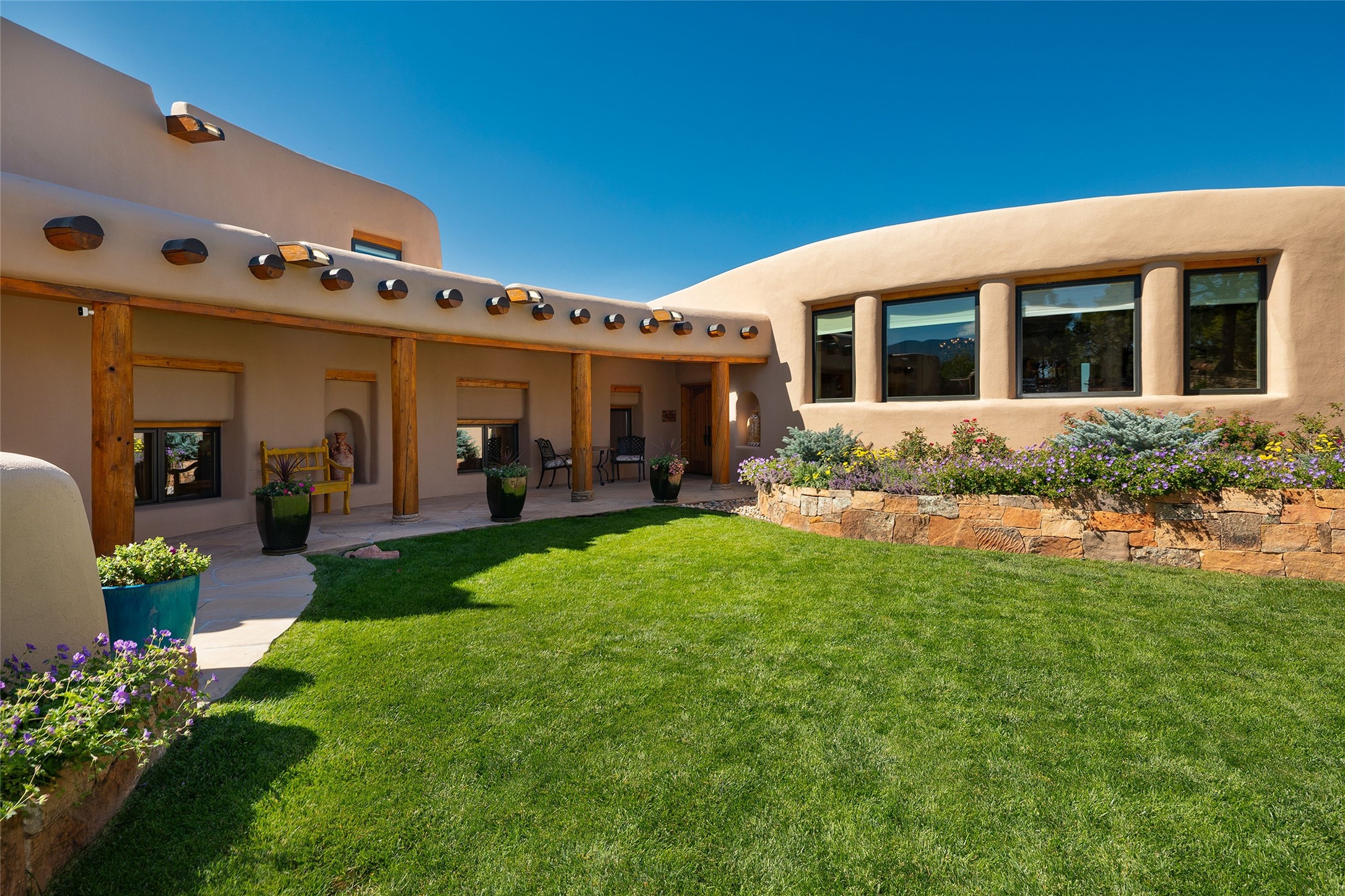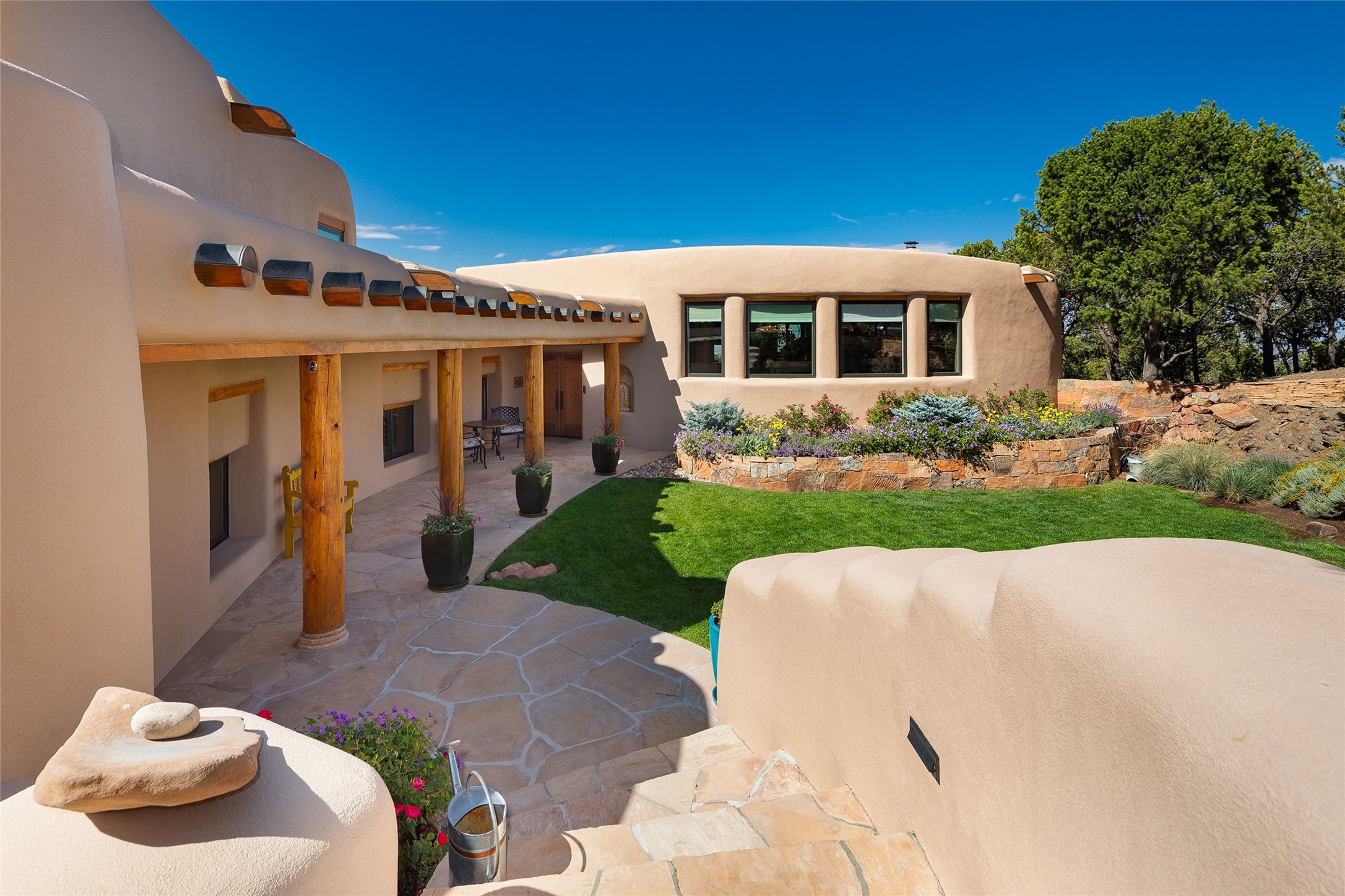 Welcome to 1233 North Summit Drive. One of the most extraordinary homes in all of Santa Fe, this captivating residence stuns with powerful architecture and majestic mountain views, and celebrates the ultimate Santa Fe lifestyle. Located within the coveted, private gates of the Santa Fe Summit, this 7,200 sq. ft. adobe residence is one of architect/builder Mike Fischer's most exceptional works. Built with uncompromising craftsmanship, the home blends timeless Santa Fe style with thoughtful modern updates--showcasing curved plaster walls, viga and beam ceilings, handcrafted fireplaces, and luxury finishes throughout. The main level is designed for entertaining, with spacious living and dining areas, while the upper floor is devoted to a private primary suite, complete with a luxurious bath, sitting room or office, and a rooftop deck that captures sweeping mountain views. Thoughtful updates include a 2018 kitchen renovation and a 2020 spa-like bath remodel, bringing modern elegance to traditional adobe design. The lower level offers excellent guest accommodations, with two bedrooms, two baths, and a large media/game room. A rare 4-car garage adds convenience and storage, while recent upgrades impress, such as new Pella windows, a TPO roof, and newly designed hardscape and lush, vibrant, surrounding landscape.From its perch at one of the highest residential elevations in Santa Fe, the home enjoys awe-inspiring panoramas of the Sangre de Cristo and Jemez ranges, the dramatic north face of Atalaya Mountain, and the north side of Picacho Peak. Multiple view decks and patios maximize the setting, while direct access to the Dale Ball Trail system makes outdoor adventure effortless. Just steps away from the world-class 10,000 Waves resort and spa, and only 3.5 miles from the Plaza, this incredible residence, sited in a tranquil, park-like setting, offers an unmatched blend of mountain living, privacy, and convenience, combined with architectural pedigree and modern upgrades.
