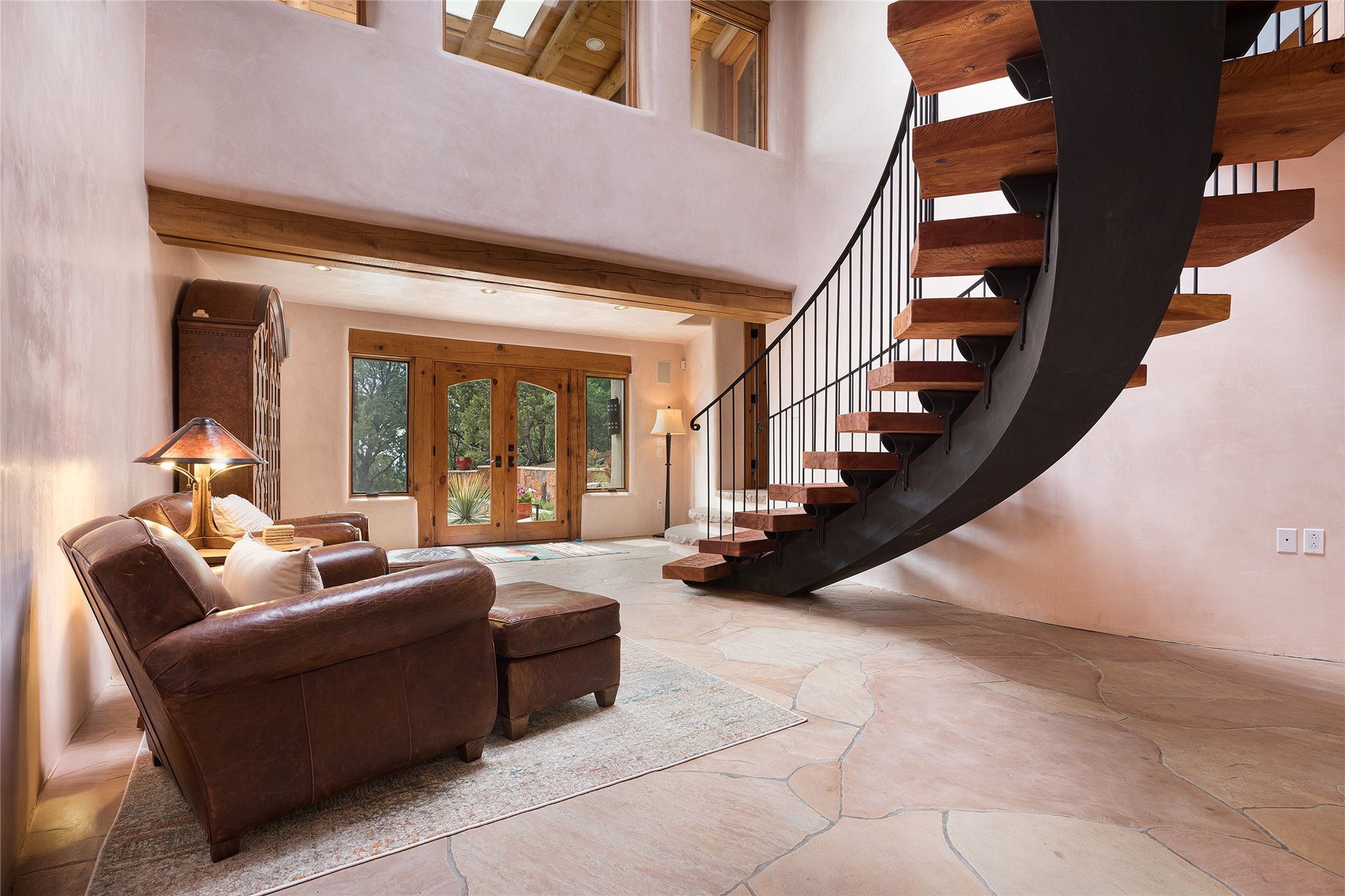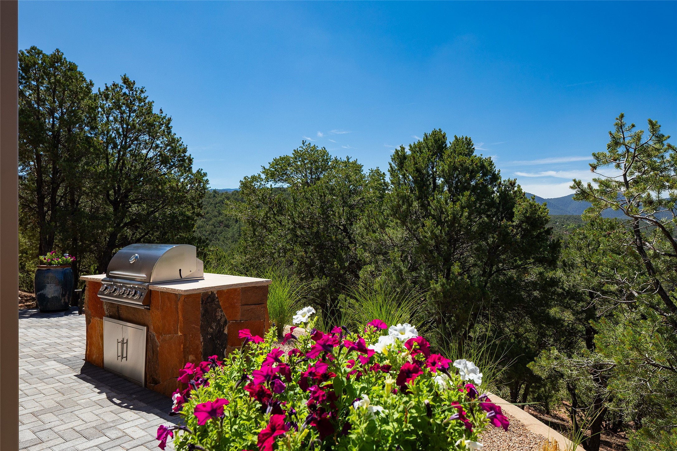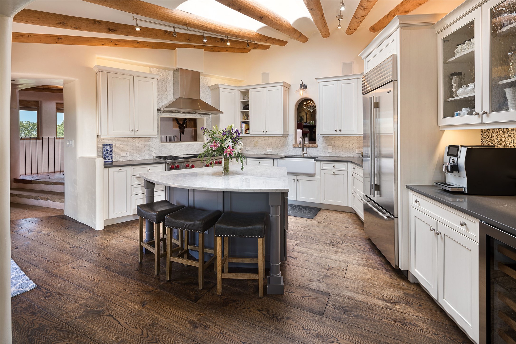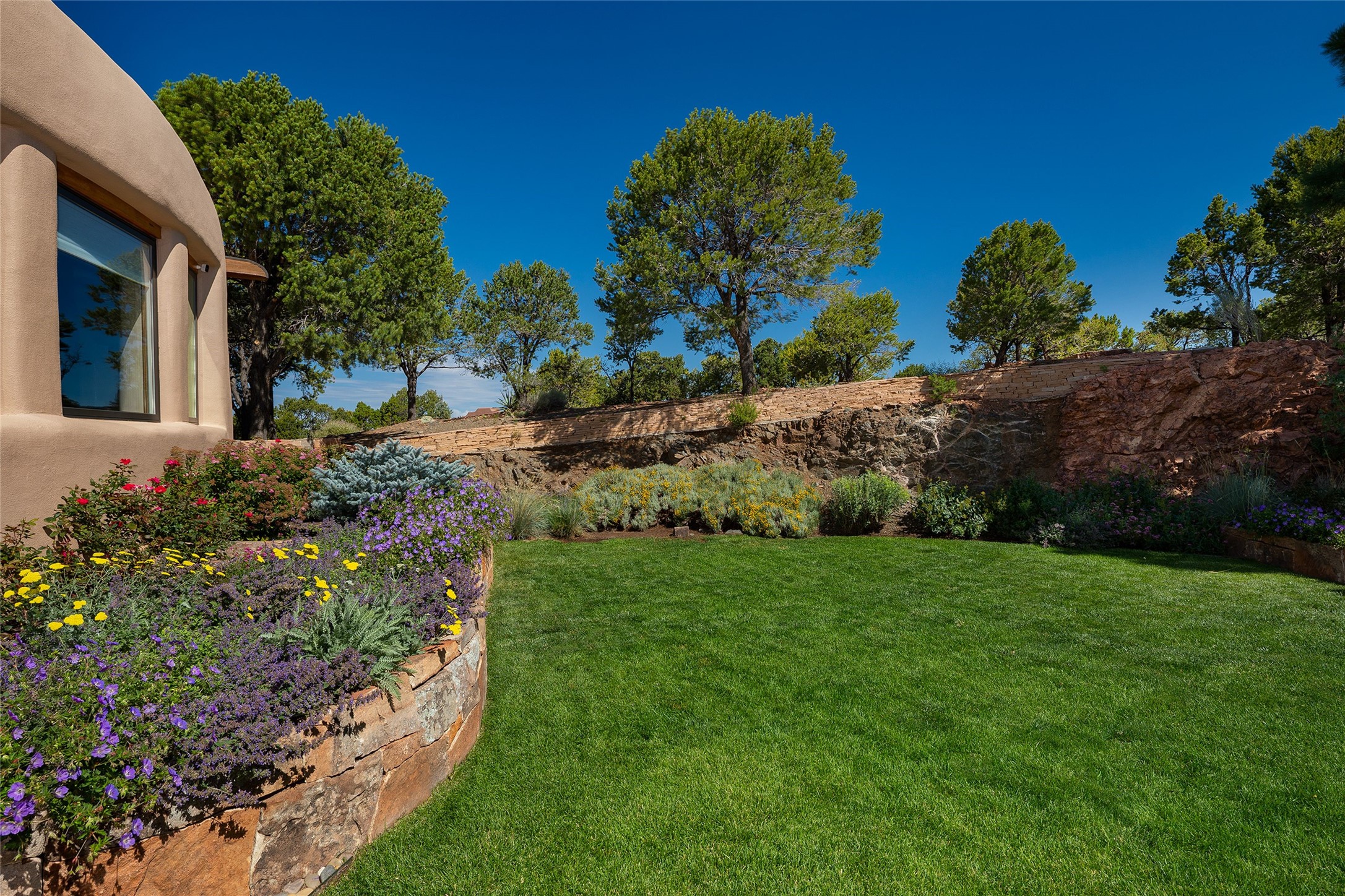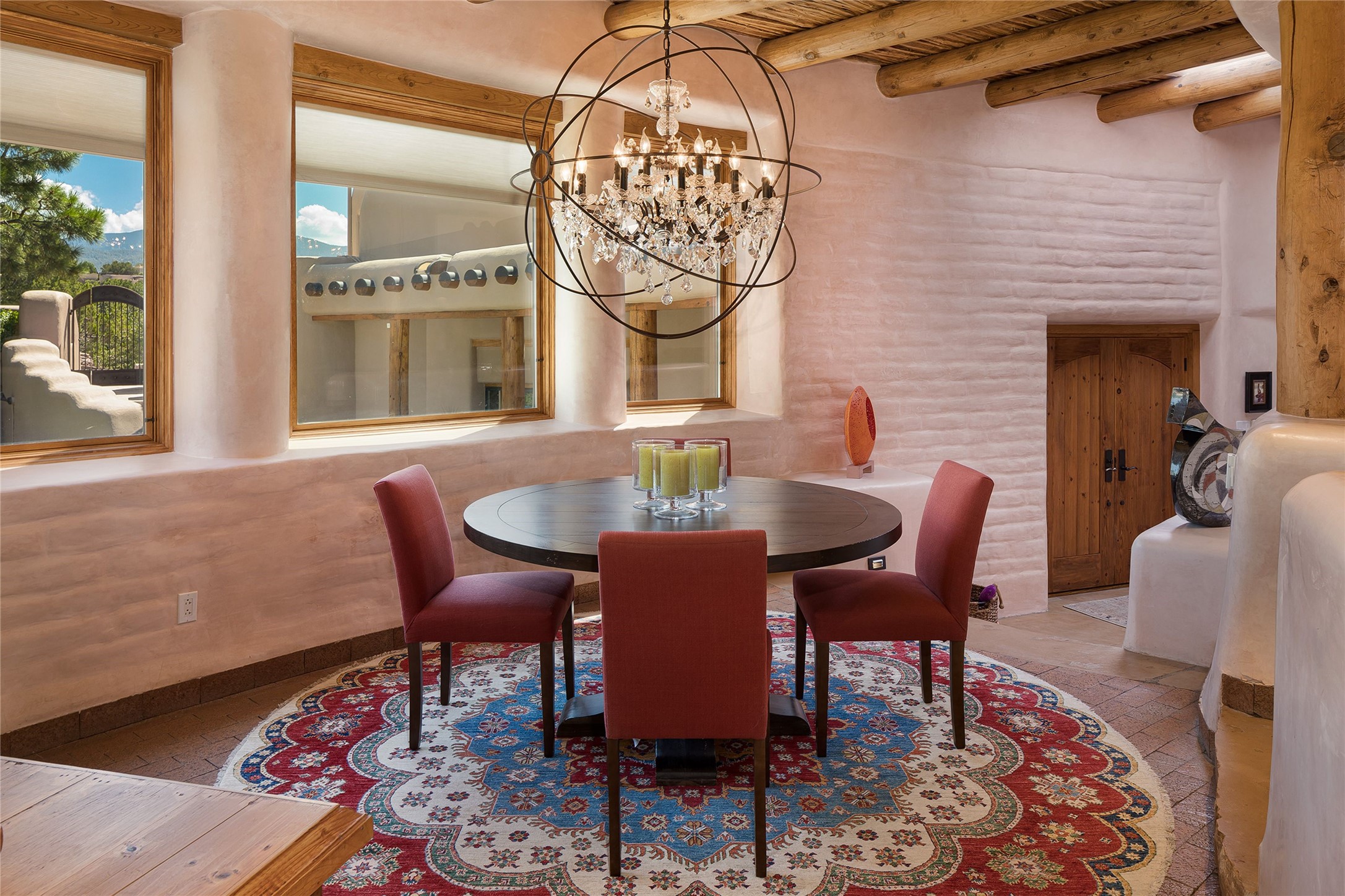 Welcome to 1233 North Summit Drive. One of the most extraordinary homes in all of Santa Fe, this captivating residence stuns with powerful architecture and majestic mountain views, and celebrates the ultimate Santa Fe lifestyle. Located within the coveted, private gates of the Santa Fe Summit, this 7,200 sq. ft. adobe residence is one of architect/builder Mike Fischer's most exceptional works. Built with uncompromising craftsmanship, the home blends timeless Santa Fe style with thoughtful modern updates--showcasing curved plaster walls, viga and beam ceilings, handcrafted fireplaces, and luxury finishes throughout. The main level is designed for entertaining, with spacious living and dining areas, while the upper floor is devoted to a private primary suite, complete with a luxurious bath, sitting room or office, and a rooftop deck that captures sweeping mountain views. Thoughtful updates include a 2018 kitchen renovation and a 2020 spa-like bath remodel, bringing modern elegance to traditional adobe design. The lower level offers excellent guest accommodations, with two bedrooms, two baths, and a large media/game room. A rare 4-car garage adds convenience and storage, while recent upgrades impress, such as new Pella windows, a TPO roof, and newly designed hardscape and lush, vibrant, surrounding landscape.From its perch at one of the highest residential elevations in Santa Fe, the home enjoys awe-inspiring panoramas of the Sangre de Cristo and Jemez ranges, the dramatic north face of Atalaya Mountain, and the north side of Picacho Peak. Multiple view decks and patios maximize the setting, while direct access to the Dale Ball Trail system makes outdoor adventure effortless. Just steps away from the world-class 10,000 Waves resort and spa, and only 3.5 miles from the Plaza, this incredible residence, sited in a tranquil, park-like setting, offers an unmatched blend of mountain living, privacy, and convenience, combined with architectural pedigree and modern upgrades.