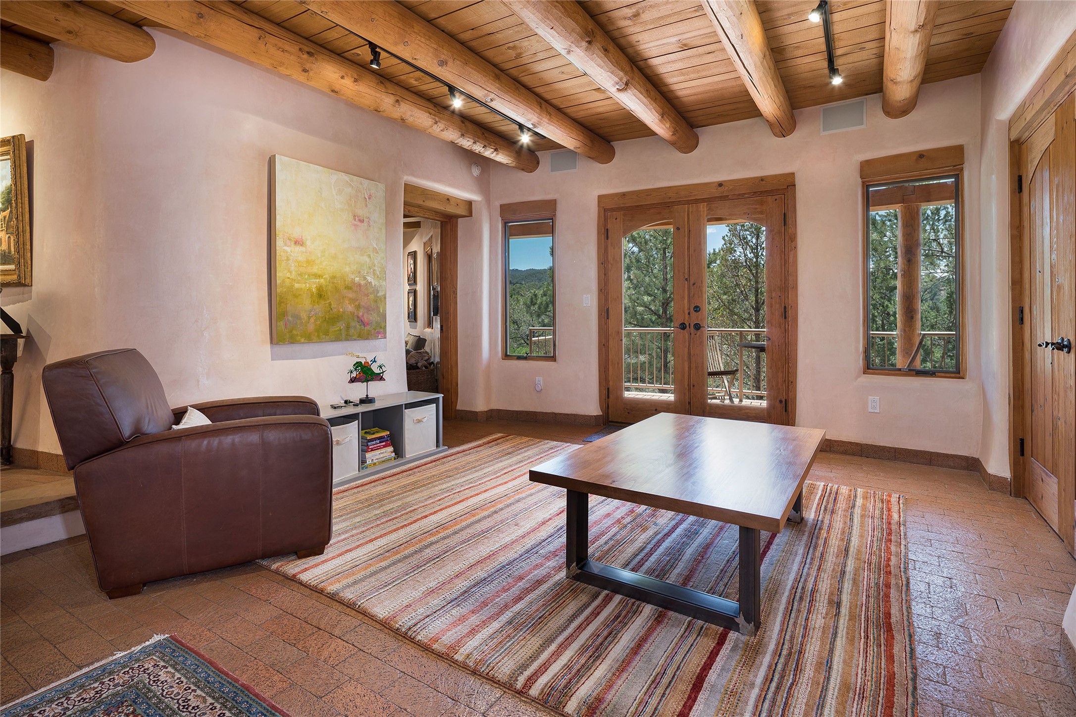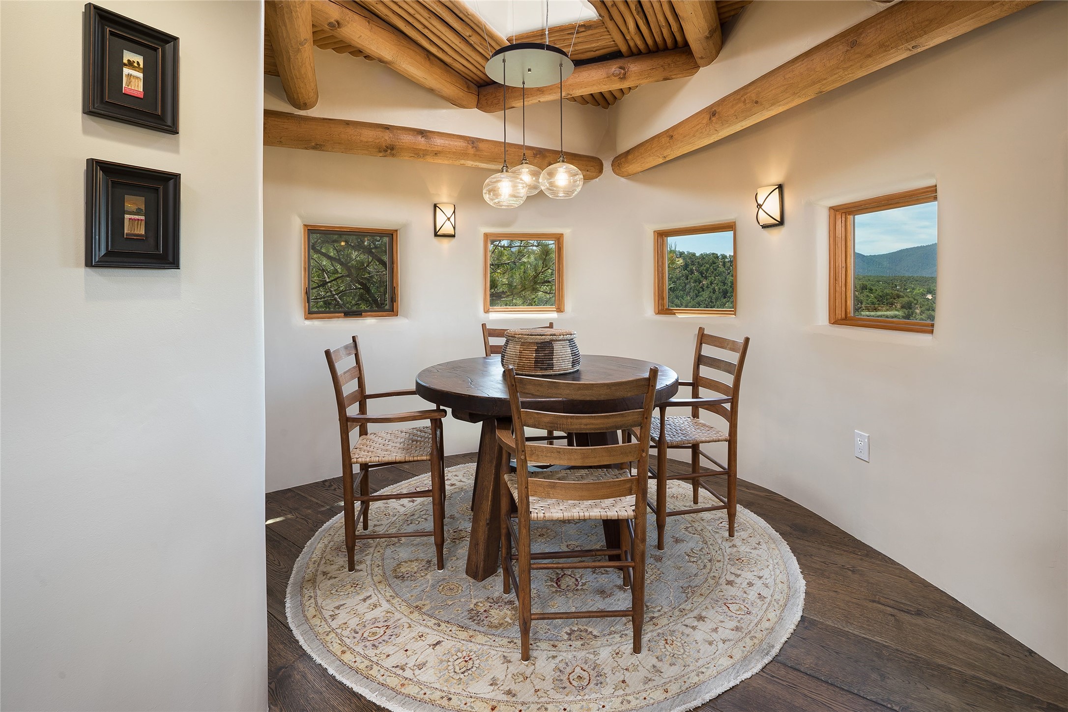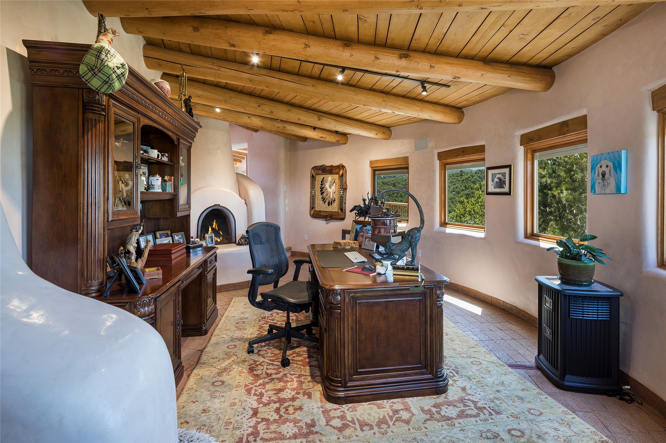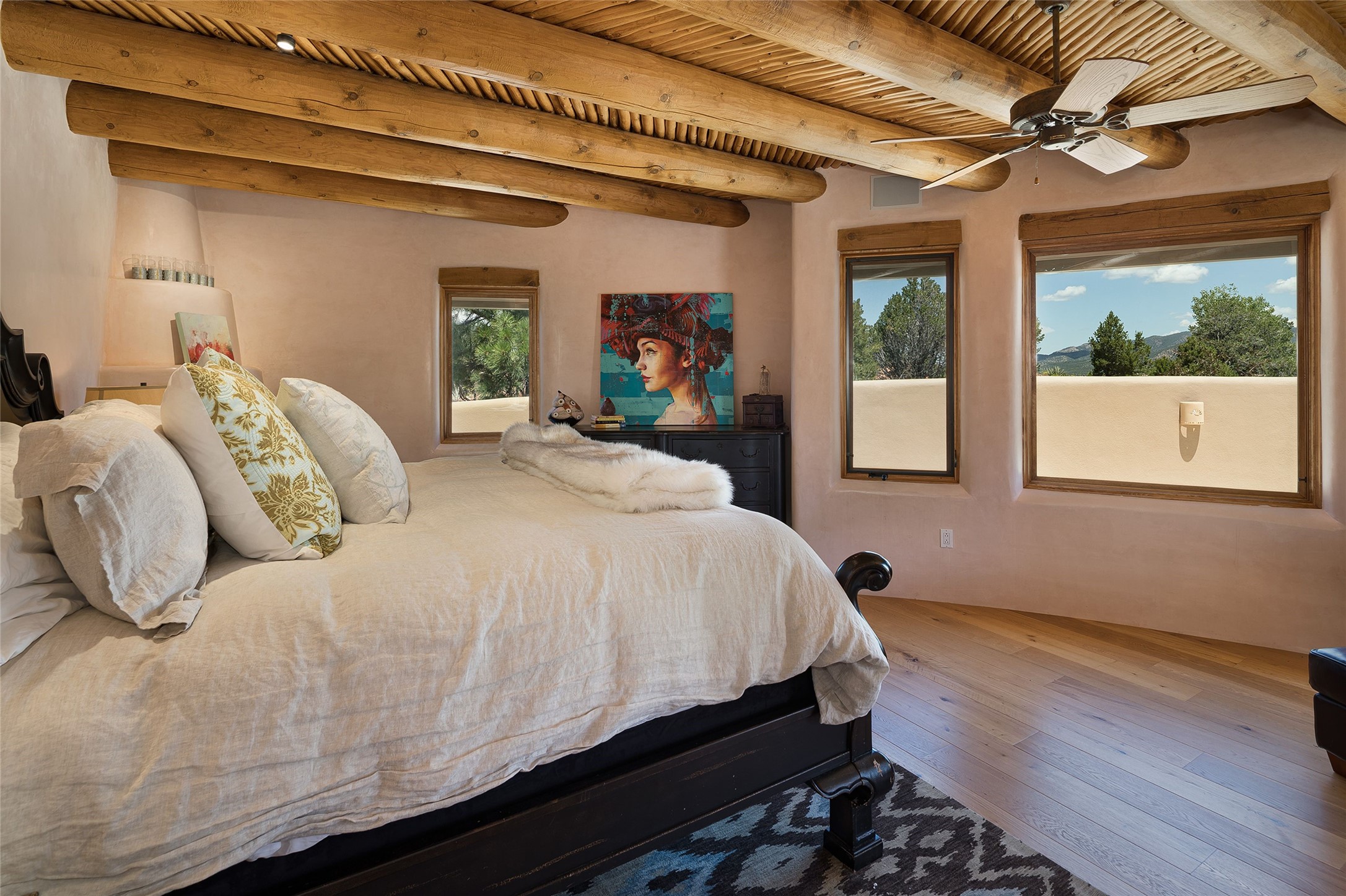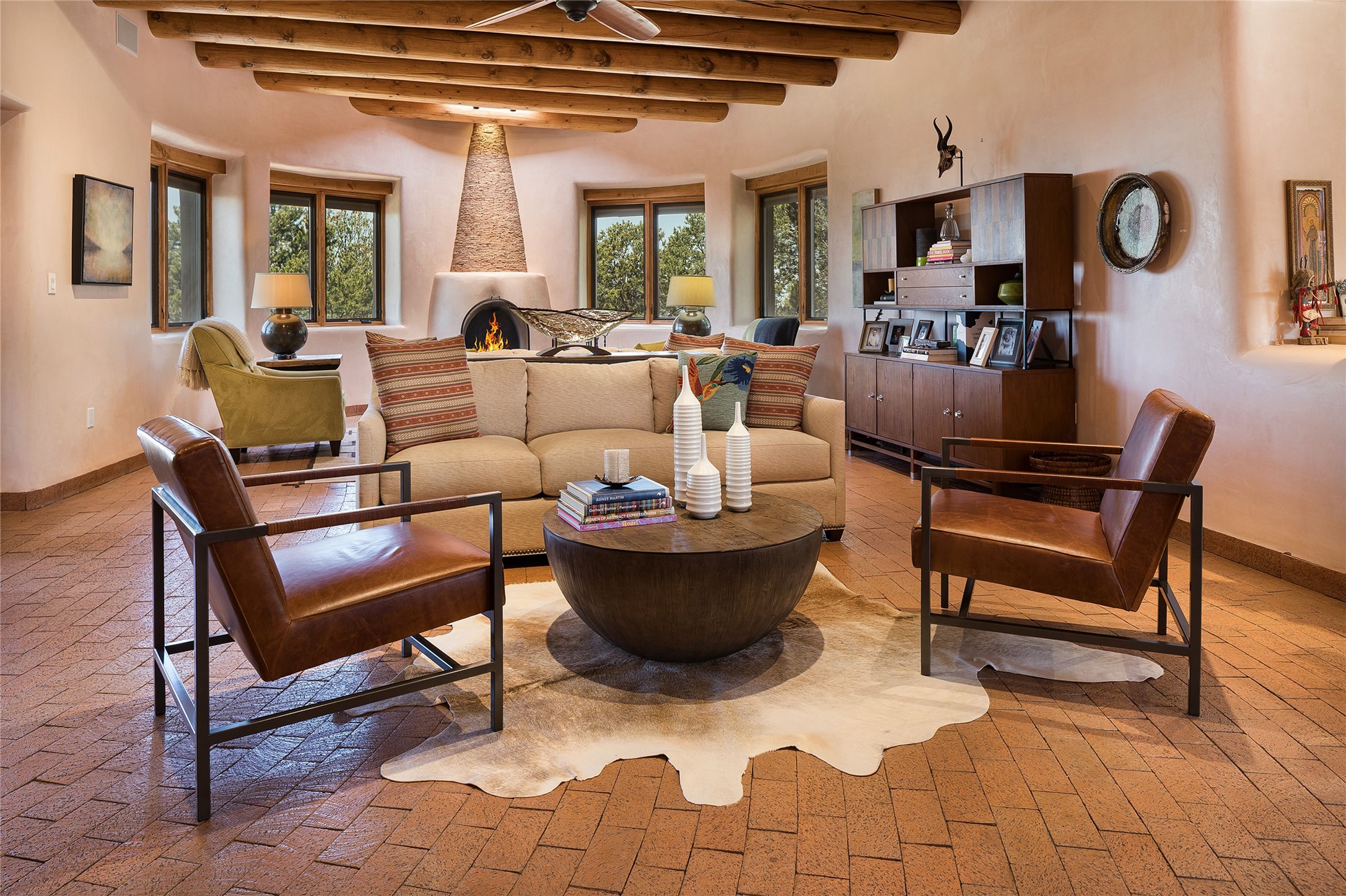 Welcome to 1233 North Summit Drive. One of the most extraordinary homes in all of Santa Fe, this captivating residence stuns with powerful architecture and majestic mountain views, and celebrates the ultimate Santa Fe lifestyle. Located within the coveted, private gates of the Santa Fe Summit, this 7,200 sq. ft. adobe residence is one of architect/builder Mike Fischer's most exceptional works. Built with uncompromising craftsmanship, the home blends timeless Santa Fe style with thoughtful modern updates--showcasing curved plaster walls, viga and beam ceilings, handcrafted fireplaces, and luxury finishes throughout. The main level is designed for entertaining, with spacious living and dining areas, while the upper floor is devoted to a private primary suite, complete with a luxurious bath, sitting room or office, and a rooftop deck that captures sweeping mountain views. Thoughtful updates include a 2018 kitchen renovation and a 2020 spa-like bath remodel, bringing modern elegance to traditional adobe design. The lower level offers excellent guest accommodations, with two bedrooms, two baths, and a large media/game room. A rare 4-car garage adds convenience and storage, while recent upgrades impress, such as new Pella windows, a TPO roof, and newly designed hardscape and lush, vibrant, surrounding landscape.From its perch at one of the highest residential elevations in Santa Fe, the home enjoys awe-inspiring panoramas of the Sangre de Cristo and Jemez ranges, the dramatic north face of Atalaya Mountain, and the north side of Picacho Peak. Multiple view decks and patios maximize the setting, while direct access to the Dale Ball Trail system makes outdoor adventure effortless. Just steps away from the world-class 10,000 Waves resort and spa, and only 3.5 miles from the Plaza, this incredible residence, sited in a tranquil, park-like setting, offers an unmatched blend of mountain living, privacy, and convenience, combined with architectural pedigree and modern upgrades.