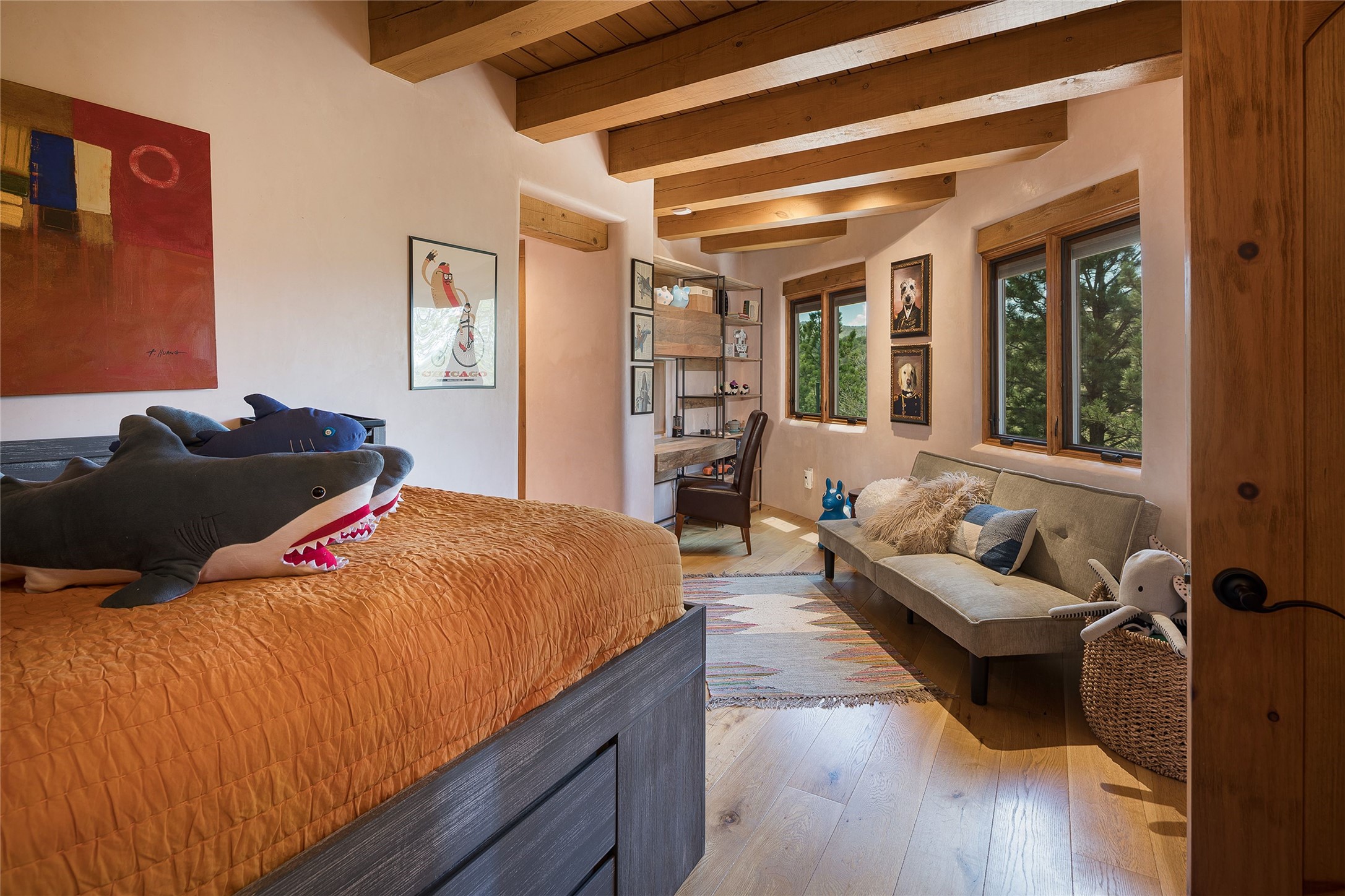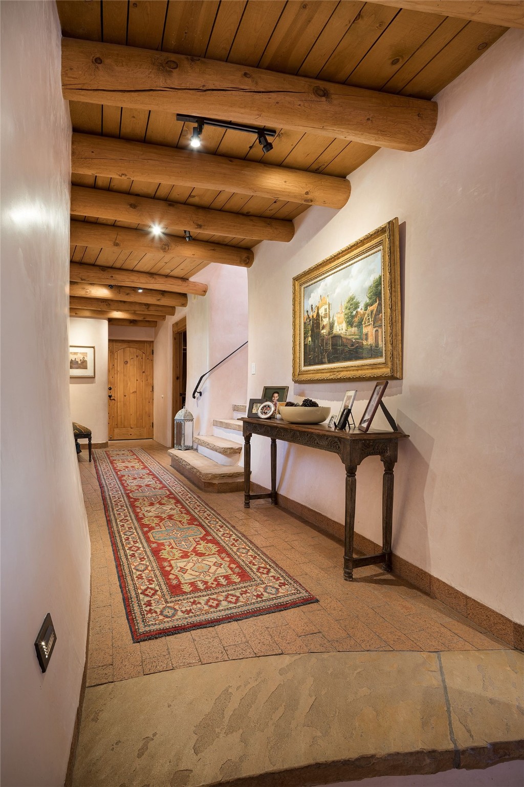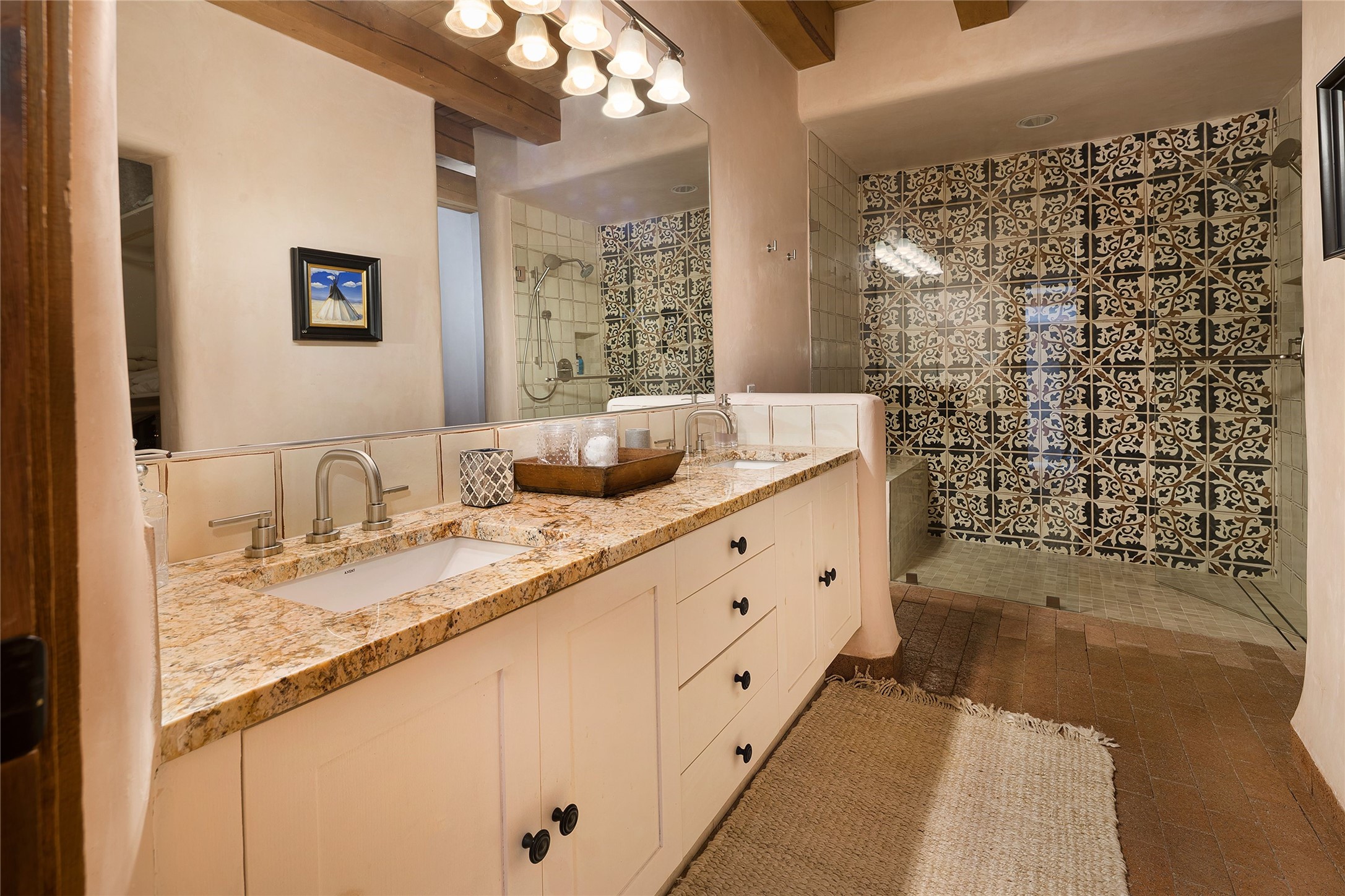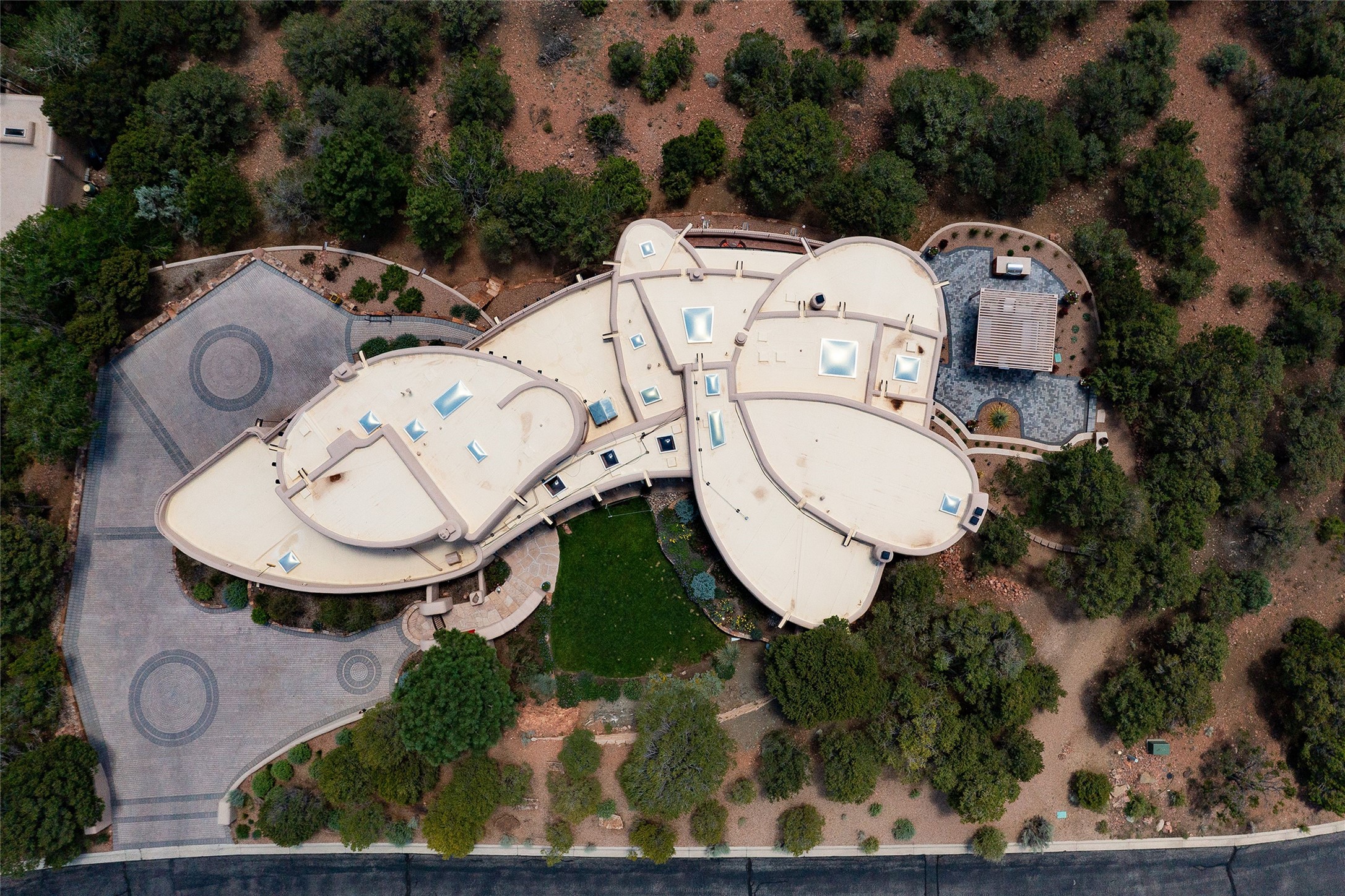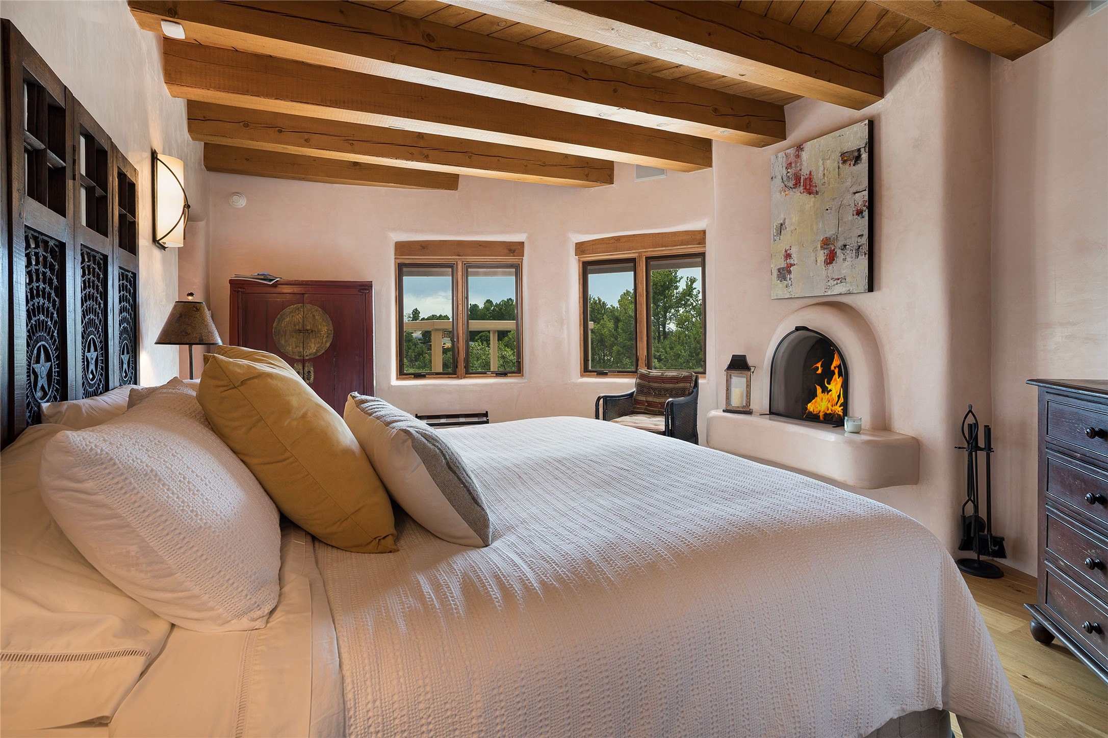 Welcome to 1233 North Summit Drive. One of the most extraordinary homes in all of Santa Fe, this captivating residence stuns with powerful architecture and majestic mountain views, and celebrates the ultimate Santa Fe lifestyle. Located within the coveted, private gates of the Santa Fe Summit, this 7,200 sq. ft. adobe residence is one of architect/builder Mike Fischer's most exceptional works. Built with uncompromising craftsmanship, the home blends timeless Santa Fe style with thoughtful modern updates--showcasing curved plaster walls, viga and beam ceilings, handcrafted fireplaces, and luxury finishes throughout. The main level is designed for entertaining, with spacious living and dining areas, while the upper floor is devoted to a private primary suite, complete with a luxurious bath, sitting room or office, and a rooftop deck that captures sweeping mountain views. Thoughtful updates include a 2018 kitchen renovation and a 2020 spa-like bath remodel, bringing modern elegance to traditional adobe design. The lower level offers excellent guest accommodations, with two bedrooms, two baths, and a large media/game room. A rare 4-car garage adds convenience and storage, while recent upgrades impress, such as new Pella windows, a TPO roof, and newly designed hardscape and lush, vibrant, surrounding landscape.From its perch at one of the highest residential elevations in Santa Fe, the home enjoys awe-inspiring panoramas of the Sangre de Cristo and Jemez ranges, the dramatic north face of Atalaya Mountain, and the north side of Picacho Peak. Multiple view decks and patios maximize the setting, while direct access to the Dale Ball Trail system makes outdoor adventure effortless. Just steps away from the world-class 10,000 Waves resort and spa, and only 3.5 miles from the Plaza, this incredible residence, sited in a tranquil, park-like setting, offers an unmatched blend of mountain living, privacy, and convenience, combined with architectural pedigree and modern upgrades.