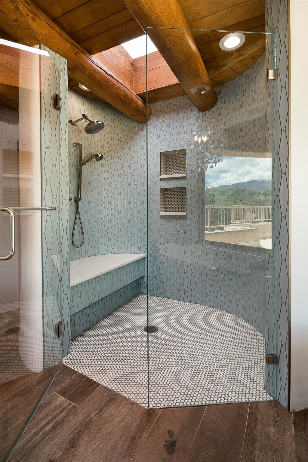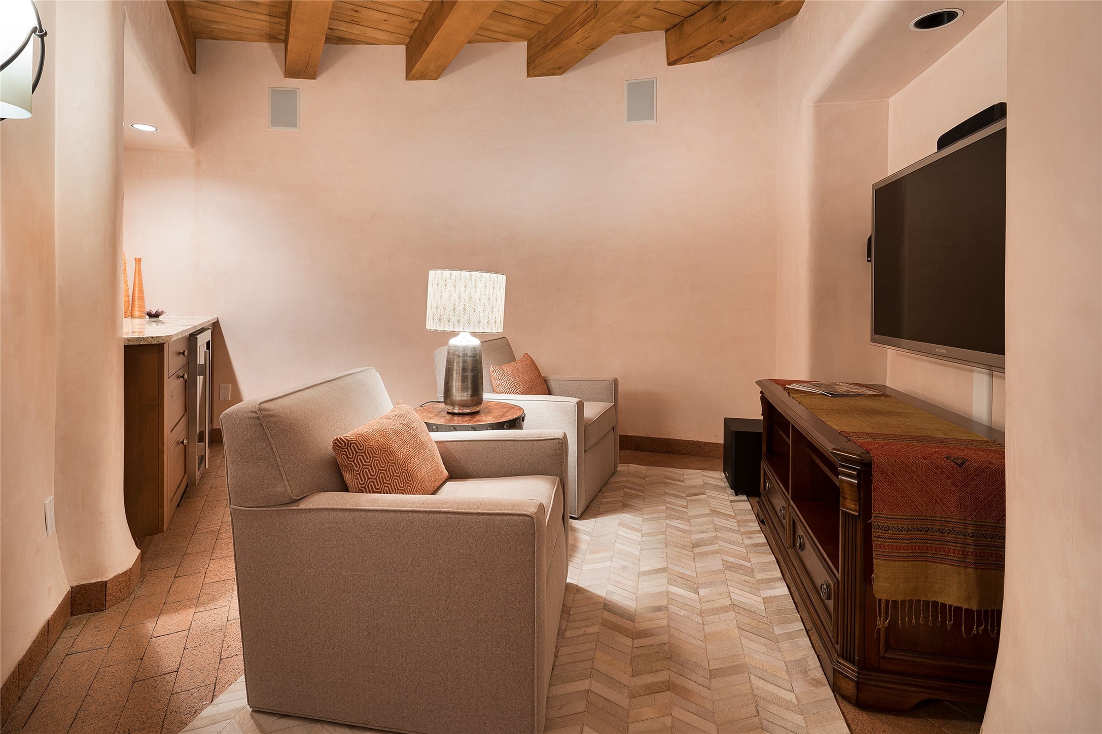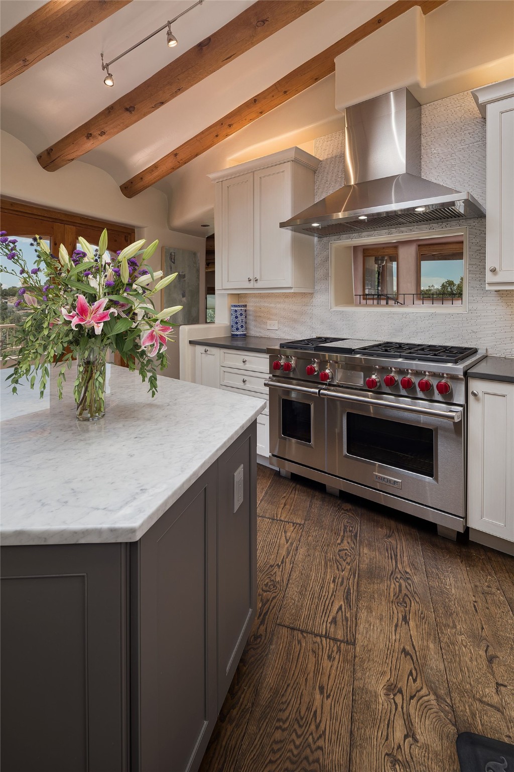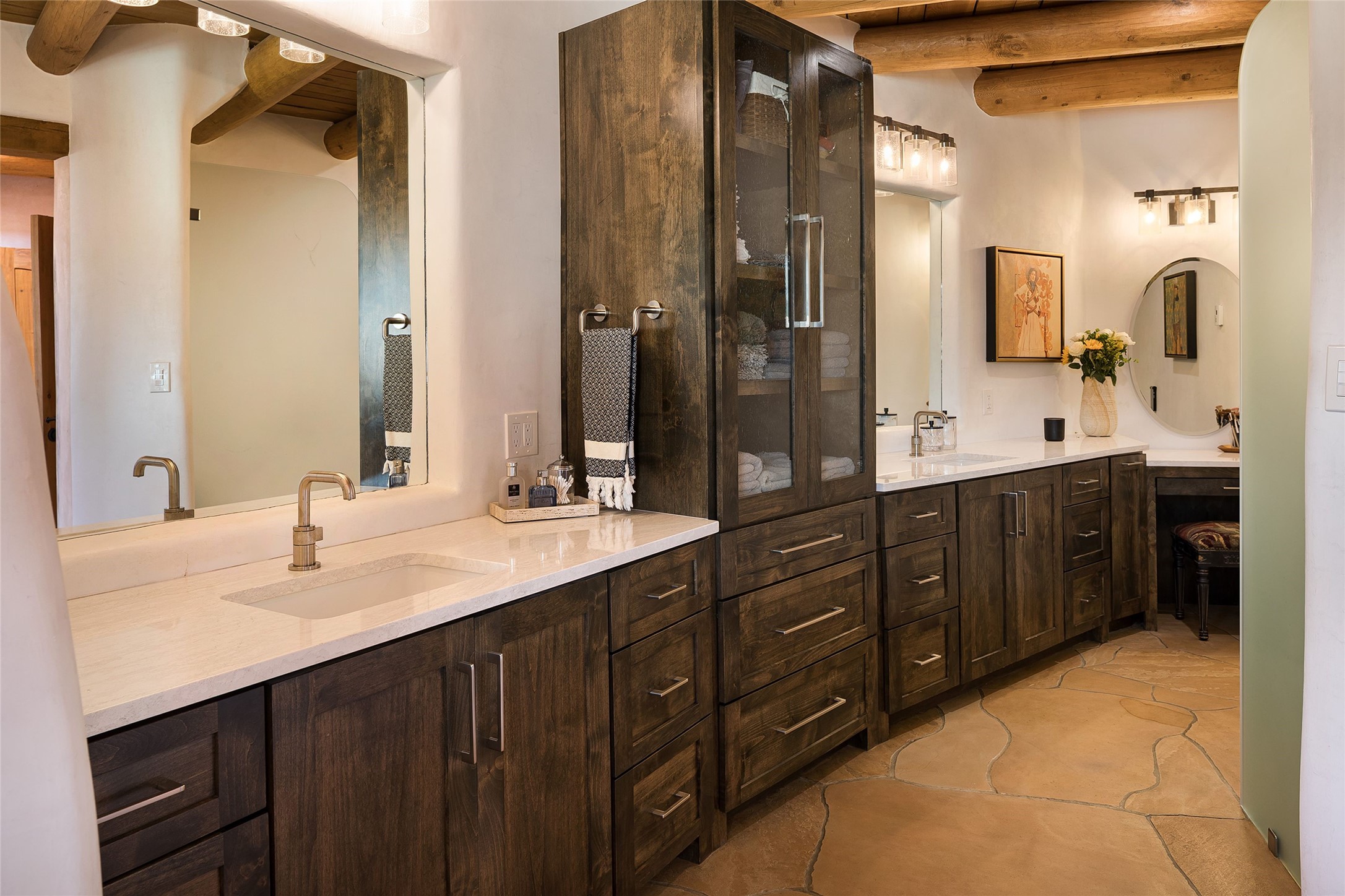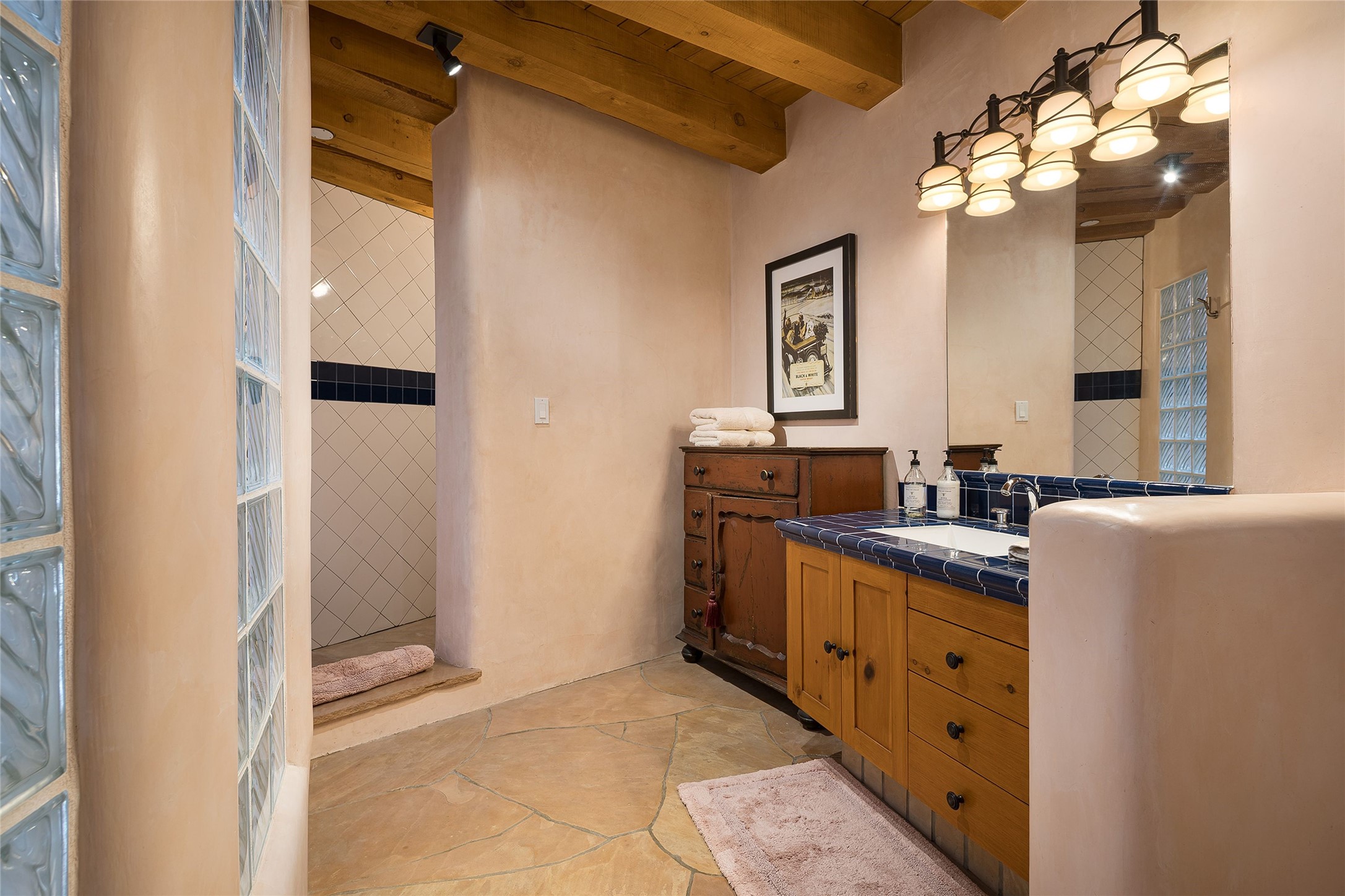 Welcome to 1233 North Summit Drive. One of the most extraordinary homes in all of Santa Fe, this captivating residence stuns with powerful architecture and majestic mountain views, and celebrates the ultimate Santa Fe lifestyle. Located within the coveted, private gates of the Santa Fe Summit, this 7,200 sq. ft. adobe residence is one of architect/builder Mike Fischer's most exceptional works. Built with uncompromising craftsmanship, the home blends timeless Santa Fe style with thoughtful modern updates--showcasing curved plaster walls, viga and beam ceilings, handcrafted fireplaces, and luxury finishes throughout. The main level is designed for entertaining, with spacious living and dining areas, while the upper floor is devoted to a private primary suite, complete with a luxurious bath, sitting room or office, and a rooftop deck that captures sweeping mountain views. Thoughtful updates include a 2018 kitchen renovation and a 2020 spa-like bath remodel, bringing modern elegance to traditional adobe design. The lower level offers excellent guest accommodations, with two bedrooms, two baths, and a large media/game room. A rare 4-car garage adds convenience and storage, while recent upgrades impress, such as new Pella windows, a TPO roof, and newly designed hardscape and lush, vibrant, surrounding landscape.From its perch at one of the highest residential elevations in Santa Fe, the home enjoys awe-inspiring panoramas of the Sangre de Cristo and Jemez ranges, the dramatic north face of Atalaya Mountain, and the north side of Picacho Peak. Multiple view decks and patios maximize the setting, while direct access to the Dale Ball Trail system makes outdoor adventure effortless. Just steps away from the world-class 10,000 Waves resort and spa, and only 3.5 miles from the Plaza, this incredible residence, sited in a tranquil, park-like setting, offers an unmatched blend of mountain living, privacy, and convenience, combined with architectural pedigree and modern upgrades.