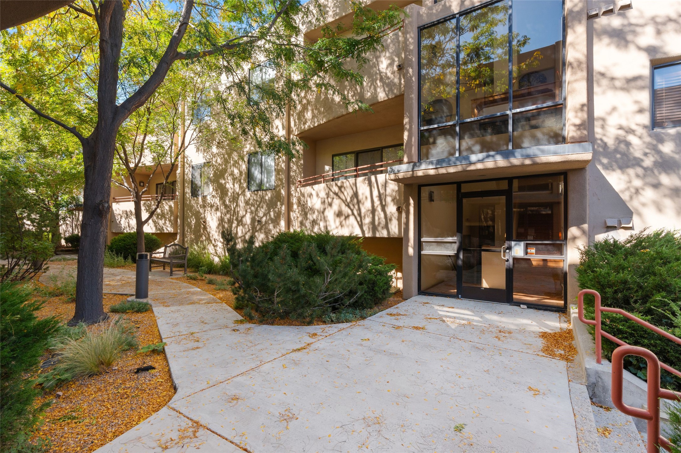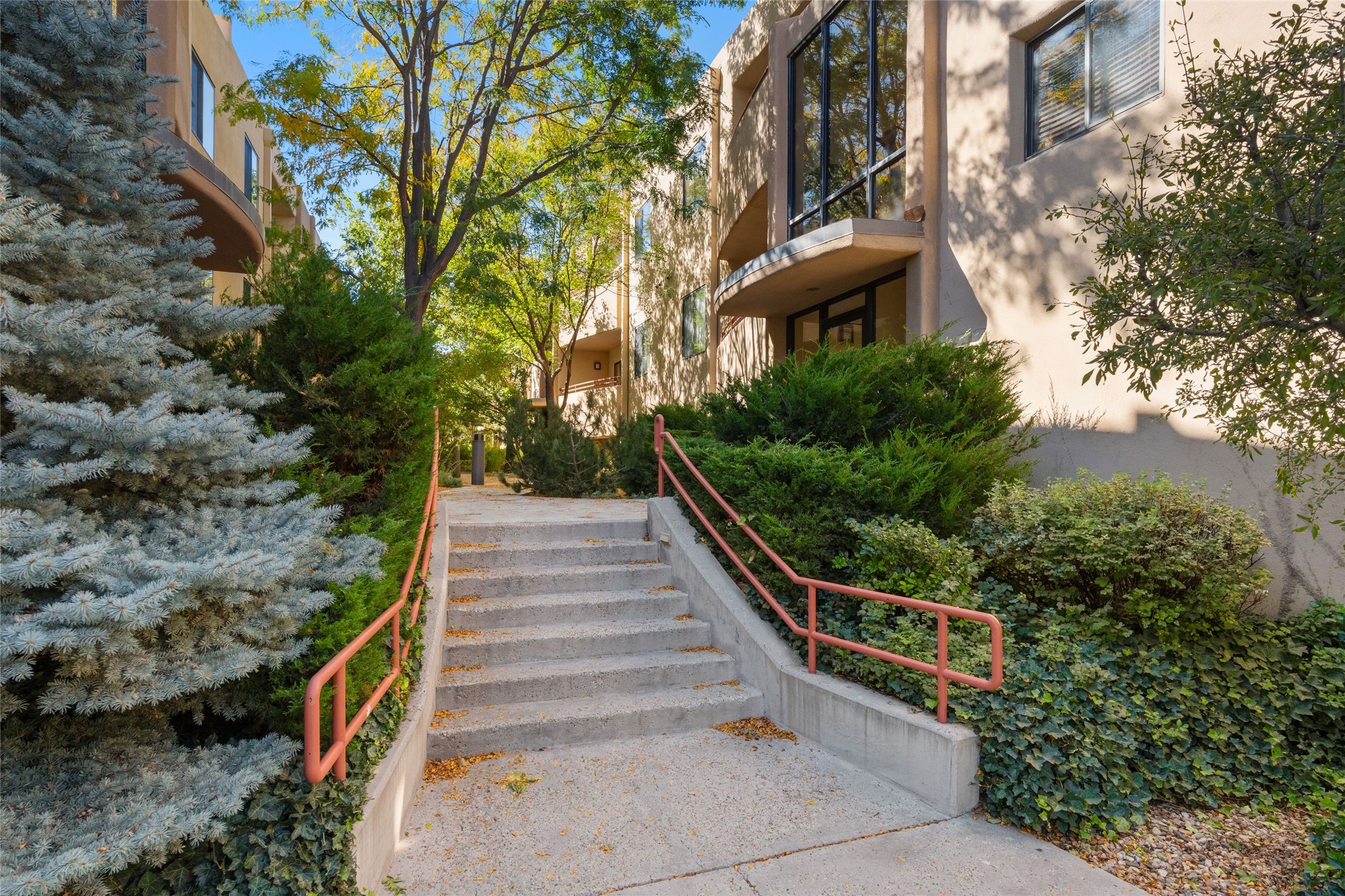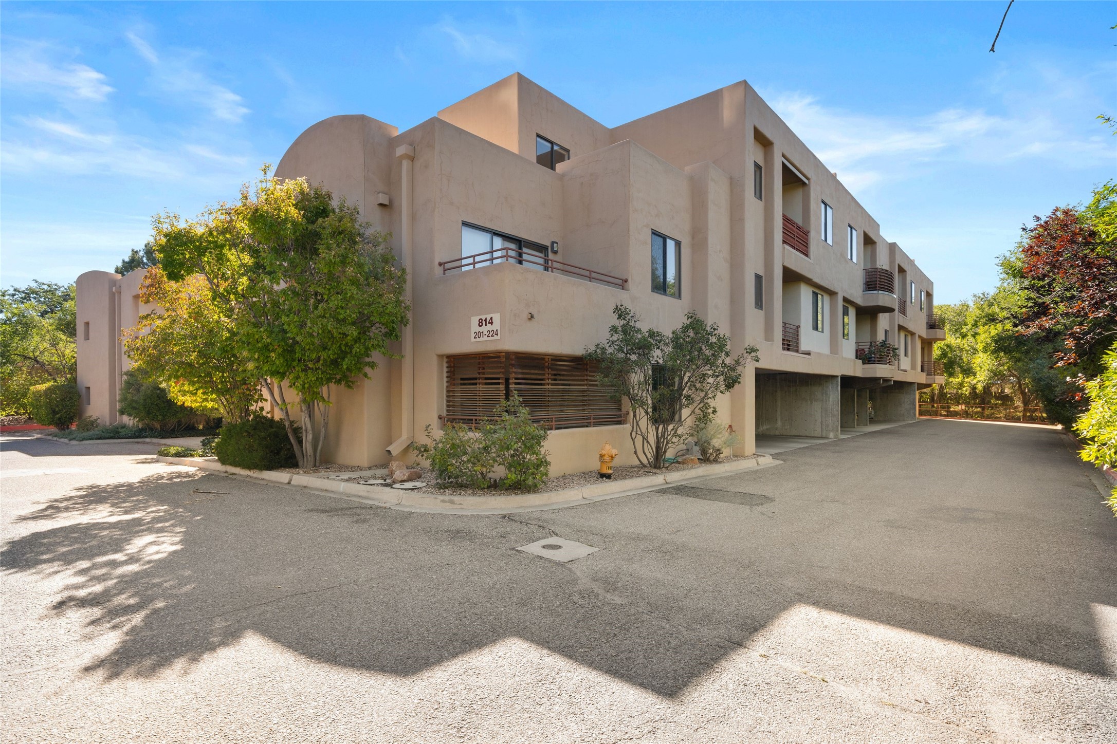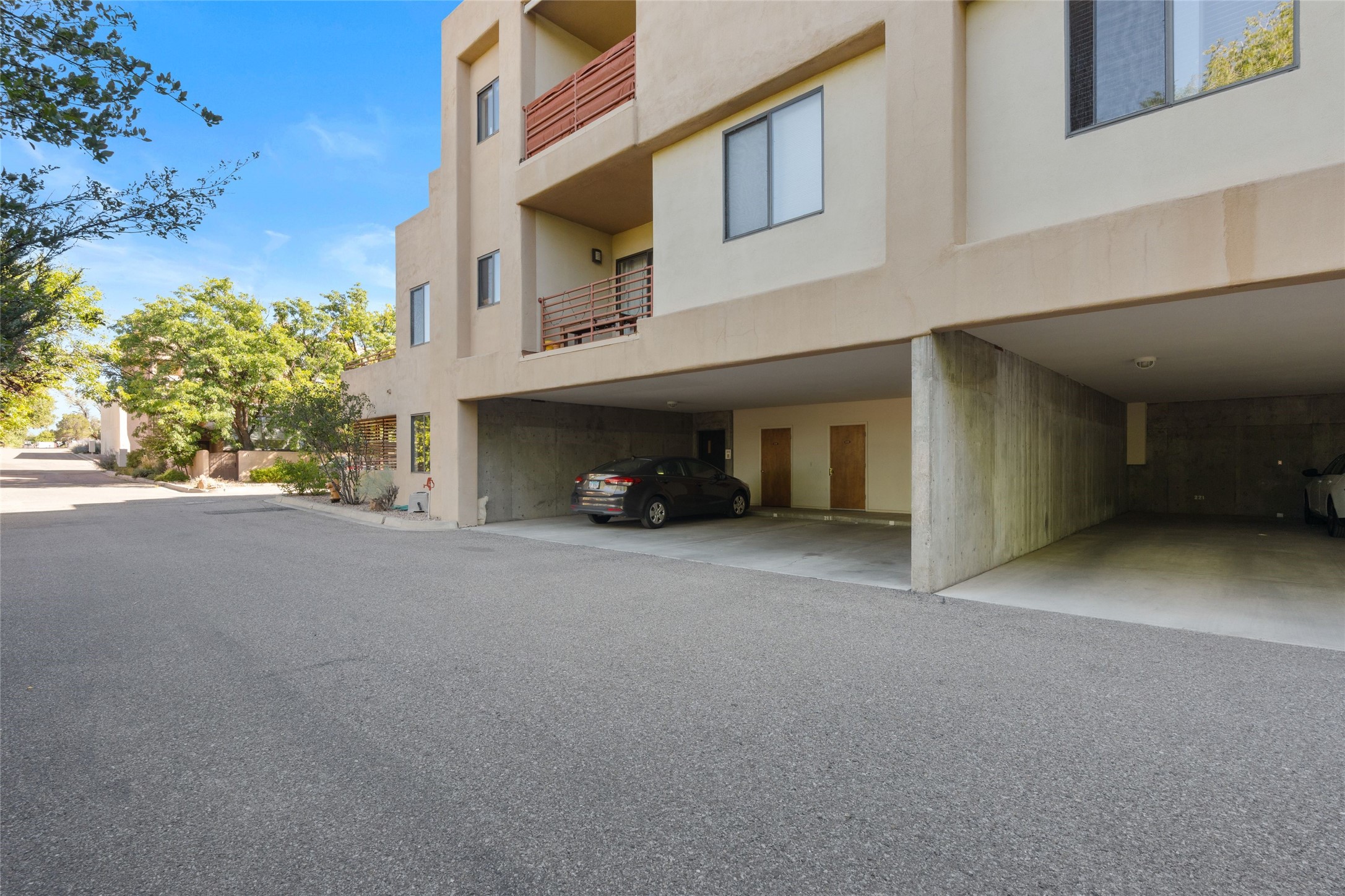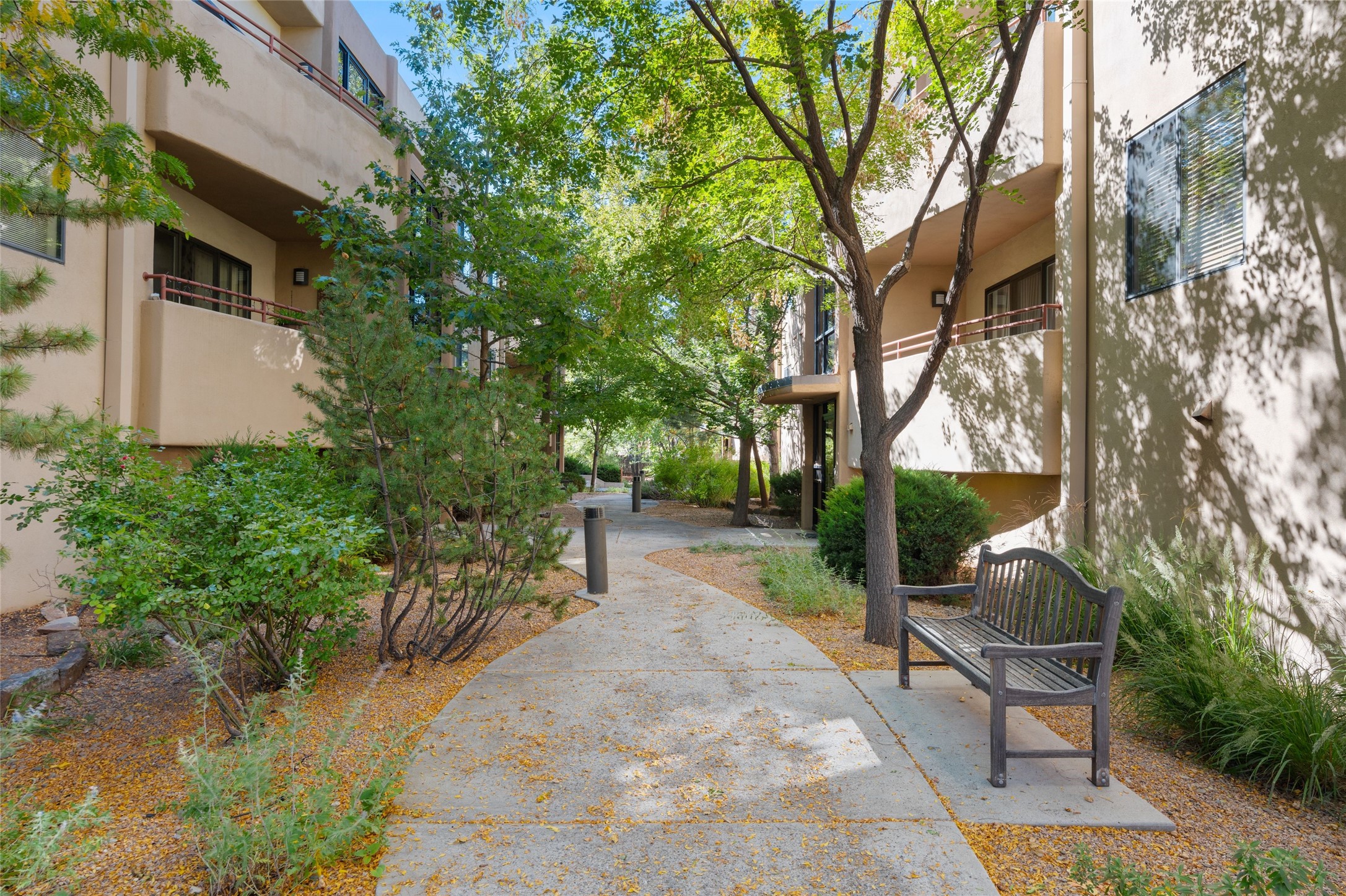 Classic urban oasis surrounded by mature trees, La Remuda Condominium is located on the edge of Midtown where you can walk to relaxed eateries featuring global cuisine and local flair. Not far from theRailyard, quick stops to Trader Joe's and Whole Foods. The central location is convenientfor a fast commute to Los Alamos or I-25. This bright and airy condo features an open floor plan with sliding glass doors at each end of the living/dining rooms with access to the 2 balconies. The kitchen is well designed, with exceptional storage, high quality stainless steel appliances, butcher block on one side of the counter and Italian tile on the other. Other features include: central air conditioning and heating installed in 2023, 9 foot ceilings, beautiful bamboo floors, custom drapes, custom dividedclosets, custom cabinets in living room and office, private storage: 5.5' x 17', Asko washer and dryer, whole house water filtration system installed in 2025, 2 under cover designated parking spots with direct entrance to the secure building, upper floor unit with no interior steps, new roof in 2024 and refreshed stucco in 2025. One of the two only units at La Remuda with 3 bedrooms. Included are two covered tandem parking spaces and a spacious storage unit. This condo is on the second floor and stairs are required to access it.