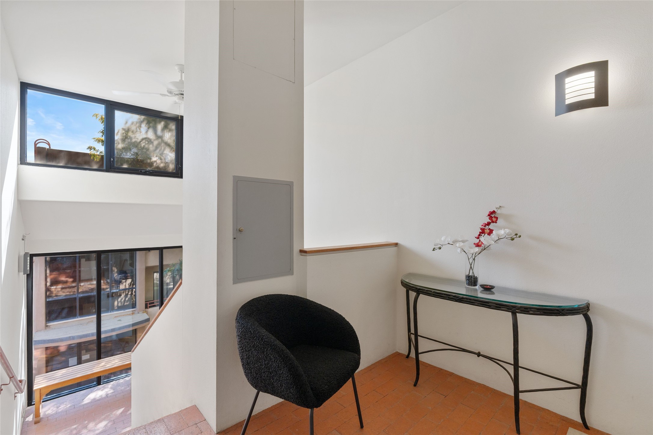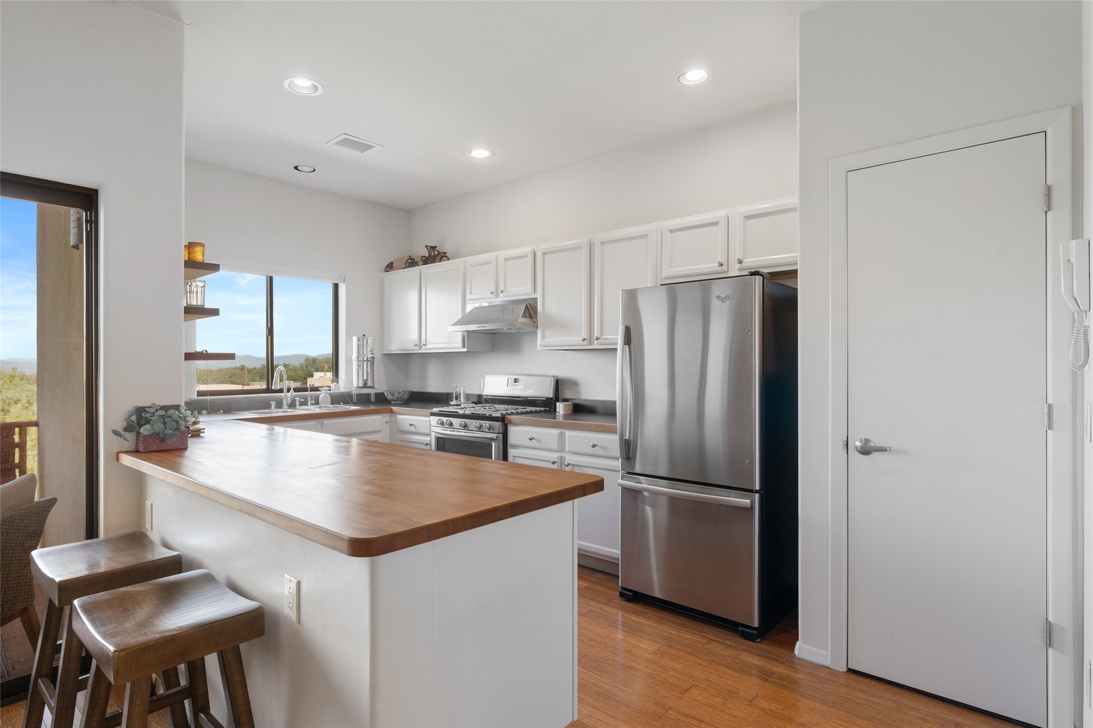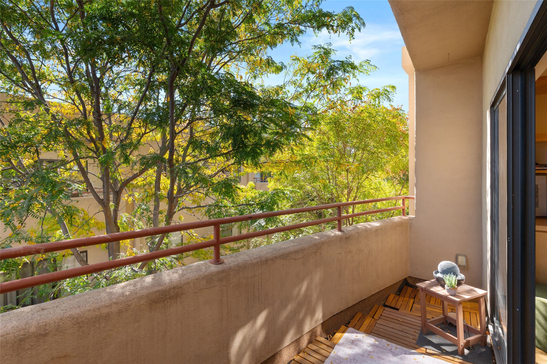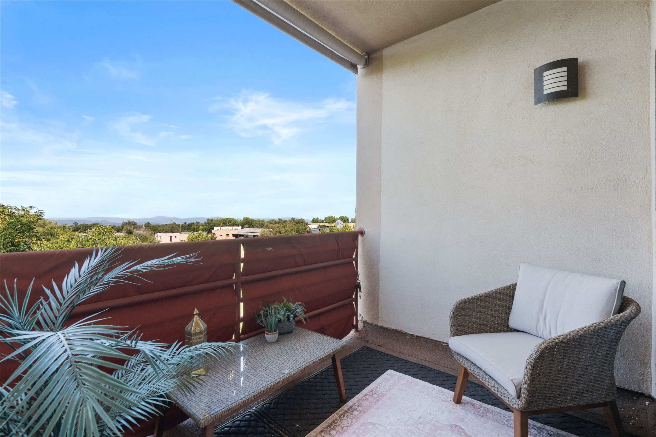 Classic urban oasis surrounded by mature trees, La Remuda Condominium is located on the edge of Midtown where you can walk to relaxed eateries featuring global cuisine and local flair. Not far from theRailyard, quick stops to Trader Joe's and Whole Foods. The central location is convenientfor a fast commute to Los Alamos or I-25. This bright and airy condo features an open floor plan with sliding glass doors at each end of the living/dining rooms with access to the 2 balconies. The kitchen is well designed, with exceptional storage, high quality stainless steel appliances, butcher block on one side of the counter and Italian tile on the other. Other features include: central air conditioning and heating installed in 2023, 9 foot ceilings, beautiful bamboo floors, custom drapes, custom dividedclosets, custom cabinets in living room and office, private storage: 5.5' x 17', Asko washer and dryer, whole house water filtration system installed in 2025, 2 under cover designated parking spots with direct entrance to the secure building, upper floor unit with no interior steps, new roof in 2024 and refreshed stucco in 2025. One of the two only units at La Remuda with 3 bedrooms. Included are two covered tandem parking spaces and a spacious storage unit. This condo is on the second floor and stairs are required to access it.