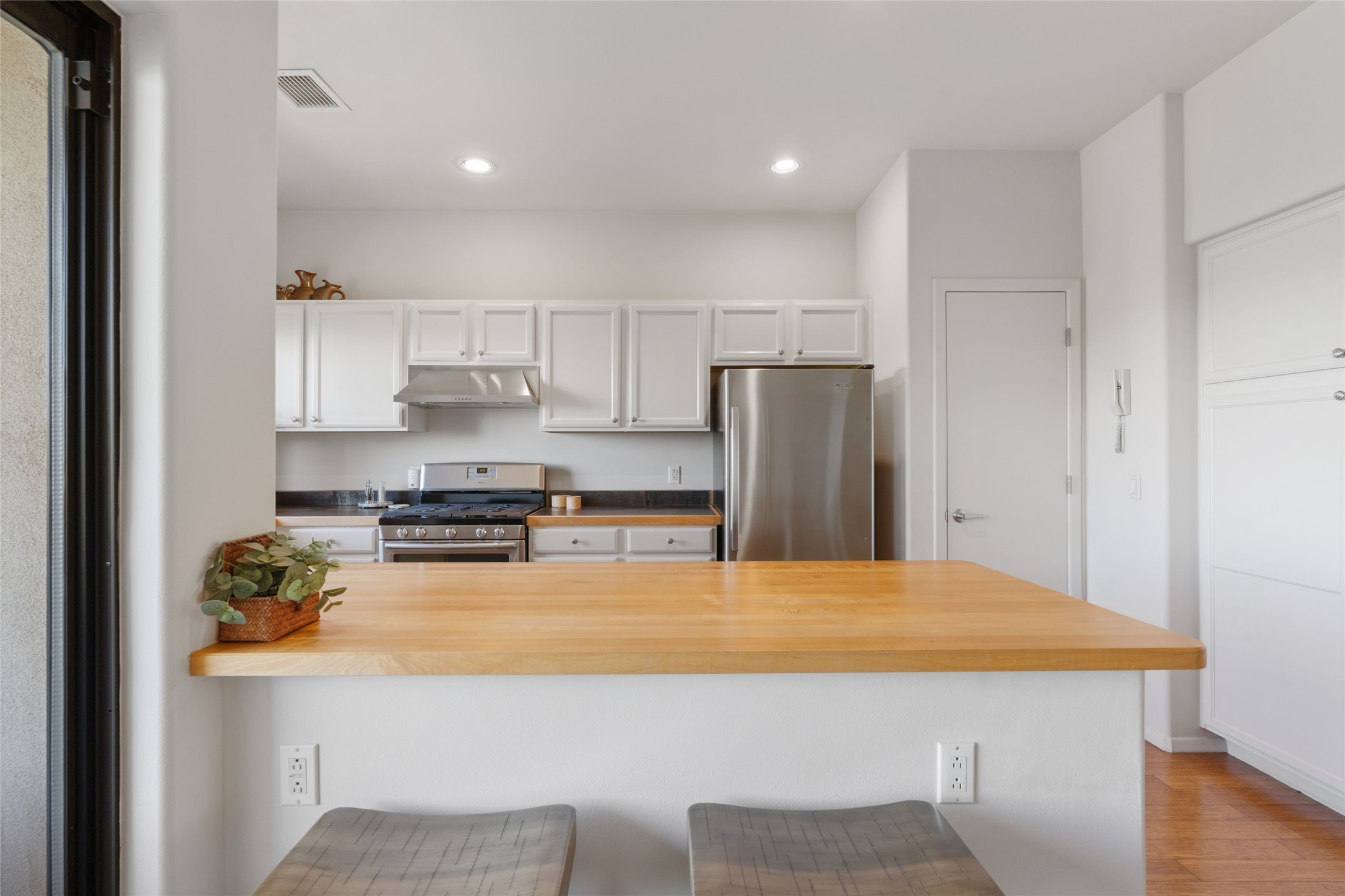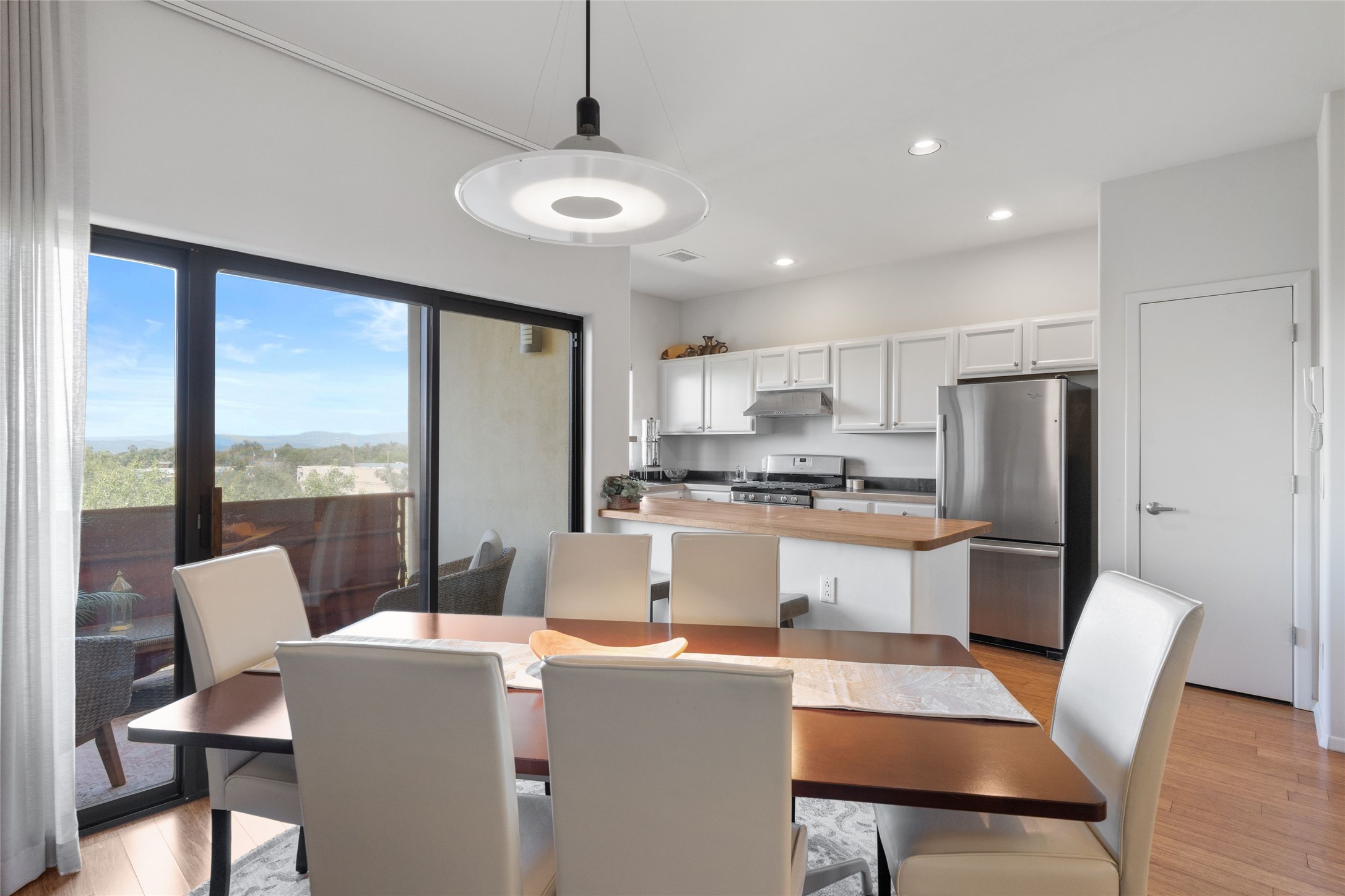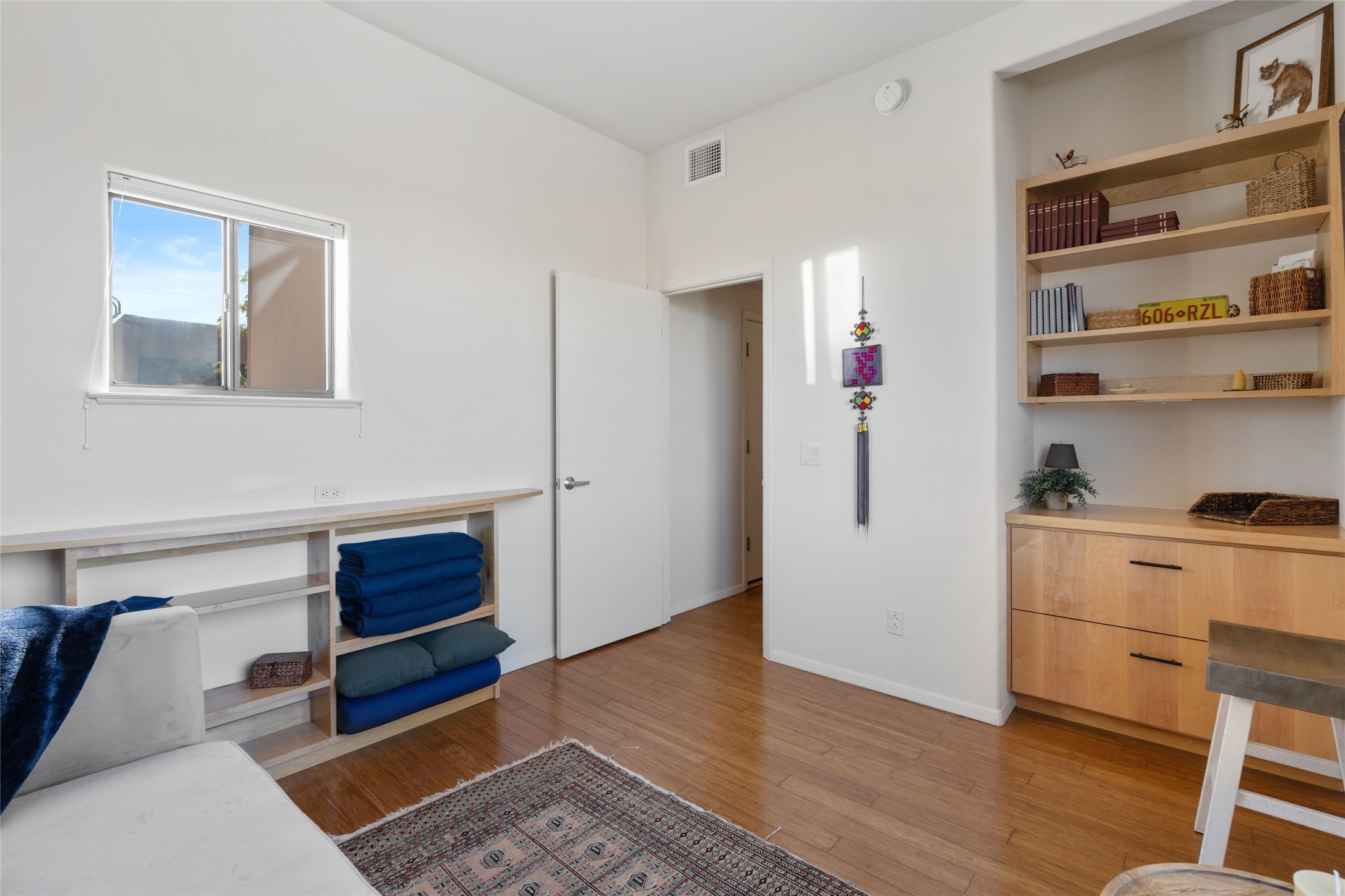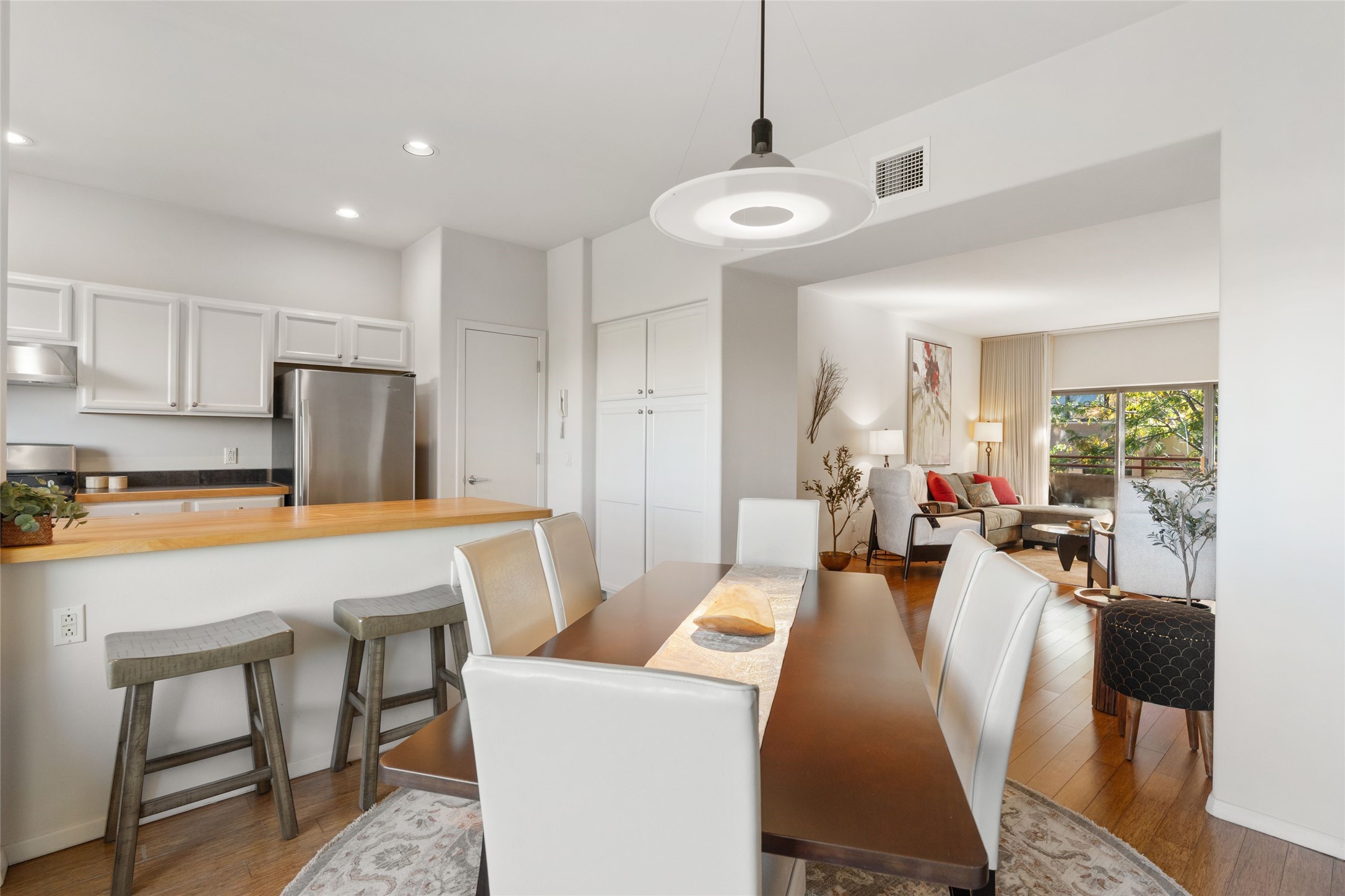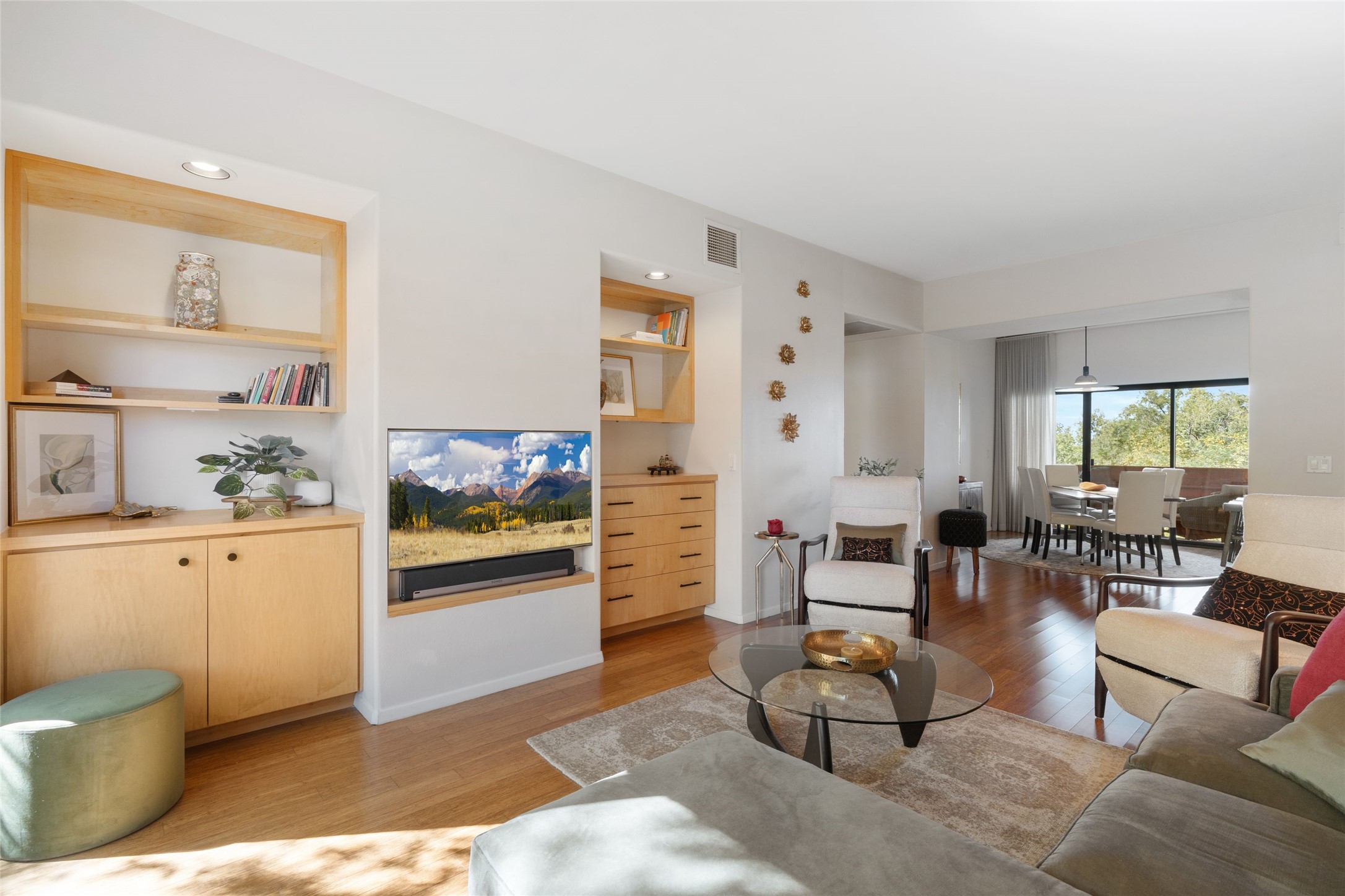 Classic urban oasis surrounded by mature trees, La Remuda Condominium is located on the edge of Midtown where you can walk to relaxed eateries featuring global cuisine and local flair. Not far from theRailyard, quick stops to Trader Joe's and Whole Foods. The central location is convenientfor a fast commute to Los Alamos or I-25. This bright and airy condo features an open floor plan with sliding glass doors at each end of the living/dining rooms with access to the 2 balconies. The kitchen is well designed, with exceptional storage, high quality stainless steel appliances, butcher block on one side of the counter and Italian tile on the other. Other features include: central air conditioning and heating installed in 2023, 9 foot ceilings, beautiful bamboo floors, custom drapes, custom dividedclosets, custom cabinets in living room and office, private storage: 5.5' x 17', Asko washer and dryer, whole house water filtration system installed in 2025, 2 under cover designated parking spots with direct entrance to the secure building, upper floor unit with no interior steps, new roof in 2024 and refreshed stucco in 2025. One of the two only units at La Remuda with 3 bedrooms. Included are two covered tandem parking spaces and a spacious storage unit. This condo is on the second floor and stairs are required to access it.