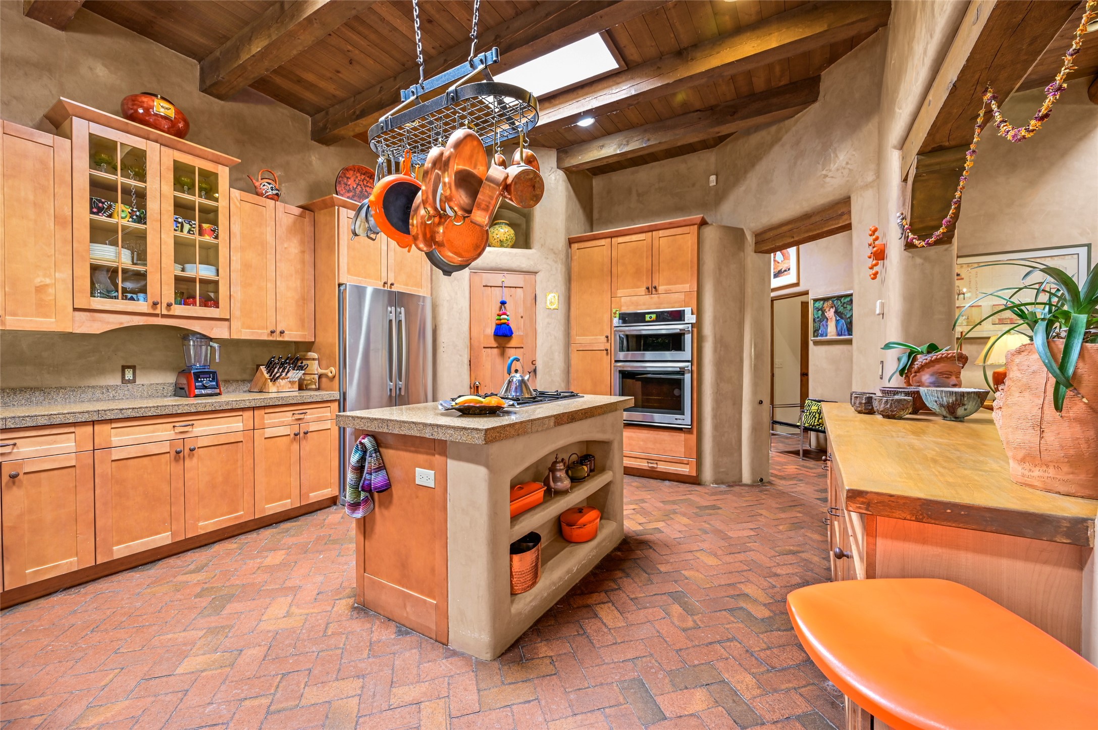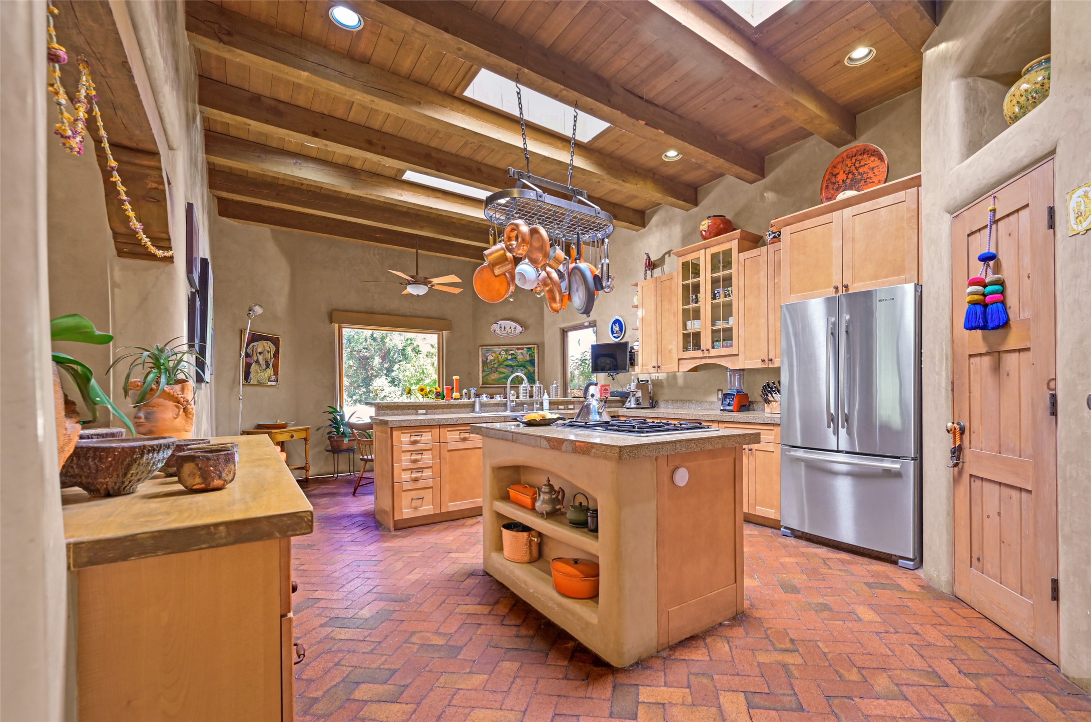 A sophisticated single level home on Santa Fe's Northside. Nestled on a generous lot just minutes from the plaza, this 4 bedroom home boasts high ceilings with brick and wood floors. The 3 bathrooms include a generous soaking tub and steam shower. The gourmet kitchen is large with a breakfast sitting area, high end appliances and ample storage for the cook in the family. 2 fireplaces and diffused natural light are not only attractive, but make for light and bright living spaces. The outdoor living features a private patio and Jacuzzi hot tub. The grounds are professionally landscaped and the backyard is fully enclosed. This home has an attached 2 car garage.