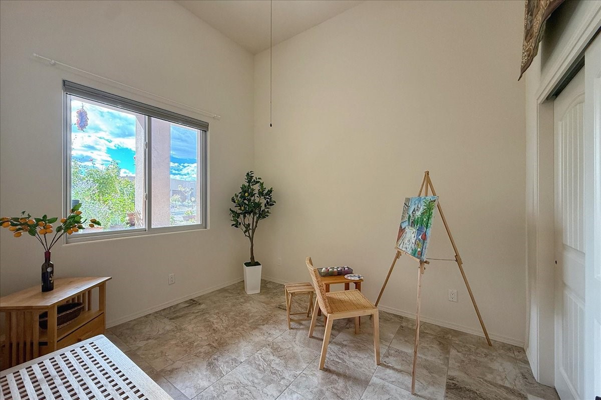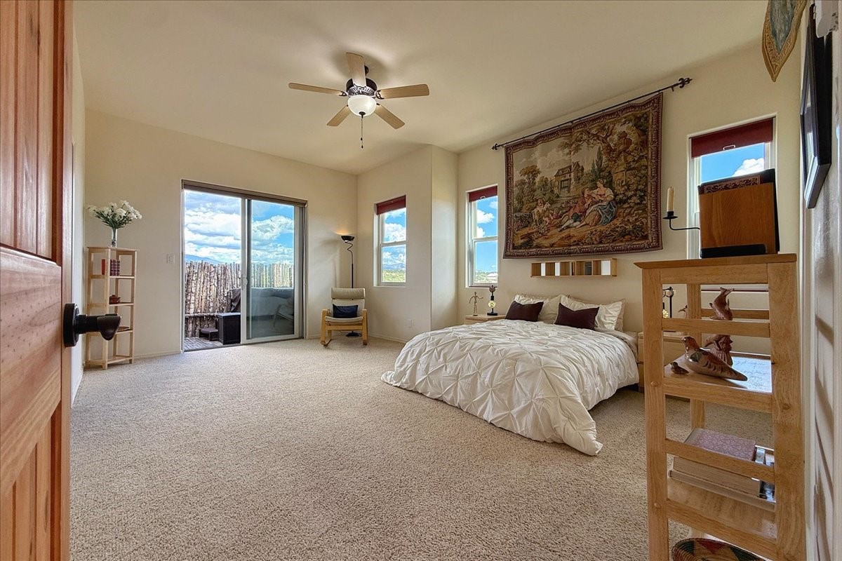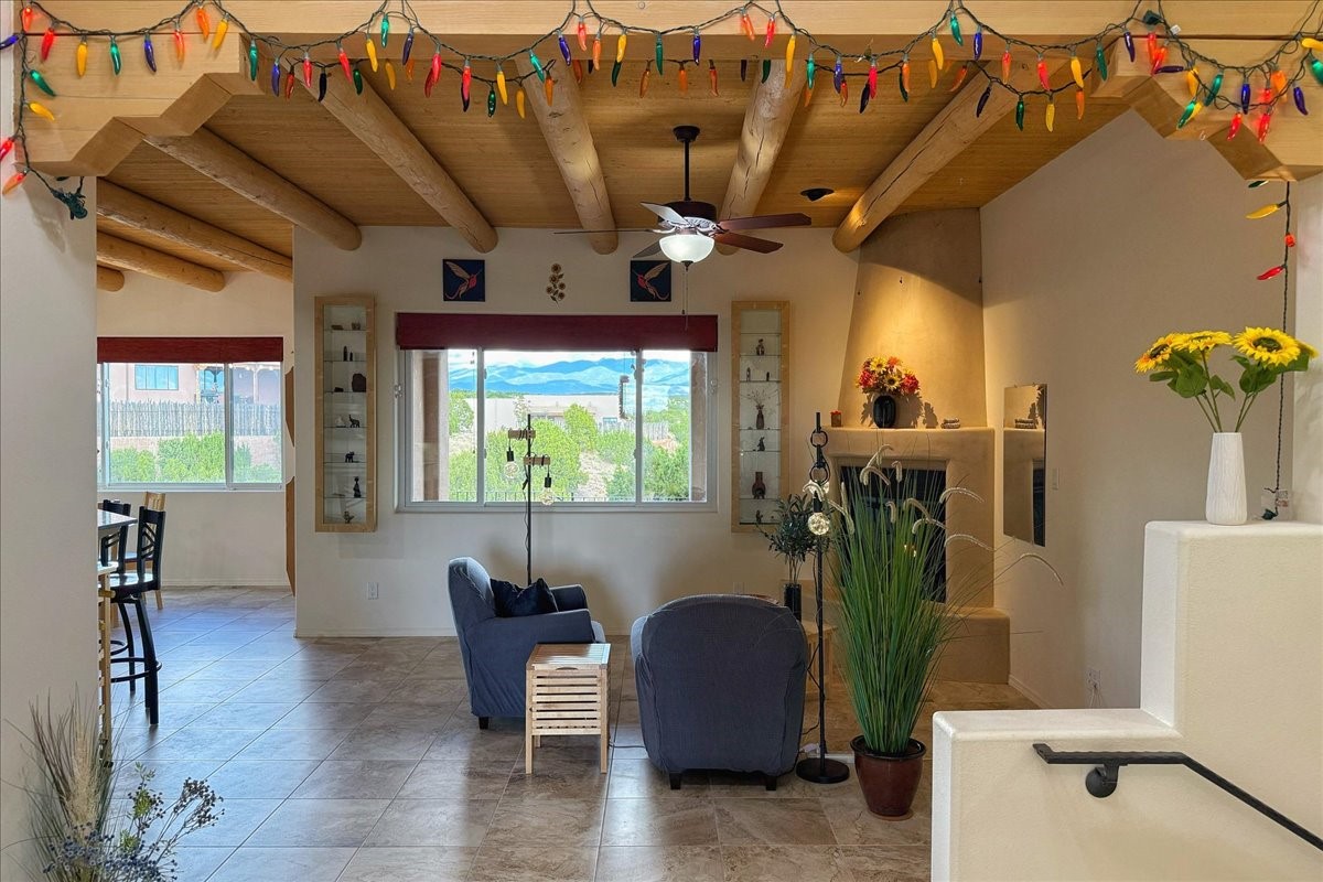 Beautiful 3 bed/2.5-bath home built in 2015. Mostly single-level with 3 stair drop to bedrooms. Perfectly situated on a 0.34-acre lot surrounded by natural pinon and juniper open space, 8 minutes from downtown Santa Fe. Offering 1,850 sq ft of thoughtfully designed living space and a finished 3-car EV-ready garage with workbench area, shelves, and overhead storage, this single-owner home blends Santa Fe charm with modern efficiency. Tall ceilings and large-format tile floors enhance the open feel, while wood ceilings with vigas and latillas add warmth. The kitchen features granite countertops, under-cabinet lighting, gas range, ENERGY STAR® appliances, and hood-mounted microwave. Expansive picture windows frame Sangre de Cristo views, filling the home with natural light. Step from the dining area to a covered patio and a private screened spa retreat with multi-person 220V hot tub off the primary suite. The spacious primary suite offers room for a home office or yoga area, plus a walk-in closet with custom Modular Closets® and built-in staircase to high-bay storage. The primary bath boasts an oversized walk-in shower with no glass door and a private toilet area. Energy efficiency abounds with 31 owned solar panels to power spa, home and 300 miles daily for up to 3 EVs, foam-core insulation, radiant floor heat, solar tubes, recirculating hot water, whole-house fan, and motorized exterior sunshades. Additional features include a water softening and revese osmosis systems, radon mitigation, low-VOC finishes, and a partially concrete driveway for easy snow removal. The driveway can accommodate 5 cars in addition to garage. Outdoors, enjoy professional landscaping, drip irrigation, a secluded flagstone patio for dining or stargazing, a fully fenced garden area with shed, and rainwater barrels. Scenic walking trails with mountain views. Convenient access to Hwy 599 makes commuting to Los Alamos or the Santa Fe Airport a breeze. Views and comfort in one perfect package.