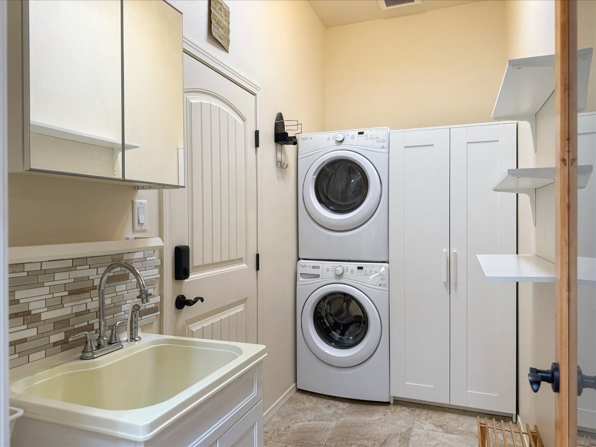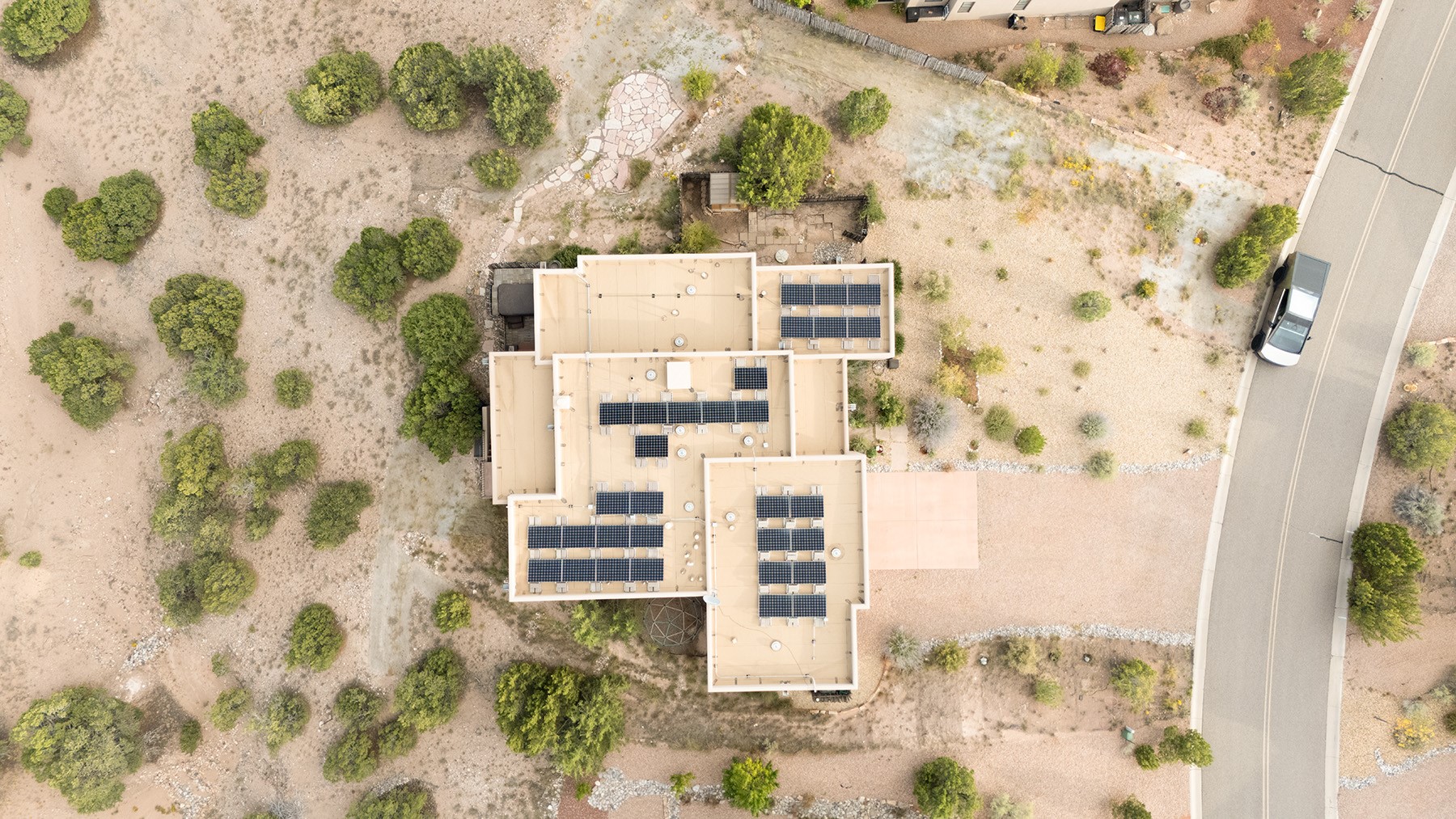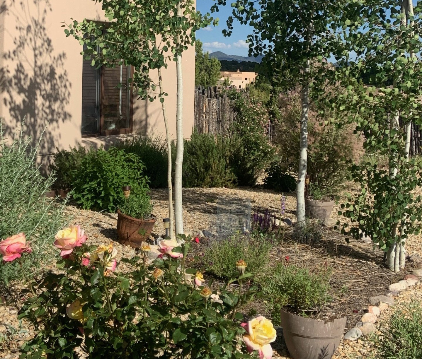 Beautiful 3 bed/2.5-bath home built in 2015. Mostly single-level with 3 stair drop to bedrooms. Perfectly situated on a 0.34-acre lot surrounded by natural pinon and juniper open space, 8 minutes from downtown Santa Fe. Offering 1,850 sq ft of thoughtfully designed living space and a finished 3-car EV-ready garage with workbench area, shelves, and overhead storage, this single-owner home blends Santa Fe charm with modern efficiency. Tall ceilings and large-format tile floors enhance the open feel, while wood ceilings with vigas and latillas add warmth. The kitchen features granite countertops, under-cabinet lighting, gas range, ENERGY STAR® appliances, and hood-mounted microwave. Expansive picture windows frame Sangre de Cristo views, filling the home with natural light. Step from the dining area to a covered patio and a private screened spa retreat with multi-person 220V hot tub off the primary suite. The spacious primary suite offers room for a home office or yoga area, plus a walk-in closet with custom Modular Closets® and built-in staircase to high-bay storage. The primary bath boasts an oversized walk-in shower with no glass door and a private toilet area. Energy efficiency abounds with 31 owned solar panels to power spa, home and 300 miles daily for up to 3 EVs, foam-core insulation, radiant floor heat, solar tubes, recirculating hot water, whole-house fan, and motorized exterior sunshades. Additional features include a water softening and revese osmosis systems, radon mitigation, low-VOC finishes, and a partially concrete driveway for easy snow removal. The driveway can accommodate 5 cars in addition to garage. Outdoors, enjoy professional landscaping, drip irrigation, a secluded flagstone patio for dining or stargazing, a fully fenced garden area with shed, and rainwater barrels. Scenic walking trails with mountain views. Convenient access to Hwy 599 makes commuting to Los Alamos or the Santa Fe Airport a breeze. Views and comfort in one perfect package.