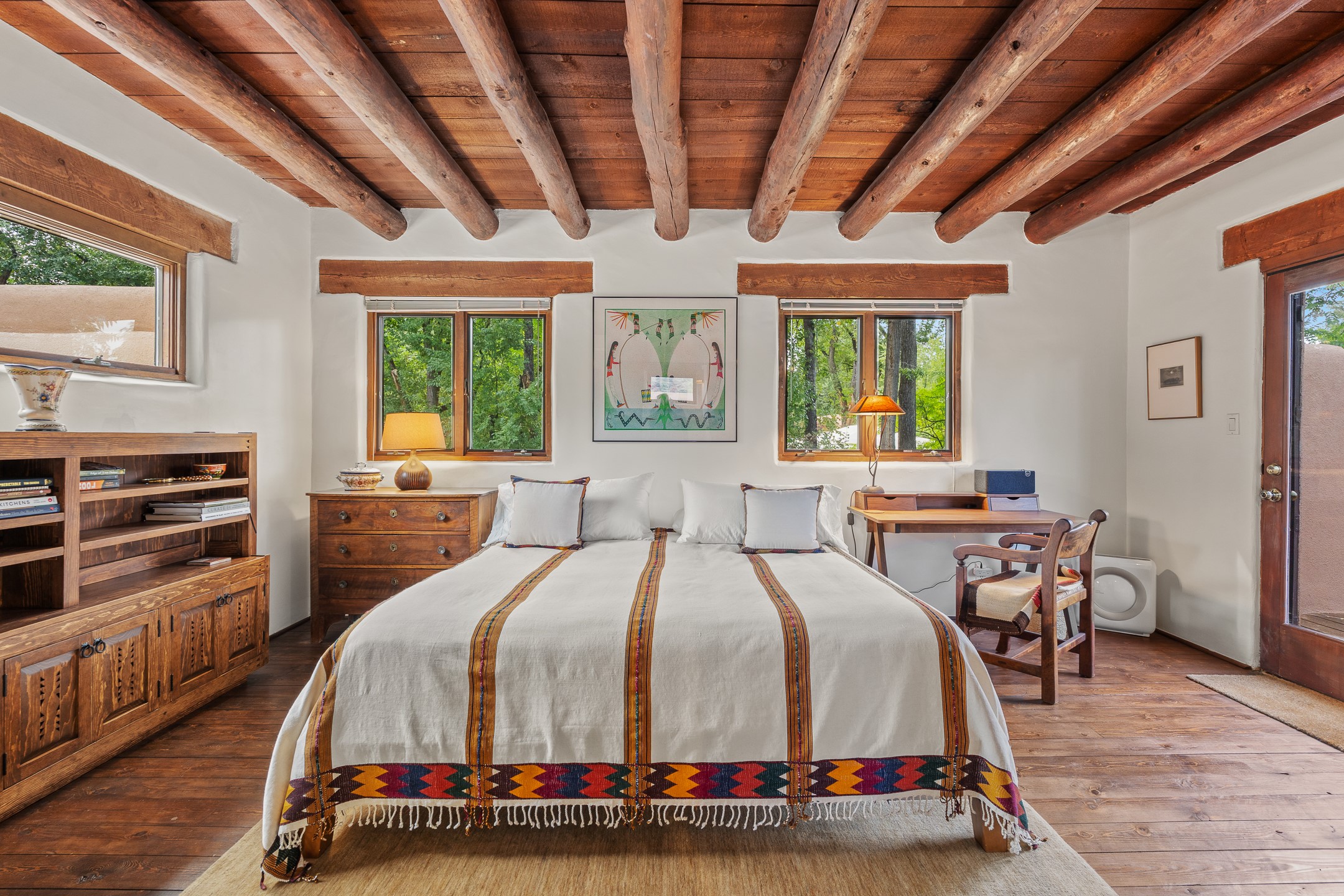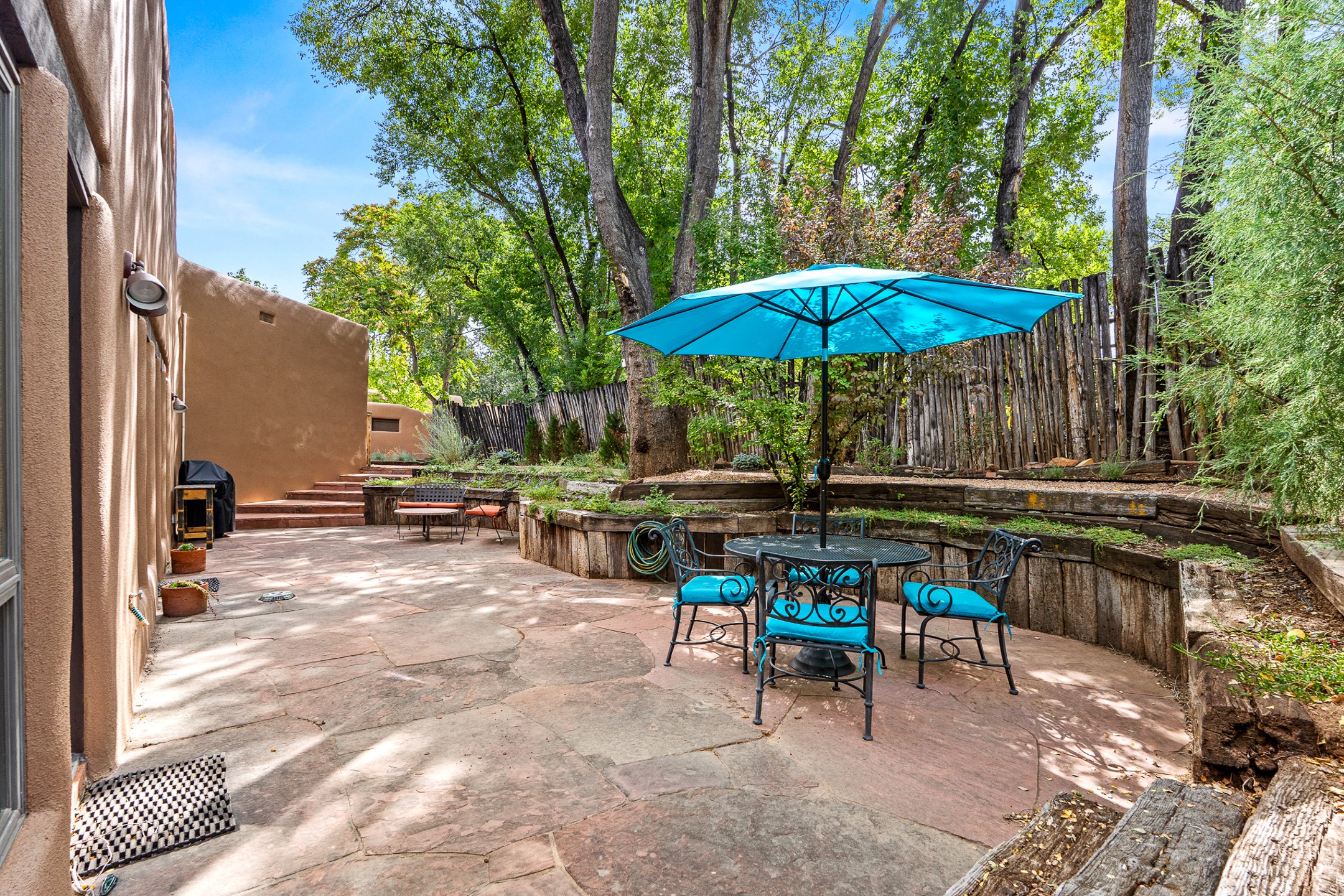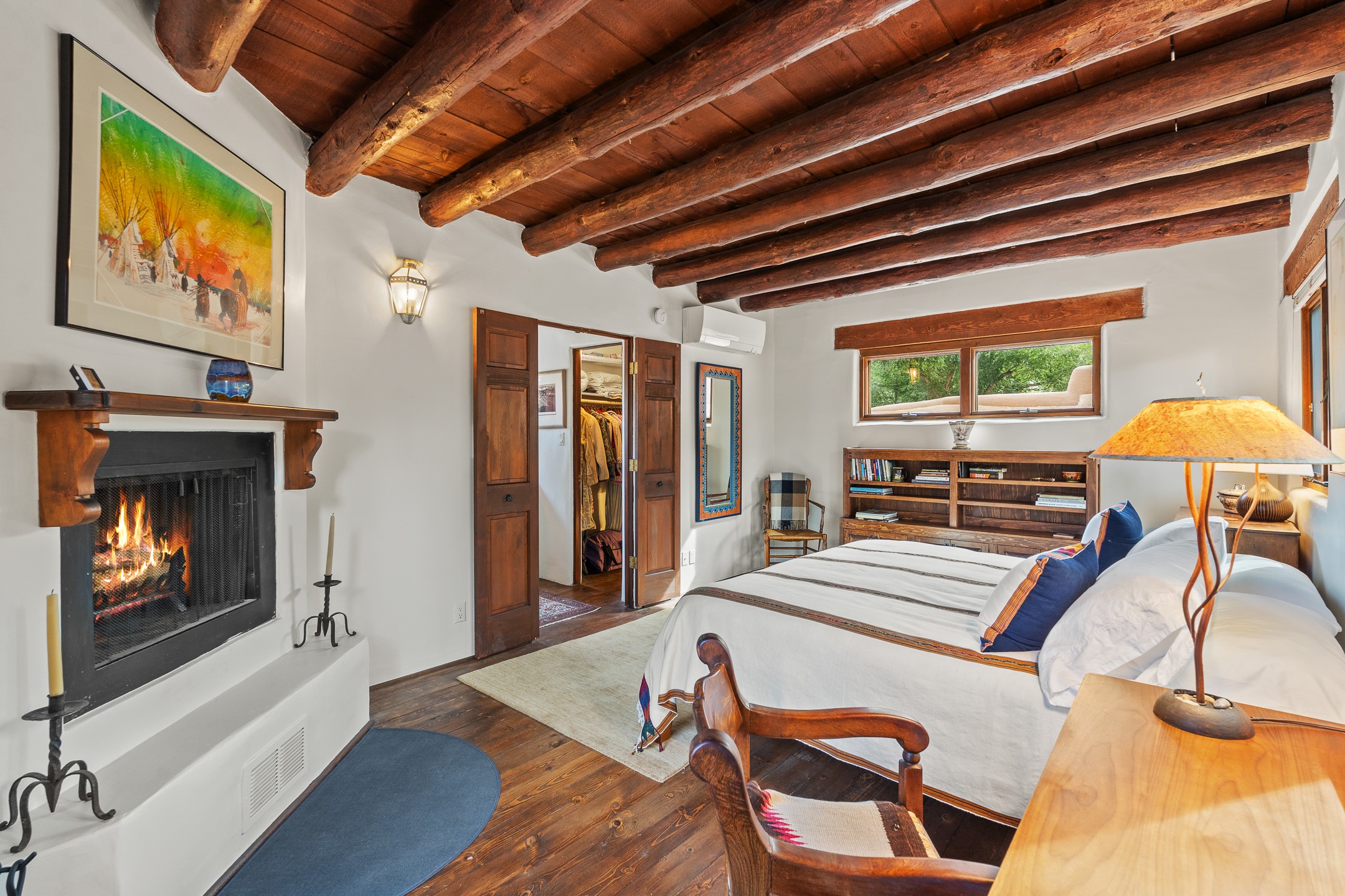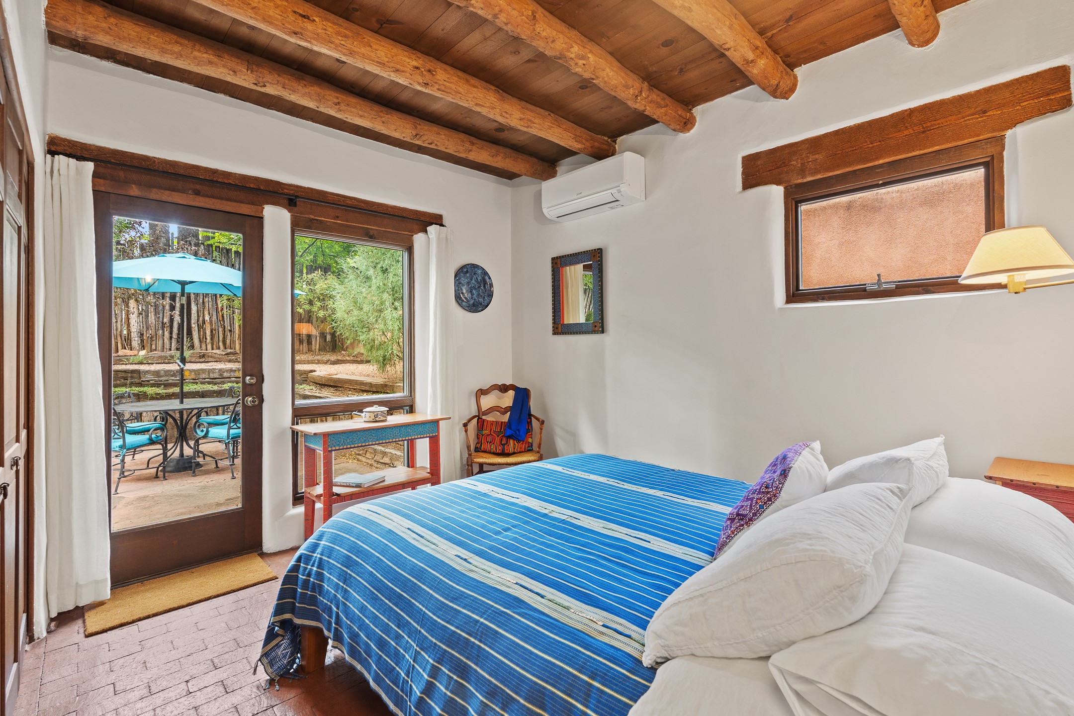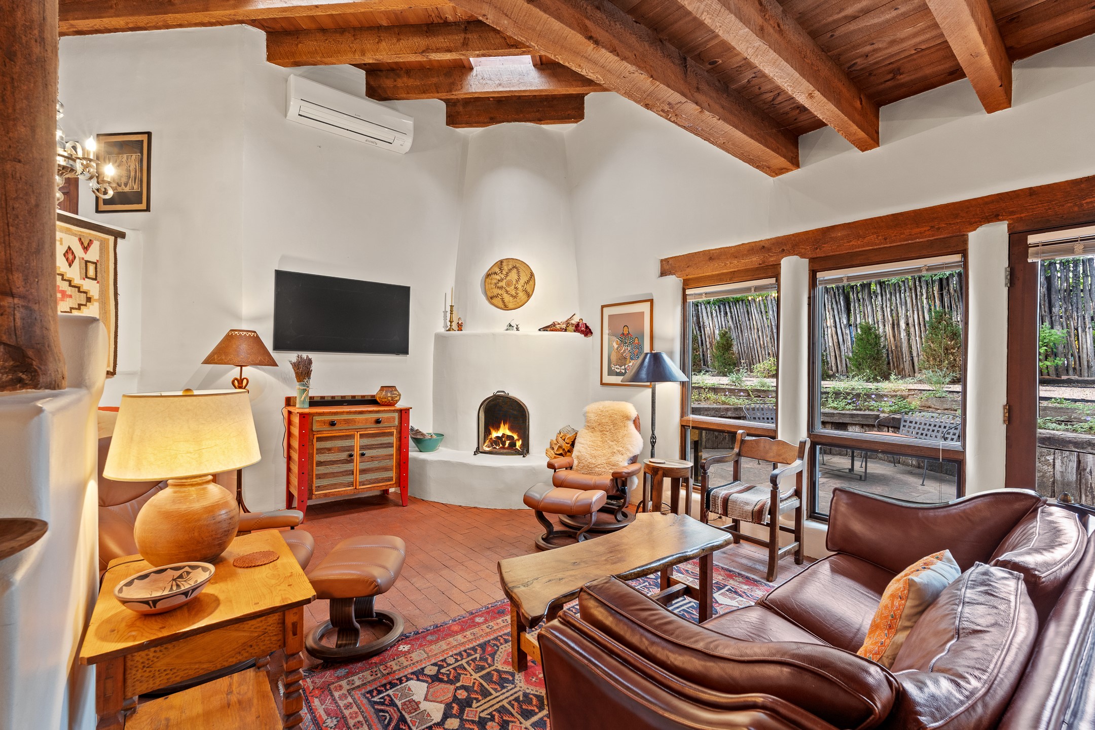 Rare opportunity to claim your slice of historic Eastside magic on Santa Fe's treasured Johnson Lane. The perfect pied--terre or a comfortable full-time residence, this beautifully cared for 3BD-2BA home (with two-car garage!) masterfully combines function with Southwest elegance. Finishes include brick and wood floors throughout, wood beams, and decorative tile work in numerous spaces. Down a modest flight of stairs, the living room offers high ceilings, bountiful natural light, and a wood-burning kiva fireplace. Outside, the fenced-in backyard offers shade from mature trees, low-fuss tiered garden beds (drip irrigation in-place), and an oversized flagstone patio for dining and outdoor leisure. The kitchen offers charm of its own--equipped with Fisher and Paykel appliances (2023), open shelving, and a custom Hopi mosaic backsplash behind the range installed by an indigenous artist. Upstairs, the primary suite is a retreat of its own with a cozy wood-burning fireplace and private outdoor balcony. Recently installed mini-splits throughout keep the home cool on hot summer days, and providesupplemental heating to the existing forced-air heating system in the colder months. Meticulously maintained, with recent roof replacement (2020), new stucco (2025), upgraded 200 Amp electrical service (2023), and many more fantastic improvements for a future homeowner to enjoy immediately. One of the most storied, quiet, streets on Santa Fe's historic Eastside, Johnson Lane offers a welcoming neighborhood, close proximity to coffee shops, restaurants, neighborhood grocery stores, and an easy stroll to famed Canyon Road.