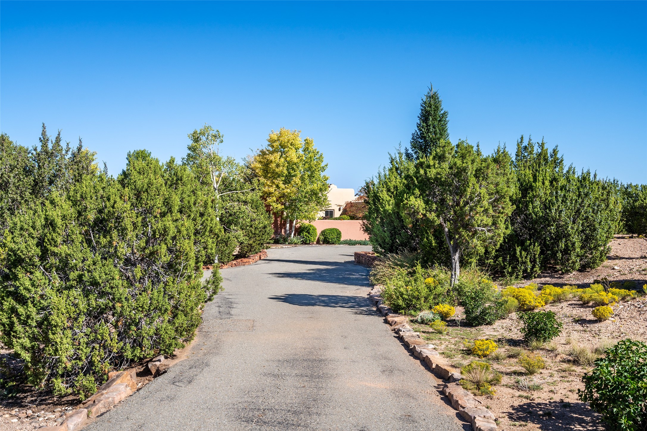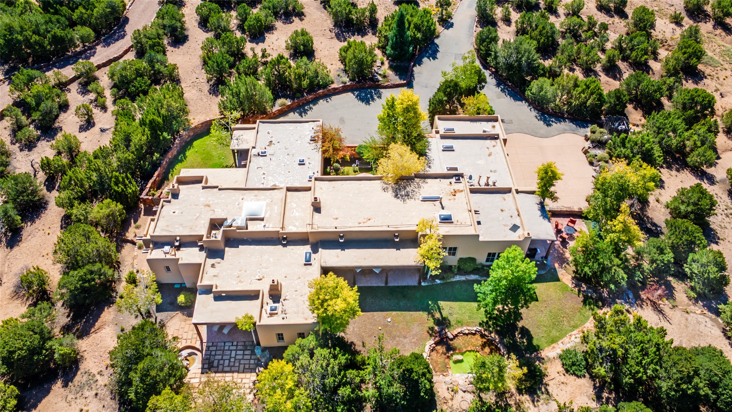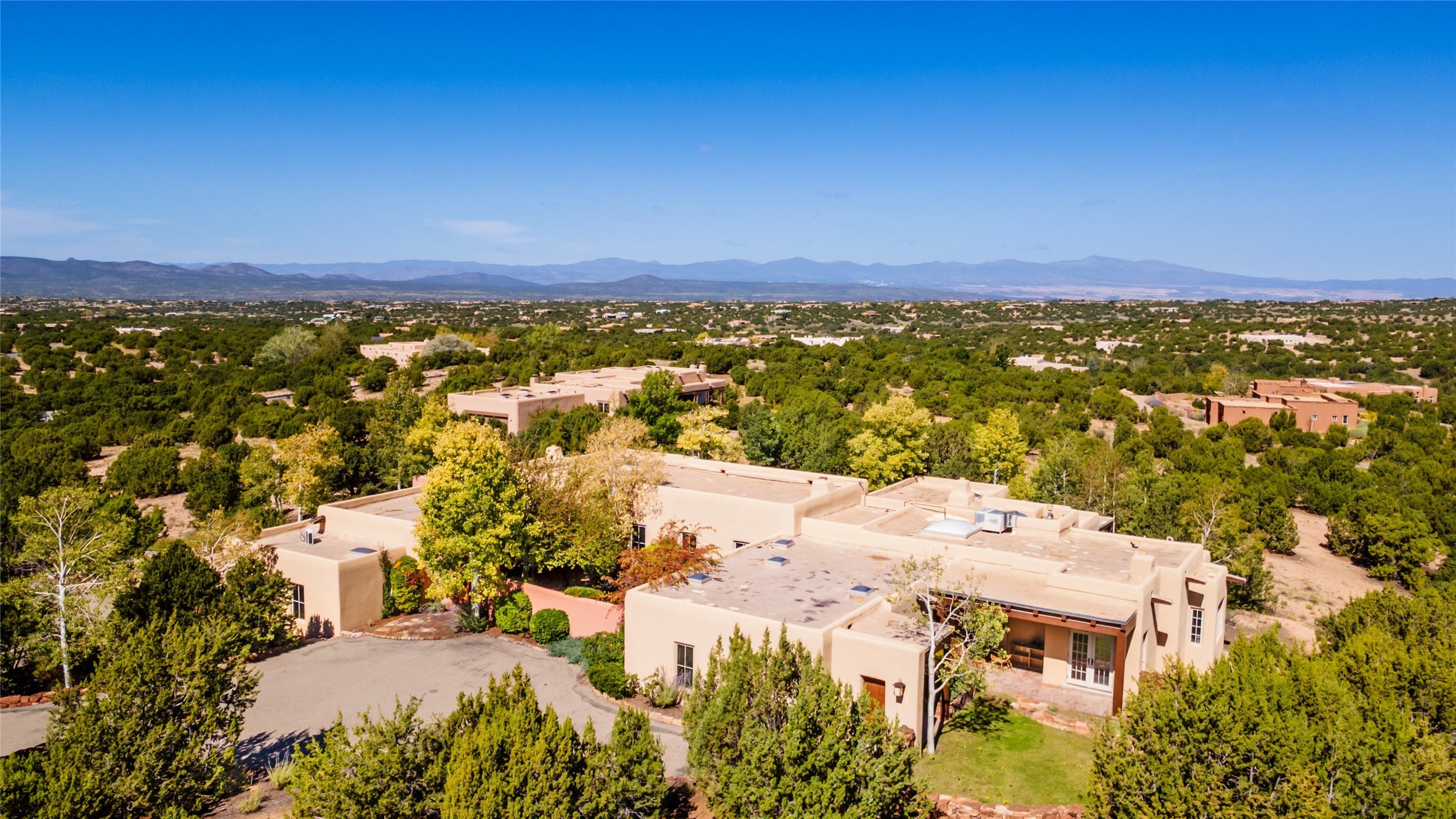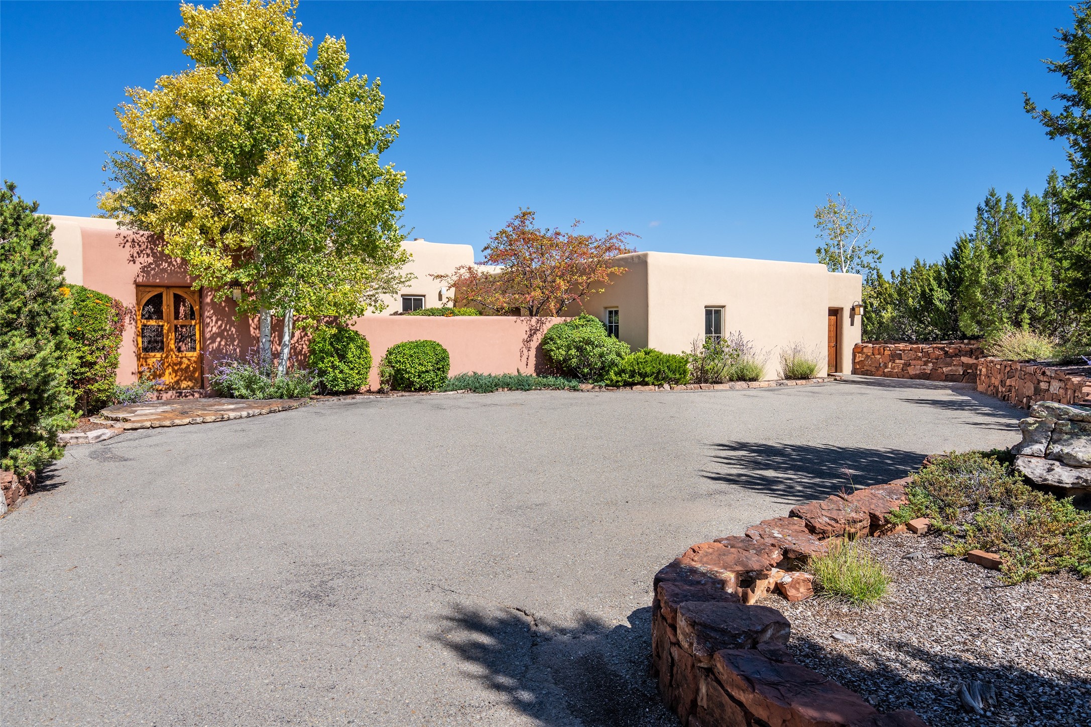 SERENE & PRIVATE SANTA FE ESTATE. Nestled on over 2 acres in one of Santa Fe's premier communities, this 4 bedroom, 4.5 bath home offers an elegant blend of scale and comfort. Thoughtfully designed for both grand entertaining and easy day-to-day living. A light filled great room with a fireplace anchors the home, while patios off nearly every room invite seamless indoor/outdoor living. The recently remodeled kitchen will delight culinary enthusiasts, and a finished office space - converted from one of the 3 garage bays - adds flexibility for today's lifestyle. The private guest addition features its own living room and en-suite, complemented by two additional guest suites each with private baths. Outdoors, a long driveway leads to two lush courtyards filled with grass flowers, trees, and shrubs, Multiple apple trees and two tranquil water features enhance the serene setting. Despite its generous footprint, the home maintains a warm, welcoming feel, filled with natural light and surrounded by native landscaping for privacy. Just minutes from downtown Santa Fe and with easy highway access, this property offers the best of Southwestern living - spacious, secluded, and perfectly situated. *This home is being sold as-is, where is*