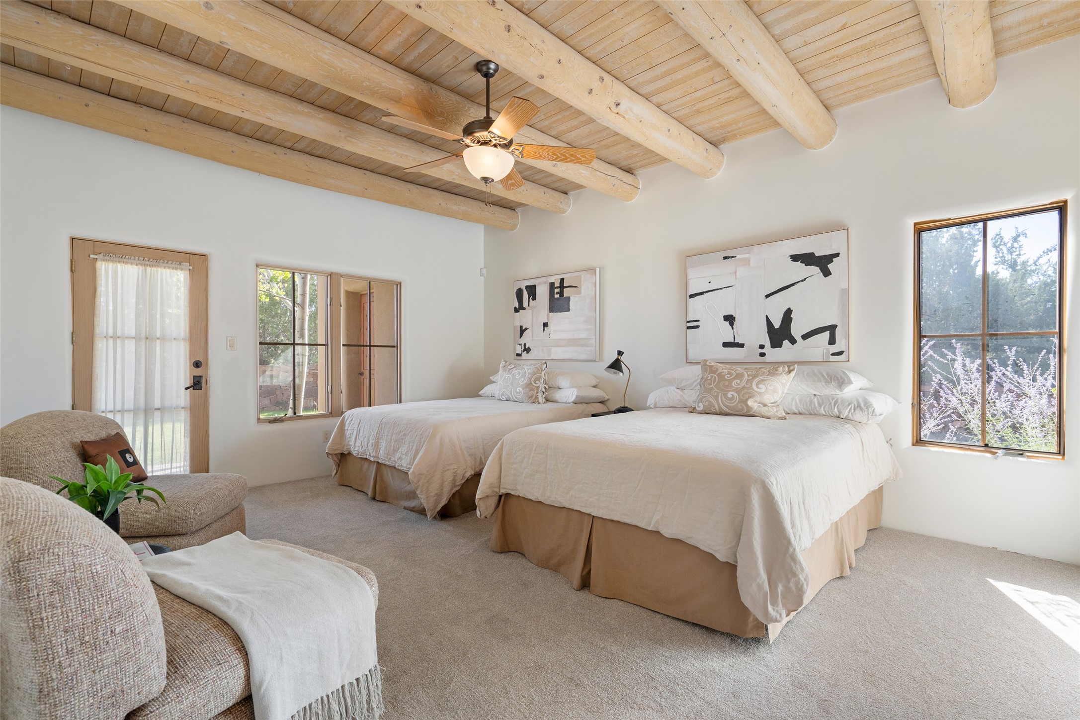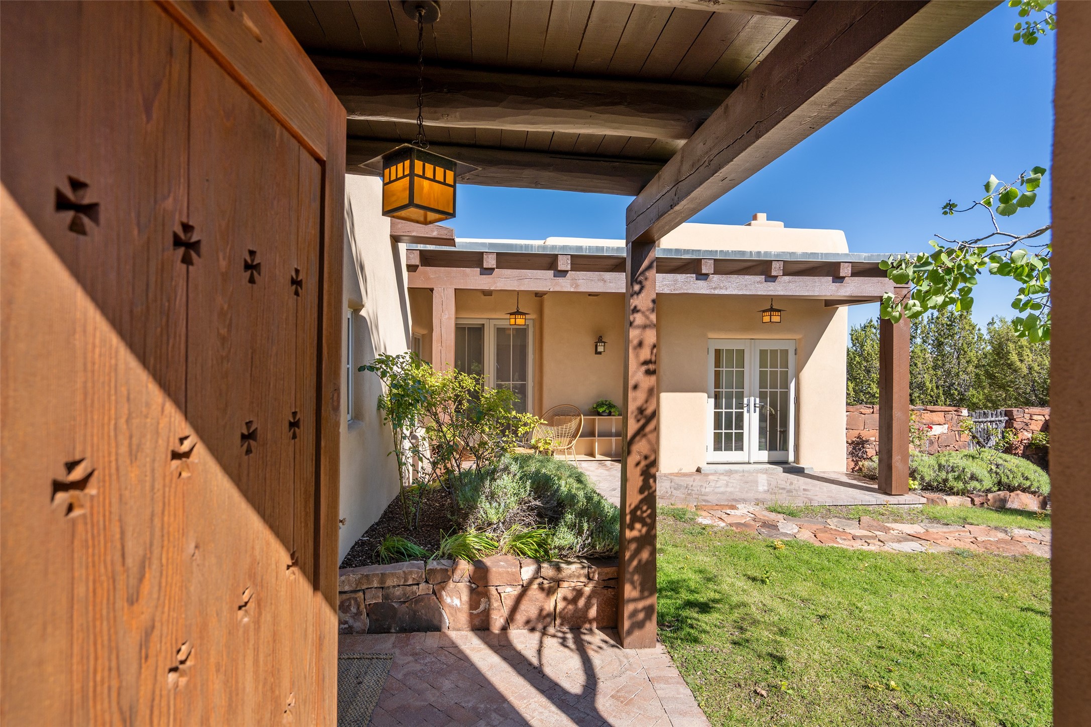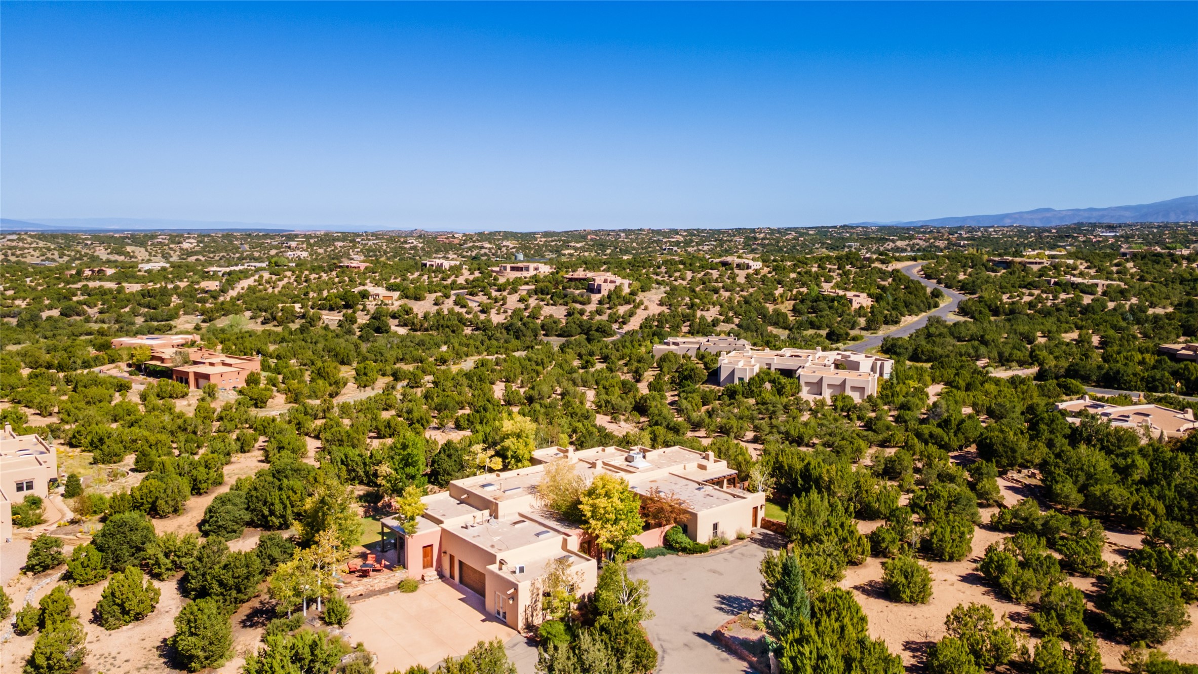 SERENE & PRIVATE SANTA FE ESTATE. Nestled on over 2 acres in one of Santa Fe's premier communities, this 4 bedroom, 4.5 bath home offers an elegant blend of scale and comfort. Thoughtfully designed for both grand entertaining and easy day-to-day living. A light filled great room with a fireplace anchors the home, while patios off nearly every room invite seamless indoor/outdoor living. The recently remodeled kitchen will delight culinary enthusiasts, and a finished office space - converted from one of the 3 garage bays - adds flexibility for today's lifestyle. The private guest addition features its own living room and en-suite, complemented by two additional guest suites each with private baths. Outdoors, a long driveway leads to two lush courtyards filled with grass flowers, trees, and shrubs, Multiple apple trees and two tranquil water features enhance the serene setting. Despite its generous footprint, the home maintains a warm, welcoming feel, filled with natural light and surrounded by native landscaping for privacy. Just minutes from downtown Santa Fe and with easy highway access, this property offers the best of Southwestern living - spacious, secluded, and perfectly situated. *This home is being sold as-is, where is*