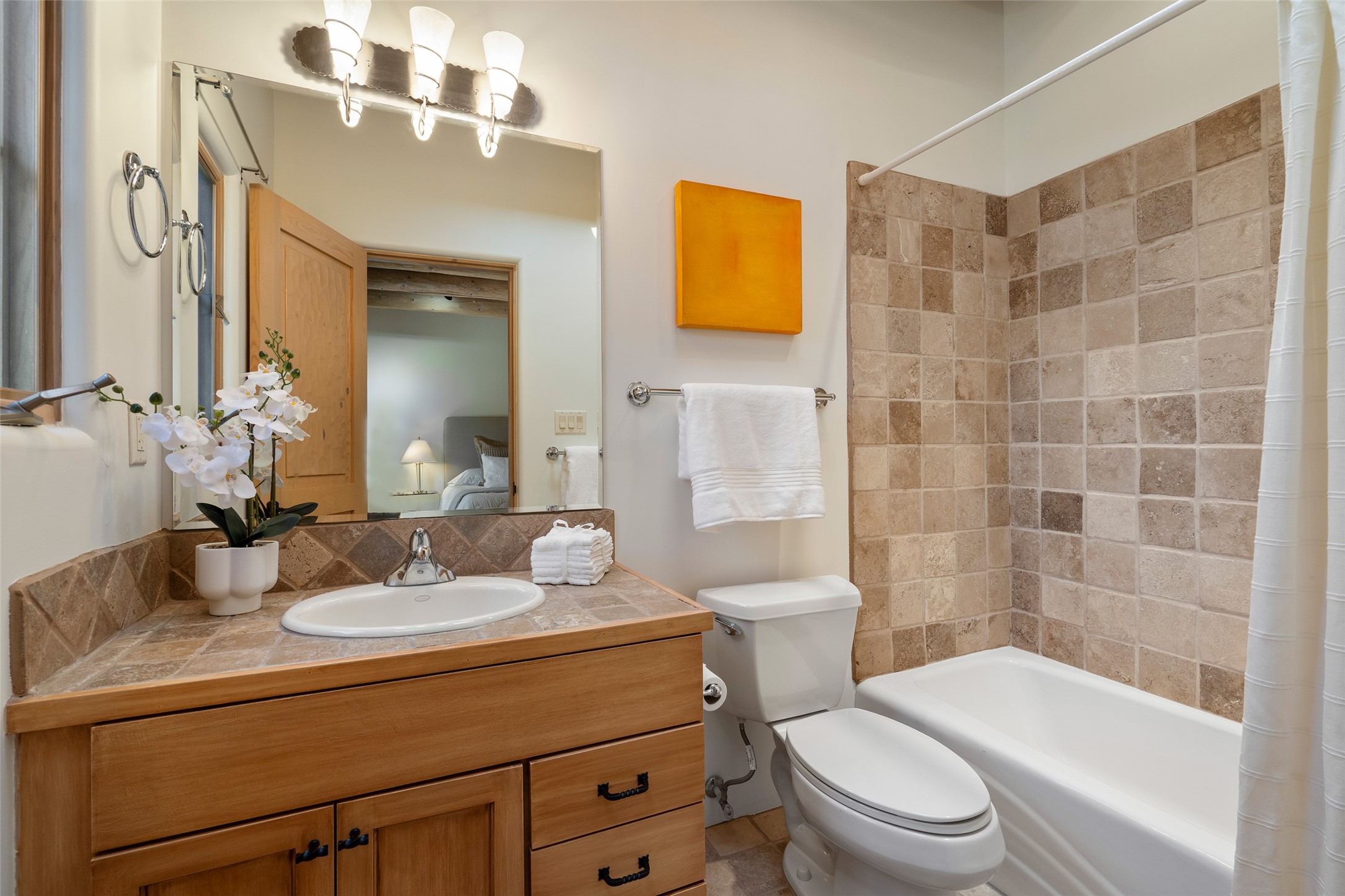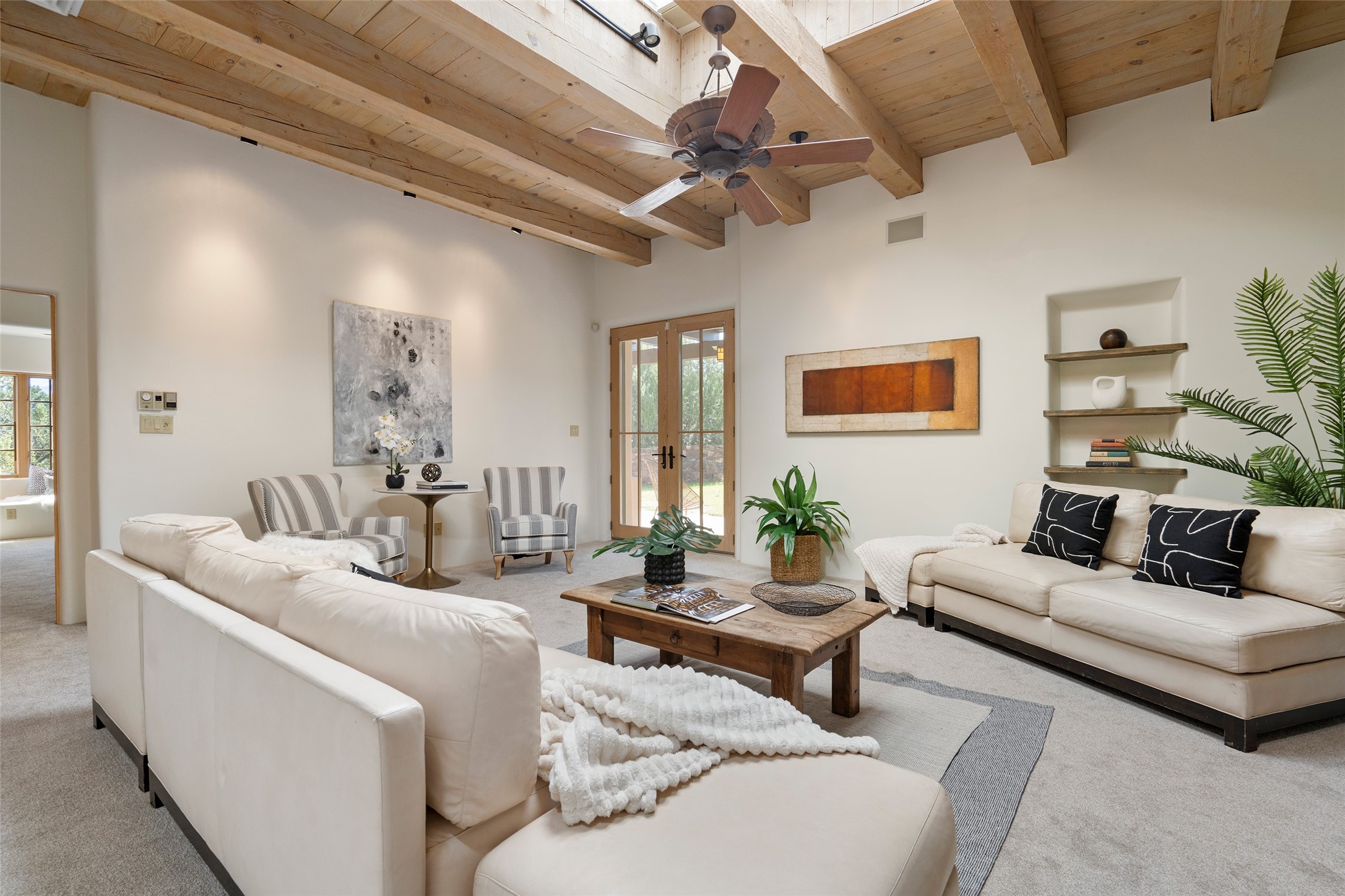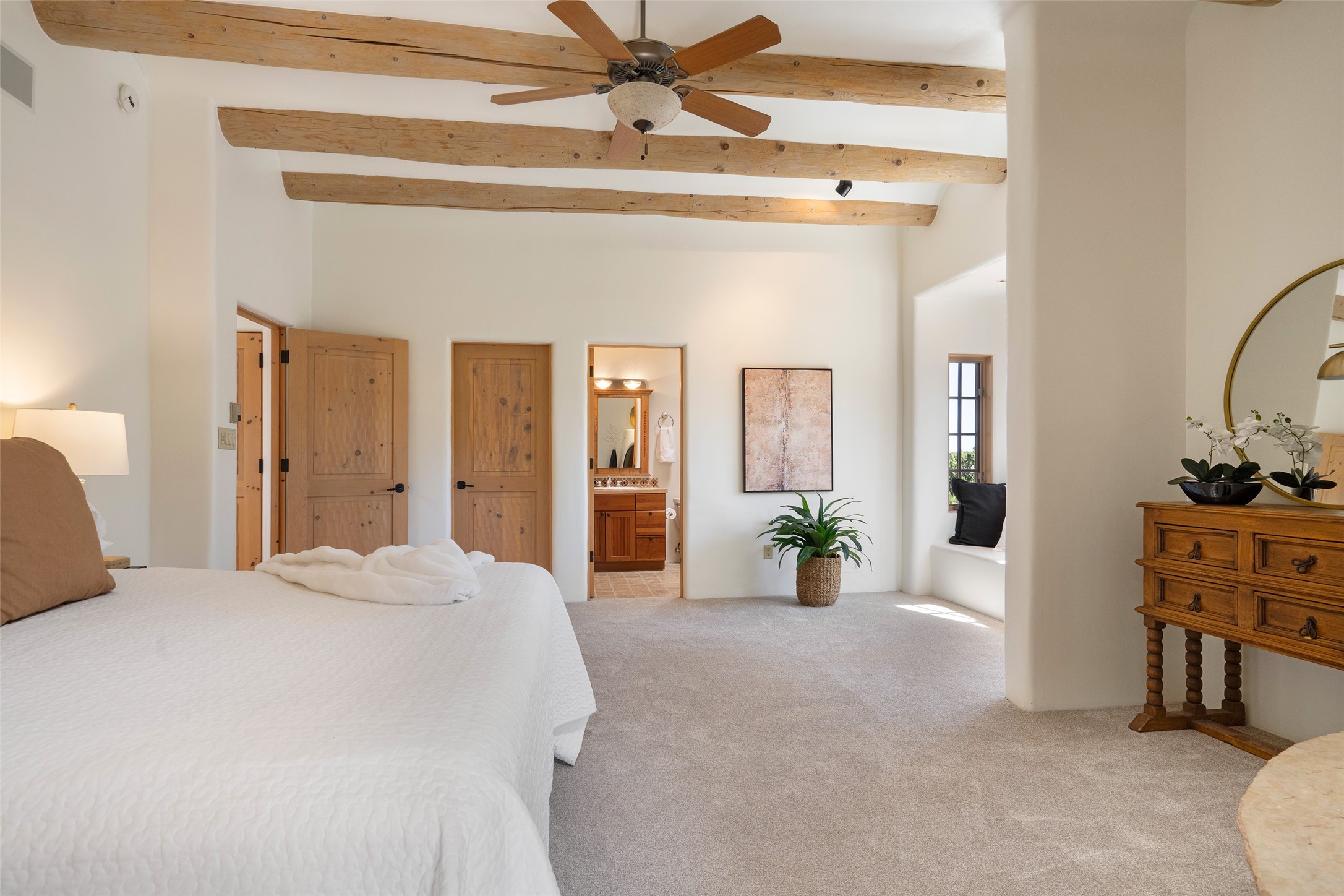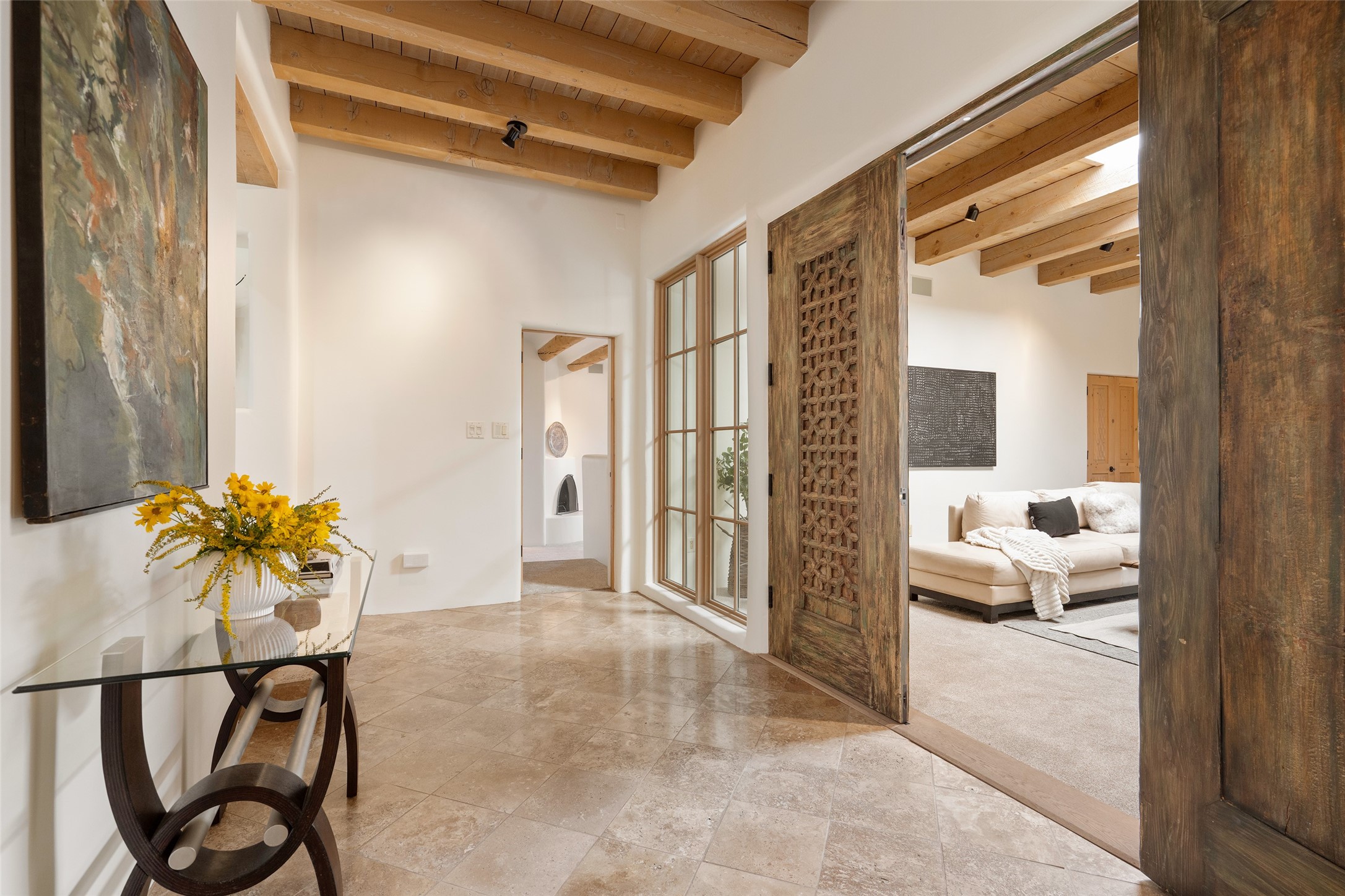 SERENE & PRIVATE SANTA FE ESTATE. Nestled on over 2 acres in one of Santa Fe's premier communities, this 4 bedroom, 4.5 bath home offers an elegant blend of scale and comfort. Thoughtfully designed for both grand entertaining and easy day-to-day living. A light filled great room with a fireplace anchors the home, while patios off nearly every room invite seamless indoor/outdoor living. The recently remodeled kitchen will delight culinary enthusiasts, and a finished office space - converted from one of the 3 garage bays - adds flexibility for today's lifestyle. The private guest addition features its own living room and en-suite, complemented by two additional guest suites each with private baths. Outdoors, a long driveway leads to two lush courtyards filled with grass flowers, trees, and shrubs, Multiple apple trees and two tranquil water features enhance the serene setting. Despite its generous footprint, the home maintains a warm, welcoming feel, filled with natural light and surrounded by native landscaping for privacy. Just minutes from downtown Santa Fe and with easy highway access, this property offers the best of Southwestern living - spacious, secluded, and perfectly situated. *This home is being sold as-is, where is*