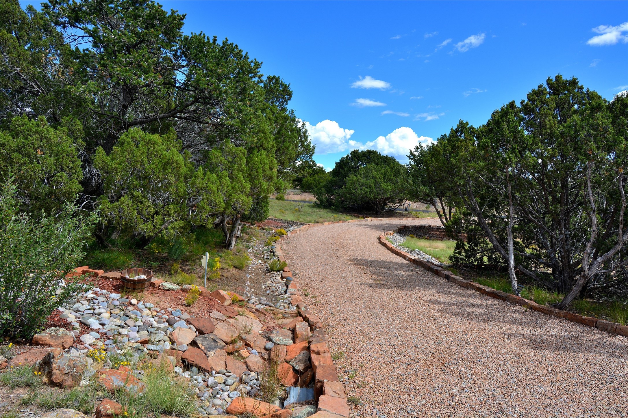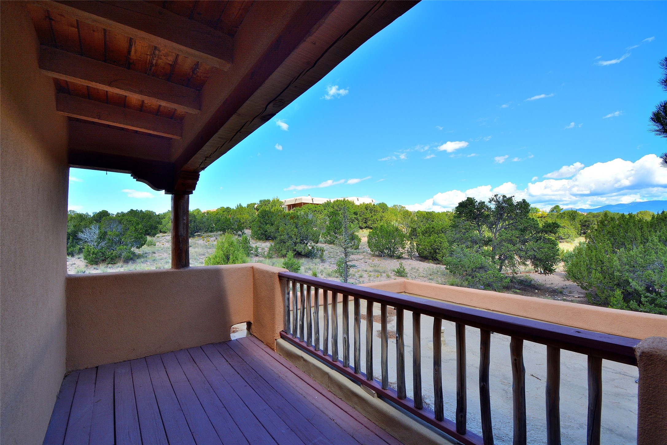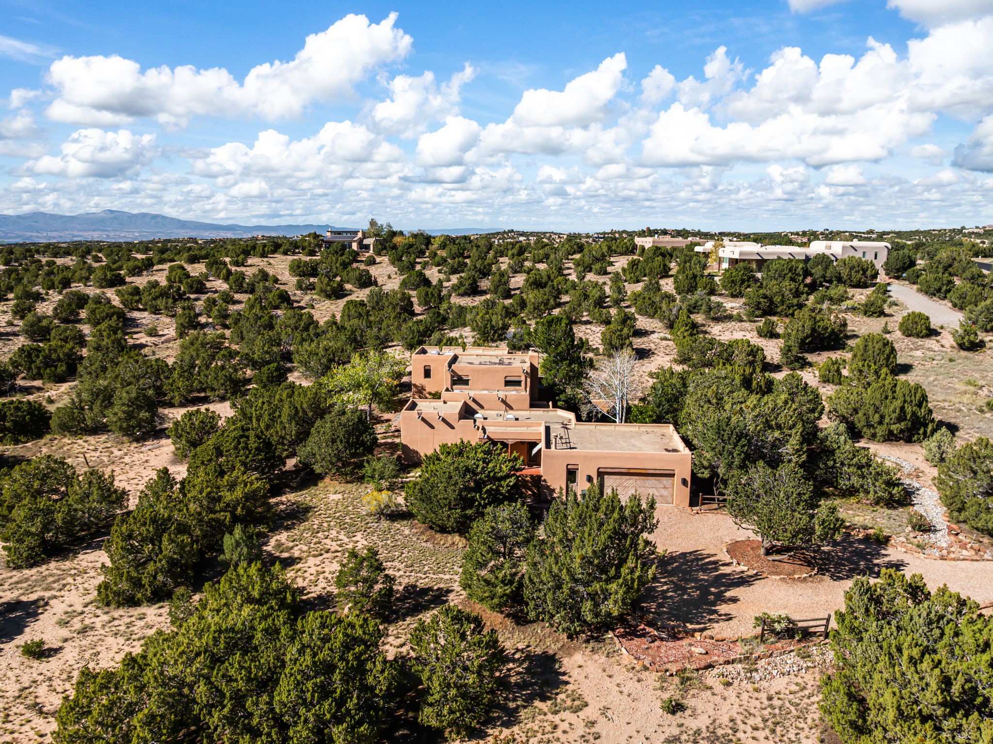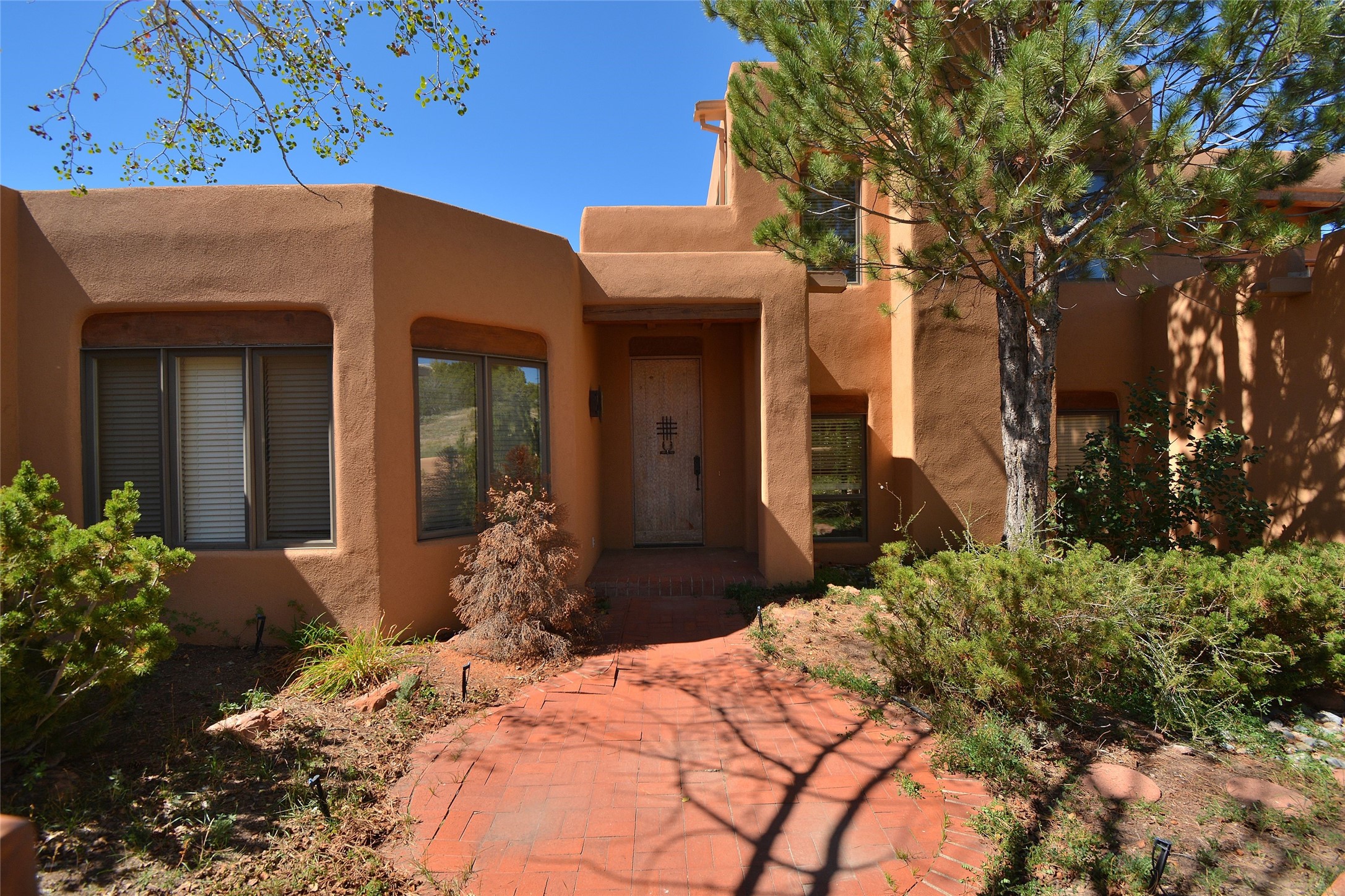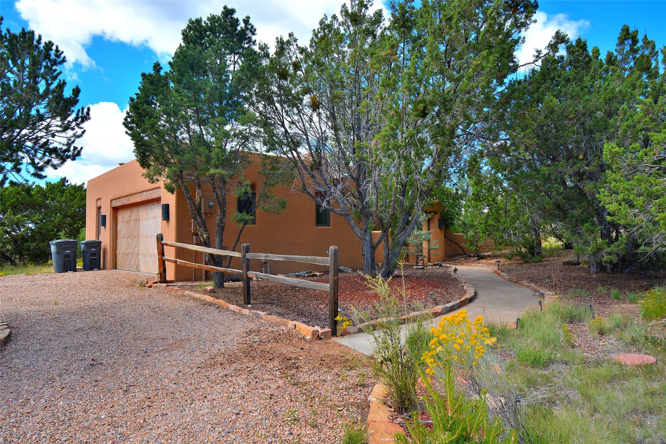 Nestled on two acres dotted with pion and juniper, this inviting Santa Fe-style home blends traditional charm with modern comforts. A gravel driveway leads to a graceful walkway, which in turn leads to a beautifully landscaped, enclosed front yard, The house features plastered walls, and the ground-level floors are adorned with traditional Saltillo tiles, except for the guest bedroom, which has carpet and an en-suite bathroom. The living and dining rooms feature soaring ceilings with vigas. A gas fireplace in the living room adds ambiance during cold winter nights.The kitchen, featuring skylights, granite countertops, and a gas cooktop, microwave, oven, and fridge/freezer, opens to a breakfast nook on one side, complete with its own private patio. Continuing from the breakfast nook, you enter the laundry and then the garage. On the other side of the kitchen is the dining room. The main level also features a second guest room or den with a nearby half-bath. The downstairs has in-floor radiant heat.Upstairs, the spacious main bedroom offers vigas, a second gas fireplace, radiant baseboard heat, and mountain views on one side and a deck on the other. The adjoining bath offers dual sinks, a Jacuzzi-style tub, a shower with seating, and a walk-in cedar closet.A new septic tank was installed in late November 2025With an alarm system and thoughtful storage throughout, this home offers a blend of traditional Santa Fe style and practicality in a serene setting, just a couple of minutes drive to 599 and access to Santa Fe (approx.10 minutes) or to Los Alamos, the Santa Fe airport, and Albuquerque.Adjacent to the subdivision is the La Tierra open space of almost 1500 acres, offering 25 miles of walking trails.