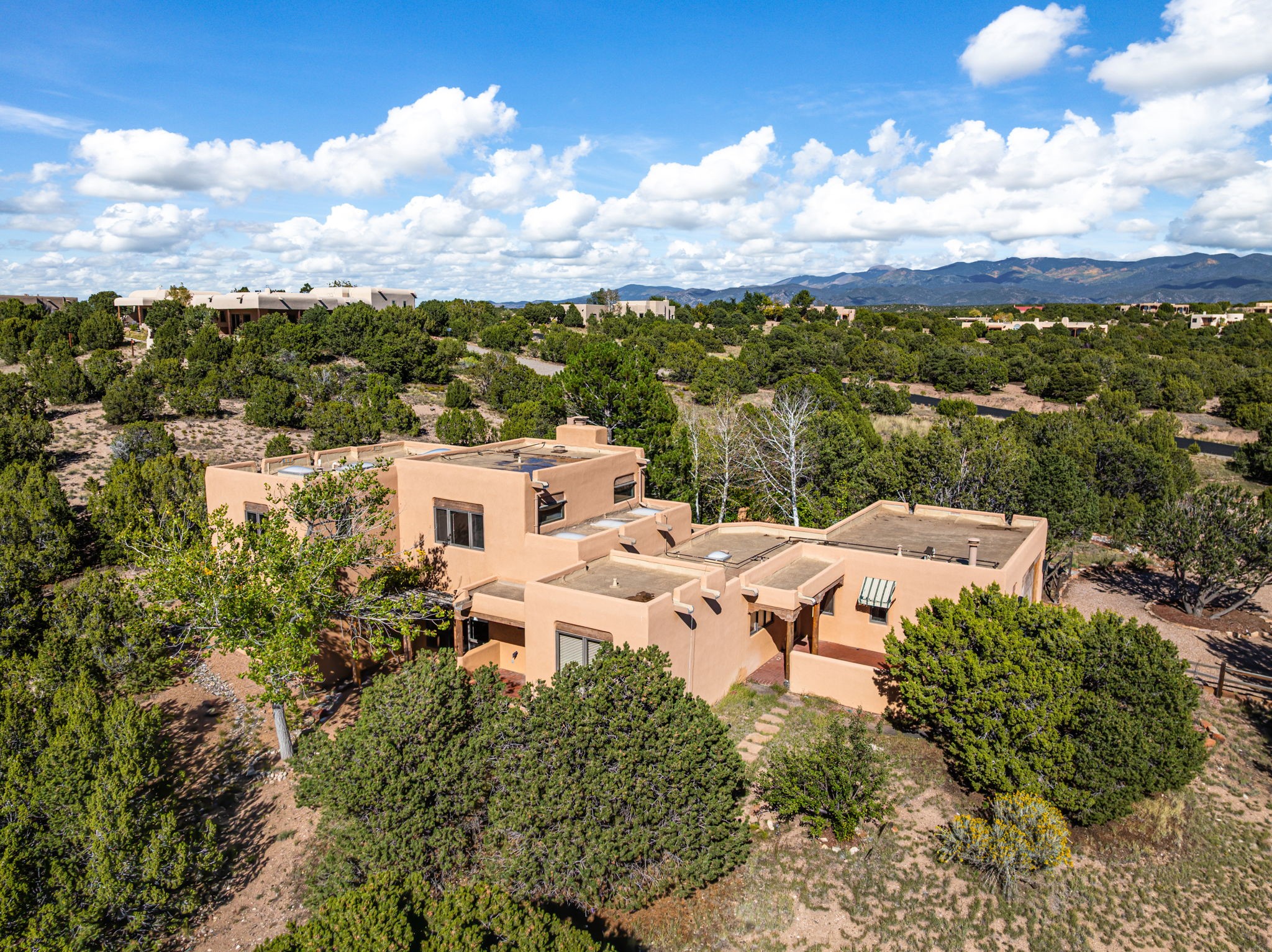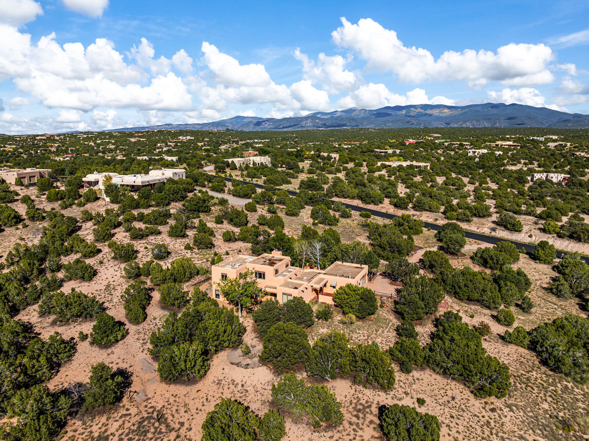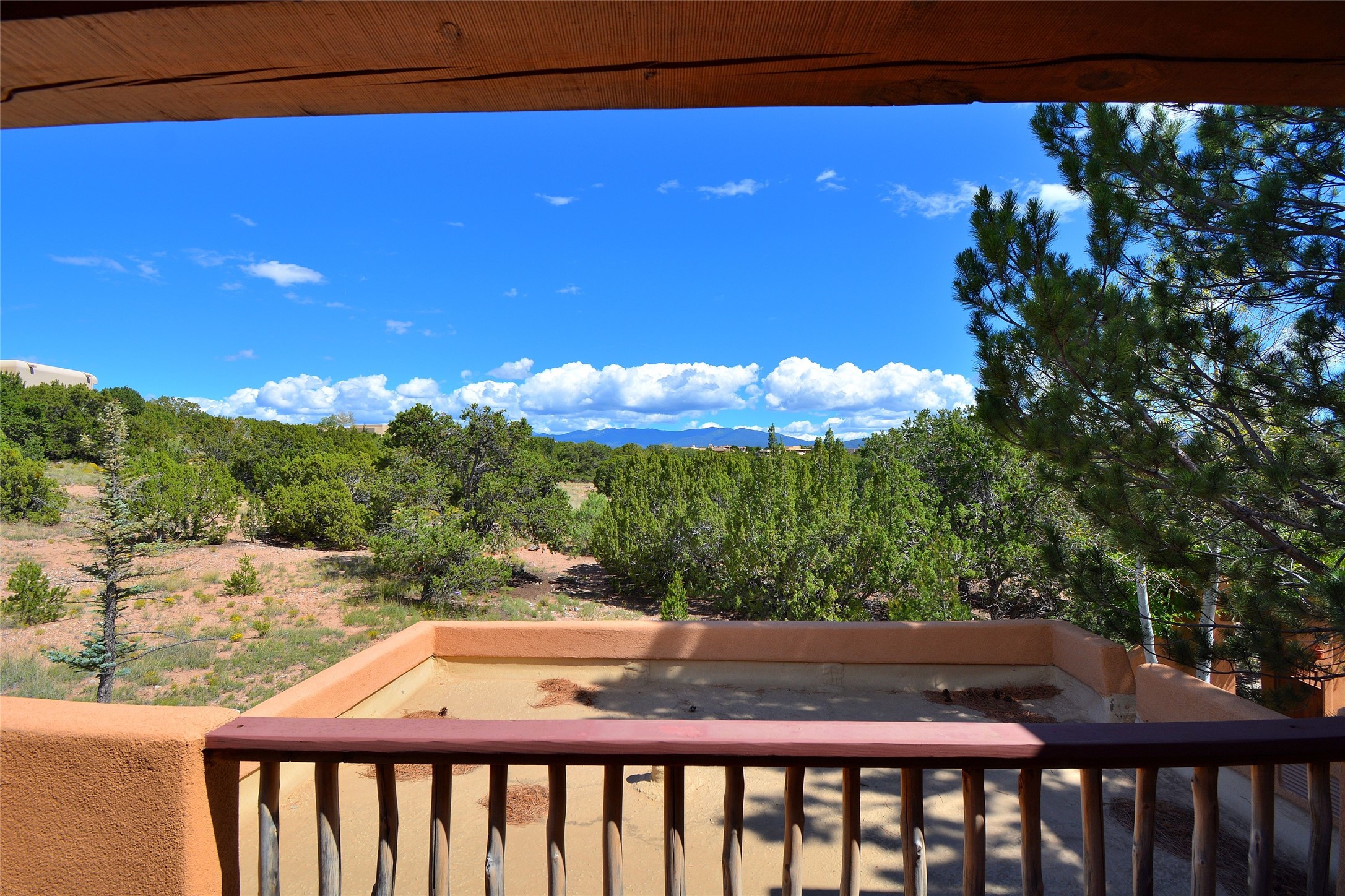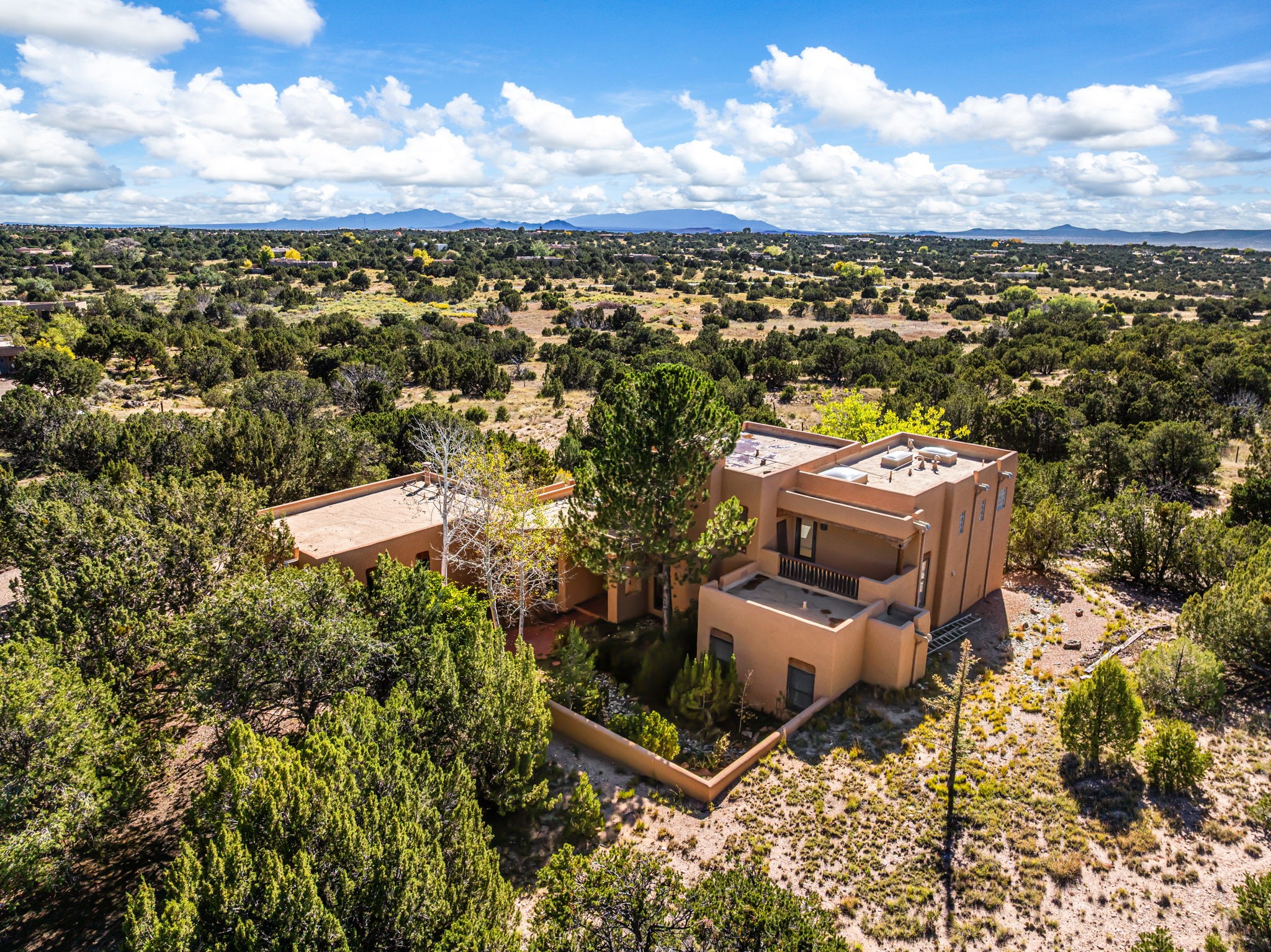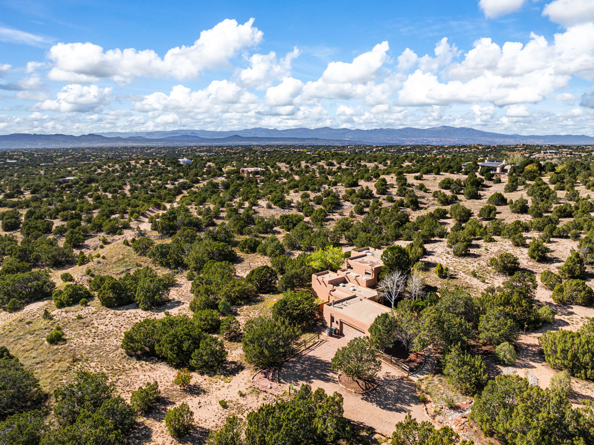 Nestled on two acres dotted with pion and juniper, this inviting Santa Fe-style home blends traditional charm with modern comforts. A gravel driveway leads to a graceful walkway, which in turn leads to a beautifully landscaped, enclosed front yard, The house features plastered walls, and the ground-level floors are adorned with traditional Saltillo tiles, except for the guest bedroom, which has carpet and an en-suite bathroom. The living and dining rooms feature soaring ceilings with vigas. A gas fireplace in the living room adds ambiance during cold winter nights.The kitchen, featuring skylights, granite countertops, and a gas cooktop, microwave, oven, and fridge/freezer, opens to a breakfast nook on one side, complete with its own private patio. Continuing from the breakfast nook, you enter the laundry and then the garage. On the other side of the kitchen is the dining room. The main level also features a second guest room or den with a nearby half-bath. The downstairs has in-floor radiant heat.Upstairs, the spacious main bedroom offers vigas, a second gas fireplace, radiant baseboard heat, and mountain views on one side and a deck on the other. The adjoining bath offers dual sinks, a Jacuzzi-style tub, a shower with seating, and a walk-in cedar closet.A new septic tank was installed in late November 2025With an alarm system and thoughtful storage throughout, this home offers a blend of traditional Santa Fe style and practicality in a serene setting, just a couple of minutes drive to 599 and access to Santa Fe (approx.10 minutes) or to Los Alamos, the Santa Fe airport, and Albuquerque.Adjacent to the subdivision is the La Tierra open space of almost 1500 acres, offering 25 miles of walking trails.